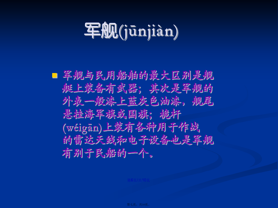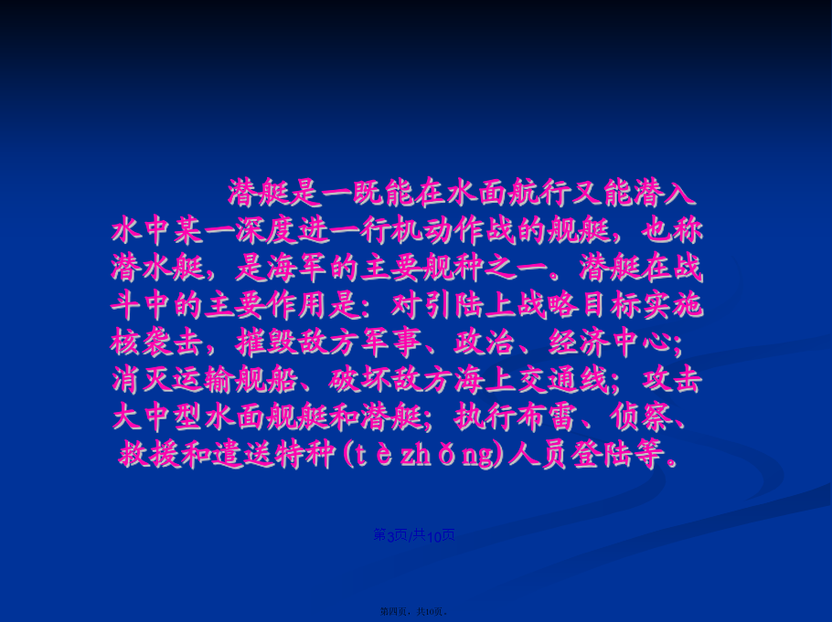 会计学潜艇是一既能在水面航行又能潜入水中某一深度进一行机动作战的舰艇,也称潜水艇,是海军的主要舰种之一。潜艇在战斗中的主要作用是:对引陆上战略目标实施核袭击,摧毁敌方军事、政治、经济中心;消灭运输舰船、破坏敌方海上交通线;攻击大中型水面舰艇和潜艇;执行布雷、侦察、救援和遣送特种(tèzhǒng)人员登陆等。军舰(jūnjiàn)地效翼船
