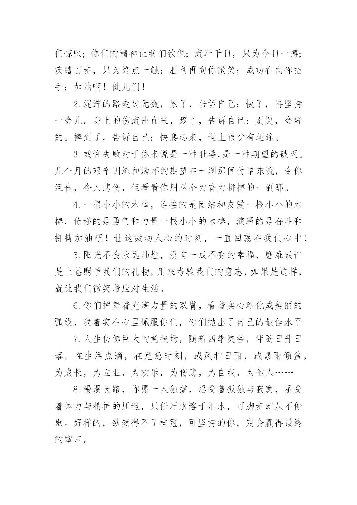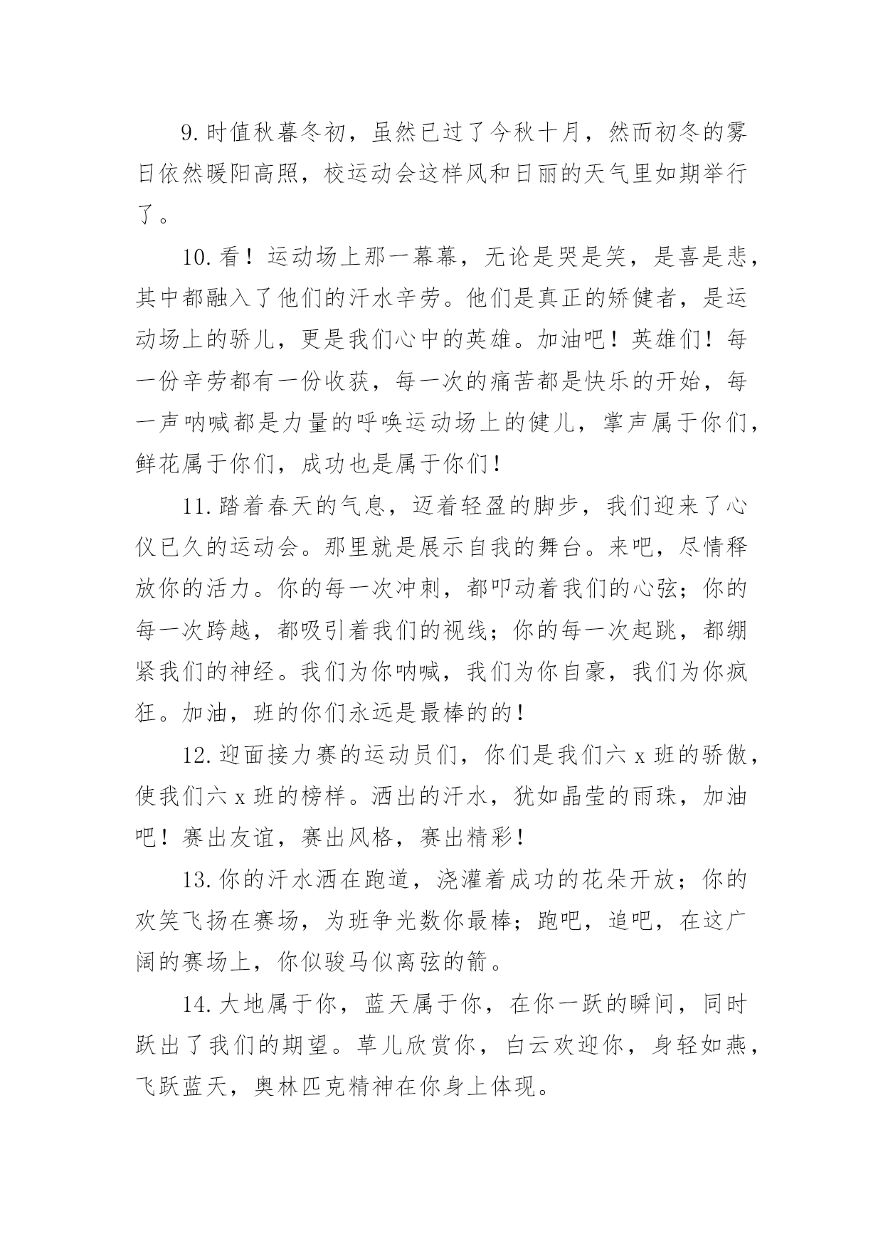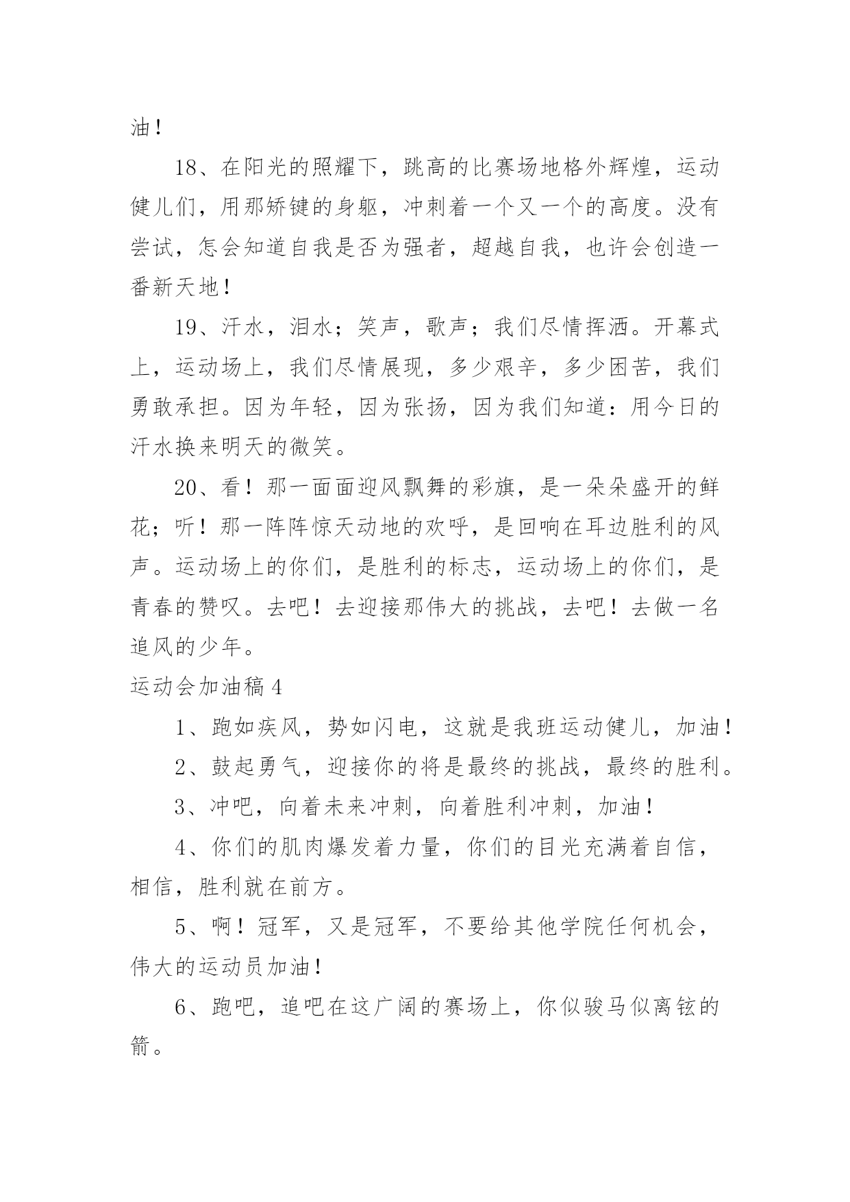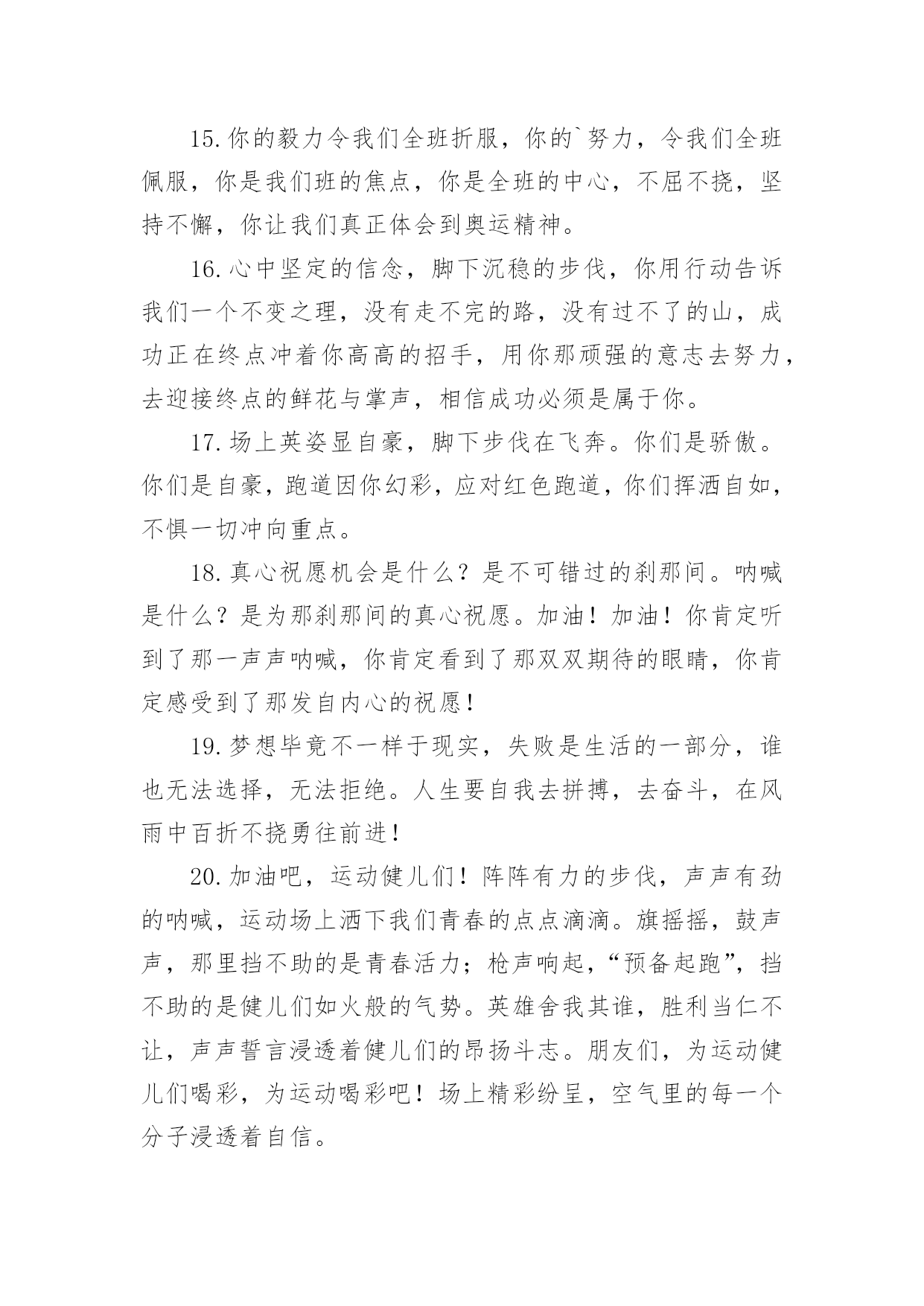 运动会加油稿运动会加油稿15篇【通用】在现实社会中,用到加油稿的地方越来越多,借助加油稿可以给对方传达鼓励。为了让您在写加油稿时更加简单方便,下面是小编帮大家整理的运动会加油稿,希望对大家有所帮助。运动会加油稿1就让这灼目的骄阳,在你自信满满的目光下黯然失,就让这绚烂的繁花,在你矫健挺拔的.身姿前兀自凋零,就让这激情呐喊,为你添一分风雨无惧的豪迈,就让这连绵欢唱,为你奏一曲凯旋之歌,向前冲刺吧!勇敢的运动员们!运动会加油稿2就像花儿准备了春、秋、冬,就是为了红透整个盛夏。就像雪花经历了春、夏、秋就是为了洁白整个严冬。蹲下,昂首,出发轻轻的一抬脚,便牵动了全场的目光潇洒的`迫挥挥手,便满足了那一份无言的等待。迎着朝阳,你们踏歌而去,背着希望,我们等待你们的归来。运动会加油稿31、梦想毕竟不一样于现实,失败是生活的一部分,谁也无法选择,无法拒绝。人生要自己去拼搏,去奋斗,在风雨中百折不挠,勇往直前。2、轰轰烈烈地投身于运动会中,无论是竭尽全力地冲刺,还是声嘶力竭地呐喊,无论感到欣慰满足成就感,或是自豪钦佩崇拜,都是一种体能的释放,一种心灵的洗礼。3、不为鲜花的围绕,不为刹那的荣耀,仅有执着的信念,化作不停的奔跑,心中燃烧着梦想,脚下不停的步伐!4、一根小小的木棒,连接的是团结和友爱;一根小小的木棒,传递的是勇气和力量;一根小小的木棒,演绎的是奋斗和拼搏;加油吧!让这激动人心的时刻,一直回荡在我们心中!5、投球奔跑本领高,运动健儿多自豪,风流人物看今朝。6、不为鲜花的围绕,不为刹那的荣耀,仅有执着的信念,化作不停的奔跑,心中燃烧着梦想,脚下不停的步伐!7、枪声伴你踏上征程,你昂着自信的头,带着必胜的信念,冲去,奔去。那一刻时光仿佛都为你停住,你的勇气振动了一切,震撼了每一个人的心灵。终点。你赢了。虽然只是那短短的十几秒,但你在我们心中留下了永恒。8、冬季运动场上英姿显自豪,脚下步伐在飞奔。你们是骄傲,你们是自豪,跑道因你幻彩,面对红色跑道,你们挥洒自如,不惧一切冲向终点!9、我们何其幸运,站在此地感受着热血的青春。失败,没有颓废;遇强,没有退缩。勇气与自信,汗水与笑声,使得赛场越发可爱!10、心中坚定的信念,脚下沉稳的步伐,你用行动告诉我们一个不变之理,没有走不完的路,没有过不了的山,成功正在终点冲着你高高的招手,用你那顽强的意志去努力,去迎接终点的鲜花与掌声,相信成功一定属于你,让今日的成功谱写新的未来!11、就在激昂的喊声中,运动员们一次次的'挑战,一次次超越了自我。他们以自己的行动,充分展现了自己的实力。展现了真我的风采。展现了自我的坚强拼搏的精神。12、朋友们,为运动健儿们喝彩,为运动喝彩吧!场上精彩纷呈,空气里的每一个分子浸透着自信。高二班的我要高喊一声,这里无限精彩!13、青春的脚步,青春的速度,青春的活力,将会在你们的身上尽情体现。14、大海如此的浩淼,鼓声多么美妙,运动员们,你们不再像平时那样渺小,我们默默的祈祷,以你们为骄傲,我们会永远为你们叫好!15、场上英姿显自豪,脚下步伐在飞奔。你们是骄傲,你们是自豪,跑道因你幻彩,面对红色跑道,你们挥洒自如,不惧一切冲向终点!16、人生的路,有坦途,也有坎坷;走过的岁月,有欢笑,也有苦涩,泪水告诉我一个跌倒的故事,汗水使我多了一份沉重,几多成熟。17、掌声响起来,呐喊吼出来,千百双眼眸,凝聚的是深深的期待,涌动的是无言的激动,跃动的是你们飞驰的身影,飒爽的秋风,暖暖的阳光,挥洒青春汗水的健儿们,加油!18、在阳光的照耀下,跳高的比赛场地格外辉煌,运动健儿们,用那矫键的身躯,冲刺着一个又一个的高度。没有尝试,怎会知道自我是否为强者,超越自我,也许会创造一番新天地!19、汗水,泪水;笑声,歌声;我们尽情挥洒。开幕式上,运动场上,我们尽情展现,多少艰辛,多少困苦,我们勇敢承担。因为年轻,因为张扬,因为我们知道:用今日的汗水换来明天的微笑。20、看!那一面面迎风飘舞的彩旗,是一朵朵盛开的鲜花;听!那一阵阵惊天动地的欢呼,是回响在耳边胜利的风声。运动场上的你们,是胜利的标志,运动场上的你们,是青春的赞叹。去吧!去迎接那伟大的挑战,去吧!去做一名追风的少年。运动会加油稿41、跑如疾风,势如闪电,这就是我班运动健儿,加油!2、鼓起勇气,迎接你的将是最终的挑战,最终的胜利。3、冲吧,向着未来冲刺,向着胜利冲刺,加油!4、你们的肌肉爆发着力量,你们的目光充满着自信,相信,胜利就在前方。5、啊!冠军,又是冠军,不要给其他学院任何机会,伟大的运动员加油!6、跑吧,追吧在这广阔的赛场上,你似骏马似离铉的箭。7、只因为始终相信,去拼搏才能胜利。总在鼓舞自我,要成功就得努力。8、人们的注视,那是人们对你的期望,祝福在你身边,呐喊在你耳边,期望在你心中。9、百米战场,枪声炸响,你抬头是勇气是自信,低