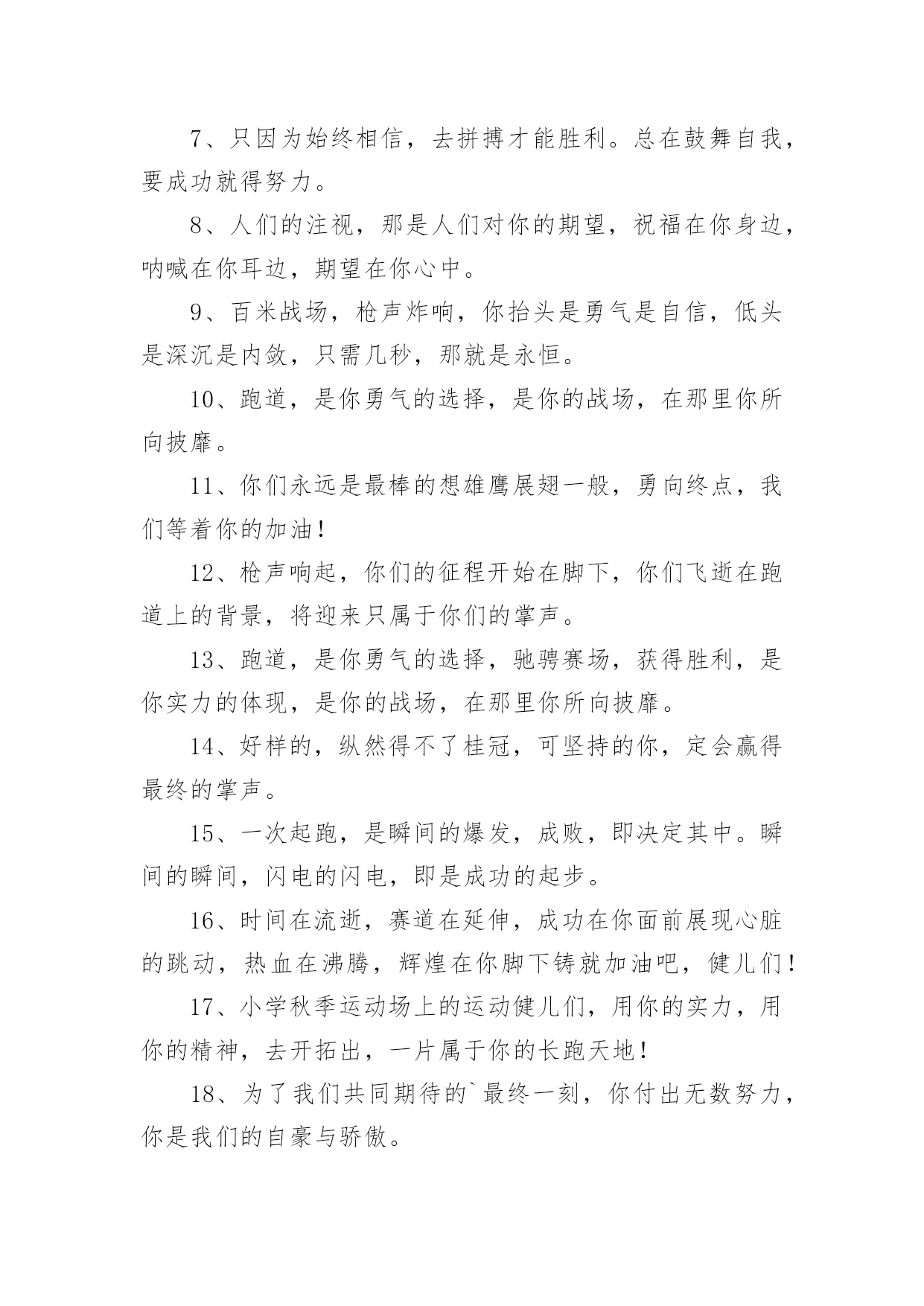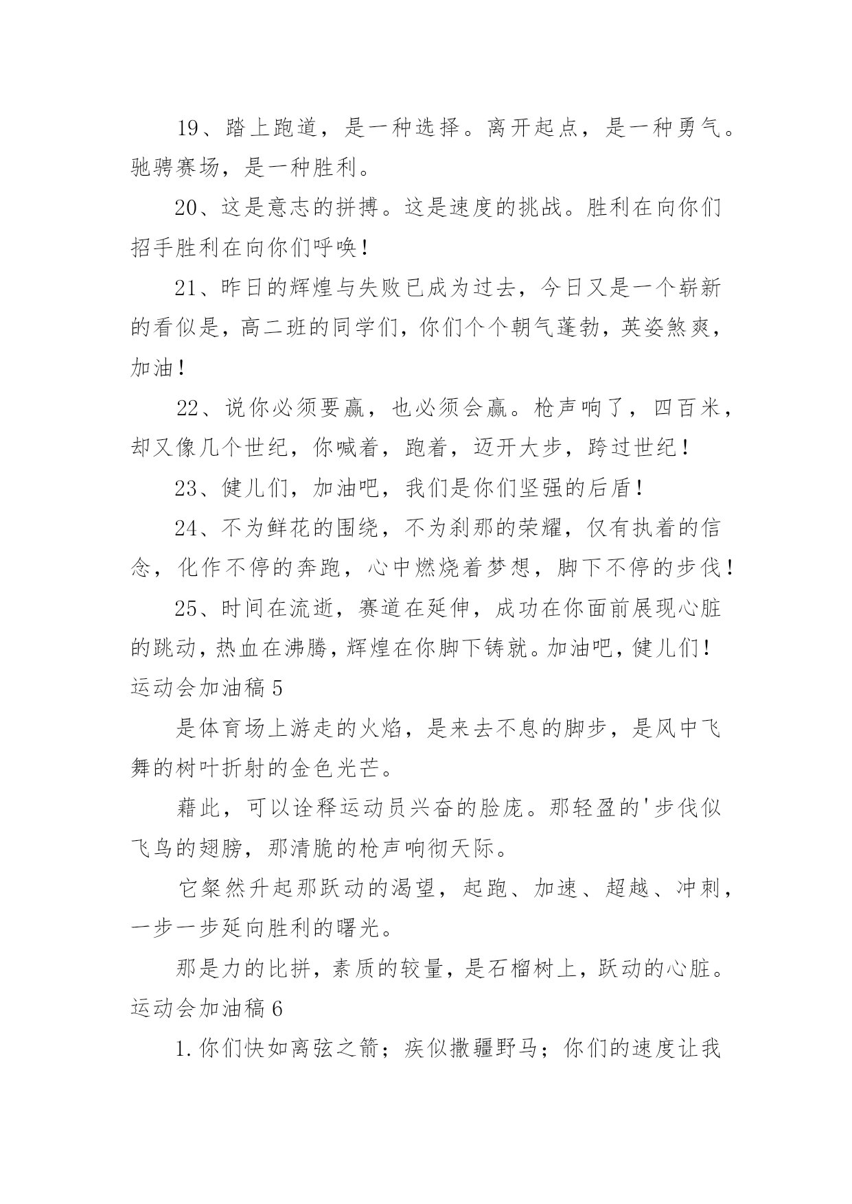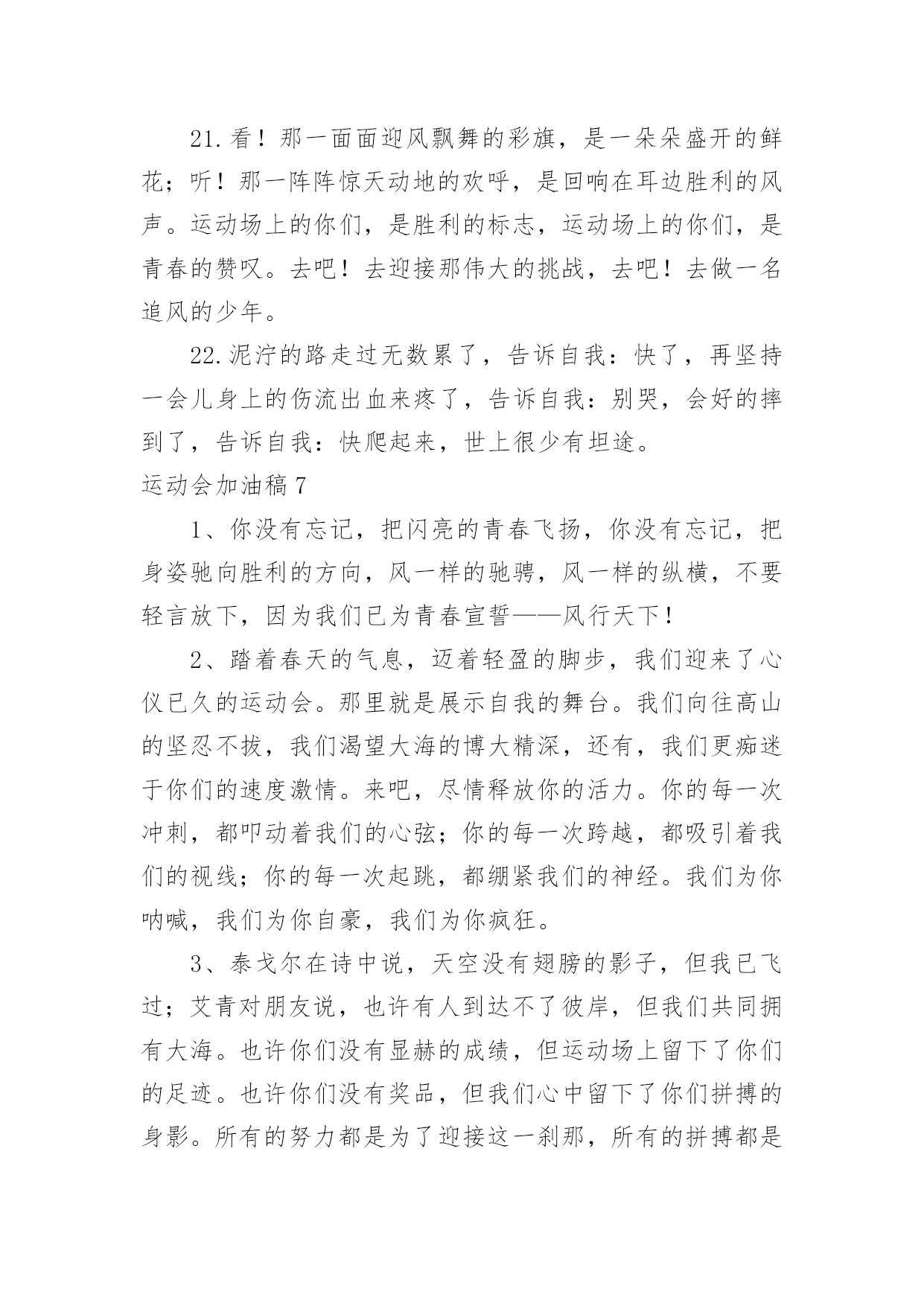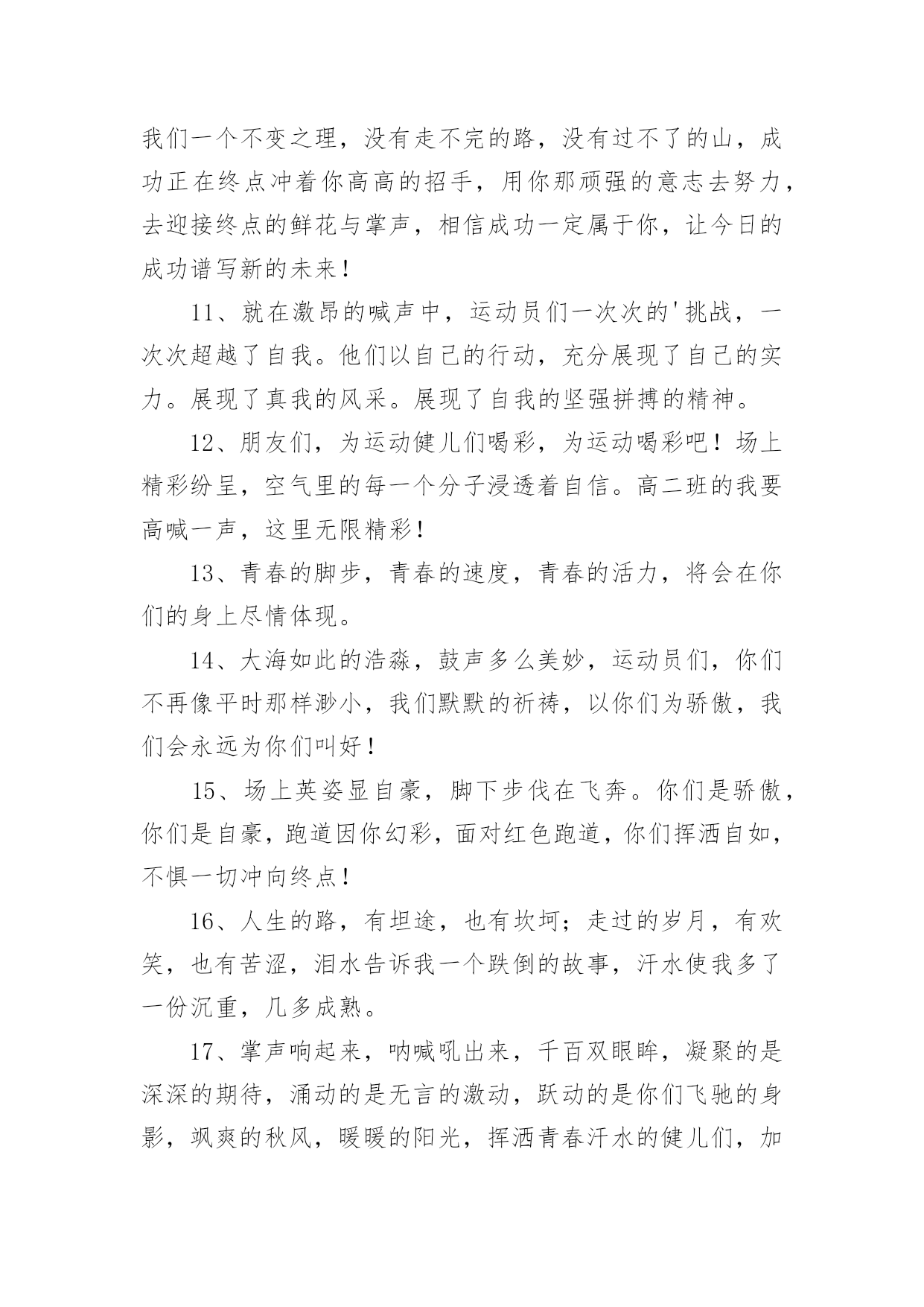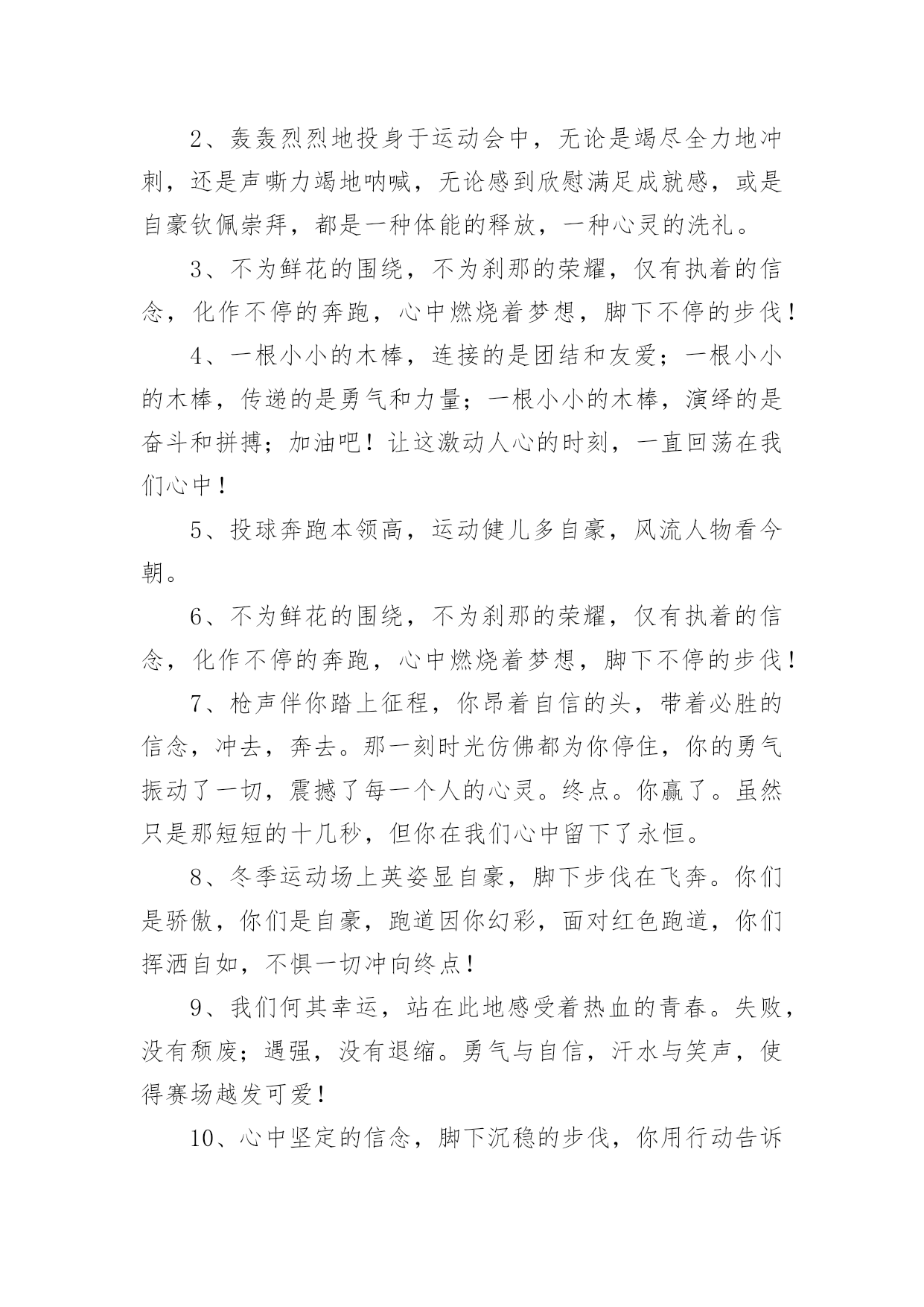 运动会加油稿运动会加油稿15篇【通用】在现实社会中,用到加油稿的地方越来越多,借助加油稿可以给对方传达鼓励。为了让您在写加油稿时更加简单方便,下面是小编帮大家整理的运动会加油稿,希望对大家有所帮助。运动会加油稿1就让这灼目的骄阳,在你自信满满的目光下黯然失,就让这绚烂的繁花,在你矫健挺拔的.身姿前兀自凋零,就让这激情呐喊,为你添一分风雨无惧的豪迈,就让这连绵欢唱,为你奏一曲凯旋之歌,向前冲刺吧!勇敢的运动员们!运动会加油稿2就像花儿准备了春、秋、冬,就是为了红透整个盛夏。就像雪花经历了春、夏、秋就是为了洁白整个严冬。蹲下,昂首,出发轻轻的一抬脚,便牵动了全场的目光潇洒的`迫挥挥手,便满足了那一份无言的等待。迎着朝阳,你们踏歌而去,背着希望,我们等待你们的归来。运动会加油稿31、梦想毕竟不一样于现实,失败是生活的一部分,谁也无法选择,无法拒绝。人生要自己去拼搏,去奋斗,在风雨中百折不挠,勇往直前。2、轰轰烈烈地投身于运动会中,无论是竭尽全力地冲刺,还是声嘶力竭地呐喊,无论感到欣慰满足成就感,或是自豪钦佩崇拜,都是一种体能的释放,一种心灵的洗礼。3、不为鲜花的围绕,不为刹那的荣耀,仅有执着的信念,化作不停的奔跑,心中燃烧着梦想,脚下不停的步伐!4、一根小小的木棒,连接的是团结和友爱;一根小小的木棒,传递的是勇气和力量;一根小小的木棒,演绎的是奋斗和拼搏;加油吧!让这激动人心的时刻,一直回荡在我们心中!5、投球奔跑本领高,运动健儿多自豪,风流人物看今朝。6、不为鲜花的围绕,不为刹那的荣耀,仅有执着的信念,化作不停的奔跑,心中燃烧着梦想,脚下不停的步伐!7、枪声伴你踏上征程,你昂着自信的头,带着必胜的信念,冲去,奔去。那一刻时光仿佛都为你停住,你的勇气振动了一切,震撼了每一个人的心灵。终点。你赢了。虽然只是那短短的十几秒,但你在我们心中留下了永恒。8、冬季运动场上英姿显自豪,脚下步伐在飞奔。你们是骄傲,你们是自豪,跑道因你幻彩,面对红色跑道,你们挥洒自如,不惧一切冲向终点!9、我们何其幸运,站在此地感受着热血的青春。失败,没有颓废;遇强,没有退缩。勇气与自信,汗水与笑声,使得赛场越发可爱!10、心中坚定的信念,脚下沉稳的步伐,你用行动告诉我们一个不变之理,没有走不完的路,没有过不了的山,成功正在终点冲着你高高的招手,用你那顽强的意志去努力,去迎接终点的鲜花与掌声,相信成功一定属于你,让今日的成功谱写新的未来!11、就在激昂的喊声中,运动员们一次次的'挑战,一次次超越了自我。他们以自己的行动,充分展现了自己的实力。展现了真我的风采。展现了自我的坚强拼搏的精神。12、朋友们,为运动健儿们喝彩,为运动喝彩吧!场上精彩纷呈,空气里的每一个分子浸透着自信。高二班的我要高喊一声,这里无限精彩!13、青春的脚步,青春的速度,青春的活力,将会在你们的身上尽情体现。14、大海如此的浩淼,鼓声多么美妙,运动员们,你们不再像平时那样渺小,我们默默的祈祷,以你们为骄傲,我们会永远为你们叫好!15、场上英姿显自豪,脚下步伐在飞奔。你们是骄傲,你们是自豪,跑道因你幻彩,面对红色跑道,你们挥洒自如,不惧一切冲向终点!16、人生的路,有坦途,也有坎坷;走过的岁月,有欢笑,也有苦涩,泪水告诉我一个跌倒的故事,汗水使我多了一份沉重,几多成熟。17、掌声响起来,呐喊吼出来,千百双眼眸,凝聚的是深深的期待,涌动的是无言的激动,跃动的是你们飞驰的身影,飒爽的秋风,暖暖的阳光,挥洒青春汗水的健儿们,加油!18、在阳光的照耀下,跳高的比赛场地格外辉煌,运动健儿们,用那矫键的身躯,冲刺着一个又一个的高度。没有尝试,怎会知道自我是否为强者,超越自我,也许会创造一番新天地!19、汗水,泪水;笑声,歌声;我们尽情挥洒。开幕式上,运动场上,我们尽情展现,多少艰辛,多少困苦,我们勇敢承担。因为年轻,因为张扬,因为我们知道:用今日的汗水换来明天的微笑。20、看!那一面面迎风飘舞的彩旗,是一朵朵盛开的鲜花;听!那一阵阵惊天动地的欢呼,是回响在耳边胜利的风声。运动场上的你们,是胜利的标志,运动场上的你们,是青春的赞叹。去吧!去迎接那伟大的挑战,去吧!去做一名追风的少年。运动会加油稿41、跑如疾风,势如闪电,这就是我班运动健儿,加油!2、鼓起勇气,迎接你的将是最终的挑战,最终的胜利。3、冲吧,向着未来冲刺,向着胜利冲刺,加油!4、你们的肌肉爆发着力量,你们的目光充满着自信,相信,胜利就在前方。5、啊!冠军,又是冠军,不要给其他学院任何机会,伟大的运动员加油!6、跑吧,追吧在这广阔的赛场上,你似骏马似离铉的箭。7、只因为始终相信,去拼搏才能胜利。总在鼓舞自我,要成功就得努力。8、人们的注视,那是人们对你的期望,祝福在你身边,呐喊在你耳边,期望在你心中。9、百米战场,枪声炸响,你抬头是勇气是自信,低