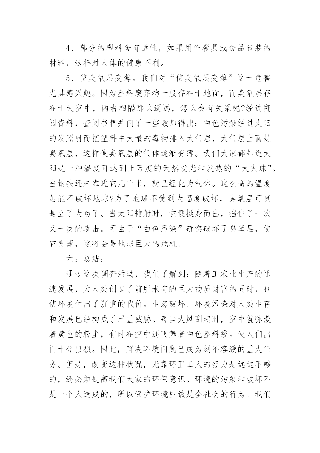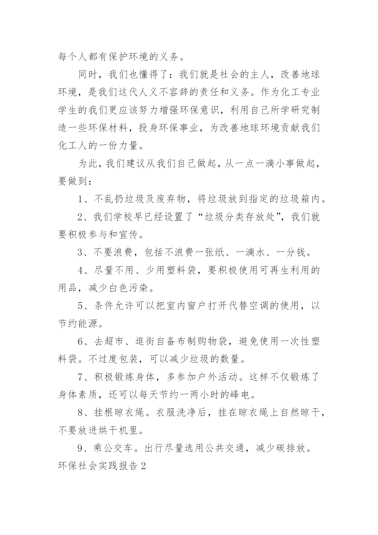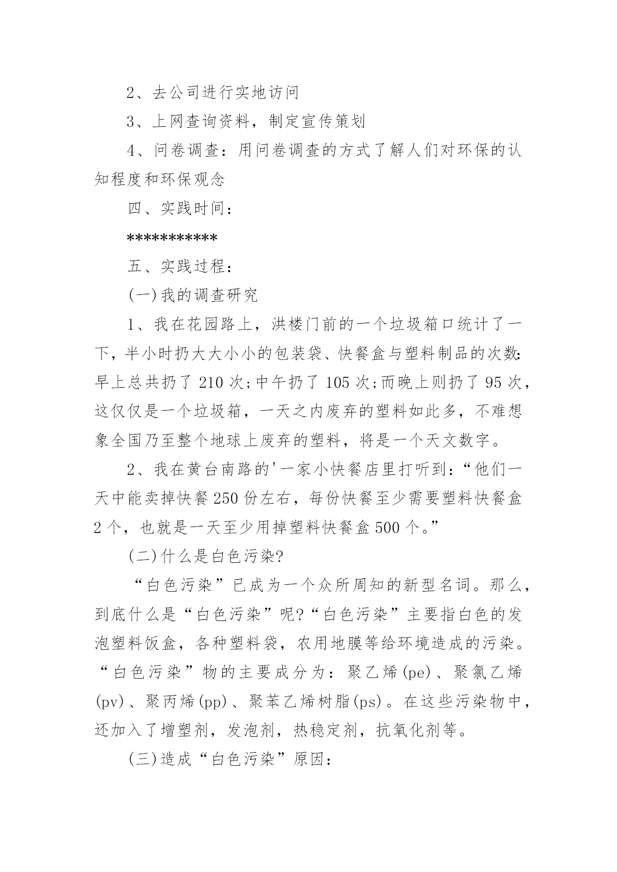 环保社会实践报告环保社会实践报告在日常生活和工作中,报告对我们来说并不陌生,多数报告都是在事情做完或发生后撰写的。相信许多人会觉得报告很难写吧,以下是小编帮大家整理的环保社会实践报告,希望能够帮助到大家。环保社会实践报告1一、实践主题:参观公司,了解节能产品,深入社区,贴近市民,宣传低碳生活。二、实践目的:1、通过深入社区,大力普及环保知识,提高市民的环保意识,培养社区居民和学生关注社会发展的责任感,热爱社会公益事业的品质。2、在宣传教育别人的同时,不断提高自己的环保意识水平和知识水平,让我们彼此教育,负起环保责任,树立正确的环境价值观和环境道德风范,从身边点滴做起。3、建设绿色家园,弘扬道德风尚,发扬义工精神,促进社会和谐发展。三、实践形式:1、对各年龄段人群进行询问2、去公司进行实地访问3、上网查询资料,制定宣传策划4、问卷调查:用问卷调查的方式了解人们对环保的认知程度和环保观念四、实践时间:***********五、实践过程:(一)我的调查研究1、我在花园路上,洪楼门前的一个垃圾箱口统计了一下,半小时扔大大小小的包装袋、快餐盒与塑料制品的次数:早上总共扔了210次;中午扔了105次;而晚上则扔了95次,这仅仅是一个垃圾箱,一天之内废弃的塑料如此多,不难想象全国乃至整个地球上废弃的塑料,将是一个天文数字。2、我在黄台南路的'一家小快餐店里打听到:“他们一天中能卖掉快餐250份左右,每份快餐至少需要塑料快餐盒2个,也就是一天至少用掉塑料快餐盒500个。”(二)什么是白色污染?“白色污染”已成为一个众所周知的新型名词。那么,到底什么是“白色污染”呢?“白色污染”主要指白色的发泡塑料饭盒,各种塑料袋,农用地膜等给环境造成的污染。“白色污染”物的主要成分为:聚乙烯(pe)、聚氯乙烯(pv)、聚丙烯(pp)、聚苯乙烯树脂(ps)。在这些污染物中,还加入了增塑剂,发泡剂,热稳定剂,抗氧化剂等。(三)造成“白色污染”原因:1、塑料垃圾没有得到妥善的管理和处置,垃圾没有实行分类收集,能回收回的不回收利用;2、许多企业对于生产过程中产生的白色垃圾没有科学地处理,放任自流;3、我国现有的法律没有对塑料包装废弃物的处理,制定出过硬的相关法规;4、尽管在创建省级文明城市的口号下,我们的城市变得整洁得多,但是总的来讲,人们的环保意识比较淡薄,滥用和随意乱倒塑料制品现象相当普遍。(四)白色污染的危害:1、视觉危害:散落在环境中的塑料废弃物对破坏了市容景观。如散落在自然环境、街头巷尾、江河湖泊的一次性发泡塑料餐具和漫天飞舞或悬挂枝头的超薄塑料袋,给人们的视觉带来不良刺激。2、潜在危害:(1)塑料地膜废弃物在土壤中大面积残留,长期积累,造成土壤板结,影响农作物吸收养分和水分,导致农作物减产;(2)抛弃在陆地上或水中的塑料废弃物,被动物当作食物吞食后,会导致动物死亡;3、进入生活垃圾中的塑料废弃物质量轻、体积大,很难处理。如果将它们填埋,会占用大量土地,而且,在很长一段时间内难以分解。4、部分的塑料含有毒性,如果用作餐具或食品包装的材料,这样对人体的健康不利。5、使臭氧层变薄。我们对“使臭氧层变薄”这一危害尤其感兴趣。因为塑料废弃物一般存在于地面,而臭氧层存在于天空中,两者相隔那么遥远,怎么会有关系呢?经过翻阅资料,查阅书籍并问了一些教师得出:白色污染经过太阳的发照射而把塑料中大量的毒物排入大气层,大气层上面是臭氧层,这样使臭氧层的气体逐渐变薄。我们大家都知道太阳是一种温度可达到上万度的天然发光和发热的“大火球”。当钢铁还未靠进它几千米,就已经化为气体。这么高的温度怎能不破坏地球?为了地球不受到大幅度破坏,臭氧层可真是立了大功了。当太阳辅射时,它便挺身而出,挡住了一次又一次的攻击。可由于“白色污染”确实破坏了臭氧层,使它变薄,这将会是地球巨大的危机。六:总结:通过这次调查活动,我们了解到:随着工农业生产的迅速发展,为人类创造了前所未有的巨大物质财富的同时,也使环境付出了沉重的代价。生态破坏、环境污染对人类生存和发展已经构成了严重威胁。每当大风刮起时,空中就弥漫着黄色的粉尘,有时在空中还飞舞着白色塑料袋。使人们出门十分狼狈。因此,解决环境问题已成为刻不容缓的重大任务。但是,改变这种状况,光靠环卫工人的努力是远远不够的,还必须提高我们大家的环保意识。环境的污染和破坏不是一个人造成的,所以保护环境应该是全社会的行为。我们每个人都有保护环境的义务。同时,我们也懂得了:我们就是社会的主人,改善地球环境,是我们这代人义不容辞的责任和义务。作为化工专业学生的我们更应该努力增强环保意识,利用自己所学研究制造一些环保材料,投身环保事业,为改善地球环境贡献我们化工人的一份力量。为此,我们建议从我们自己做起,从一点一滴小事做起,要做到:1、不乱扔垃圾及废弃物,将垃圾放到指定