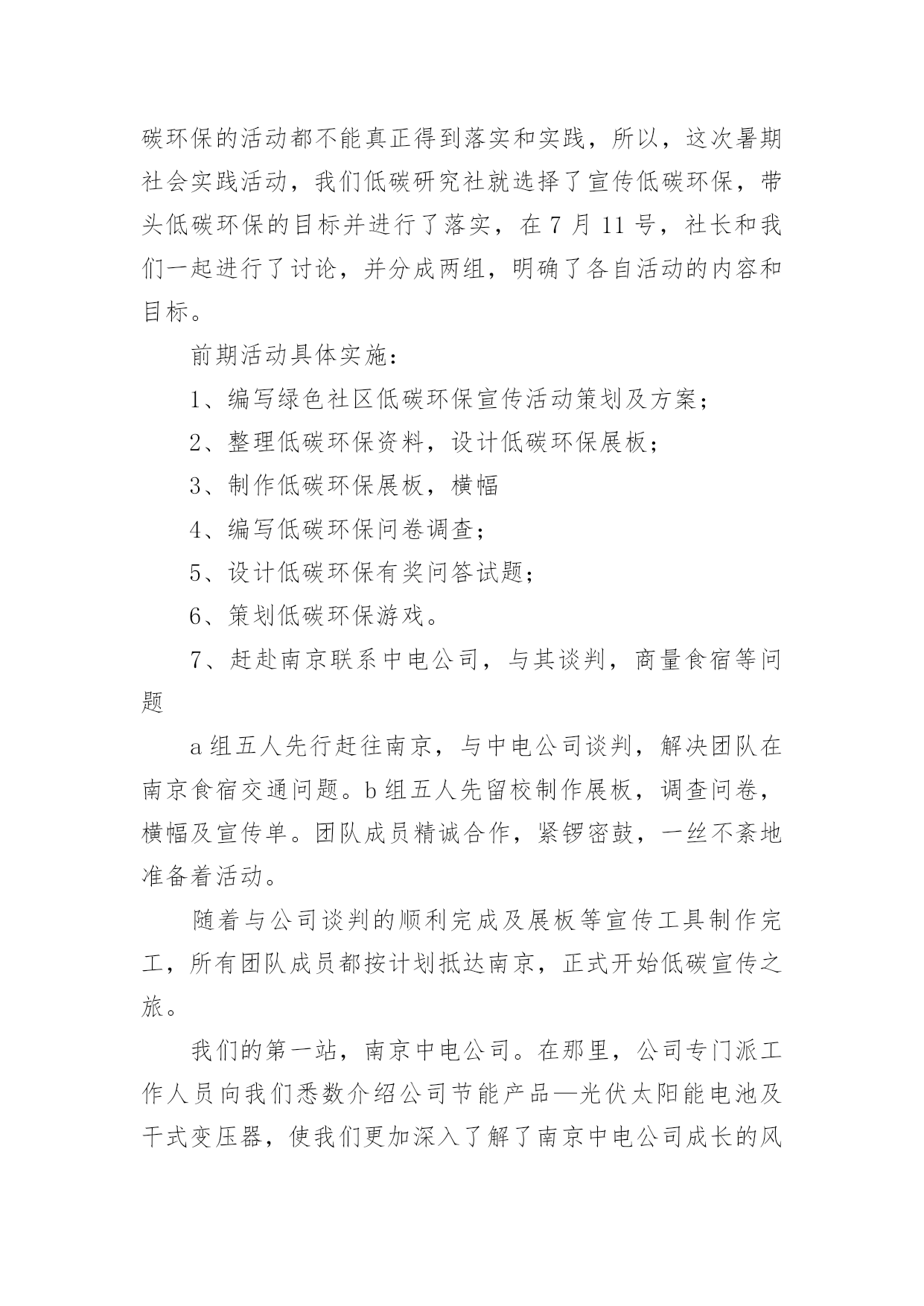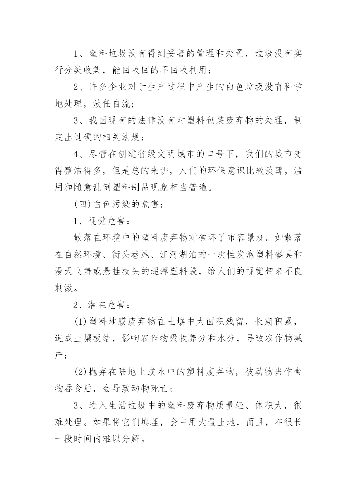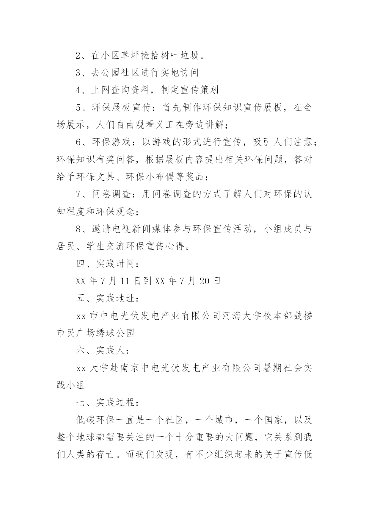环保社会实践报告环保社会实践报告在日常生活和工作中,报告对我们来说并不陌生,多数报告都是在事情做完或发生后撰写的。相信许多人会觉得报告很难写吧,以下是小编帮大家整理的环保社会实践报告,希望能够帮助到大家。环保社会实践报告1一、实践主题:参观公司,了解节能产品,深入社区,贴近市民,宣传低碳生活。二、实践目的:1、通过深入社区,大力普及环保知识,提高市民的环保意识,培养社区居民和学生关注社会发展的责任感,热爱社会公益事业的品质。2、在宣传教育别人的同时,不断提高自己的环保意识水平和知识水平,让我们彼此教育,负起环保责任,树立正确的环境价值观和环境道德风范,从身边点滴做起。3、建设绿色家园,弘扬道德风尚,发扬义工精神,促进社会和谐发展。三、实践形式:1、对各年龄段人群进行询问2、去公司进行实地访问3、上网查询资料,制定宣传策划4、问卷调查:用问卷调查的方式了解人们对环保的认知程度和环保观念四、实践时间:***********五、实践过程:(一)我的调查研究1、我在花园路上,洪楼门前的一个垃圾箱口统计了一下,半小时扔大大小小的包装袋、快餐盒与塑料制品的次数:早上总共扔了210次;中午扔了105次;而晚上则扔了95次,这仅仅是一个垃圾箱,一天之内废弃的塑料如此多,不难想象全国乃至整个地球上废弃的塑料,将是一个天文数字。2、我在黄台南路的'一家小快餐店里打听到:“他们一天中能卖掉快餐250份左右,每份快餐至少需要塑料快餐盒2个,也就是一天至少用掉塑料快餐盒500个。”(二)什么是白色污染?“白色污染”已成为一个众所周知的新型名词。那么,到底什么是“白色污染”呢?“白色污染”主要指白色的发泡塑料饭盒,各种塑料袋,农用地膜等给环境造成的污染。“白色污染”物的主要成分为:聚乙烯(pe)、聚氯乙烯(pv)、聚丙烯(pp)、聚苯乙烯树脂(ps)。在这些污染物中,还加入了增塑剂,发泡剂,热稳定剂,抗氧化剂等。(三)造成“白色污染”原因:1、塑料垃圾没有得到妥善的管理和处置,垃圾没有实行分类收集,能回收回的不回收利用;2、许多企业对于生产过程中产生的白色垃圾没有科学地处理,放任自流;3、我国现有的法律没有对塑料包装废弃物的处理,制定出过硬的相关法规;4、尽管在创建省级文明城市的口号下,我们的城市变得整洁得多,但是总的来讲,人们的环保意识比较淡薄,滥用和随意乱倒塑料制品现象相当普遍。(四)白色污染的危害:1、视觉危害:散落在环境中的塑料废弃物对破坏了市容景观。如散落在自然环境、街头巷尾、江河湖泊的一次性发泡塑料餐具和漫天飞舞或悬挂枝头的超薄塑料袋,给人们的视觉带来不良刺激。2、潜在危害:(1)塑料地膜废弃物在土壤中大面积残留,长期积累,造成土壤板结,影响农作物吸收养分和水分,导致农作物减产;(2)抛弃在陆地上或水中的塑料废弃物,被动物当作食物吞食后,会导致动物死亡;3、进入生活垃圾中的塑料废弃物质量轻、体积大,很难处理。如果将它们填埋,会占用大量土地,而且,在很长一段时间内难以分解。4、部分的塑料含有毒性,如果用作餐具或食品包装的材料,这样对人体的健康不利。5、使臭氧层变薄。我们对“使臭氧层变薄”这一危害尤其感兴趣。因为塑料废弃物一般存在于地面,而臭氧层存在于天空中,两者相隔那么遥远,怎么会有关系呢?经过翻阅资料,查阅书籍并问了一些教师得出:白色污染经过太阳的发照射而把塑料中大量的毒物排入大气层,大气层上面是臭氧层,这样使臭氧层的气体逐渐变薄。我们大家都知道太阳是一种温度可达到上万度的天然发光和发热的“大火球”。当钢铁还未靠进它几千米,就已经化为气体。这么高的温度怎能不破坏地球?为了地球不受到大幅度破坏,臭氧层可真是立了大功了。当太阳辅射时,它便挺身而出,挡住了一次又一次的攻击。可由于“白色污染”确实破坏了臭氧层,使它变薄,这将会是地球巨大的危机。六:总结:通过这次调查活动,我们了解到:随着工农业生产的迅速发展,为人类创造了前所未有的巨大物质财富的同时,也使环境付出了沉重的代价。生态破坏、环境污染对人类生存和发展已经构成了严重威胁。每当大风刮起时,空中就弥漫着黄色的粉尘,有时在空中还飞舞着白色塑料袋。使人们出门十分狼狈。因此,解决环境问题已成为刻不容缓的重大任务。但是,改变这种状况,光靠环卫工人的努力是远远不够的,还必须提高我们大家的环保意识。环境的污染和破坏不是一个人造成的,所以保护环境应该是全社会的行为。我们每个人都有保护环境的义务。同时,我们也懂得了:我们就是社会的主人,改善地球环境,是我们这代人义不容辞的责任和义务。作为化工专业学生的我们更应该努力增强环保意识,利用自己所学研究制造一些环保材料,投身环保事业,为改善地球环境贡献我们化工人的一份力量。为此,我们建议从我们自己做起,从一点一滴小事做起,要做到:1、不乱扔垃圾及废弃物,将垃圾放到指定