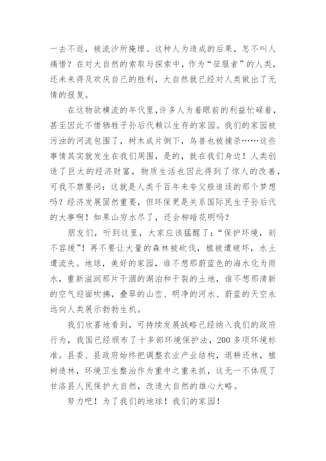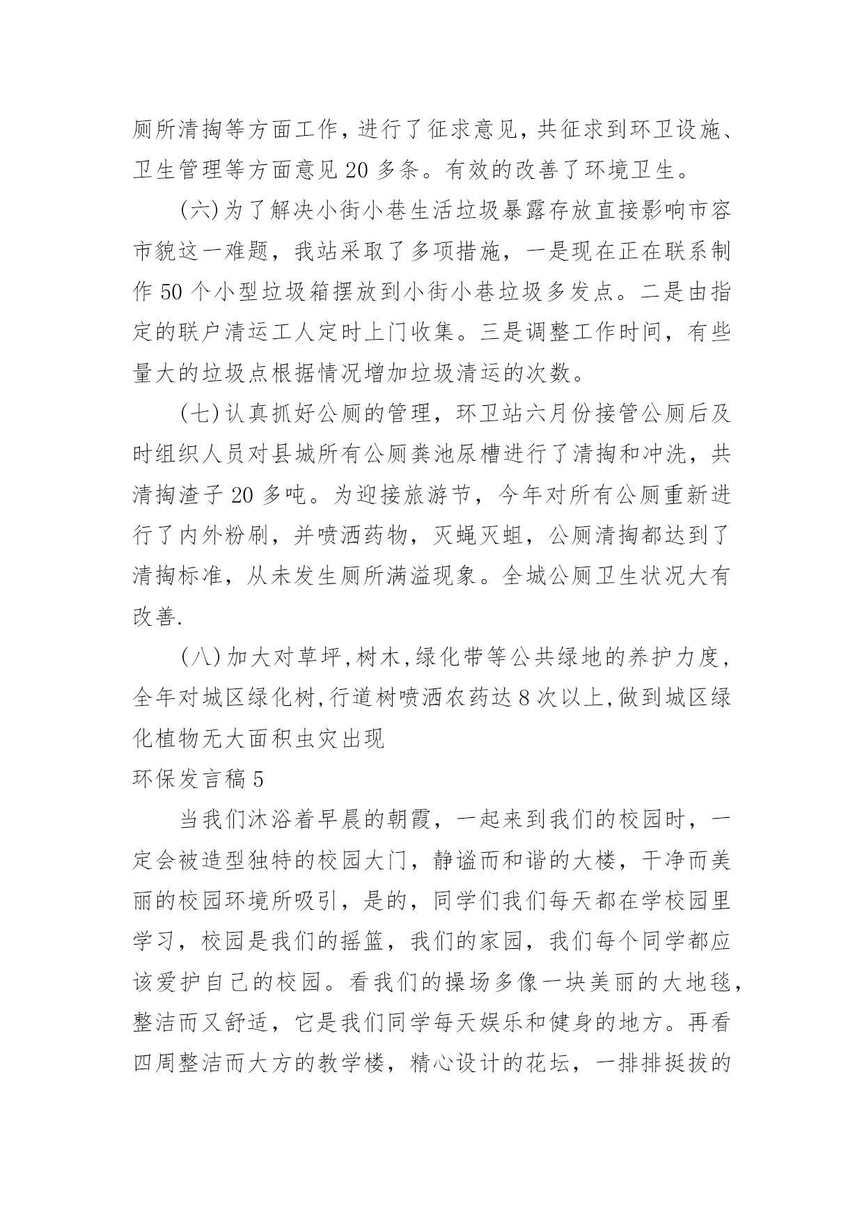 环保发言稿环保发言稿随着社会一步步向前发展,越来越多人会去使用发言稿,发言稿可以帮助发言者更好的表达。怎样写发言稿才能更好地发挥其做用呢?下面是小编收集整理的环保发言稿,欢迎大家借鉴与参考,希望对大家有所帮助。环保发言稿1各位花草树木、水沟河流……们:大家好!我相信大家对我不陌生吧,我就是百年前聚会时的小河呀!那时的我呀,年轻气盛,无人能比,就连智多识广的大海老爷爷也比不过我!可是现在,大家肯定认不出我了吧?我是不是很像刚挖开的黑水沟小弟弟呀?大家看看我吧!现已患了“哮喘”,说话大喘气,上次呀,我还差点得了“癌症”,而且我现在还染上了“河皮癣”!再看看我的衣服吧!有的东西在我身上待了好几年了,看一看啊,他们人类把我点的“五彩缤纷”:这是七月前一个老婆婆的塑料袋;这是一年前一个小孩“送”给我的可口可乐;这是三年前一个农民随手扔下的坏猪肉,现在都被泡涨了……看一看,还哪有一百年前那矫健、清澈、可爱的身影啊!要知道,以前人们在我身上嬉水,在我肚中游泳……七年前的一天,在离岸不远的地方开了一家油漆场,夜晚,总在些人偷偷摸摸的挖着“地道”。有一天那地道通到了我身边,并且接上了一根粗管子,我好奇的朝里看了一下,突然一阵恶臭扑鼻而来,我立即缩头,这时,一阵黑水一下涌出……从那以后,人们不再嬉水、游泳,久而抱怨、污染起我来,要知道害我的人是你们呀!啊,我真希望人们改过自新,不再污染、破坏我们,让我们永远清澈!谢谢大家,我的演讲完毕!环保发言稿2敬爱的老师,亲爱的同学们:大家好!今天我演讲的题目是《环保在我心》。绿树,红叶,青山,蓝天,是大自然赋予人类世界的美妙绝伦的事物。而如今,树已不再苍翠,山已不再青秀,天空也不再湛蓝,这一切都是人类自己酿成的后果。奔腾的河流是大地母亲的血管,河水好似流淌的血液,它有一种神奇的力量,流到哪里,哪里就充满生机,人类择水而居,河流便成了人类生存的依托。可是,今天呢?许多河流生病了,清澈的河水变得又黑又臭,河水里的鱼虾也早已逃之夭夭了!我们同样不会忘记每年春季来自内蒙古的沙尘暴,不会忘记xxxx年那场特大洪水,更不会忘记达到pm2.5的城市越来越少。面对日益恶化的地球生态环境,作为未来接班人的青少年,我们不能坐以待毙,我们应当去了了解人类环境的构成和环境问题的严重性,重视有关环境保护的法律法规,增强环境保护的意识,自觉履行保护环境的义务。我们应从自我做起,从小事做起。在平常的生活里,我们不难看到,在附中的校园内,也有同样存在环保意识淡薄,肆意破坏环境,浪费资源的现象。“哗啦啦”的流水声在我们耳畔时常响起,“明晃晃”的长明灯在我们眼前映照,随手丢弃果皮纸屑的现象也时有发生。为什么我们随手就能做的事,我们就没有做起呢?电灯没关,我们将它顺手关掉,水龙头在滴水,我们过去将它轻轻一拧,看到地上有果皮纸屑,请大家弯弯腰。因此,我们xxx班向全校师生发出以下倡议:(1)自觉保护校园卫生环境,不随意丢弃瓜果皮屑、废旧纸张、电池等杂物垃圾。(2)在餐厅吃饭时,不随意浪费粮食;在写作业时,要尽量双面利用纸张,不铺张浪费。(3)随手在离开教室宿舍关灯,在接水之后拧紧水龙头,尽量将比较干净的水反复利用,用水浇花,冲厕所等。(4)将垃圾分类丢弃,回收利用可再次使用的硬纸板、易拉罐,塑制饮料瓶、啤酒瓶、废旧的报纸书本和电池,为国家资源的可持续发张献计献策。(5)拒绝使用一次性筷子、纸杯等制品,防止我国的森林覆盖率日益减少,生态环境的日益恶化。(6)在去超市购物时尽量自带环保购物袋,杜绝“白色污染”的蔓延。(7)在家庭生活中,节约能源,减少排污,做到“节能减排”,倡导“低碳生活”,建设节约型校园、社会。天空的幸福,是它穿着一身蓝;光的幸福,是它拥有如水晶般耀眼的光彩;大地的幸福,是它孕育出多彩的生命;人类的幸福,是它拥有一个美丽的地球。希望大家共同努力,将附中融入社会这一集体中,将附中建成一个环境优美的大校园环保发言稿3尊敬的各位领导,各位评委、朋友们:大家早上好!我叫余瑾。今天我演讲的题目是:地球——我们的家园。当人类第一次离开地球,在太空遥望自己的家乡时,人们这才惊讶地发现,其实我们的地球更应该叫水球,因为在目前已知的星球中,它才是唯一一颗蔚蓝色的水所包围的星球,蔚蓝色意味着一种希望、一种生命,而地球正是一颗充满希望、充满生命的星球。曾几何时,这颗充满希望与生命的星球在人类面前变得不可捉摸。从太平洋东岸的赤潮现象到美国的四月飞雪,人类竟然也像倒退了一万年似的束手无策。如果说,人类受到大自然的威胁,这多少有点“无可奈何花落去”之哀叹,那么人类去“威胁”大自然,又该怎么去陈述呢?曾经是中亚地区最大水域之一的罗布泊湖,在本世纪70年代还是一个大湖,但是到了80年代,一片汪洋已一去不返,被流沙所掩埋。这种人为造成的后果,怎不叫人痛惜?在对大