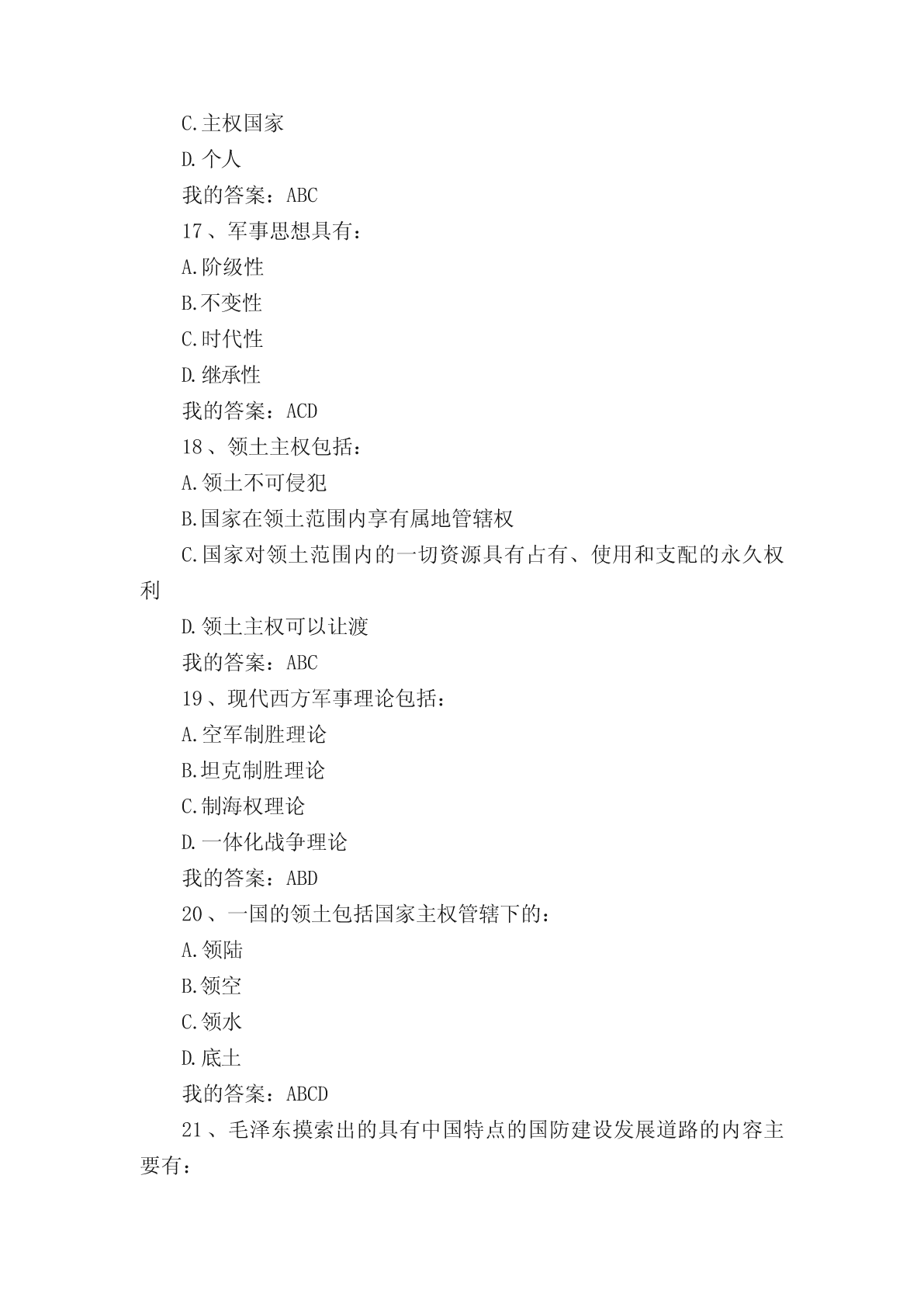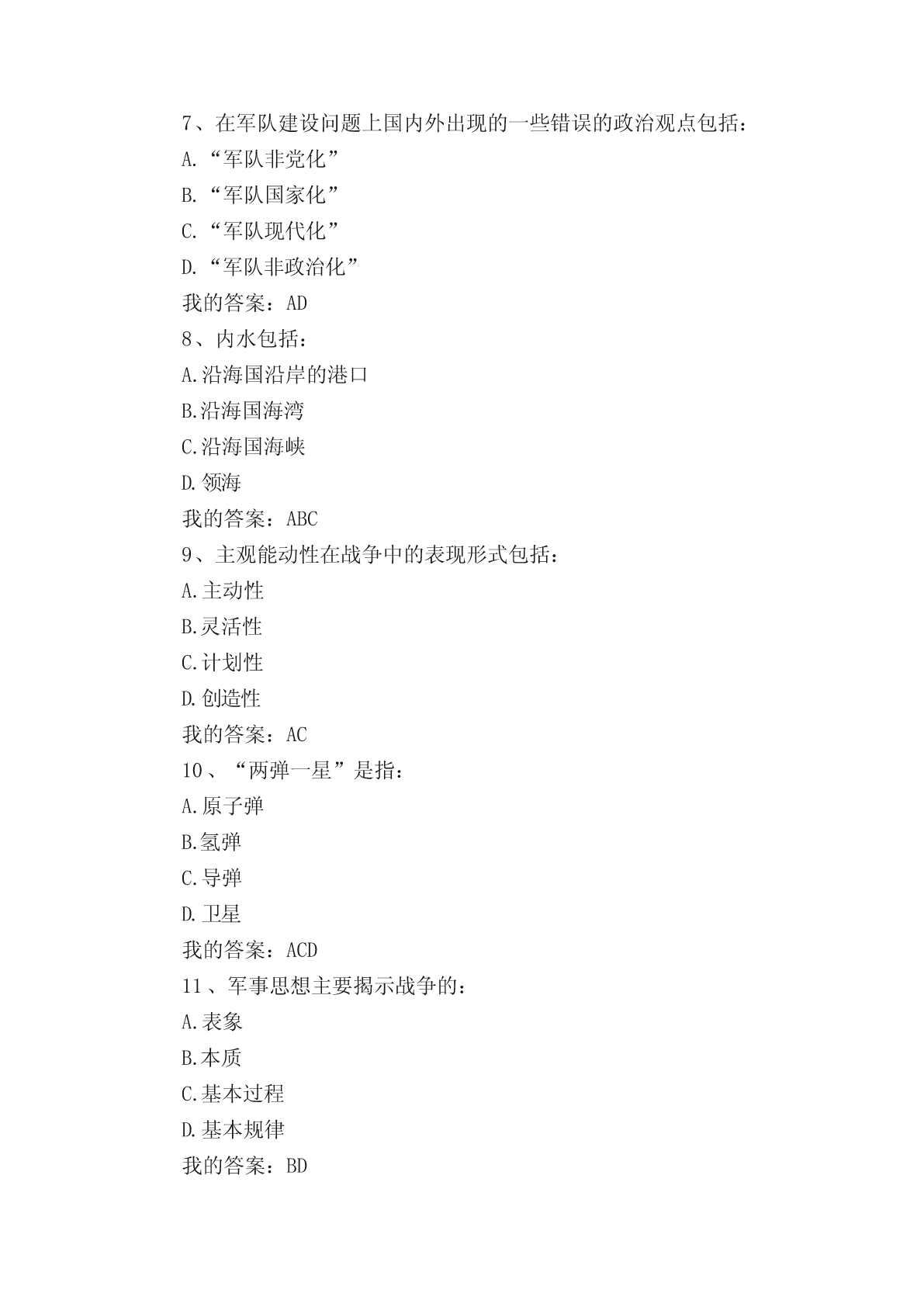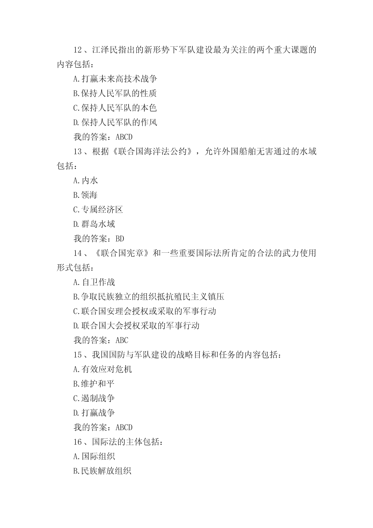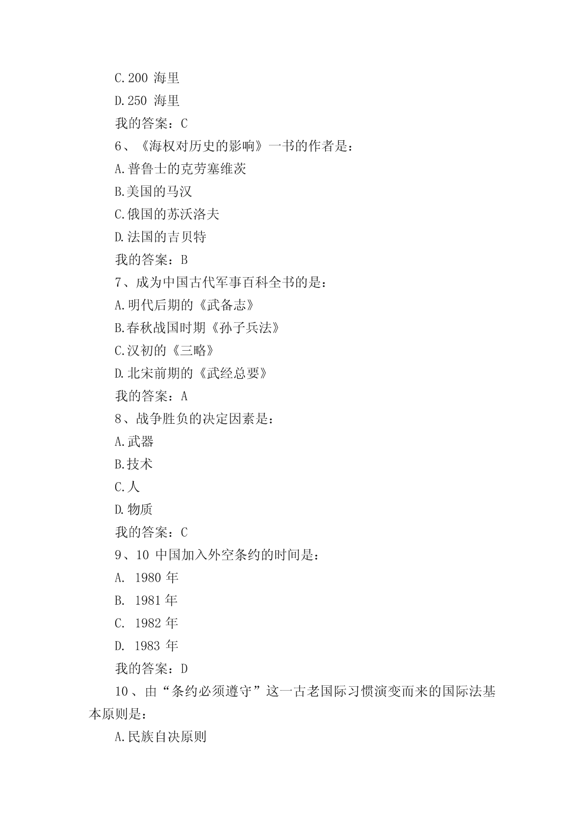 军事理论选择题(单选、多选)题。一、单选题1..纽伦堡审判和东京审判开创的是:A.追究个人战争刑事责任实践B.追究国家战争刑事责任实践C.追究政府战争刑事责任实践D.追究议会战争刑事责任实践我的答案:A2、标志近代主权独立国家出现、成为国际关系起点的事件是:A.威斯特伐利亚和约B.巴黎和约C.欧洲三十年战争D.第一次世界大战我的答案:A3、战争的基础是:A.政治B.文化C.道德D.经济我的答案:D4、当前我国国防与军队建设的核心是:A.增强打赢机械化条件下局部战争的能力B.增强打赢信息化条件下全面战争的能力C.增强打赢核化条件下局部战争的能力D.增强打赢信息化条件下局部战争的能力我的答案:D5、专属经济区,自领海基线量起不超过的宽度是:A.100海里B.150海里C.200海里D.250海里我的答案:C6、《海权对历史的影响》一书的作者是:A.普鲁士的克劳塞维茨B.美国的马汉C.俄国的苏沃洛夫D.法国的吉贝特我的答案:B7、成为中国古代军事百科全书的是:A.明代后期的《武备志》B.春秋战国时期《孙子兵法》C.汉初的《三略》D.北宋前期的《武经总要》我的答案:A8、战争胜负的决定因素是:A.武器B.技术C.人D.物质我的答案:C9、10中国加入外空条约的时间是:A.1980年B.1981年C.1982年D.1983年我的答案:D10、由“条约必须遵守”这一古老国际习惯演变而来的国际法基本原则是:A.民族自决原则B.和平解决国际争端原则C.平等互利原则D.忠诚履行国际义务原则我的答案:D11、战争是关系国家生死存亡的:A.经济问题B.文化问题C.政治问题D.道德问题我的答案:C12、尊重国家主权的最主要内容是:A.和平共处B.民族自决C.平等互利D.尊重领土完整我的答案:D13、毛泽东提出“核潜艇,一万年也要搞出来”的时间是:A.1957年B.1958年C.1959年D.1960年我的答案:C14、历史上第一个全面的海洋法法典是:A.大陆架公约B.领海与毗邻区公约C.公海公约D.联合国海洋法公约我的答案:D15、国际法的基本主体是:A.国际组织B.主权国家C.个人D.法人我的答案:B16、毛泽东对发展洲际导弹问题做出重要指示的时间是:A.1963年B.1964年C.1965年D.1966年我的答案:C17、《联合国海洋法公约》规定领海不应超过的宽度是:A.12海里B.15海里C.20海里D.24海里我的答案:A18、毛泽东军事思想的核心是:A.战略战术思想B.人民军队思想C.统一战线思想D.人民战争思想我的答案:D19、《联合国海洋法公约》规定毗连区从领海基线算起不超过的宽度是:A.12海里B.20海里C.24海里D.25海里我的答案:C20、毛泽东明确提出“要搞一点原子弹、氢弹”的时间是:A.1957年B.1958年C.1959年D.1960年我的答案:B21、《制空权》一书的作者是:A.英国的富勒B.法国的博福尔C.意大利的杜黑D.美国的托夫勒我的答案:C22、提出和平与发展是当代的两大主题的领导人是:A.毛泽东B.邓小平C.江泽民D.胡锦涛我的答案:B23、依法从严治军是我党我军:A.改革开放后倡导的治军思想B.新世纪新阶段倡导的治军思想C.一贯倡导的治军思想D.民主革命时期倡导的治军思想我的答案:C24、决定战争的是:A.经济B.政治C.道德D.文化我的答案:B25、新时期我军建设总目标的中心是:A.革命化B.正规化C.现代化D.文明化我的答案:C26、军事思想:A.具有阶级性B.不具有阶级性C.是中性的D.不具有意识形态性我的答案:A27、1970年《国际法原则宣言》关于主权原则内容的核心是:A.领土完整B.互不干涉C.各国主权平等D.相互独立我的答案:C28、提出实现干部队伍革命化、年轻化、知识化、专业化的领导人是:A.毛泽东B.邓小平C.江泽民D.胡锦涛我的答案:B二、多选题1、军队现代化包括:A.军事人才现代化B.武器装备现代化C.体制编制现代化D.军事理论现代化我的答案:ABCD2、在战争全局与战争局部的关系中:A.有的局部对全局有决定意义B.所有的局部对全局都有决定意义C.有的局部对全局不具有决定意义D.所有局部对全局都不具有决定意义我的答案:AC3、从形成上看,边界的类型包括:A.传统习惯边界B.任意指定边界C.条约确定边界