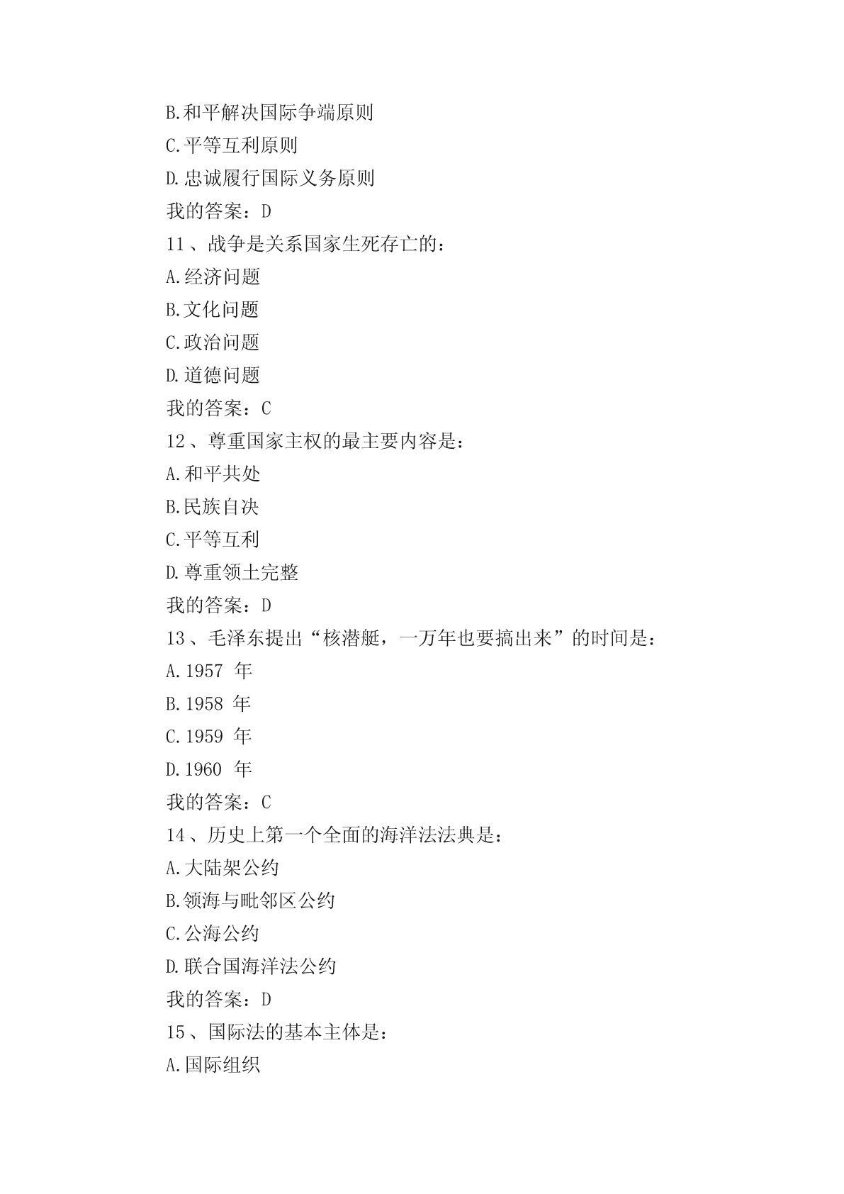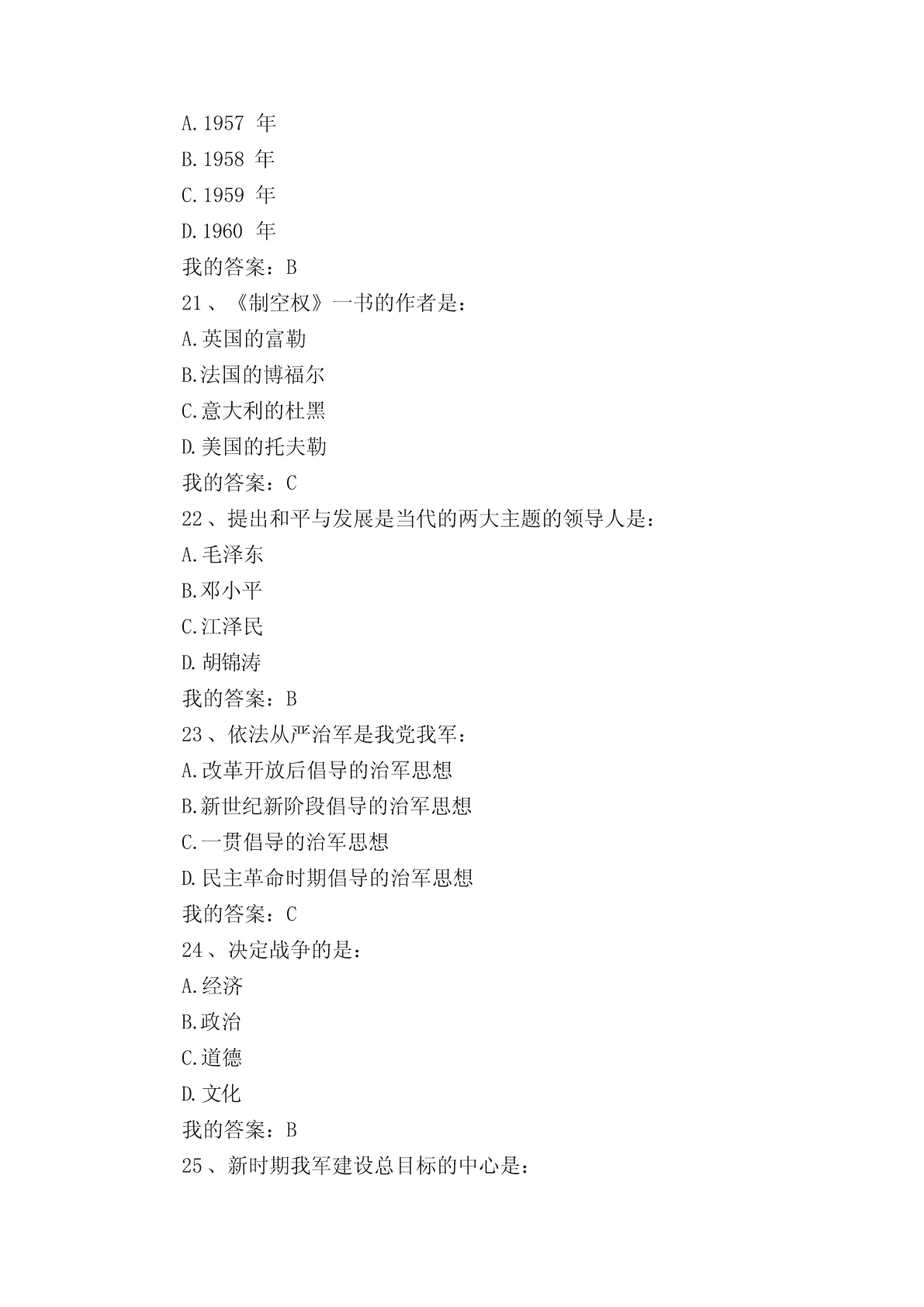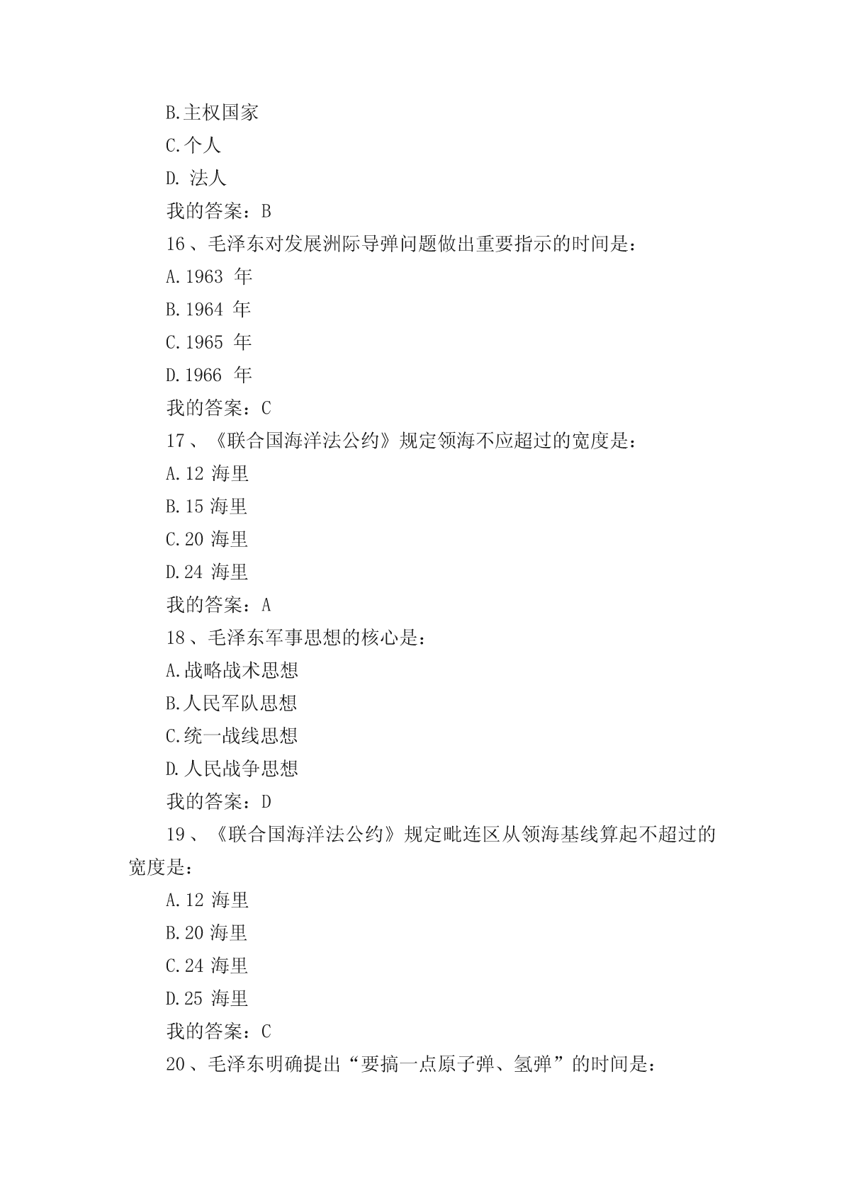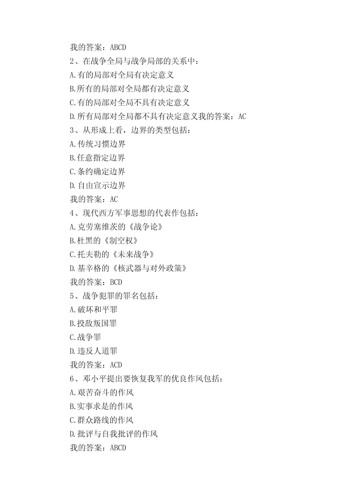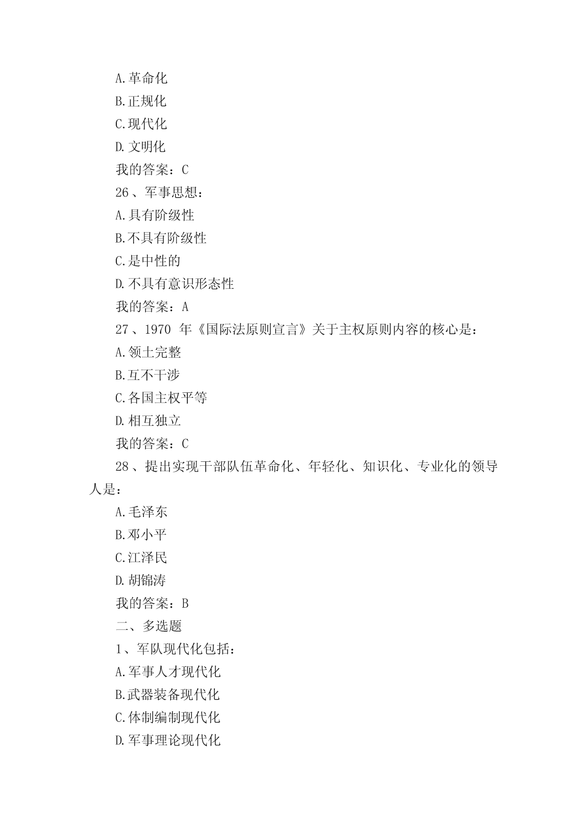 军事理论选择题(单选、多选)题。一、单选题1..纽伦堡审判和东京审判开创的是:A.追究个人战争刑事责任实践B.追究国家战争刑事责任实践C.追究政府战争刑事责任实践D.追究议会战争刑事责任实践我的答案:A2、标志近代主权独立国家出现、成为国际关系起点的事件是:A.威斯特伐利亚和约B.巴黎和约C.欧洲三十年战争D.第一次世界大战我的答案:A3、战争的基础是:A.政治B.文化C.道德D.经济我的答案:D4、当前我国国防与军队建设的核心是:A.增强打赢机械化条件下局部战争的能力B.增强打赢信息化条件下全面战争的能力C.增强打赢核化条件下局部战争的能力D.增强打赢信息化条件下局部战争的能力我的答案:D5、专属经济区,自领海基线量起不超过的宽度是:A.100海里B.150海里C.200海里D.250海里我的答案:C6、《海权对历史的影响》一书的作者是:A.普鲁士的克劳塞维茨B.美国的马汉C.俄国的苏沃洛夫D.法国的吉贝特我的答案:B7、成为中国古代军事百科全书的是:A.明代后期的《武备志》B.春秋战国时期《孙子兵法》C.汉初的《三略》D.北宋前期的《武经总要》我的答案:A8、战争胜负的决定因素是:A.武器B.技术C.人D.物质我的答案:C9、10中国加入外空条约的时间是:A.1980年B.1981年C.1982年D.1983年我的答案:D10、由“条约必须遵守”这一古老国际习惯演变而来的国际法基本原则是:A.民族自决原则B.和平解决国际争端原则C.平等互利原则D.忠诚履行国际义务原则我的答案:D11、战争是关系国家生死存亡的:A.经济问题B.文化问题C.政治问题D.道德问题我的答案:C12、尊重国家主权的最主要内容是:A.和平共处B.民族自决C.平等互利D.尊重领土完整我的答案:D13、毛泽东提出“核潜艇,一万年也要搞出来”的时间是:A.1957年B.1958年C.1959年D.1960年我的答案:C14、历史上第一个全面的海洋法法典是:A.大陆架公约B.领海与毗邻区公约C.公海公约D.联合国海洋法公约我的答案:D15、国际法的基本主体是:A.国际组织B.主权国家C.个人D.法人我的答案:B16、毛泽东对发展洲际导弹问题做出重要指示的时间是:A.1963年B.1964年C.1965年D.1966年我的答案:C17、《联合国海洋法公约》规定领海不应超过的宽度是:A.12海里B.15海里C.20海里D.24海里我的答案:A18、毛泽东军事思想的核心是:A.战略战术思想B.人民军队思想C.统一战线思想D.人民战争思想我的答案:D19、《联合国海洋法公约》规定毗连区从领海基线算起不超过的宽度是:A.12海里B.20海里C.24海里D.25海里我的答案:C20、毛泽东明确提出“要搞一点原子弹、氢弹”的时间是:A.1957年B.1958年C.1959年D.1960年我的答案:B21、《制空权》一书的作者是:A.英国的富勒B.法国的博福尔C.意大利的杜黑D.美国的托夫勒我的答案:C22、提出和平与发展是当代的两大主题的领导人是:A.毛泽东B.邓小平C.江泽民D.胡锦涛我的答案:B23、依法从严治军是我党我军:A.改革开放后倡导的治军思想B.新世纪新阶段倡导的治军思想C.一贯倡导的治军思想D.民主革命时期倡导的治军思想我的答案:C24、决定战争的是:A.经济B.政治C.道德D.文化我的答案:B25、新时期我军建设总目标的中心是:A.革命化B.正规化C.现代化D.文明化我的答案:C26、军事思想:A.具有阶级性B.不具有阶级性C.是中性的D.不具有意识形态性我的答案:A27、1970年《国际法原则宣言》关于主权原则内容的核心是:A.领土完整B.互不干涉C.各国主权平等D.相互独立我的答案:C28、提出实现干部队伍革命化、年轻化、知识化、专业化的领导人是:A.毛泽东B.邓小平C.江泽民D.胡锦涛我的答案:B二、多选题1、军队现代化包括:A.军事人才现代化B.武器装备现代化C.体制编制现代化D.军事理论现代化我的答案:ABCD2、在战争全局与战争局部的关系中:A.有的局部对全局有决定意义B.所有的局部对全局都有决定意义C.有的局部对全局不具有决定意义D.所有局部对全局都不具有决定意义我的答案:AC3、从形成上看,边界的类型包括:A.传统习惯边界B.任意指定边界C.条约确定边界