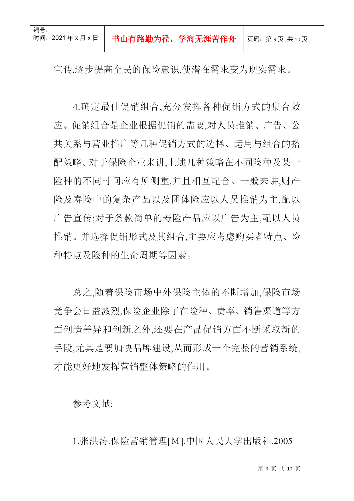 编号:时间:2021年x月x日书山有路勤为径,学海无涯苦作舟页码:第PAGE10页共NUMPAGES10页第PAGE\*MERGEFORMAT10页共NUMPAGES\*MERGEFORMAT10页浅论保险产品促销策略的创摘要:促销是保险营销中的重要策略之一,但我国保险产品促销目前主要以人员和广告为主,较少采用公共关系,忽略品牌建设。开发有效的传播途径,整合营销传播渠道,加快企业品牌建设是保险产品促销策略创新之所在。关键词:保险促销策略创新在现代保险市场营销活动中,促销策略起着十分重要的作用。由于保险产品本身的特殊性,促销对保险企业尤为重要。但目前我国保险公司,大都依赖传统的人员促销方式,存在“人海战术”、名牌意识不强等诸多问题。本文对目前我国保险产品促销的主要形式和存在的问题作了一定的分析,并着重指出了保险产品促销策略的创新思路。一、保险产品促销的特点由于保险产品自身具有无形性、复杂性等特点,因而保险产品的促销应区别于一般商品促销。掌握和分析保险产品促销的特点,是保险产品促销策略创新思路的始点。1.要使潜在需求显性化。每个人都存在保险需求,无论是对人身还是财产风险的保障。但这种需求是潜在的,因此,在保险产品促销中,首先要帮助客户树立风险防范意识,进而促成其接受保险产品。2.要使无形产品有形化。保险产品是一种无形商品,特别是寿险合同大多是长期合同,往往长达10年、20年甚至终身。因此在促销中,要尽可能使保险产品的作用和功能有形化,让客户比较直观地了解保险商品的作用和功能。3.要使复杂产品简单化。保险产品的设计是建立在复杂的数理方法的基础上,保险条款涉及的许多概念都具有很强的专业性。这决定了客户不可能像理解银行储蓄、股票那样容易地理解保险产品。因此,在保险产品促销中,要尽可能使得复杂的保险产品尤其是寿险产品变得简单易懂。4.要弱化保费支出对客户的心理压力。保费支出,特别是寿险保费,往往在数十年间需要每年持续缴费,这对客户往往会构成一种心理压力,在促销中可以运用保费分摊的办法;另外,还可以运用部分险种减额缴清功能来消除客户对未来缴费能力的担忧心理。5.要努力消除促销对象的抵制心理。目前,社会大众对保险认识尚不深刻,由于某些保险人员简单粗暴地促销方式,有些消费者出现抵制保险销售。所以保险促销要通过各种手段不断提高保险公司及销售人员的形象,从而消除保险对象的抵制心理。二、目前保险产品促销的主要形式及其存在的问题1.目前保险产品促销的主要形式。通常营销中所运用的主要促销手段是人员推销、广告、公共关系与营销推广。目前保险促销中所运用的主要形式是人员推销,其次是广告和营业推广,很少使用公共关系。人员推销是我国保险促销最主要的方式,目前我国个人营销员已达130多万人,一半以上的保户是通过营销员购买保险的。据山东保监局的调查显示,全省购买保险者,57%的人是通过营销员购买的。广告已逐渐被大型保险公司所重视,中国人寿、中国财产、太平洋保险、平安保险、太平人寿等保险公司都已在央视媒体及各地方媒体投放广告。营业推广作为立竿见影的促销方式,已受到众多保险公司的关注。如2004年太平人寿江苏分公司在“六一儿童节”期间进行的“阳光天使”活动,只要购买3万元保额的“阳光天使少儿重大疾病险”,就能通过太平人寿向“希望工程”捐助10元钱。再如平安人寿则从银行保险入手推出了”世纪栋梁”教育储蓄险种,不仅能在每个阶段返还一定的教育金,还特别制定了保单豁免功能,如果父母不幸失去工作能力,或患重大疾病,甚至不幸身故,便会承担起雪中送炭的一份责任。公共关系目前我国保险公司还很少使用,除中保财险借2008年北京奥运会展示公司形象外,在一些大的社会活动及文体事件中,几乎看不到其他保险公司的身影。显然,我国保险公司在促销中方式简单,很大程度上缺乏计划性、系统性,尤其是创新性。2.保险产品促销存在的主要问题。(1)过多依赖人员推销,造成了一定的负面影响。由于个人代理人队伍的增长能迅速带来保费的增长,因此快速增员即通过人员推销成为各公司主要促销手段。由于没有经过认真的筛选,且后期的培训支持都难以跟上,业务员的技能与素质下降。因此,过多依赖人员推销虽带来了业务的一时增长,但由于营销员素质参差不齐,业务员销售时的误导和隐瞒导致的客户投诉、退保的上升和续保的下降等,已有了相当的负面作用。(2)名牌意识不强,不注重塑造企业形象和营造企业文化。目前我国的保险公司更多的注重市场占有率、业务规模,而在很大程度上忽略了企业品牌的塑造与企业文化的建设,除少数公司外,大多公司还没有一整套系统的企业文化、企业经营理念,品牌意识比较淡薄。(3)公共关系运用程度低。公共关系是一个组织对外树立形象、积极
