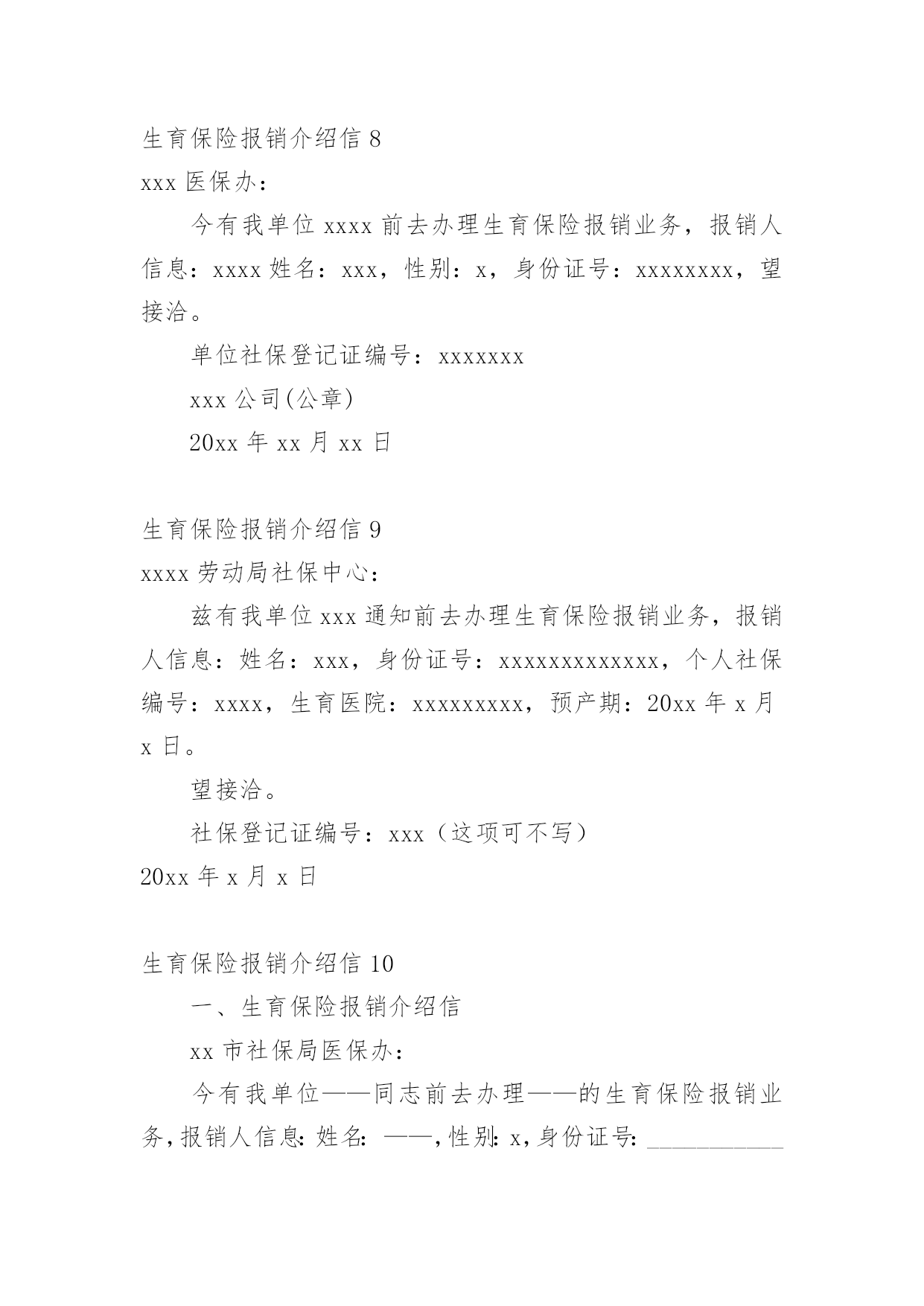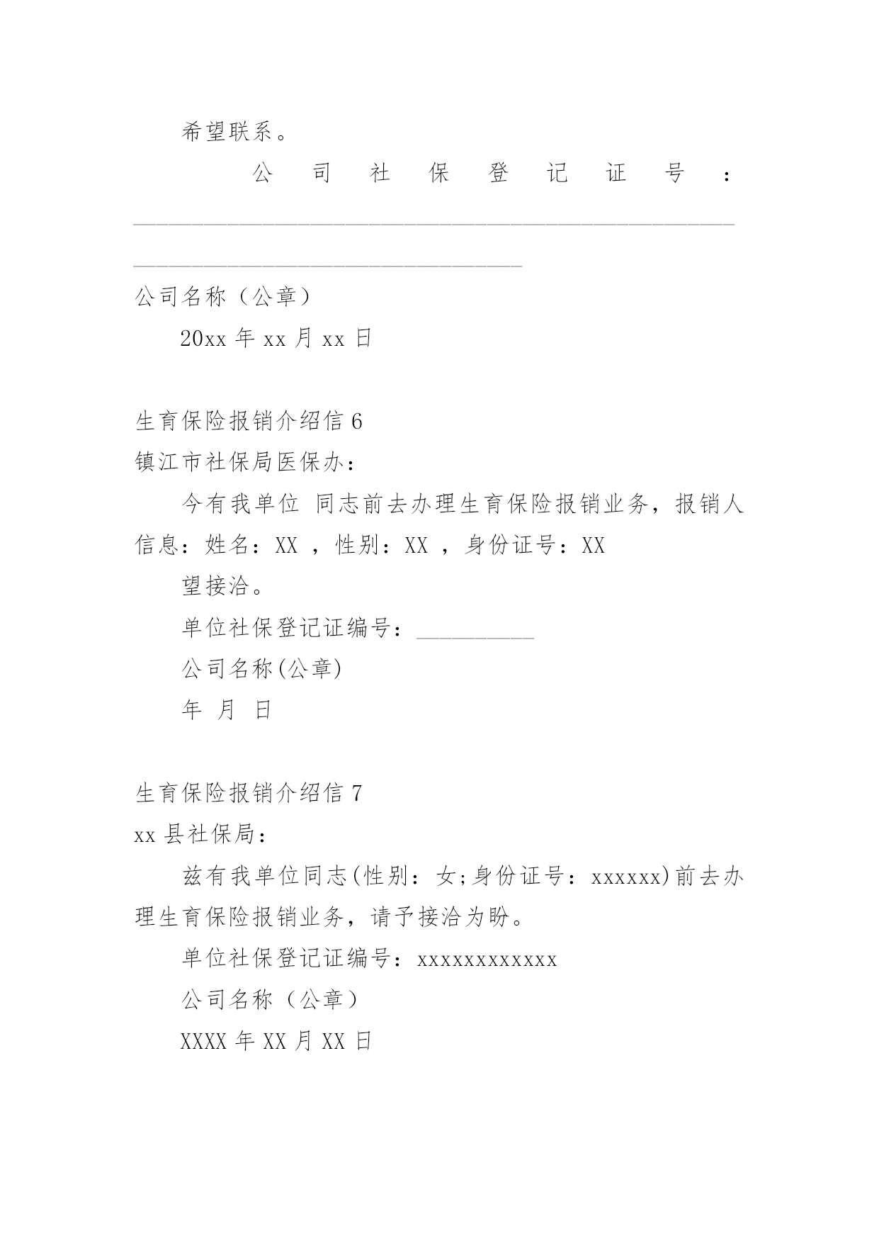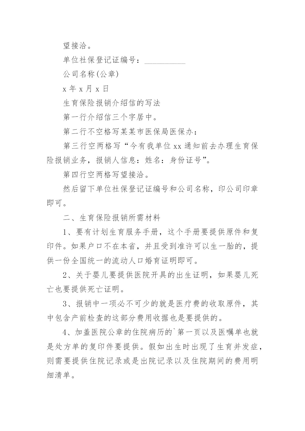 生育保险报销介绍信生育保险报销介绍信15篇在不断进步的时代,能够利用到介绍信的场合越来越多,介绍信是证明自己身份,让对方予以配合工作的一种文书。大家知道介绍信的格式吗?以下是小编精心整理的生育保险报销介绍信,希望对大家有所帮助。生育保险报销介绍信1济南市社保局医保办:今有我单位同志前去办理生育保险保险业务。报销人信息:姓名:xxx性别:x身份证号:xxxxxxxxx望接洽。单位社保登记证编号:xxxxxxxxx公司名称xxxxxxxx生育保险报销介绍信2xxx劳动局社保中心:兹有我单位xxx通知前去办理生育保险报销业务,报销人信息:姓名:xxxx,身份证号:xxxxxxxxxxxxxxxxxxx,个人社保编号:xxxxx,生育医院:xxxxxx,预产期:xx年x月x日。望接洽。社保登记证编号:xxxx(这项可不写)单位名称(盖章)20xx年x月x日生育保险报销介绍信3xx镇江市社保局医保办:今有我单位xx前去办理生育保险报销业务,报销人信息:姓名:xx,性别:xx,身份证号:xxxxxxxxxxxx。望接洽。单位社保登记证编号:xxxxxx公司名称(公章)xxxxxxx年xx月xx日生育保险报销介绍信4一般来说,介绍信的格式可以是这样的:第一行介绍信三个字居中。第二行不空格写某某市医保局医保办:第三行空两格写“今有我单位xx通知前去办理生育保险报销业务,报销人信息:姓名:身份证号”。第四行空两格写望接洽。然后留下单位社保登记证编号和公司名称,印公司印章即可。那么,除了介绍信意外,生育保险报销还需要携带哪些材料呢?首先要有计划生育服务手册,这个手册要提供原件和复印件。如果户口不在本省,并且受到准许可以生一胎的,提供一份全国统一的流动人口婚育证明即可。此外,关于婴儿要提供医院开具的出生证明,如果婴儿死亡也要提供死亡证明。报销中一项必不可少的`就是医疗费的收取原件,其中包含产前检查的这部分费用收据也是要提供的。加盖医院公章的住院病历的第一页以及医嘱单也就是处方单的复印件要提供。加入出生时出现了生育并发症,则需要提供住院记录或是出院记录以及住院期间的费用明细清单。女职工还要提供一个本人的银行存折或是卡账号,银行应当是生育保险金开户所在的银行,将这些复印件一并提交。各地的生育保险报销政策不太一样,但是主要都是一些需要提交的材料,然后拿着单位的介绍信,就可以办理报销手续了。另外,生育保险也报销计划生育费用,如果女职工发生了引产、流产等费用,也是要提供介绍信、计划生育服务手册、医疗费收据、手术证明、病例、账户信息等,和一样的流程报销计划生育的费用。做节育手术的,提供介绍信、检查手术费收据、病例、手术证明、帐号等信息。生育保险报销介绍信5xx社保局医保办:今天我单位——同志去办理生育保险报销业务。报销人信息:姓名:xxx,性别:x,身份证号码:______________。希望联系。公司社保登记证号:____________________________________________________________________________________公司名称(公章)20xx年xx月xx日生育保险报销介绍信6镇江市社保局医保办:今有我单位同志前去办理生育保险报销业务,报销人信息:姓名:XX,性别:XX,身份证号:XX望接洽。单位社保登记证编号:__________公司名称(公章)年月日生育保险报销介绍信7xx县社保局:兹有我单位同志(性别:女;身份证号:xxxxxx)前去办理生育保险报销业务,请予接洽为盼。单位社保登记证编号:xxxxxxxxxxxx公司名称(公章)XXXX年XX月XX日生育保险报销介绍信8xxx医保办:今有我单位xxxx前去办理生育保险报销业务,报销人信息:xxxx姓名:xxx,性别:x,身份证号:xxxxxxxx,望接洽。单位社保登记证编号:xxxxxxxxxx公司(公章)20xx年xx月xx日生育保险报销介绍信9xxxx劳动局社保中心:兹有我单位xxx通知前去办理生育保险报销业务,报销人信息:姓名:xxx,身份证号:xxxxxxxxxxxxx,个人社保编号:xxxx,生育医院:xxxxxxxxx,预产期:20xx年x月x日。望接洽。社保登记证编号:xxx(这项可不写)20xx年x月x日生育保险报销介绍信10一、生育保险报销介绍信xx市社保局医保办:今有我单位——同志前去办理——的生育保险报销业务,报销人信息:姓名:——,性别:x,身份证号:___________望接洽。单位社保登记证编号:__________公司名称(公章)x年x月x日生育保险报销介绍信的写法第一行介绍信三个字居中。第二行不空格写某某市医保局医保办:第三行空两格写“今有我单位xx通知前去办理生育保险报销业务,报销人信息:姓名:身份证号”