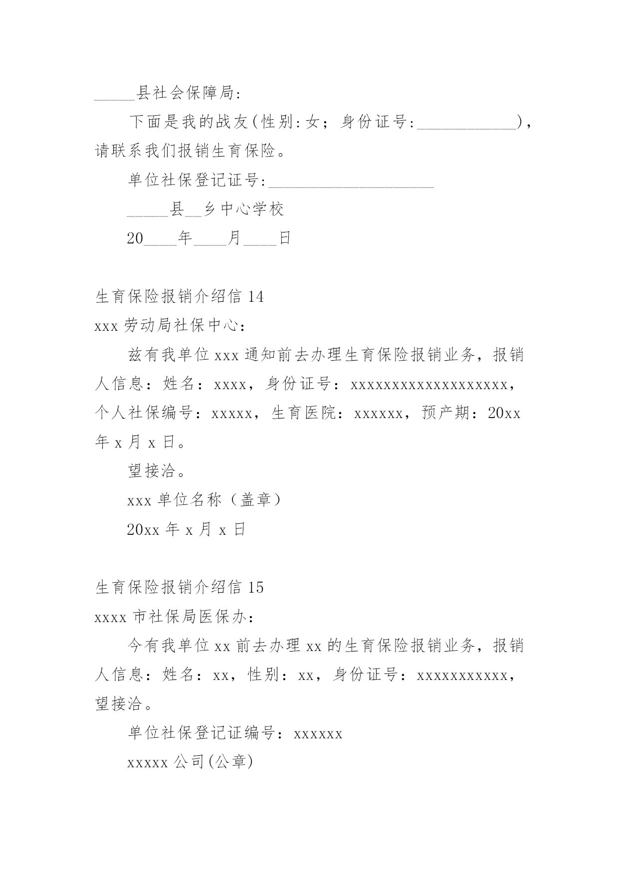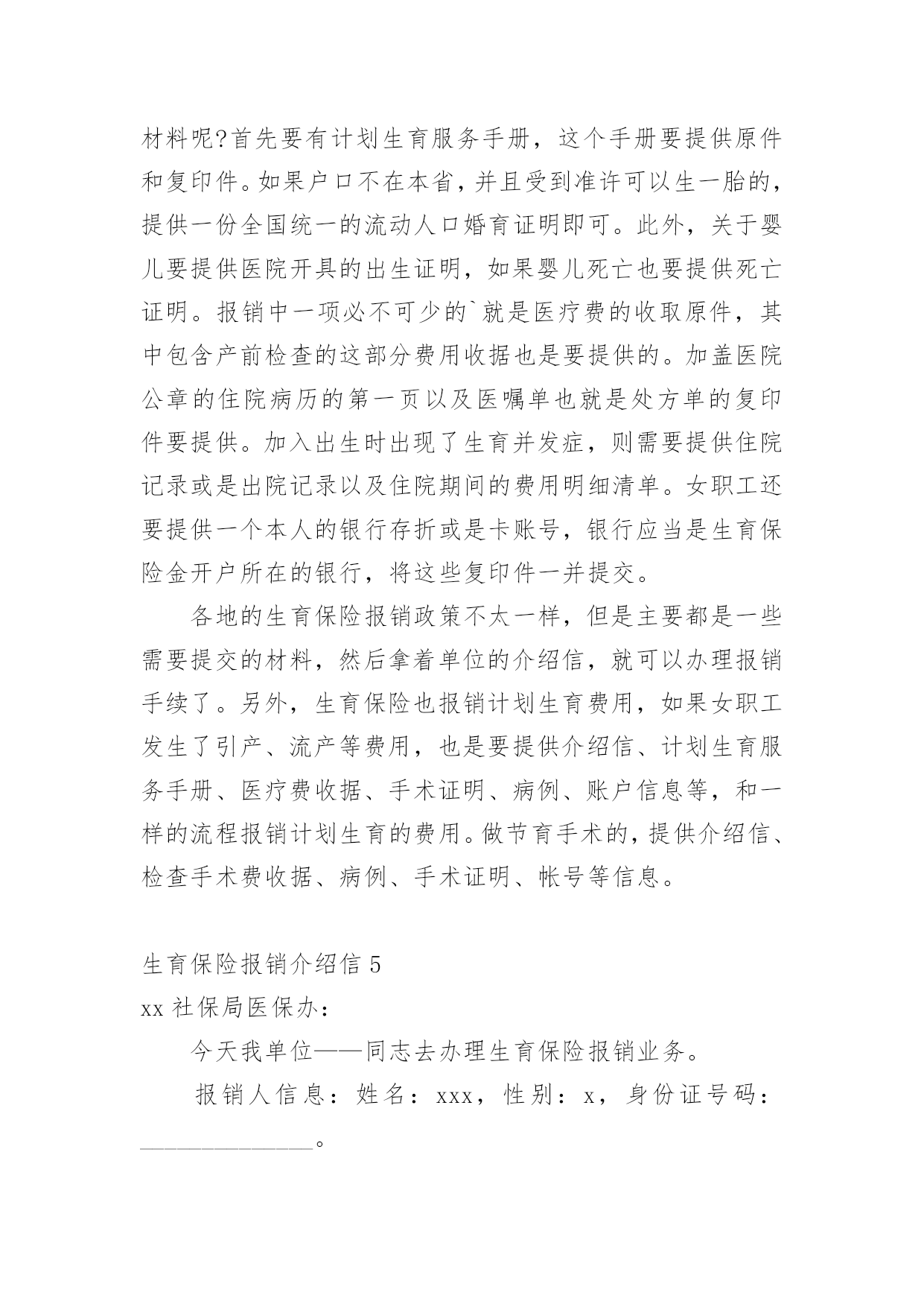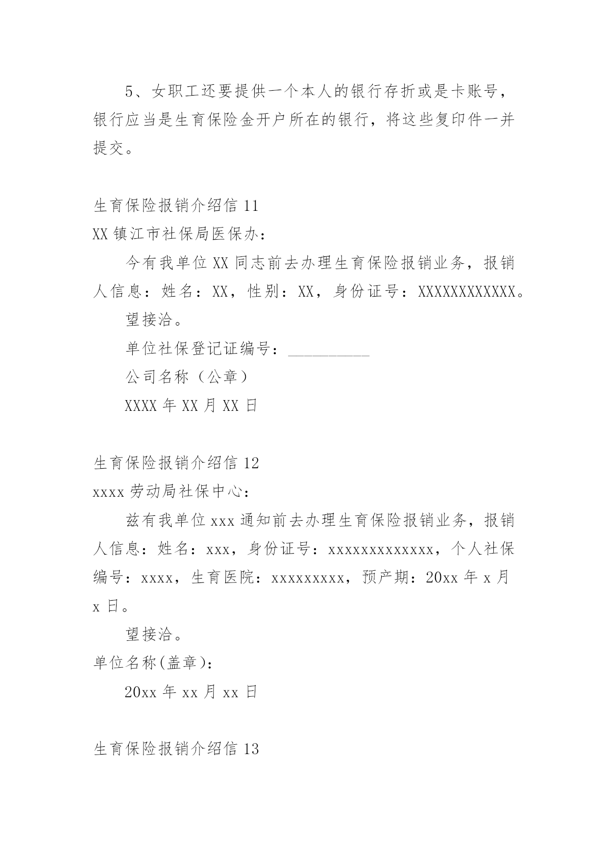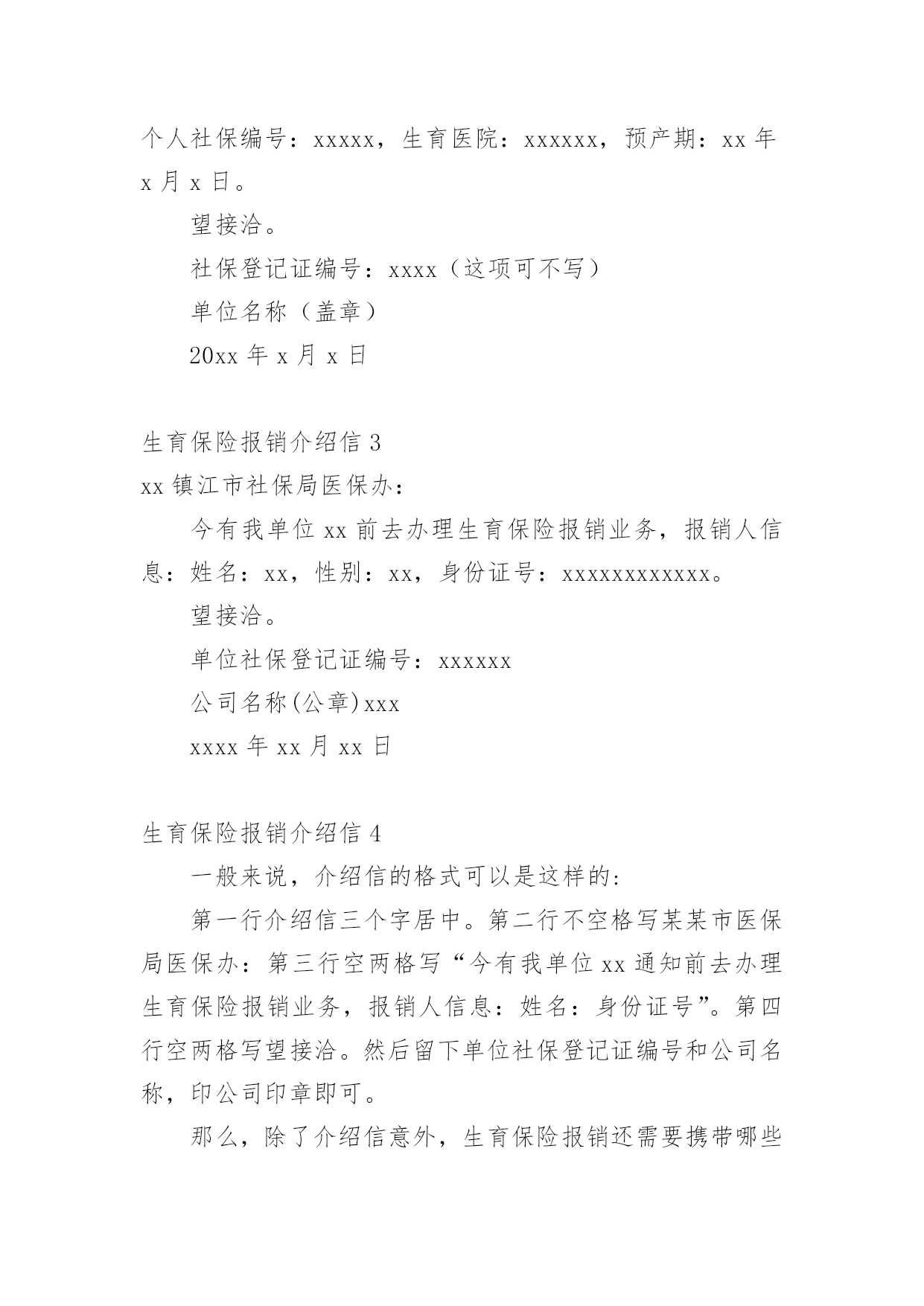 生育保险报销介绍信生育保险报销介绍信15篇在不断进步的时代,能够利用到介绍信的场合越来越多,介绍信是证明自己身份,让对方予以配合工作的一种文书。大家知道介绍信的格式吗?以下是小编精心整理的生育保险报销介绍信,希望对大家有所帮助。生育保险报销介绍信1济南市社保局医保办:今有我单位同志前去办理生育保险保险业务。报销人信息:姓名:xxx性别:x身份证号:xxxxxxxxx望接洽。单位社保登记证编号:xxxxxxxxx公司名称xxxxxxxx生育保险报销介绍信2xxx劳动局社保中心:兹有我单位xxx通知前去办理生育保险报销业务,报销人信息:姓名:xxxx,身份证号:xxxxxxxxxxxxxxxxxxx,个人社保编号:xxxxx,生育医院:xxxxxx,预产期:xx年x月x日。望接洽。社保登记证编号:xxxx(这项可不写)单位名称(盖章)20xx年x月x日生育保险报销介绍信3xx镇江市社保局医保办:今有我单位xx前去办理生育保险报销业务,报销人信息:姓名:xx,性别:xx,身份证号:xxxxxxxxxxxx。望接洽。单位社保登记证编号:xxxxxx公司名称(公章)xxxxxxx年xx月xx日生育保险报销介绍信4一般来说,介绍信的格式可以是这样的:第一行介绍信三个字居中。第二行不空格写某某市医保局医保办:第三行空两格写“今有我单位xx通知前去办理生育保险报销业务,报销人信息:姓名:身份证号”。第四行空两格写望接洽。然后留下单位社保登记证编号和公司名称,印公司印章即可。那么,除了介绍信意外,生育保险报销还需要携带哪些材料呢?首先要有计划生育服务手册,这个手册要提供原件和复印件。如果户口不在本省,并且受到准许可以生一胎的,提供一份全国统一的流动人口婚育证明即可。此外,关于婴儿要提供医院开具的出生证明,如果婴儿死亡也要提供死亡证明。报销中一项必不可少的`就是医疗费的收取原件,其中包含产前检查的这部分费用收据也是要提供的。加盖医院公章的住院病历的第一页以及医嘱单也就是处方单的复印件要提供。加入出生时出现了生育并发症,则需要提供住院记录或是出院记录以及住院期间的费用明细清单。女职工还要提供一个本人的银行存折或是卡账号,银行应当是生育保险金开户所在的银行,将这些复印件一并提交。各地的生育保险报销政策不太一样,但是主要都是一些需要提交的材料,然后拿着单位的介绍信,就可以办理报销手续了。另外,生育保险也报销计划生育费用,如果女职工发生了引产、流产等费用,也是要提供介绍信、计划生育服务手册、医疗费收据、手术证明、病例、账户信息等,和一样的流程报销计划生育的费用。做节育手术的,提供介绍信、检查手术费收据、病例、手术证明、帐号等信息。生育保险报销介绍信5xx社保局医保办:今天我单位——同志去办理生育保险报销业务。报销人信息:姓名:xxx,性别:x,身份证号码:______________。希望联系。公司社保登记证号:____________________________________________________________________________________公司名称(公章)20xx年xx月xx日生育保险报销介绍信6镇江市社保局医保办:今有我单位同志前去办理生育保险报销业务,报销人信息:姓名:XX,性别:XX,身份证号:XX望接洽。单位社保登记证编号:__________公司名称(公章)年月日生育保险报销介绍信7xx县社保局:兹有我单位同志(性别:女;身份证号:xxxxxx)前去办理生育保险报销业务,请予接洽为盼。单位社保登记证编号:xxxxxxxxxxxx公司名称(公章)XXXX年XX月XX日生育保险报销介绍信8xxx医保办:今有我单位xxxx前去办理生育保险报销业务,报销人信息:xxxx姓名:xxx,性别:x,身份证号:xxxxxxxx,望接洽。单位社保登记证编号:xxxxxxxxxx公司(公章)20xx年xx月xx日生育保险报销介绍信9xxxx劳动局社保中心:兹有我单位xxx通知前去办理生育保险报销业务,报销人信息:姓名:xxx,身份证号:xxxxxxxxxxxxx,个人社保编号:xxxx,生育医院:xxxxxxxxx,预产期:20xx年x月x日。望接洽。社保登记证编号:xxx(这项可不写)20xx年x月x日生育保险报销介绍信10一、生育保险报销介绍信xx市社保局医保办:今有我单位——同志前去办理——的生育保险报销业务,报销人信息:姓名:——,性别:x,身份证号:___________望接洽。单位社保登记证编号:__________公司名称(公章)x年x月x日生育保险报销介绍信的写法第一行介绍信三个字居中。第二行不空格写某某市医保局医保办:第三行空两格写“今有我单位xx通知前去办理生育保险报销业务,报销人信息:姓名:身份证号”