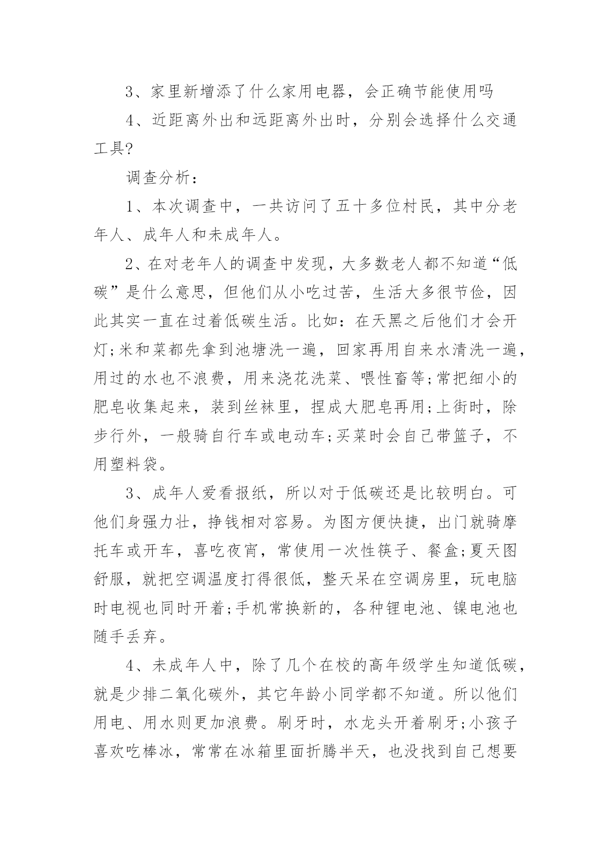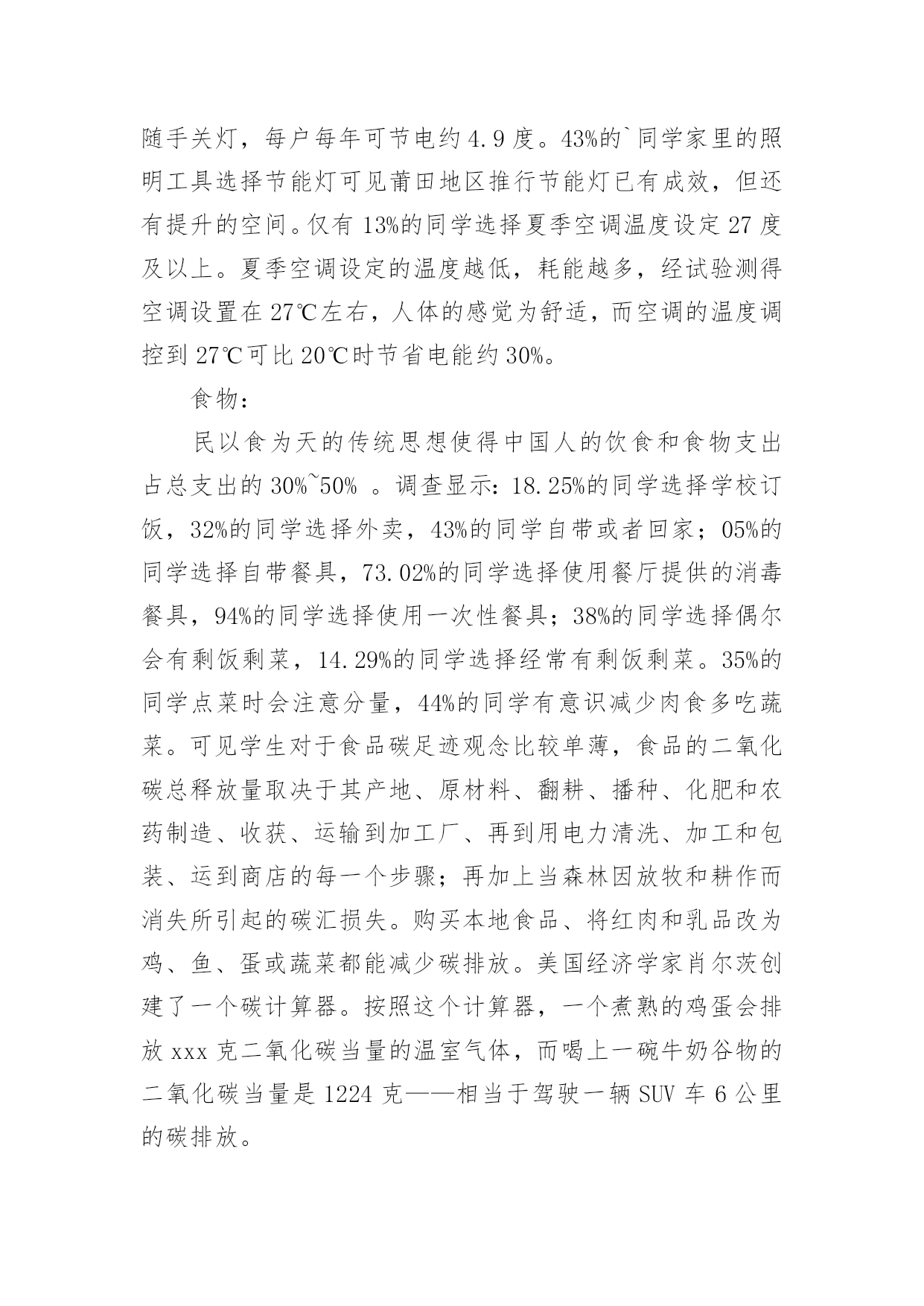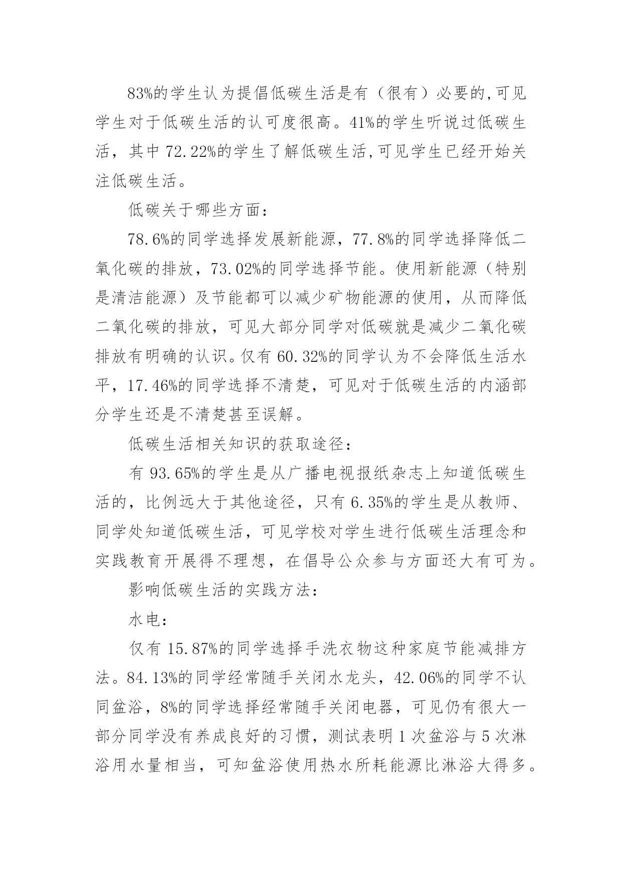 低碳环保调查报告低碳环保调查报告我们眼下的社会,越来越多人会去使用报告,不同的报告内容同样也是不同的。那么一般报告是怎么写的呢?以下是小编为大家整理的低碳环保调查报告,欢迎大家分享。低碳环保调查报告1调查对象与方法:对象为随机抽取仙游县华侨中学高中三个年级同学,参加问卷共有126人。调查方法:采用自行设计的“高中学生关于低碳生活的调查问卷”,内容主要包括高中学生对于低碳生活的认识状况、态度状况和行为状况。分析方法:编码问卷全部回收后,进行数据录入,运用数据分析软件对数据进行整理、分析。调查结果及分析:17%的同学选择很有必要建立“低碳生活一族”社团,92%的同学选择可有可无。可见同学对学校倡导低碳生活理念有较高的认同度与参与愿意。低碳生活内涵、内容的熟悉程度:83%的学生认为提倡低碳生活是有(很有)必要的,可见学生对于低碳生活的认可度很高。41%的学生听说过低碳生活,其中72.22%的学生了解低碳生活,可见学生已经开始关注低碳生活。低碳关于哪些方面:78.6%的同学选择发展新能源,77.8%的同学选择降低二氧化碳的排放,73.02%的同学选择节能。使用新能源(特别是清洁能源)及节能都可以减少矿物能源的使用,从而降低二氧化碳的排放,可见大部分同学对低碳就是减少二氧化碳排放有明确的认识。仅有60.32%的同学认为不会降低生活水平,17.46%的同学选择不清楚,可见对于低碳生活的内涵部分学生还是不清楚甚至误解。低碳生活相关知识的获取途径:有93.65%的学生是从广播电视报纸杂志上知道低碳生活的,比例远大于其他途径,只有6.35%的学生是从教师、同学处知道低碳生活,可见学校对学生进行低碳生活理念和实践教育开展得不理想,在倡导公众参与方面还大有可为。影响低碳生活的实践方法:水电:仅有15.87%的同学选择手洗衣物这种家庭节能减排方法。84.13%的同学经常随手关闭水龙头,42.06%的同学不认同盆浴,8%的同学选择经常随手关闭电器,可见仍有很大一部分同学没有养成良好的习惯,测试表明1次盆浴与5次淋浴用水量相当,可知盆浴使用热水所耗能源比淋浴大得多。随手关灯,每户每年可节电约4.9度。43%的`同学家里的照明工具选择节能灯可见莆田地区推行节能灯已有成效,但还有提升的空间。仅有13%的同学选择夏季空调温度设定27度及以上。夏季空调设定的温度越低,耗能越多,经试验测得空调设置在27℃左右,人体的感觉为舒适,而空调的温度调控到27℃可比20℃时节省电能约30%。食物:民以食为天的传统思想使得中国人的饮食和食物支出占总支出的30%~50%。调查显示:18.25%的同学选择学校订饭,32%的同学选择外卖,43%的同学自带或者回家;05%的同学选择自带餐具,73.02%的同学选择使用餐厅提供的消毒餐具,94%的同学选择使用一次性餐具;38%的同学选择偶尔会有剩饭剩菜,14.29%的同学选择经常有剩饭剩菜。35%的同学点菜时会注意分量,44%的同学有意识减少肉食多吃蔬菜。可见学生对于食品碳足迹观念比较单薄,食品的二氧化碳总释放量取决于其产地、原材料、翻耕、播种、化肥和农药制造、收获、运输到加工厂、再到用电力清洗、加工和包装、运到商店的每一个步骤;再加上当森林因放牧和耕作而消失所引起的碳汇损失。购买本地食品、将红肉和乳品改为鸡、鱼、蛋或蔬菜都能减少碳排放。美国经济学家肖尔茨创建了一个碳计算器。按照这个计算器,一个煮熟的鸡蛋会排放xxx克二氧化碳当量的温室气体,而喝上一碗牛奶谷物的二氧化碳当量是1224克——相当于驾驶一辆SUV车6公里的碳排放。穿戴:xx.xx%的同学有较少不怎么穿的衣服,71%的同学有较多不怎么穿的衣服。学生对穿戴产生的碳排放意识薄弱。出行:26.2%的学生使用公交车,64.29%的学生步行或自行车,9.52%的学生私家车或者打车。55.56%的同学经常选择绿色交通工具,42.06%的同学有时选择绿色交通工具。调查结论:目前高中学生对低碳生活的了解情况认知度参差不齐,大部分学生对低碳生活的了解仅仅限于表面,并没有深入了解,残缺性低碳生活认知必然造成部分青少年在践行低碳生活过程中做得不尽人意,多数学生不会探索科学方法计算家庭或个人践行低碳生活的外在价值。在日常生活中,学生能做到一些与低碳生活要求相符的行动,但是同时很多高中学生,买东西追求时尚,吃穿、出行等方面浪费现象较严重,主要存在不能在衣食住行用等各个方面都践行低碳生活、不能自觉地、持之以恒地践行低碳生活、不善于使用科学方法践行低碳生活等状况。所以有必要加强平常的宣传教育力度,指导学生对低碳生活进行系统的了解和学习。对实践活动的建议:为了树立高中学生低碳生活的思想观念和社会责任意识,培养学生从自身做起,从点滴做起,养成良好的“低碳生活”习惯;鼓励高中学生能身体力行,为自己、为社会、