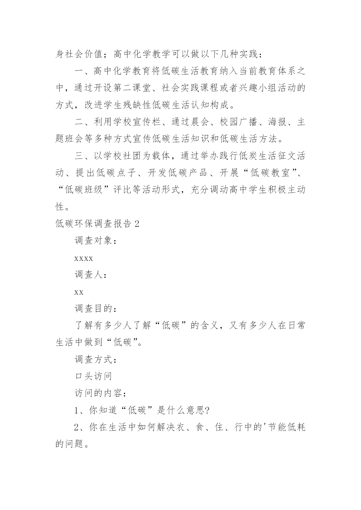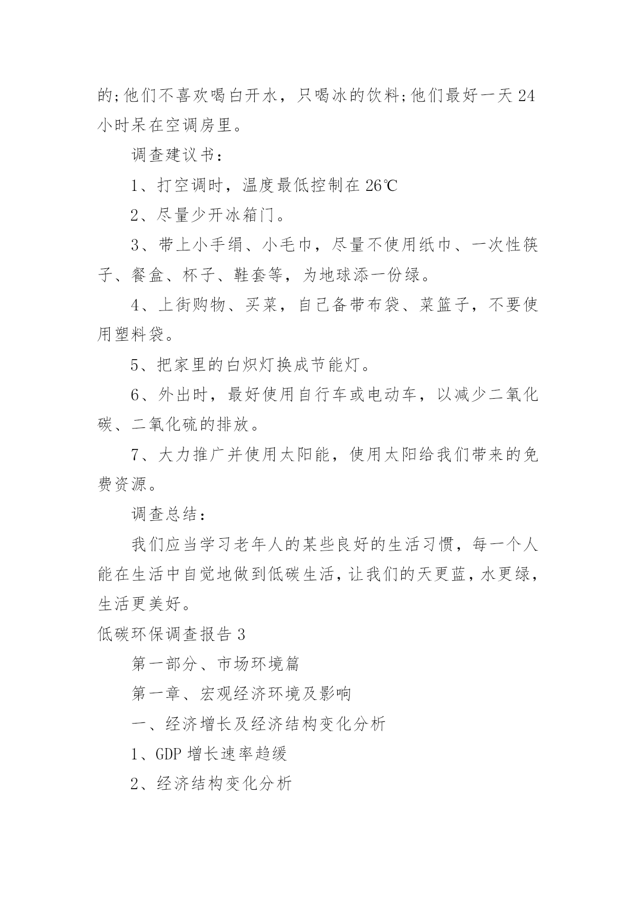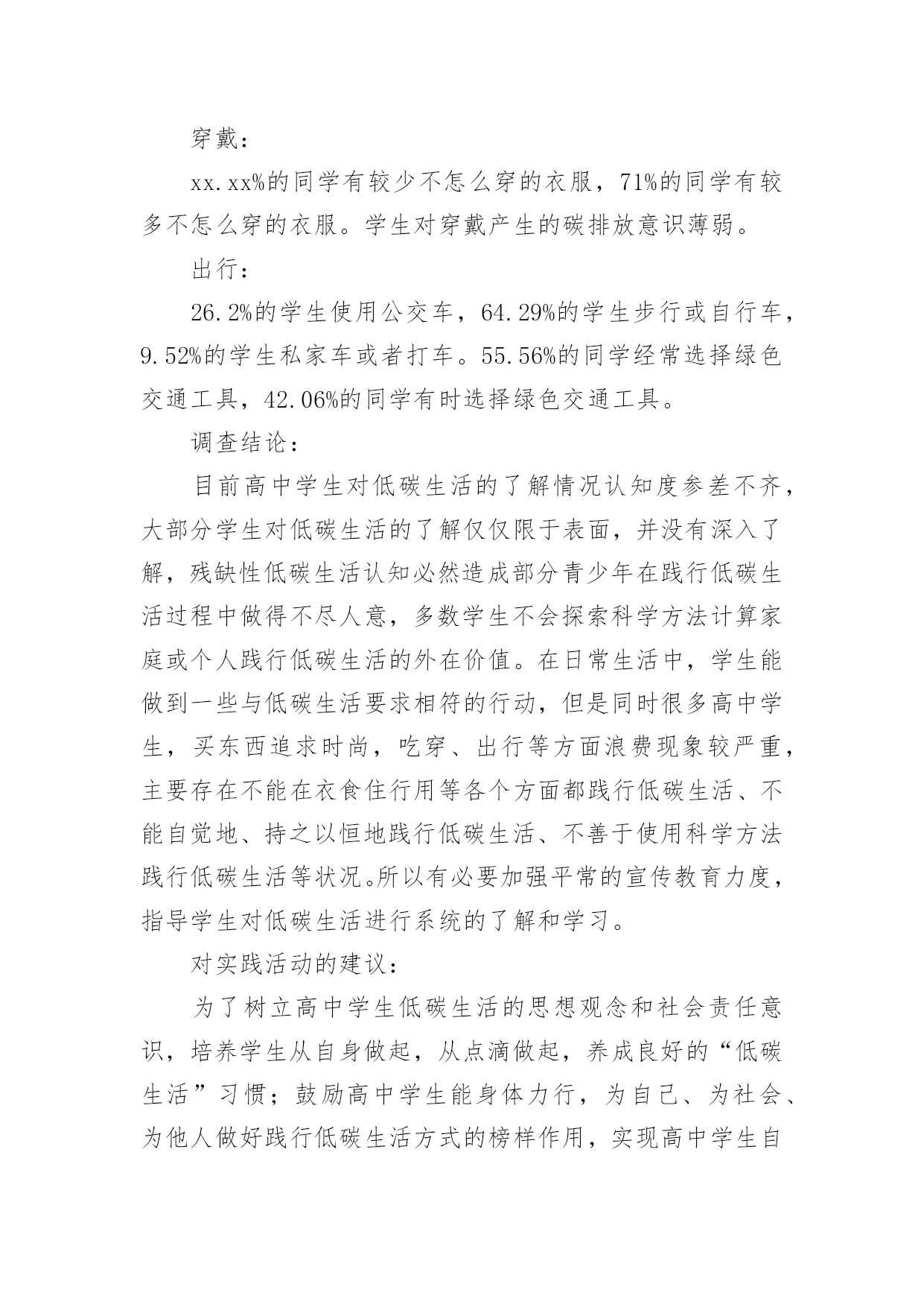 低碳环保调查报告低碳环保调查报告我们眼下的社会,越来越多人会去使用报告,不同的报告内容同样也是不同的。那么一般报告是怎么写的呢?以下是小编为大家整理的低碳环保调查报告,欢迎大家分享。低碳环保调查报告1调查对象与方法:对象为随机抽取仙游县华侨中学高中三个年级同学,参加问卷共有126人。调查方法:采用自行设计的“高中学生关于低碳生活的调查问卷”,内容主要包括高中学生对于低碳生活的认识状况、态度状况和行为状况。分析方法:编码问卷全部回收后,进行数据录入,运用数据分析软件对数据进行整理、分析。调查结果及分析:17%的同学选择很有必要建立“低碳生活一族”社团,92%的同学选择可有可无。可见同学对学校倡导低碳生活理念有较高的认同度与参与愿意。低碳生活内涵、内容的熟悉程度:83%的学生认为提倡低碳生活是有(很有)必要的,可见学生对于低碳生活的认可度很高。41%的学生听说过低碳生活,其中72.22%的学生了解低碳生活,可见学生已经开始关注低碳生活。低碳关于哪些方面:78.6%的同学选择发展新能源,77.8%的同学选择降低二氧化碳的排放,73.02%的同学选择节能。使用新能源(特别是清洁能源)及节能都可以减少矿物能源的使用,从而降低二氧化碳的排放,可见大部分同学对低碳就是减少二氧化碳排放有明确的认识。仅有60.32%的同学认为不会降低生活水平,17.46%的同学选择不清楚,可见对于低碳生活的内涵部分学生还是不清楚甚至误解。低碳生活相关知识的获取途径:有93.65%的学生是从广播电视报纸杂志上知道低碳生活的,比例远大于其他途径,只有6.35%的学生是从教师、同学处知道低碳生活,可见学校对学生进行低碳生活理念和实践教育开展得不理想,在倡导公众参与方面还大有可为。影响低碳生活的实践方法:水电:仅有15.87%的同学选择手洗衣物这种家庭节能减排方法。84.13%的同学经常随手关闭水龙头,42.06%的同学不认同盆浴,8%的同学选择经常随手关闭电器,可见仍有很大一部分同学没有养成良好的习惯,测试表明1次盆浴与5次淋浴用水量相当,可知盆浴使用热水所耗能源比淋浴大得多。随手关灯,每户每年可节电约4.9度。43%的`同学家里的照明工具选择节能灯可见莆田地区推行节能灯已有成效,但还有提升的空间。仅有13%的同学选择夏季空调温度设定27度及以上。夏季空调设定的温度越低,耗能越多,经试验测得空调设置在27℃左右,人体的感觉为舒适,而空调的温度调控到27℃可比20℃时节省电能约30%。食物:民以食为天的传统思想使得中国人的饮食和食物支出占总支出的30%~50%。调查显示:18.25%的同学选择学校订饭,32%的同学选择外卖,43%的同学自带或者回家;05%的同学选择自带餐具,73.02%的同学选择使用餐厅提供的消毒餐具,94%的同学选择使用一次性餐具;38%的同学选择偶尔会有剩饭剩菜,14.29%的同学选择经常有剩饭剩菜。35%的同学点菜时会注意分量,44%的同学有意识减少肉食多吃蔬菜。可见学生对于食品碳足迹观念比较单薄,食品的二氧化碳总释放量取决于其产地、原材料、翻耕、播种、化肥和农药制造、收获、运输到加工厂、再到用电力清洗、加工和包装、运到商店的每一个步骤;再加上当森林因放牧和耕作而消失所引起的碳汇损失。购买本地食品、将红肉和乳品改为鸡、鱼、蛋或蔬菜都能减少碳排放。美国经济学家肖尔茨创建了一个碳计算器。按照这个计算器,一个煮熟的鸡蛋会排放xxx克二氧化碳当量的温室气体,而喝上一碗牛奶谷物的二氧化碳当量是1224克——相当于驾驶一辆SUV车6公里的碳排放。穿戴:xx.xx%的同学有较少不怎么穿的衣服,71%的同学有较多不怎么穿的衣服。学生对穿戴产生的碳排放意识薄弱。出行:26.2%的学生使用公交车,64.29%的学生步行或自行车,9.52%的学生私家车或者打车。55.56%的同学经常选择绿色交通工具,42.06%的同学有时选择绿色交通工具。调查结论:目前高中学生对低碳生活的了解情况认知度参差不齐,大部分学生对低碳生活的了解仅仅限于表面,并没有深入了解,残缺性低碳生活认知必然造成部分青少年在践行低碳生活过程中做得不尽人意,多数学生不会探索科学方法计算家庭或个人践行低碳生活的外在价值。在日常生活中,学生能做到一些与低碳生活要求相符的行动,但是同时很多高中学生,买东西追求时尚,吃穿、出行等方面浪费现象较严重,主要存在不能在衣食住行用等各个方面都践行低碳生活、不能自觉地、持之以恒地践行低碳生活、不善于使用科学方法践行低碳生活等状况。所以有必要加强平常的宣传教育力度,指导学生对低碳生活进行系统的了解和学习。对实践活动的建议:为了树立高中学生低碳生活的思想观念和社会责任意识,培养学生从自身做起,从点滴做起,养成良好的“低碳生活”习惯;鼓励高中学生能身体力行,为自己、为社会、