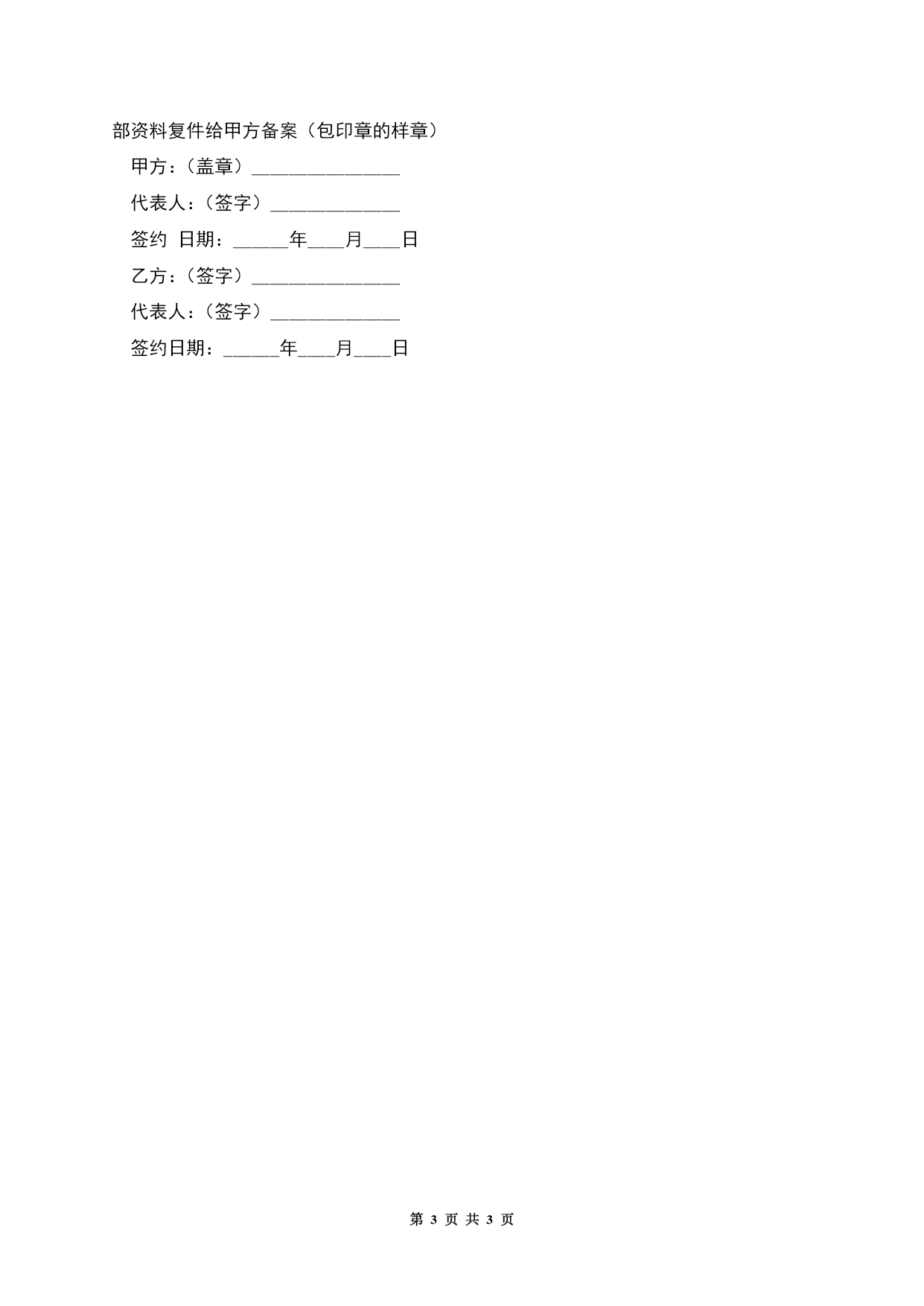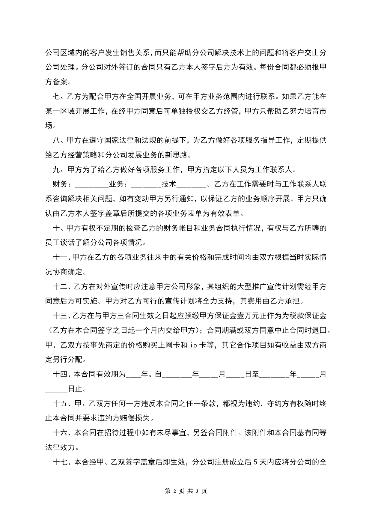 第PAGE\*MERGEFORMAT3页共NUMPAGES\*MERGEFORMAT3页分店承包经营合同分店承包经营合同甲方:_______________________乙方:_______________________地址:_______________________地址:_______________________邮编:_______________________邮编:_______________________电话:_______________________电话:_______________________传真:_______________________传真:_______________________甲方在_________市决定设立分公司经营甲方所开展的各项业务。现乙方向甲方商议承包经营甲方在___________所设立的分公司,甲方对此表示同意接受。为了明确甲、双方责、权、利的关系,保障甲、乙双方的全法权益。为此,特制订本合同条款如下:一、乙方自然人承包经营甲方在_________所设立的分公司,在甲方领导下开展各项工作,乙方在经营期间遵守国家的法律法规和各项政策规定。二、乙方在承包经营____________分公司的全部资金由乙方自筹(含分公司申请执照时所需的费用、房租等等),乙方在分公司内所添置的各项设备、家具用具和所有财产属乙方所有。三、乙方有独立经营自主权,但不得违反本合同的各项规定,不得超出工商管理部门和甲方的授权范围开展各项经营活动。四、乙方有人事聘用权,但乙方必须严格遵守劳动法的有关规定,在与员工签订劳动合同时需经甲方法人签字盖章后为有效,乙方在与甲方的本合同期满前应妥善处理好员工的分流问题,否则造成不良后果由乙方承担全部责任。五、乙方的财务为非独立核算单位。必须由甲方认可的并持有上岗证的专职会计担任分公司会计职务,会计受甲方领导,乙方在经营期间不得违反税法和会计法强行要求会计不记实帐和虚开发票等违法行为,由此造成的损失由乙方承担全部责任,并交给甲方财务分析报告壹份。会计在聘用或辞退时应经甲方同意后方可办理有关手续。六、乙方所开展的各项业务必须是与甲方相关的业务,其每笔业务都必须与甲方发生往来,不得与甲方有相同业务的单位发生往来合同;分公司成立后,甲方不直接与分公司区域内的客户发生销售关系,而只能帮助分公司解决技术上的问题和将客户交由分公司处理。分公司对外签订的合同只有乙方本人签字后方为有效。每份合同都必须报甲方备案。七、乙方为配合甲方在全国开展业务,可在甲方业务范围内进行联系。如果乙方能在某一区域开展工作,在经甲方同意后可单独授权交乙方经管,甲方只帮助乙努力培育市场。八、甲方在遵守国家法律和法规的前提下,为乙方做好各项服务指导工作,定期提供给乙方经营策略和分公司发展业务的新思路。九、甲方为了给乙方做好各项服务工作,甲方指定以下人员为工作联系人。财务:_________业务:________技术________。乙方在工作需要时与工作联系人联系咨询解决相关问题,如有变动甲方另行通知,以保证乙方的业务顺序开展。甲方只确认由乙方本人签字盖章后所提交的各项业务表单为有效表单。十、甲方有权不定期的检查乙方的财务帐目和业务合同执行情况,有权与乙方所聘的员工谈话了解分公司各项情况。十一、甲方在乙方的各项业务往来中的有关价格和完成时间均由双方根据当时实际情况协商确定。十二、乙方在对外宣传时应注意甲方公司形象,其组织的大型推广宣传计划需经甲方同意后方可实施。甲方对乙方可行的宣传计划将全力支持,其费用由乙方承担。十三、乙方在与甲方三合同生效之日起应预缴甲方保证金壹万元正作为为税款保证金(乙方在本合同签字之日起一个月内交给甲方);合同期满或双方同意中止合同时退回。甲、乙双方按事先商定的价格购买上网卡和ip卡等,其它合作项目如有收益由双方商定另行分配。十四、本合同有效期为____年。自________年_____月_____日至________年______月______日止。十五、甲、乙双方任何一方违反本合同之任一条款,都视为违约,守约方有权随时终止本合同并要求违约方赔偿损失。十六、本合同在招待过程中如有未尽事宜,另签合同附件。该附件和本合同基有同等法律效力。十七、本合经甲、乙双签字盖章后即生效,分公司注册成立后5天内应将分公司的全部资料复件给甲方备案(包印章的样章)甲方:(盖章)________________代表人:(签字)______________签约日期:______年____月____日乙方:(签字)________________代表人:(签字)______________签约日期:______年____月____日