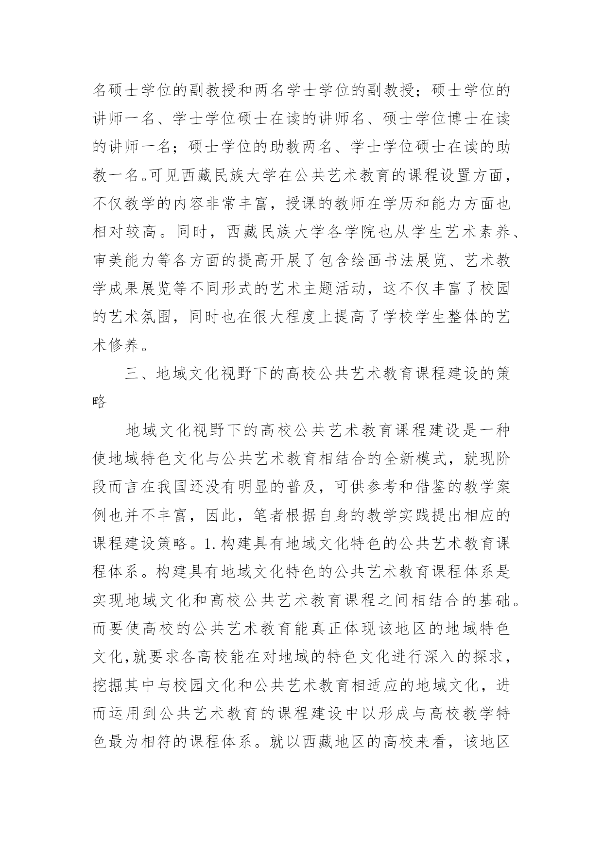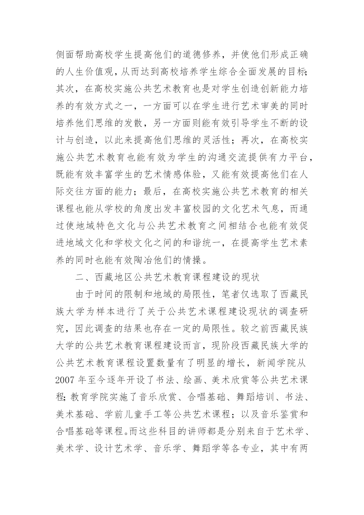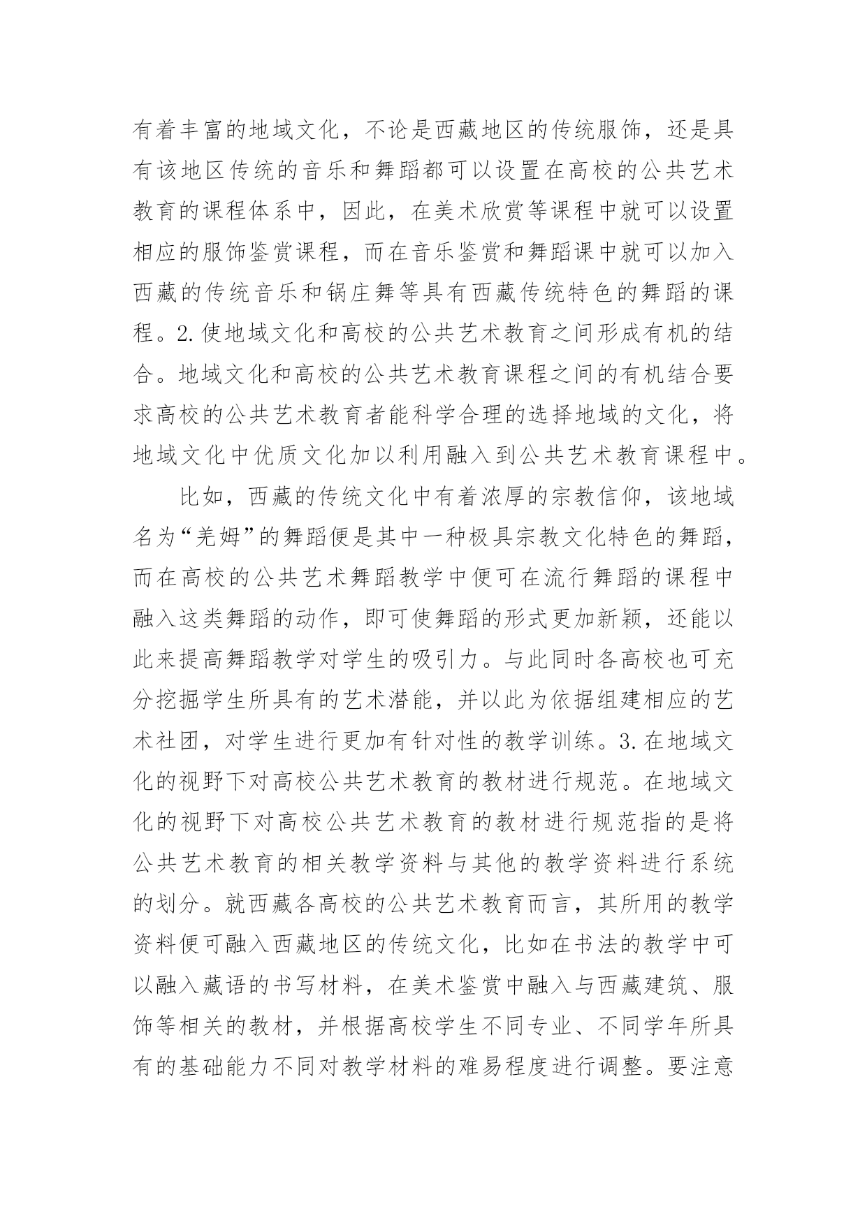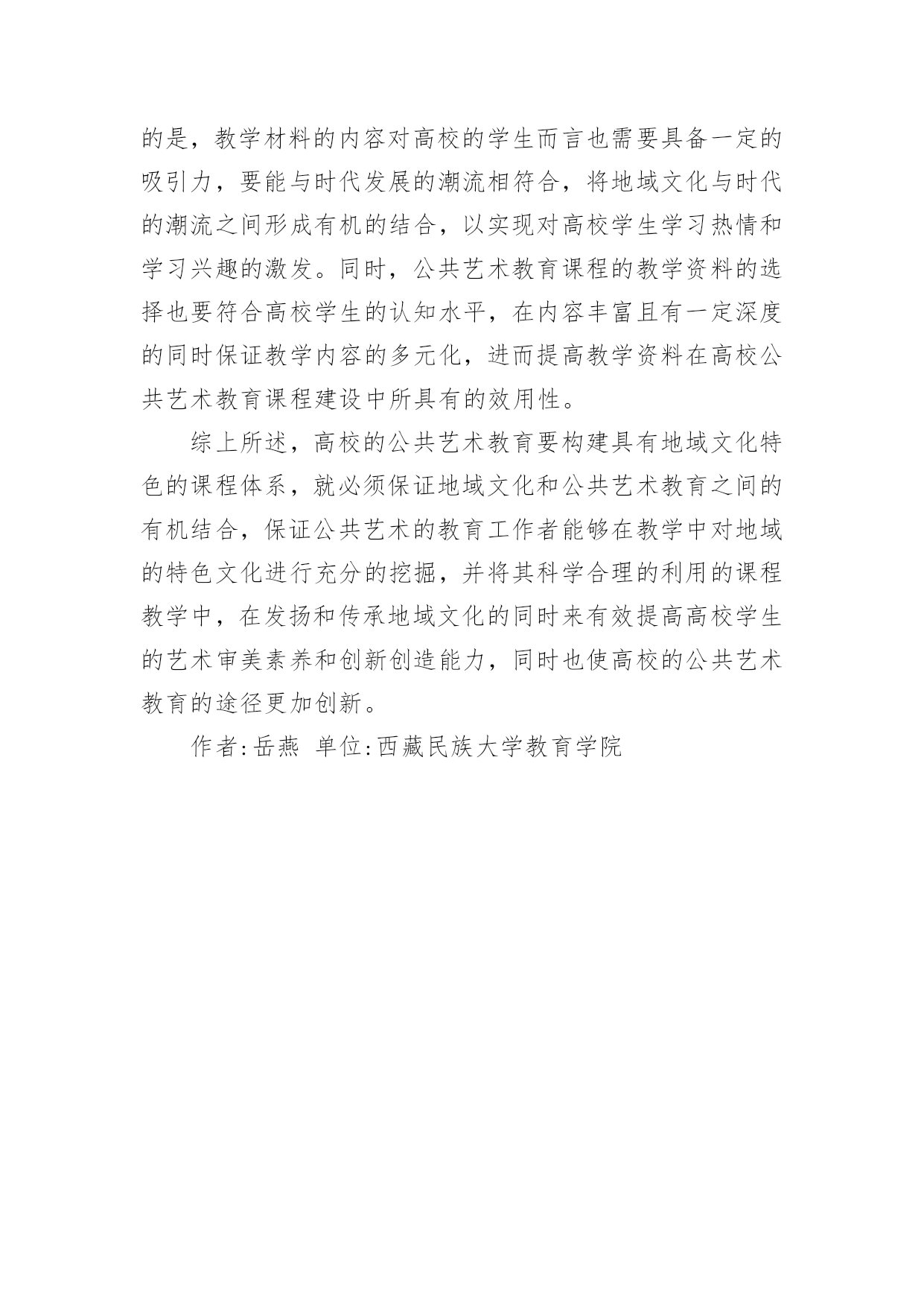 西藏高校公共艺术课程建设分析论文摘要:在探讨公共艺术教育的重要性的基础上,分析西藏地区高校在公共艺术教育方面的现状,进而提出公共艺术教育课程在高校建设的具体策略。关键词:地域文化;西藏高校;公共艺术教育在高校实施相关的公共艺术教育对提高学生的艺术素养、审美能力、创新创造能力等方面具有重要的作用。通过使高校的公共艺术教育与地域的特色文化之间形成有机的结合能有效推动高校公共艺术教育的创新与改革。因此,如何在地域文化的视域下构建与之相对应的公共艺术教育的课程体系已然成为了各高校领导以及公共艺术教育者应当重视的问题。笔者将以西藏民族大学公共艺术教育的现状为例,在分析公共艺术教育在高校教育事业中的重要性的基础上提出具有地域文化特征的公共艺术教育课程在高校建设的具体策略。一、公共艺术教育在高校实施的重要性由于市场经济的飞速发展功利性已不是商人的特有标志,某些高校的教育与办学也明显呈现出了功利性的特点,这使得与功利性相背离的艺术教育逐渐被学校所漠视。然而就艺术教育的本质而言其在学生素质教育中的重要性是不可忽视的。而公共艺术教育在高校实施的重要性主要体现在以下的四方面:首先,通过在高校实施公共艺术教育可以从艺术的视角出发培养高校学生的艺术审美能力,同时也能从侧面帮助高校学生提高他们的道德修养,并使他们形成正确的人生价值观,从而达到高校培养学生综合全面发展的目标;其次,在高校实施公共艺术教育也是对学生创造创新能力培养的有效方式之一,一方面可以在学生进行艺术审美的同时培养他们思维的发散,另一方面则能有效引导学生不断的设计与创造,以此来提高他们思维的灵活性;再次,在高校实施公共艺术教育也能有效为学生的沟通交流提供有力平台,既能有效丰富学生的艺术情感体验,又能有效提高他们在人际交往方面的能力;最后,在高校实施公共艺术教育的相关课程也能从学校的角度出发丰富校园的文化艺术气息,而通过使地域特色文化与公共艺术教育之间相结合也能有效促进地域文化和学校文化之间的和谐统一,在提高学生艺术素养的同时也能有效陶冶他们的情操。二、西藏地区公共艺术教育课程建设的现状由于时间的限制和地域的局限性,笔者仅选取了西藏民族大学为样本进行了关于公共艺术课程建设现状的调查研究,因此调查的结果也存在一定的局限性。较之前西藏民族大学的公共艺术教育课程建设而言,现阶段西藏民族大学的公共艺术教育课程设置数量有了明显的增长,新闻学院从2007年至今逐年开设了书法、绘画、美术欣赏等公共艺术课程;教育学院实施了音乐欣赏、合唱基础、舞蹈培训、书法、美术基础、学前儿童手工等公共艺术课程;以及音乐鉴赏和合唱基础等课程。而这些科目的讲师都是分别来自于艺术学、美术学、设计艺术学、音乐学、舞蹈学等各专业,其中有两名硕士学位的副教授和两名学士学位的副教授;硕士学位的讲师一名、学士学位硕士在读的讲师名、硕士学位博士在读的讲师一名;硕士学位的助教两名、学士学位硕士在读的助教一名。可见西藏民族大学在公共艺术教育的课程设置方面,不仅教学的内容非常丰富,授课的教师在学历和能力方面也相对较高。同时,西藏民族大学各学院也从学生艺术素养、审美能力等各方面的提高开展了包含绘画书法展览、艺术教学成果展览等不同形式的艺术主题活动,这不仅丰富了校园的艺术氛围,同时也在很大程度上提高了学校学生整体的艺术修养。三、地域文化视野下的高校公共艺术教育课程建设的策略地域文化视野下的高校公共艺术教育课程建设是一种使地域特色文化与公共艺术教育相结合的全新模式,就现阶段而言在我国还没有明显的普及,可供参考和借鉴的教学案例也并不丰富,因此,笔者根据自身的教学实践提出相应的课程建设策略。1.构建具有地域文化特色的公共艺术教育课程体系。构建具有地域文化特色的公共艺术教育课程体系是实现地域文化和高校公共艺术教育课程之间相结合的基础。而要使高校的公共艺术教育能真正体现该地区的地域特色文化,就要求各高校能在对地域的特色文化进行深入的探求,挖掘其中与校园文化和公共艺术教育相适应的地域文化,进而运用到公共艺术教育的课程建设中以形成与高校教学特色最为相符的课程体系。就以西藏地区的高校来看,该地区有着丰富的地域文化,不论是西藏地区的传统服饰,还是具有该地区传统的音乐和舞蹈都可以设置在高校的公共艺术教育的课程体系中,因此,在美术欣赏等课程中就可以设置相应的服饰鉴赏课程,而在音乐鉴赏和舞蹈课中就可以加入西藏的传统音乐和锅庄舞等具有西藏传统特色的舞蹈的课程。2.使地域文化和高校的公共艺术教育之间形成有机的结合。地域文化和高校的公共艺术教育课程之间的有机结合要求高校的公共艺术教育者能科学合理的选择地域的文化,将地域文化中优质文化加以利用融入到公共艺术教育课程中。比如,西藏的传统文化中有着浓厚的宗教信仰,该地域名为“羌姆”的舞蹈便是其中一种极具宗教文化特色的舞蹈,而在高校的