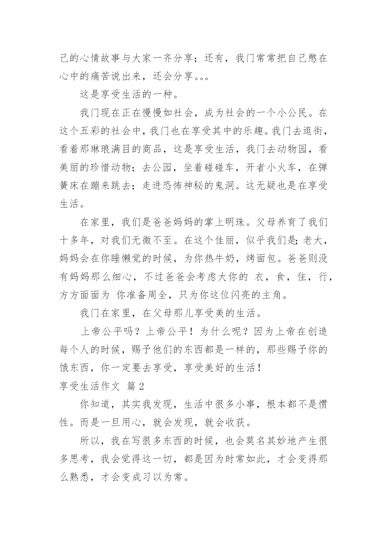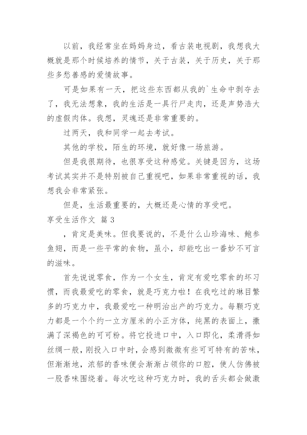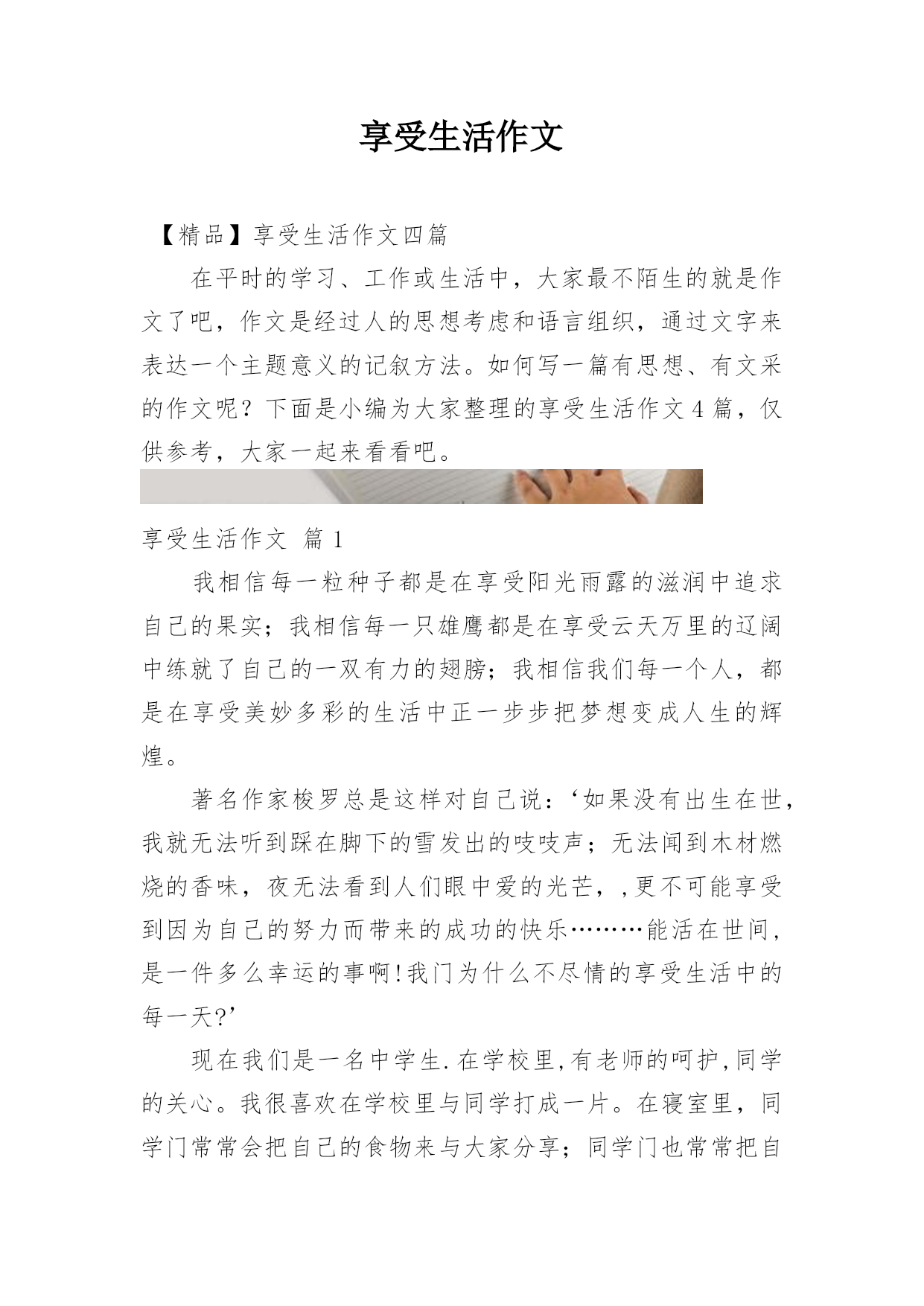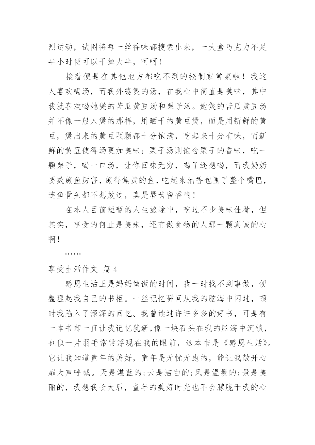 享受生活作文【精品】享受生活作文四篇在平时的学习、工作或生活中,大家最不陌生的就是作文了吧,作文是经过人的思想考虑和语言组织,通过文字来表达一个主题意义的记叙方法。如何写一篇有思想、有文采的作文呢?下面是小编为大家整理的享受生活作文4篇,仅供参考,大家一起来看看吧。享受生活作文篇1我相信每一粒种子都是在享受阳光雨露的滋润中追求自己的果实;我相信每一只雄鹰都是在享受云天万里的辽阔中练就了自己的一双有力的翅膀;我相信我们每一个人,都是在享受美妙多彩的生活中正一步步把梦想变成人生的辉煌。著名作家梭罗总是这样对自己说:‘如果没有出生在世,我就无法听到踩在脚下的雪发出的吱吱声;无法闻到木材燃烧的香味,夜无法看到人们眼中爱的光芒,,更不可能享受到因为自己的努力而带来的成功的快乐………能活在世间,是一件多么幸运的事啊!我门为什么不尽情的享受生活中的每一天?’现在我们是一名中学生.在学校里,有老师的呵护,同学的关心。我很喜欢在学校里与同学打成一片。在寝室里,同学门常常会把自己的食物来与大家分享;同学门也常常把自己的心情故事与大家一齐分享;还有,我门常常把自己憋在心中的痛苦说出来,还会分享。。。这是享受生活的一种。我门现在正在慢慢如社会,成为社会的一个小公民。在这个五彩的社会中,我门也在享受其中的乐趣。我门去逛街,看着那琳琅满目的商品,这是享受生活,我门去动物园,看美丽的珍惜动物;去公园,坐着碰碰车,开者小火车,在弹簧床在蹦来跳去;走进恐怖神秘的鬼洞。这无疑也是在享受生活。在家里,我们是爸爸妈妈的掌上明珠。父母养育了我们十多年,对我们无微不至。在这个佳丽,似乎我们是;老大,妈妈会在你睡懒觉的时候,为你热牛奶,烤面包。爸爸则没有妈妈那么细心,不过爸爸会考虑大你的衣,食,住,行,方方面面为你准备周全,只为你这位闪亮的主角。我门在家里,在父母那儿享受美的生活。上帝公平吗?上帝公平!为什么呢?因为上帝在创造每个人的时候,赐予他们的东西都是一样的,那些赐予你的饿东西,你一定要去享受,享受美好的生活!享受生活作文篇2你知道,其实我发现,生活中很多小事,根本都不是惯性。而是一旦用心,就会发现,就会收获。所以,我在写很多东西的时候,也会莫名其妙地产生很多思考,我会觉得这一切,都是因为时常如此,才会变得那么熟悉,才会变成习以为常。以前,我经常坐在妈妈身边,看古装电视剧,我想我大概就是那个时候培养的情节,关于古装,关于历史,关于那些多愁善感的爱情故事。可是如果有一天,把这些东西都从我的`生命中剥夺去了,我无法想象,我的生活是一具行尸走肉,还是声势浩大的虚假肉体。我想,灵魂还是非常重要的。过两天,我和同学一起去考试。其他的学校,陌生的环境,就好像一场旅游。但是我很期待,也很享受这种感觉。关键是因为,这场考试其实并不是特别被自己重视吧,如果非常重视的话,我想我会非常紧张。但是,生活最重要的,大概还是心情的享受吧。享受生活作文篇3,肯定是美味。但我要说的,不是什么山珍海味、鲍参鱼翅,而是一些平常的食物,虽小,却能吃出一番妙不可言的滋味。首先说说零食,作为一个女生,肯定有爱吃零食的坏习惯,而我最爱吃的零食,就是巧克力啦!在我吃过的琳目繁多的巧克力中,我最爱吃一种明治出产的巧克力。每颗巧克力都是一个个约一立方厘米的小正方体,纯黑的表面上,撒满了深褐色的可可粉。将它投进口中,入口即化,柔滑得如丝绸一般,刚投入口中时,会感到微微有些可可特有的苦味,但渐渐地,浓郁的香味便会渐渐占领你的口腔,使人仿佛被一股香味围绕着。每次吃这种巧克力时,我的舌头都会做激烈运动,试图将每一丝香味都搜索出来,一大盒巧克力不足半小时便可以干掉大半,呵呵!接着便是在其他地方都吃不到的秘制家常菜啦!我这人喜欢喝汤,而我外婆煲的汤,在我心中简直是美味,其中我就喜欢喝她煲的苦瓜黄豆汤和栗子汤。她煲的苦瓜黄豆汤并不像一般人煲的那样,用晒干的黄豆煲,而是用新鲜的黄豆,煲出来的黄豆颗颗都十分饱满,吃起来十分有味,而新鲜的黄豆使得汤更加美味;栗子汤则饱含栗子的香味,吃一颗栗子,喝一口汤,让你回味无穷,喝了还想喝,而我奶奶要数煎鱼厉害,煎得焦黄的鱼,吃起来油香包围了整个嘴巴,连鱼骨头都不想放过,真是唇齿留香啊!在本人目前短暂的人生旅途中,吃过不少美味佳肴,但其实,享受的何止是美味,还有做食物的人那一颗真诚的心啊!……享受生活作文篇4感恩生活正是妈妈做饭的时间,我一时找不到事做,便整理起我自己的书柜。一丝记忆瞬间从我的脑海中闪过,顿时我陷入了深深的回忆。我曾读过许许多多的好书,可是有一本书却一直让我记忆犹新,像一块石头在我的脑海中沉锁,也似一片羽毛常常浮现在我的眼前,这本书是《感恩生活》。它让我知道童年的美好,童年是无忧无虑的,能让我敞开心扉大声呼喊。天是湛蓝的;云是洁白的;风是温暖的;景是美丽的,我想我长大后,童年的