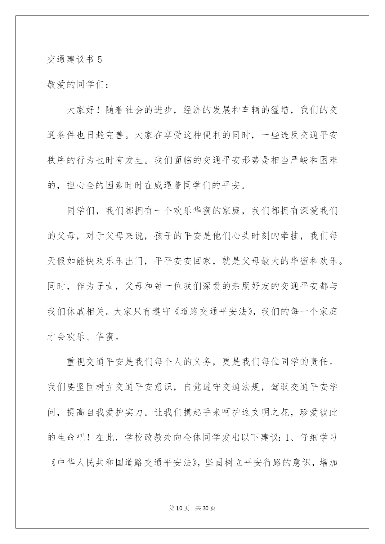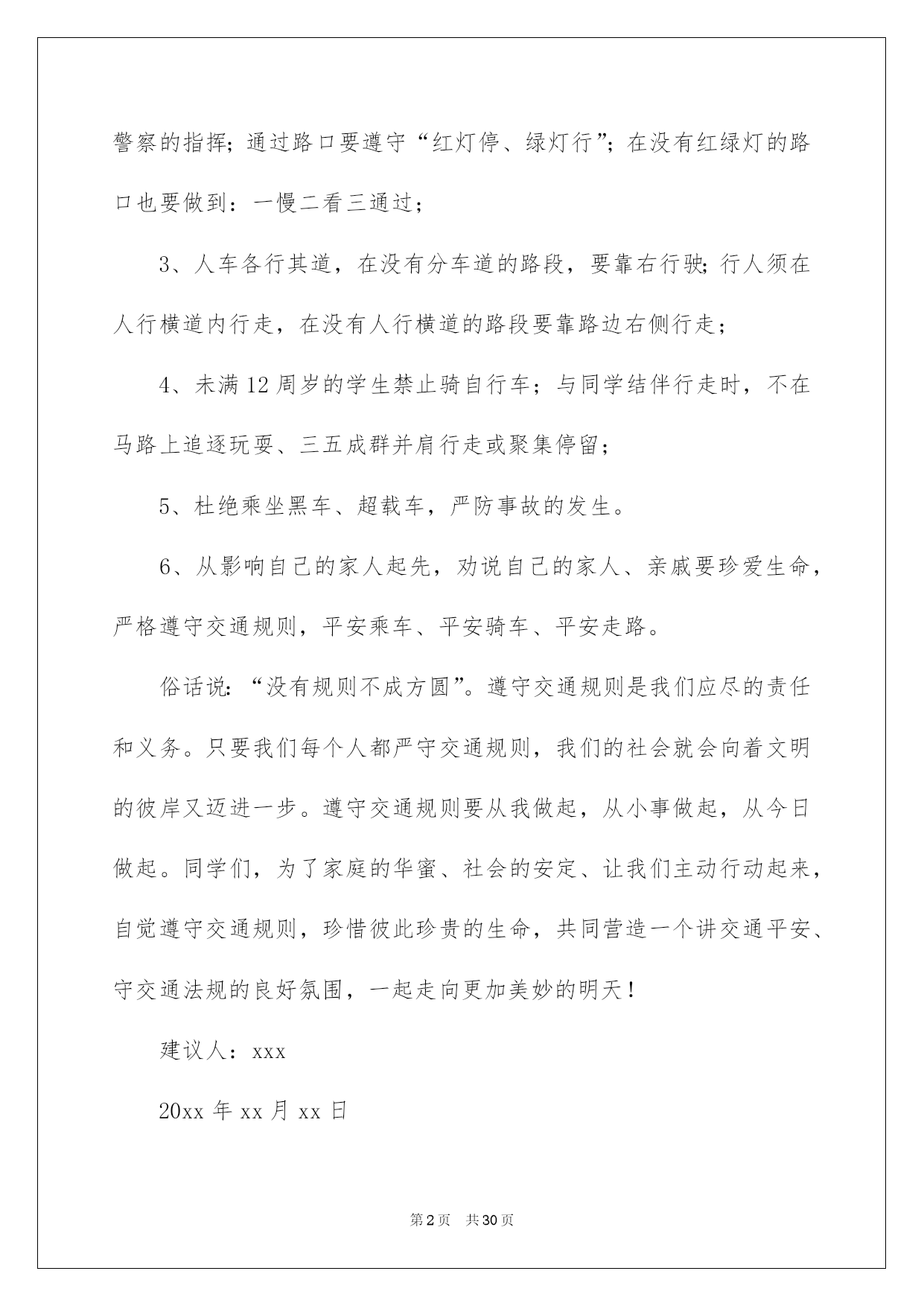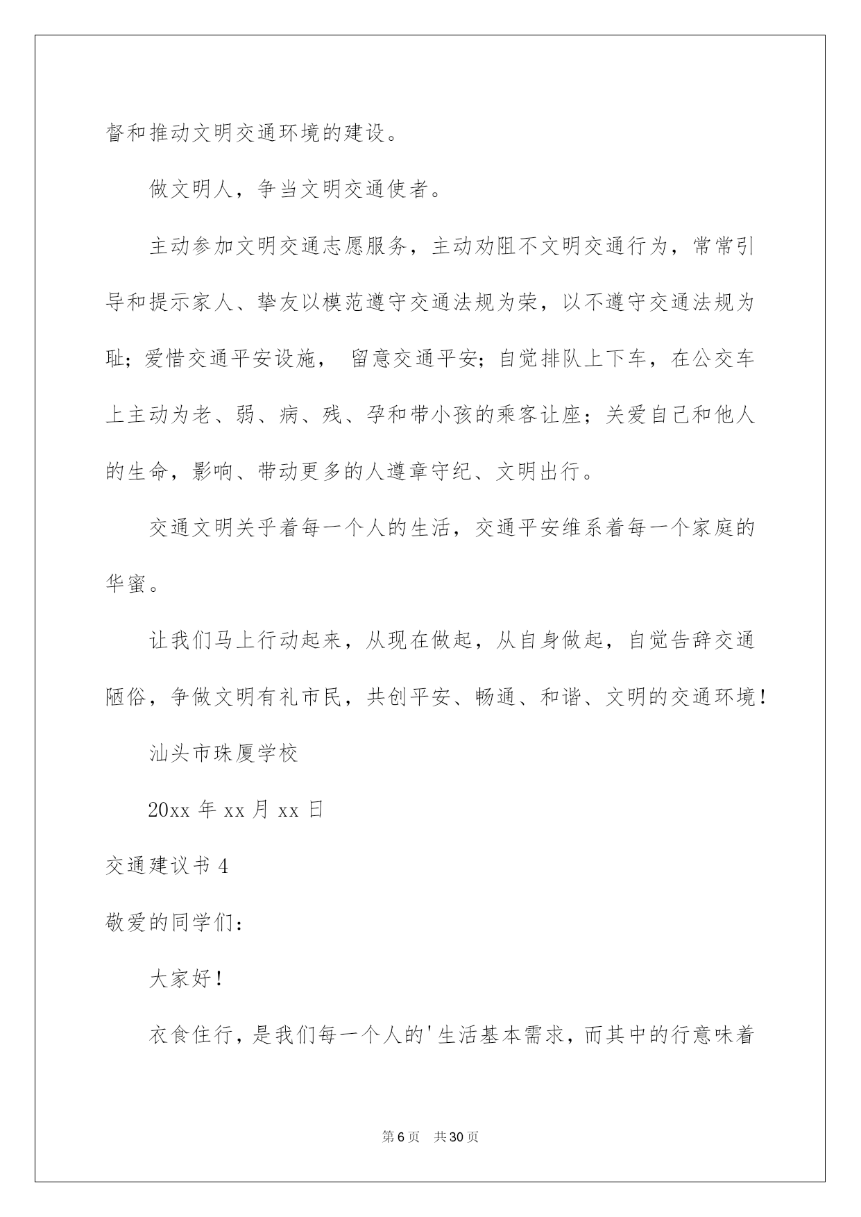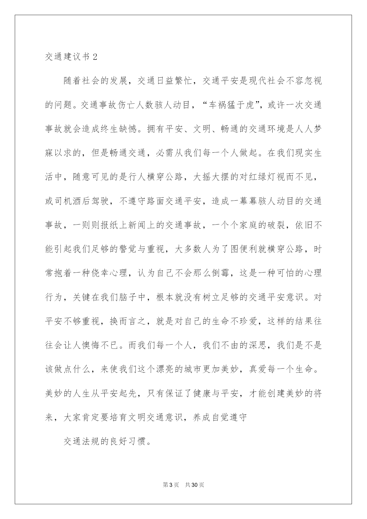 第PAGE\*Arabic\*MERGEFORMAT30页共NUMPAGES\*Arabic\*MERGEFORMAT30页第PAGE\*MERGEFORMAT30页共NUMPAGES\*MERGEFORMAT30页第PAGE\*MERGEFORMAT30页共NUMPAGES\*MERGEFORMAT30页第PAGE\*MERGEFORMAT30页共NUMPAGES\*MERGEFORMAT30页第PAGE\*MERGEFORMAT30页共NUMPAGES\*MERGEFORMAT30页第PAGE\*MERGEFORMAT30页共NUMPAGES\*MERGEFORMAT30页第PAGE\*MERGEFORMAT30页共NUMPAGES\*MERGEFORMAT30页第PAGE\*MERGEFORMAT30页共NUMPAGES\*MERGEFORMAT30页第PAGE\*MERGEFORMAT30页共NUMPAGES\*MERGEFORMAT30页第PAGE\*MERGEFORMAT30页共NUMPAGES\*MERGEFORMAT30页第PAGE\*MERGEFORMAT30页共NUMPAGES\*MERGEFORMAT30页2022交通建议书交通建议书在社会发展不断提速的今日,建议书运用的状况越来越多,建议书是就某项工作提出某种建议时运用的一种常用书信,也叫看法书。建议书的留意事项有很多,你确定会写吗?下面是我为大家收集的交通建议书,希望能够帮助到大家。交通建议书1各位老师、各位同学:上午好!平平安安出门,快欢乐乐回家。这是每一个家庭每一个孩子的愿望。为主动响应“全国中小学生交通平安教化宣扬月”活动,进一步提高同学们交通平安法制意识,预防和削减交通事故的发生,共建一个平安、有序、畅通的交通环境,我建议:遵守交通规则,从我做起!1、仔细学习、宣扬并严格遵守《中华人民共和国道路交通平安法》,留意从自身做起,增加交通平安意识和交通法制观念;2、外出时,自觉遵守交通信号、交通标记、交通标线,听从交通警察的指挥;通过路口要遵守“红灯停、绿灯行”;在没有红绿灯的路口也要做到:一慢二看三通过;3、人车各行其道,在没有分车道的路段,要靠右行驶;行人须在人行横道内行走,在没有人行横道的路段要靠路边右侧行走;4、未满12周岁的学生禁止骑自行车;与同学结伴行走时,不在马路上追逐玩耍、三五成群并肩行走或聚集停留;5、杜绝乘坐黑车、超载车,严防事故的发生。6、从影响自己的家人起先,劝说自己的家人、亲戚要珍爱生命,严格遵守交通规则,平安乘车、平安骑车、平安走路。俗话说:“没有规则不成方圆”。遵守交通规则是我们应尽的责任和义务。只要我们每个人都严守交通规则,我们的社会就会向着文明的彼岸又迈进一步。遵守交通规则要从我做起,从小事做起,从今日做起。同学们,为了家庭的华蜜、社会的安定、让我们主动行动起来,自觉遵守交通规则,珍惜彼此珍贵的生命,共同营造一个讲交通平安、守交通法规的良好氛围,一起走向更加美妙的明天!建议人:xxx20xx年xx月xx日交通建议书2随着社会的发展,交通日益繁忙,交通平安是现代社会不容忽视的问题。交通事故伤亡人数骇人动目,“车祸猛于虎”,或许一次交通事故就会造成终生缺憾。拥有平安、文明、畅通的交通环境是人人梦寐以求的,但是畅通交通,必需从我们每一个人做起。在我们现实生活中,随意可见的是行人横穿公路,大摇大摆的对红绿灯视而不见,或司机酒后驾驶,不遵守路面交通平安,造成一幕幕骇人动目的交通事故,一则则报纸上新闻上的交通事故,一个个家庭的破裂,依旧不能引起我们足够的警觉与重视,大多数人为了图便利就横穿公路,时常抱着一种侥幸心理,认为自己不会那么倒霉,这是一种可怕的心理行为,关键在我们脑子中,根本就没有树立足够的交通平安意识。对平安不够重视,换而言之,就是对自己的生命不珍爱,这样的结果往往会让人懊悔不已。而我们每一个人,我们不由的深思,我们是不是该做点什么,来使我们这个漂亮的城市更加美妙,真爱每一个生命。美妙的人生从平安起先,只有保证了健康与平安,才能创建美妙的将来,大家肯定要培育文明交通意识,养成自觉遵守交通法规的良好习惯。那么,从今日起,就让我们与生命同行,与平安同行!在此,XX公司为增加员工的交通平安意识,拟开展“交通平安,百日行动”签名活动,并倡议如下:一、关爱生命,从遵守交通平安起。二、多等三分钟,不抢一秒钟。三、细读交通规则,遵守从自己先做起。四、牢记“三个平安”:平安走路,平安乘车,平安行车。五、留意加强宣扬,在全公司内掀起遵守交通规则,真爱生命的风气。通过本次“关爱生命、