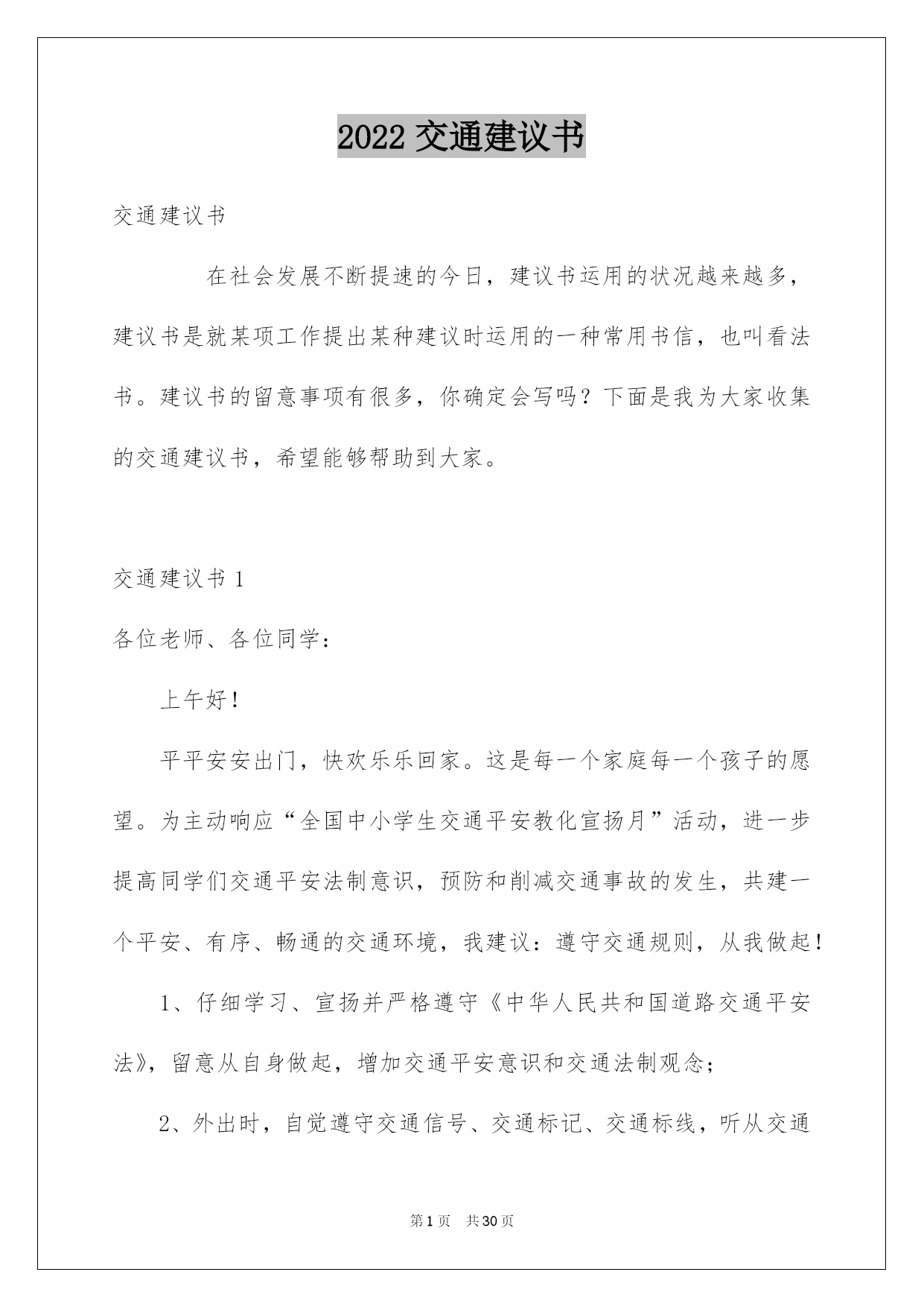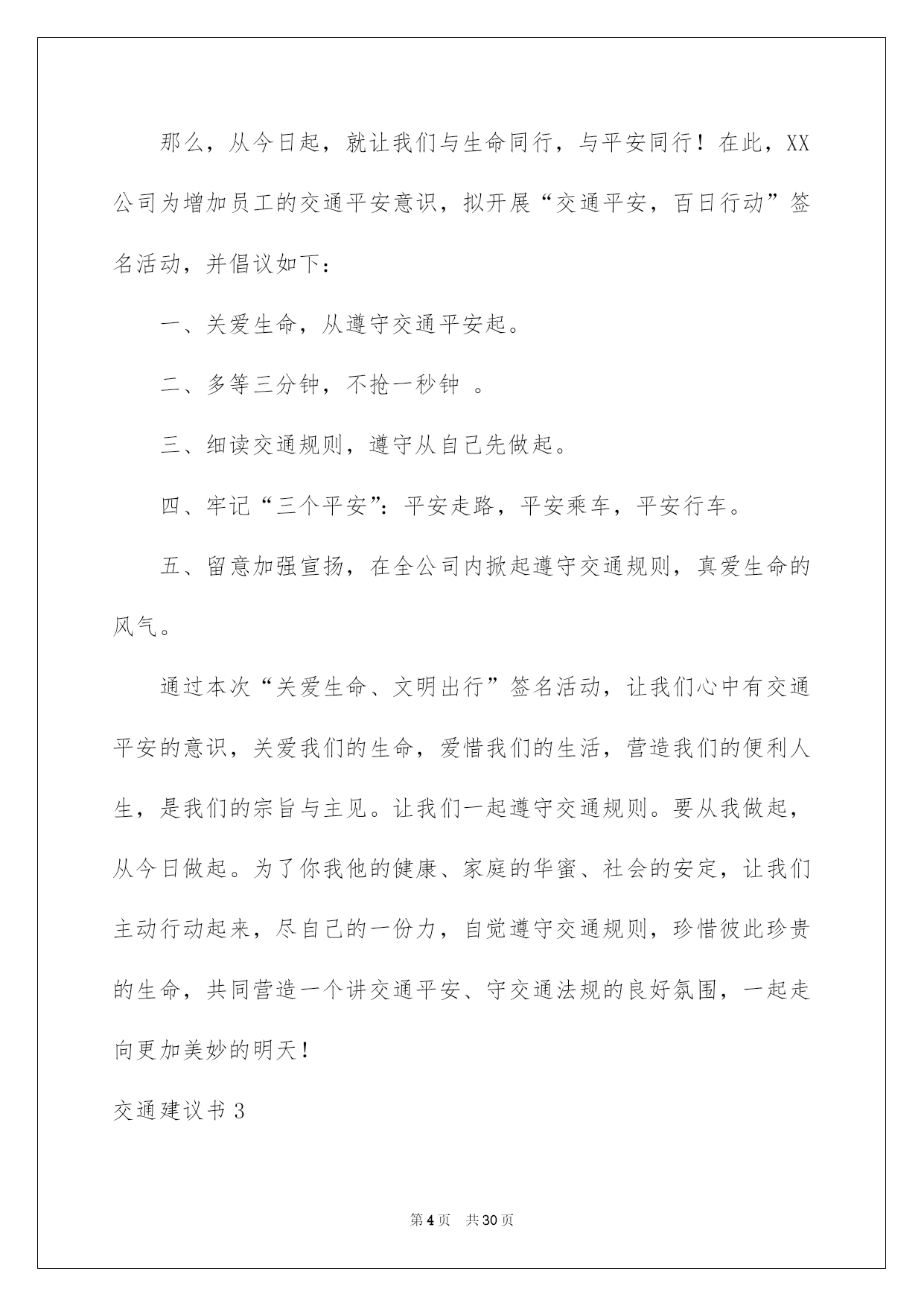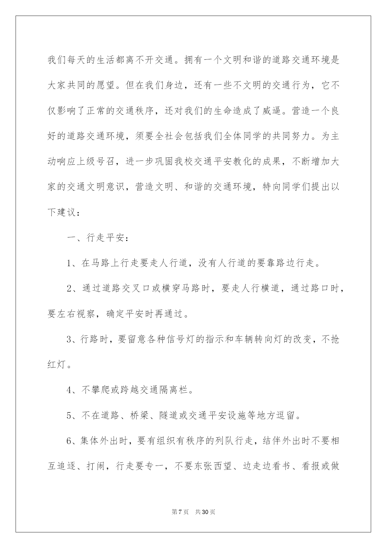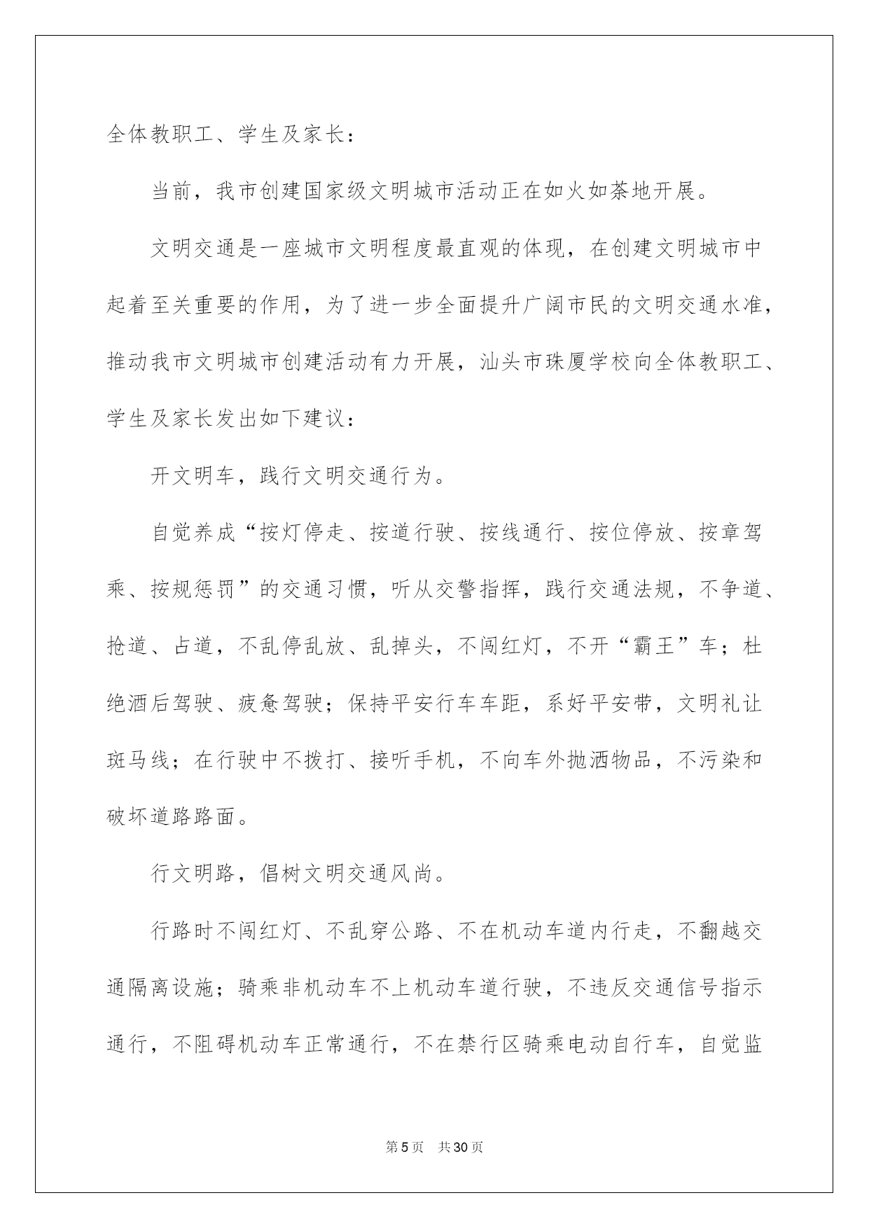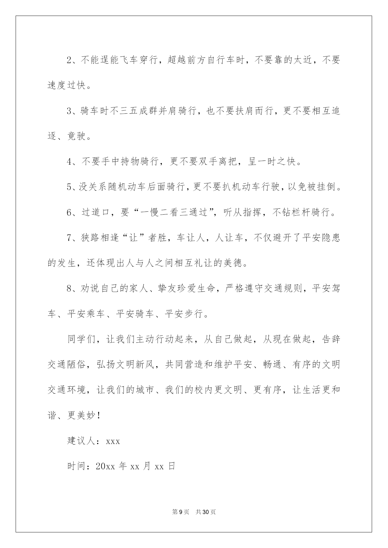 第PAGE\*Arabic\*MERGEFORMAT30页共NUMPAGES\*Arabic\*MERGEFORMAT30页第PAGE\*MERGEFORMAT30页共NUMPAGES\*MERGEFORMAT30页第PAGE\*MERGEFORMAT30页共NUMPAGES\*MERGEFORMAT30页第PAGE\*MERGEFORMAT30页共NUMPAGES\*MERGEFORMAT30页第PAGE\*MERGEFORMAT30页共NUMPAGES\*MERGEFORMAT30页第PAGE\*MERGEFORMAT30页共NUMPAGES\*MERGEFORMAT30页第PAGE\*MERGEFORMAT30页共NUMPAGES\*MERGEFORMAT30页第PAGE\*MERGEFORMAT30页共NUMPAGES\*MERGEFORMAT30页第PAGE\*MERGEFORMAT30页共NUMPAGES\*MERGEFORMAT30页第PAGE\*MERGEFORMAT30页共NUMPAGES\*MERGEFORMAT30页第PAGE\*MERGEFORMAT30页共NUMPAGES\*MERGEFORMAT30页2022交通建议书交通建议书在社会发展不断提速的今日,建议书运用的状况越来越多,建议书是就某项工作提出某种建议时运用的一种常用书信,也叫看法书。建议书的留意事项有很多,你确定会写吗?下面是我为大家收集的交通建议书,希望能够帮助到大家。交通建议书1各位老师、各位同学:上午好!平平安安出门,快欢乐乐回家。这是每一个家庭每一个孩子的愿望。为主动响应“全国中小学生交通平安教化宣扬月”活动,进一步提高同学们交通平安法制意识,预防和削减交通事故的发生,共建一个平安、有序、畅通的交通环境,我建议:遵守交通规则,从我做起!1、仔细学习、宣扬并严格遵守《中华人民共和国道路交通平安法》,留意从自身做起,增加交通平安意识和交通法制观念;2、外出时,自觉遵守交通信号、交通标记、交通标线,听从交通警察的指挥;通过路口要遵守“红灯停、绿灯行”;在没有红绿灯的路口也要做到:一慢二看三通过;3、人车各行其道,在没有分车道的路段,要靠右行驶;行人须在人行横道内行走,在没有人行横道的路段要靠路边右侧行走;4、未满12周岁的学生禁止骑自行车;与同学结伴行走时,不在马路上追逐玩耍、三五成群并肩行走或聚集停留;5、杜绝乘坐黑车、超载车,严防事故的发生。6、从影响自己的家人起先,劝说自己的家人、亲戚要珍爱生命,严格遵守交通规则,平安乘车、平安骑车、平安走路。俗话说:“没有规则不成方圆”。遵守交通规则是我们应尽的责任和义务。只要我们每个人都严守交通规则,我们的社会就会向着文明的彼岸又迈进一步。遵守交通规则要从我做起,从小事做起,从今日做起。同学们,为了家庭的华蜜、社会的安定、让我们主动行动起来,自觉遵守交通规则,珍惜彼此珍贵的生命,共同营造一个讲交通平安、守交通法规的良好氛围,一起走向更加美妙的明天!建议人:xxx20xx年xx月xx日交通建议书2随着社会的发展,交通日益繁忙,交通平安是现代社会不容忽视的问题。交通事故伤亡人数骇人动目,“车祸猛于虎”,或许一次交通事故就会造成终生缺憾。拥有平安、文明、畅通的交通环境是人人梦寐以求的,但是畅通交通,必需从我们每一个人做起。在我们现实生活中,随意可见的是行人横穿公路,大摇大摆的对红绿灯视而不见,或司机酒后驾驶,不遵守路面交通平安,造成一幕幕骇人动目的交通事故,一则则报纸上新闻上的交通事故,一个个家庭的破裂,依旧不能引起我们足够的警觉与重视,大多数人为了图便利就横穿公路,时常抱着一种侥幸心理,认为自己不会那么倒霉,这是一种可怕的心理行为,关键在我们脑子中,根本就没有树立足够的交通平安意识。对平安不够重视,换而言之,就是对自己的生命不珍爱,这样的结果往往会让人懊悔不已。而我们每一个人,我们不由的深思,我们是不是该做点什么,来使我们这个漂亮的城市更加美妙,真爱每一个生命。美妙的人生从平安起先,只有保证了健康与平安,才能创建美妙的将来,大家肯定要培育文明交通意识,养成自觉遵守交通法规的良好习惯。那么,从今日起,就让我们与生命同行,与平安同行!在此,XX公司为增加员工的交通平安意识,拟开展“交通平安,百日行动”签名活动,并倡议如下:一、关爱生命,从遵守交通平安起。二、多等三分钟,不抢一秒钟。三、细读交通规则,遵守从自己先做起。四、牢记“三个平安”:平安走路,平安乘车,平安行车。五、留意加强宣扬,在全公司内掀起遵守交通规则,真爱生命的风气。通过本次“关爱生命、