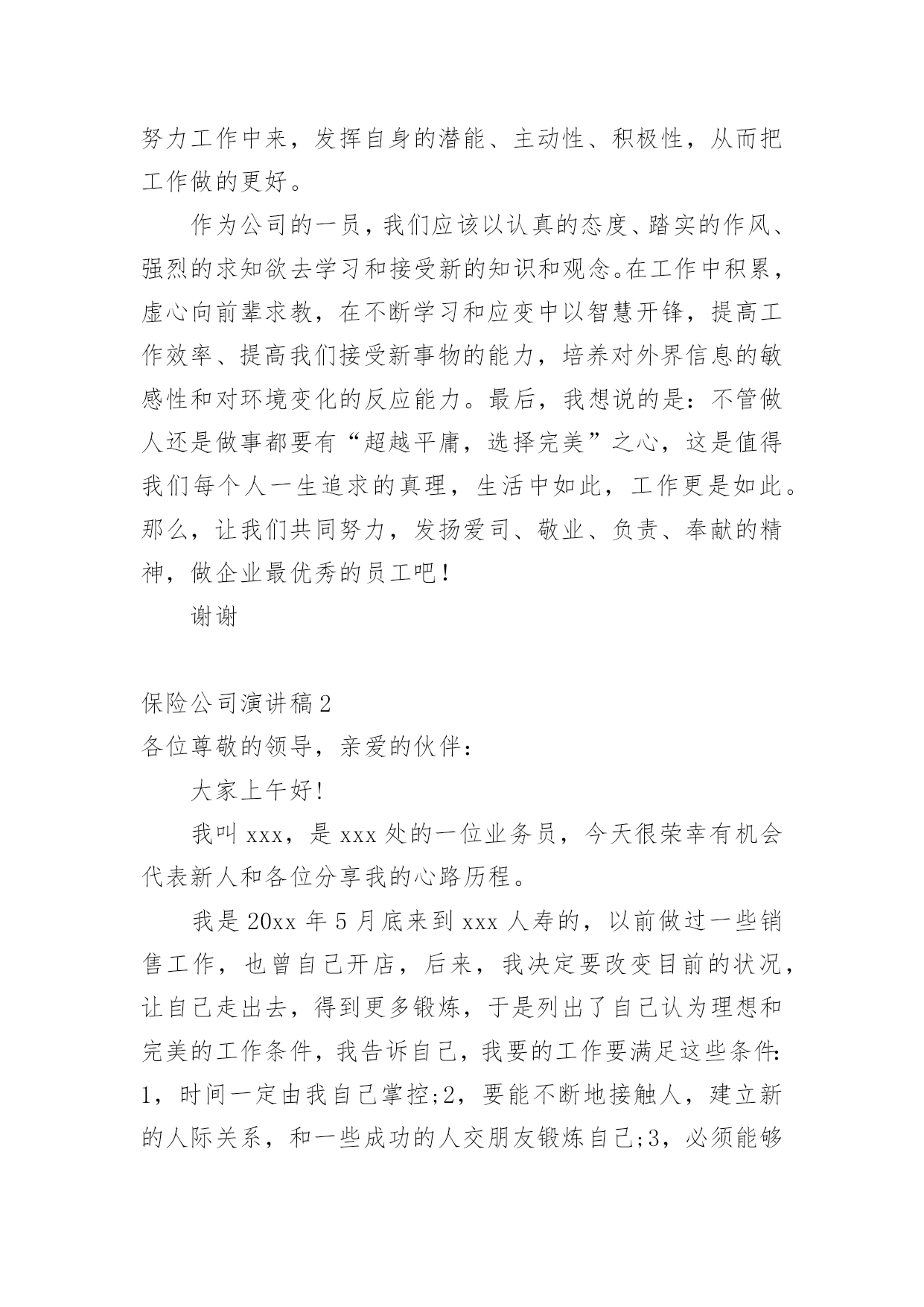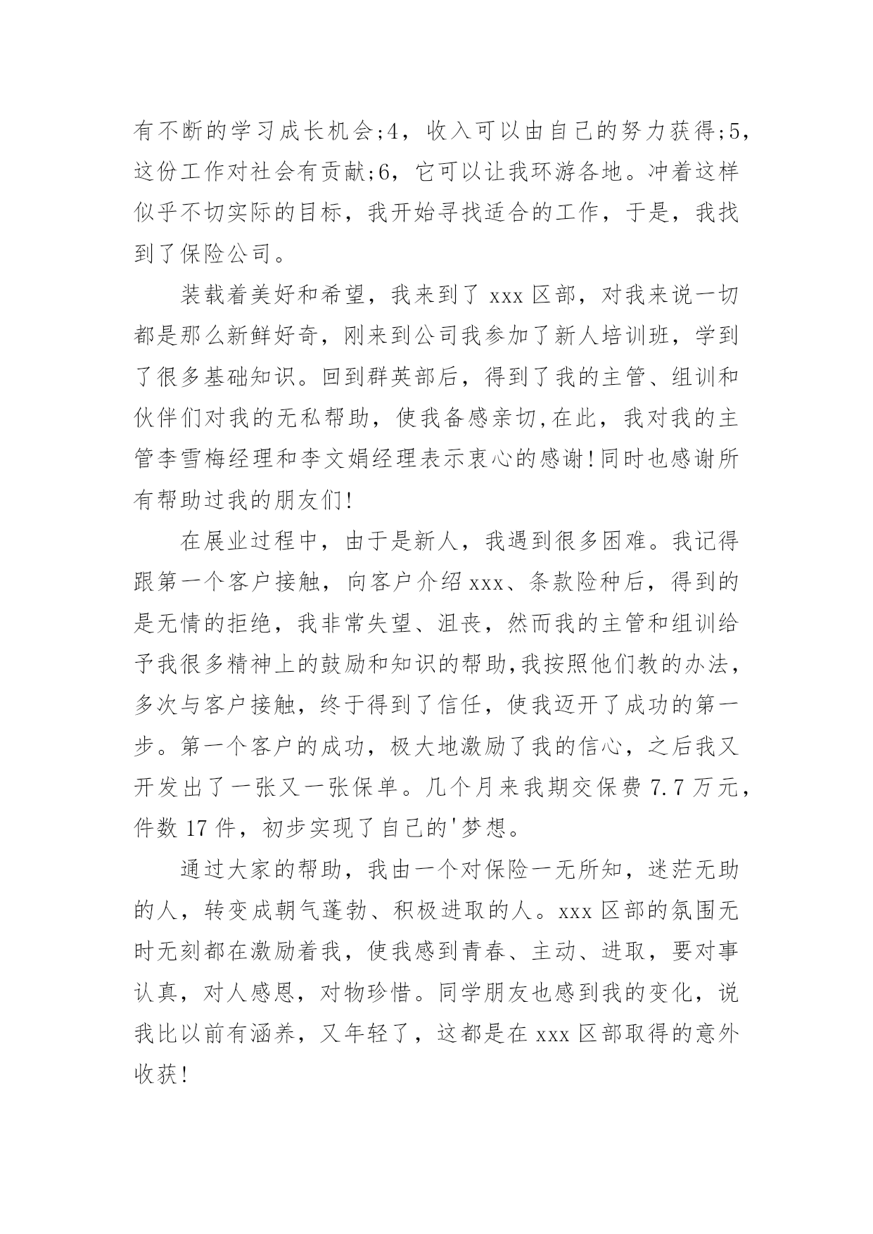 保险公司演讲稿演讲稿具有观点鲜明,内容具有鼓动性的特点。在我们平凡的日常里,越来越多人会去使用演讲稿,怎么写演讲稿才能避免踩雷呢?以下是小编为大家收集的保险公司演讲稿,仅供参考,欢迎大家阅读。保险公司演讲稿1尊敬的各位领导、各位同仁:大家下午好。今天我演讲的题目是:做最优秀的员工和所有的新员工一样,从跨进人保财险大门的那一刻起,我就在认真地回顾着她的昨天、注视着她的今天和展望着她的明天。可口可乐公司的总裁曾经说过:把我所有的东西都拿走,把员工留下,几年以后,我可以重建一个王国。所以说企业的发展关键在于人;企业能否充满活力地持续发展关键不在于企业员工是否年轻,而在于他们是否有锐意进取、不断学习的精神,是否有对市场变化的洞悉力和敏感性。为适应时代发展,总公司根据人保新时期发展战略和人保财险企业文化建设的总体规划,制定了《中国人民财产保险股份有限公司员工行为准则》。他充分体现了新形势下公司对员工行为所提出的新要求,使之成为广大员工乐于遵循的心理公约,营造爱岗敬业、勇于创新、甘于奉献的工作氛围,构建和谐企业,增强凝聚力和向心力,实现公司和员工的共同发展。通过这次认真、深刻的学习,我充分认识到了员工行为准则出台的重要意义。众所周知“没有任何借口”是美国西点军校奉行的最主要的行为准则,它给我们的企业员工提供了至真至善的培训内容。在实际工作中,我们需要的正是这种精神,假如在我们企业中的每一分子都想尽办法去完成任何一项任务,不找任何借口,哪怕看似合理的借口,我们的企业必将会是另一番景象,我们的现状也将会有重大改变。在日常服务中,我们要提倡这种敬业、负责、服从、诚实的精神,对客户提出的意见、建议认真听取,时时处处以客户为中心,替客户着想,遇到客户不满时,不要急于为自己辩解,先从自身开始查找服务中的不足,给客户一个台阶是服务的高标准,有了矛盾不要过分强调自己的理由,反过来为客户着想,将心比心,客户便会理解和尊重你的工作。退一步等于过两步,客户的建议也是我们服务的.改进,千万不要有“那个客户太挑剔,我无法满足他”等等一些看似合理的借口。在我们的日常生活中,当人们不思进取时,往往会寻找借口,殊不知借口给人带来的严重后果是让人更加消极颓废。当遇到困难和挫折时,你不是去想办法克服,而是寻找各种各样的借口,这样的消极态度只会剥夺了个人成功的机会,最终让人一事无成。成功不属于那些寻找借口的人,那么就先让我们从改变自己的态度开始吧,让工作中没有借口,人生中没有借口,失败中也没有借口,把所有时间和精力用到努力工作中来,发挥自身的潜能、主动性、积极性,从而把工作做的更好。作为公司的一员,我们应该以认真的态度、踏实的作风、强烈的求知欲去学习和接受新的知识和观念。在工作中积累,虚心向前辈求教,在不断学习和应变中以智慧开锋,提高工作效率、提高我们接受新事物的能力,培养对外界信息的敏感性和对环境变化的反应能力。最后,我想说的是:不管做人还是做事都要有“超越平庸,选择完美”之心,这是值得我们每个人一生追求的真理,生活中如此,工作更是如此。那么,让我们共同努力,发扬爱司、敬业、负责、奉献的精神,做企业最优秀的员工吧!谢谢保险公司演讲稿2各位尊敬的领导,亲爱的伙伴:大家上午好!我叫xxx,是xxx处的一位业务员,今天很荣幸有机会代表新人和各位分享我的心路历程。我是20xx年5月底来到xxx人寿的,以前做过一些销售工作,也曾自己开店,后来,我决定要改变目前的状况,让自己走出去,得到更多锻炼,于是列出了自己认为理想和完美的工作条件,我告诉自己,我要的工作要满足这些条件:1,时间一定由我自己掌控;2,要能不断地接触人,建立新的人际关系,和一些成功的人交朋友锻炼自己;3,必须能够有不断的学习成长机会;4,收入可以由自己的努力获得;5,这份工作对社会有贡献;6,它可以让我环游各地。冲着这样似乎不切实际的目标,我开始寻找适合的工作,于是,我找到了保险公司。装载着美好和希望,我来到了xxx区部,对我来说一切都是那么新鲜好奇,刚来到公司我参加了新人培训班,学到了很多基础知识。回到群英部后,得到了我的主管、组训和伙伴们对我的无私帮助,使我备感亲切,在此,我对我的主管李雪梅经理和李文娟经理表示衷心的感谢!同时也感谢所有帮助过我的朋友们!在展业过程中,由于是新人,我遇到很多困难。我记得跟第一个客户接触,向客户介绍xxx、条款险种后,得到的是无情的拒绝,我非常失望、沮丧,然而我的主管和组训给予我很多精神上的鼓励和知识的帮助,我按照他们教的办法,多次与客户接触,终于得到了信任,使我迈开了成功的第一步。第一个客户的成功,极大地激励了我的信心,之后我又开发出了一张又一张保单。几个月来我期交保费7.7万元,件数17件,初步实现了自己的'梦想。通过大家的帮助,我由一个对保险一无所知,迷茫无助的人,转变成朝气