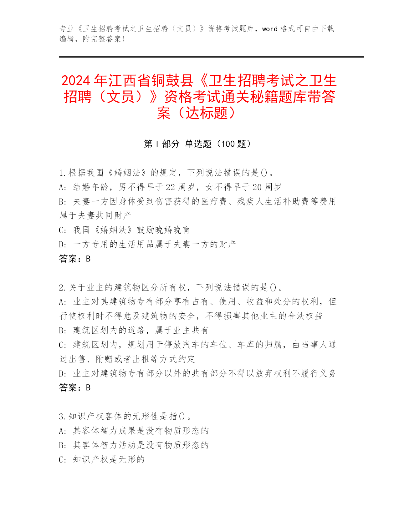 2024年江西省铜鼓县《卫生招聘考试之卫生招聘(文员)》资格考试通关秘籍题库带答案(达标题)