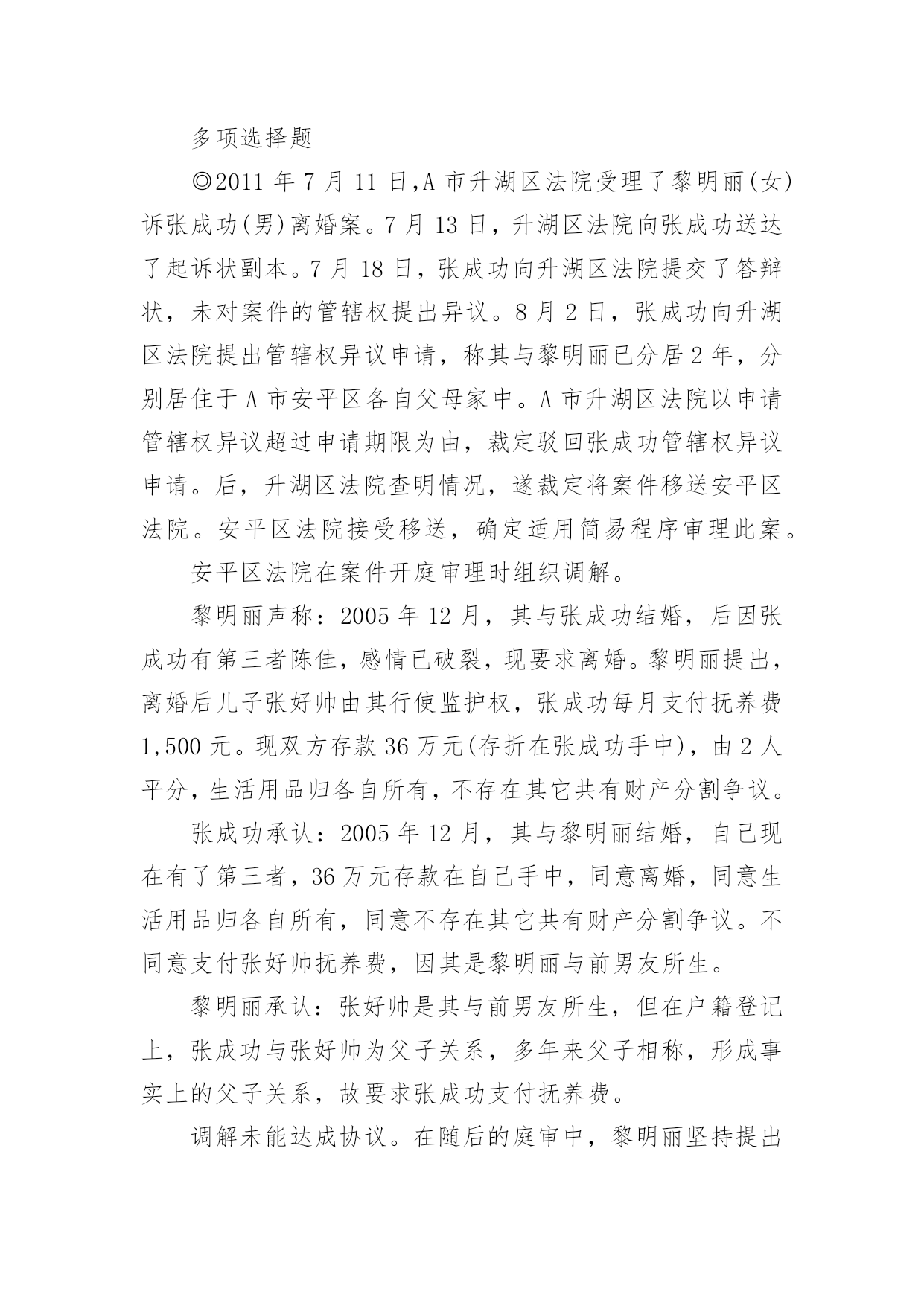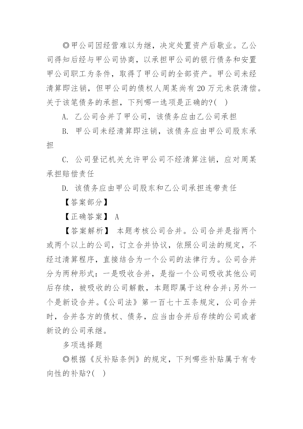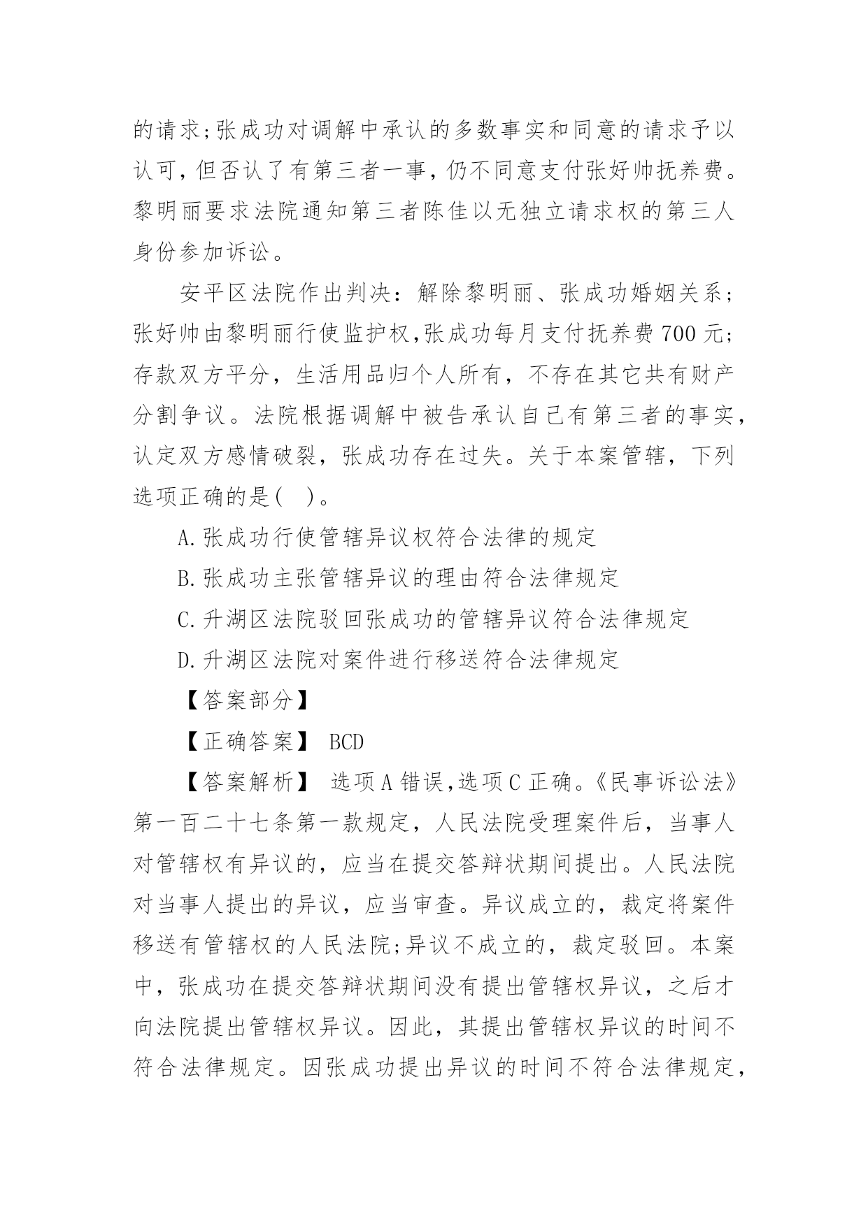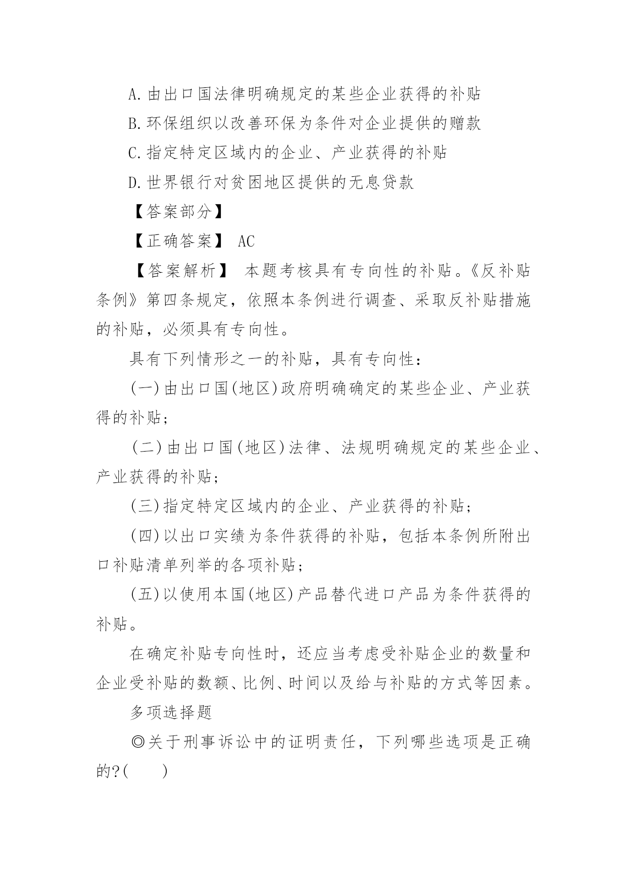 司法考试备考选择题及答案多项选择题◎最高人民法院、最高人民检察院联合公布了《关于执行刑法确定罪名的补充规定(三)》,对适用刑法的部分罪名进行了补充或修改,取消了原来的“公司、企业人员贿罪”罪名,修改为“非国家工作人员贿罪”。对此,下列哪些选项是正确的?()A.该规定属于立法解释B.该规定没有正式的法的效力C.该规定的效力低于宪法D.该规定属于正式解释【答案部分】【正确答案】CD【答案解析】本题考核法律解释的种类。选项A错误。立法解释又称法律解释,是立法机关根据立法原意,对法律规范具体条文的含义以及所使用的概念、术语、定义所作的说明。本题中该解释是最高人民法院、最高人民检察院作出的,而非立法机关作出的,不是立法解释,而是司法解释。选项B错误,选项D正确。司法解释是有权解释,是正式的法律解释,具有正式的法的效力。选项C正确。该规定属于司法解释,法律效力低于宪法。单项选择题◎甲公司因经营难以为继,决定处置资产后歇业。乙公司得知后经与甲公司协商,以承担甲公司的银行债务和安置甲公司职工为条件,取得了甲公司的全部资产。甲公司未经清算即注销,但甲公司的债权人周某尚有20万元未获清偿。关于该笔债务的承担,下列哪一选项是正确的?()A.乙公司合并了甲公司,该债务应由乙公司承担B.甲公司未经清算即注销,该债务应由甲公司股东承担C.公司登记机关允许甲公司不经清算注销,应对周某承担赔偿责任D.该债务应由甲公司股东和乙公司承担连带责任【答案部分】【正确答案】A【答案解析】本题考核公司合并。公司合并是指两个或两个以上的公司,订立合并协议,依照公司法的规定,不经过清算程序,直接结合为一个公司的法律行为。公司合并分为两种形式:一是吸收合并,是指一个公司吸收其他公司后存续,被吸收的公司解散,本题即属于这种合并;另外一个是新设合并。《公司法》第一百七十五条规定,公司合并时,合并各方的债权、债务,应当由合并后存续的公司或者新设的公司承继。多项选择题◎根据《反补贴条例》的规定,下列哪些补贴属于有专向性的补贴?()A.由出口国法律明确规定的某些企业获得的补贴B.环保组织以改善环保为条件对企业提供的赠款C.指定特定区域内的企业、产业获得的补贴D.世界银行对贫困地区提供的无息贷款【答案部分】【正确答案】AC【答案解析】本题考核具有专向性的补贴。《反补贴条例》第四条规定,依照本条例进行调查、采取反补贴措施的补贴,必须具有专向性。具有下列情形之一的补贴,具有专向性:(一)由出口国(地区)政府明确确定的某些企业、产业获得的补贴;(二)由出口国(地区)法律、法规明确规定的某些企业、产业获得的补贴;(三)指定特定区域内的企业、产业获得的补贴;(四)以出口实绩为条件获得的补贴,包括本条例所附出口补贴清单列举的各项补贴;(五)以使用本国(地区)产品替代进口产品为条件获得的补贴。在确定补贴专向性时,还应当考虑受补贴企业的数量和企业受补贴的数额、比例、时间以及给与补贴的方式等因素。多项选择题◎关于刑事诉讼中的证明责任,下列哪些选项是正确的?()A.总是与一定的积极诉讼主张相联系,否认一方不负证明责任B.总是与一定的不利诉讼后果相联系,受到不利裁判的不一定承担证明责任C.是提出证据责任与说服责任的统一,提出证据并非完全履行了证明责任D.是专属于控诉方独自承担的责任,具有一定的责任排他性【答案部分】【正确答案】ABC【答案解析】选项A、B、C正确。证明责任具有以下特点:(1)证明责任总是与一定的诉讼主张相联系;(2)证明责任是提供证据责任和说服责任的统一;(3)证明责任总是和一定的不利诉讼后果相联系。选项D错误。《刑事诉讼法》第四十九条规定,公诉案件中被告人有罪的举证责任由人民检察院承担,自诉案件中被告人有罪的举证责任由自诉人承担。据此可知,在我国,刑事诉讼证明责任的承担主体应为控诉机关和负有证明责任的当事人。犯罪嫌疑人、被告人不承担证明自己无罪的责任。从整体上看,刑事诉讼中的证明责任是一个专属于控诉方的概念。但是,在少数法律推定被告人有罪的特定案件,如巨额财产来源不明案件及非法持有属于国家绝密、机密文件、资料、物品罪中,犯罪嫌疑人、被告人也负有提出证据的责任。多项选择题◎2011年7月11日,A市升湖区法院受理了黎明丽(女)诉张成功(男)离婚案。7月13日,升湖区法院向张成功送达了起诉状副本。7月18日,张成功向升湖区法院提交了答辩状,未对案件的管辖权提出异议。8月2日,张成功向升湖区法院提出管辖权异议申请,称其与黎明丽已分居2年,分别居住于A市安平区各自父母家中。A市升湖区法院以申请管辖权异议超过申请期限为由,裁定驳回张成功管辖权异议申请。后,升湖区法院查明情况,遂裁定将案件移送安平区法院。安平区法院接受移送,确定适用简易程序审理此案。安平区法院在案件开庭审理时组织调解。黎明丽声称:2