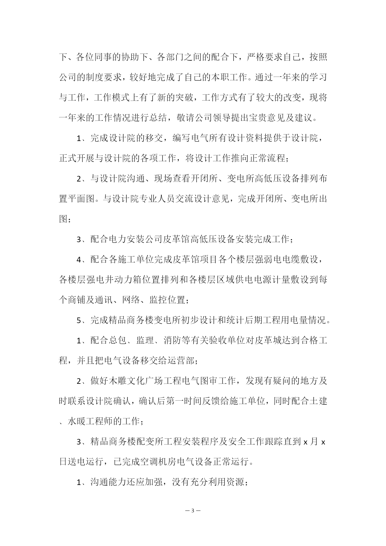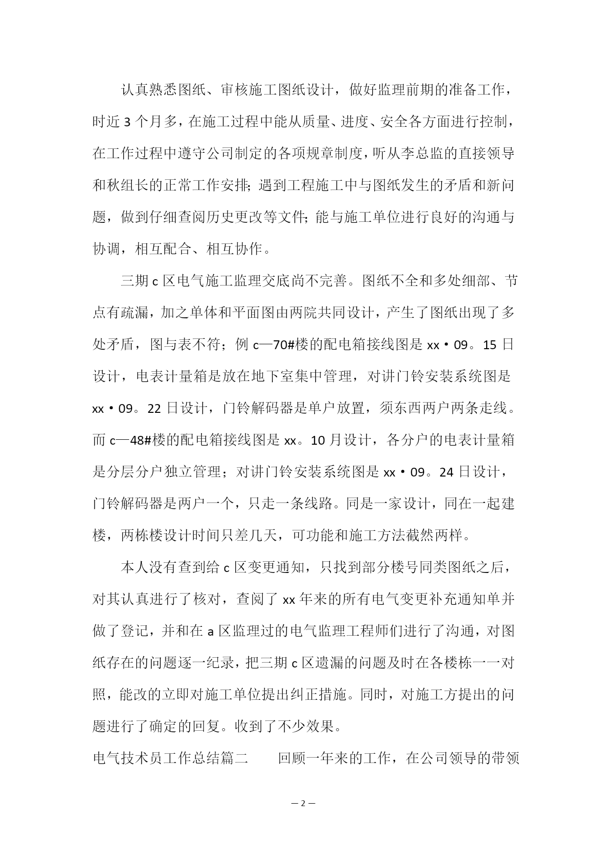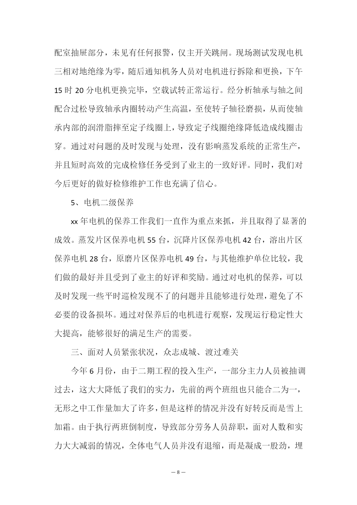 —PAGE\*MERGEFORMAT9—最新电气技术员工作总结(三篇)总结是对过去一定时期的工作、学习或思想情况进行回顾、分析,并做出客观评价的书面材料,它有助于我们寻找工作和事物发展的规律,从而掌握并运用这些规律,是时候写一份总结了。那么我们该如何写一篇较为完美的总结呢?下面是我整理的个人今后的总结范文,欢迎阅读分享,希望对大家有所帮助。电气技术员工作总结篇一建设工程是一种特殊的产品,价值大、使用寿命长、而且还关系到人民的生命财产安全、健康和环境。因此,保证建设工程质量和使用安全就成为一项非常重要的问题,由于我们监理人员是有技术、会管理、懂经济、通法律的专门人才,我们监理人员对承包施工的单位进行优良监督与管理,就会对建设工作质量和使用安全起到重要的保证作用。所以,我们监理人员在工作中,认为工程施工不符合工程设计、不符合工程质量标准和质量要求的,应及时报告组长、行业主管监理及必要时报告于李总监。并及时给施工方发出整改通知,确保工程质量,我们要严格遵守执行gb50319—xx工程监理的国家标准;从监理自进驻工地现场至工程竣工验收,都要做到遵循“守法、诚信、公正、科学”的职业准则开展工作;认真学习gb50303—xx《建筑电气工程施工质量验收规范》、gb50168—92、gb50169—xx的国家标准规范和有关的规范。工作中,本人能够认真学习相关规范,对开展专业监理工作起到了积极的作用。认真熟悉图纸、审核施工图纸设计,做好监理前期的准备工作,时近3个月多,在施工过程中能从质量、进度、安全各方面进行控制,在工作过程中遵守公司制定的各项规章制度,听从李总监的直接领导和秋组长的正常工作安排;遇到工程施工中与图纸发生的矛盾和新问题,做到仔细查阅历史更改等文件;能与施工单位进行良好的沟通与协调,相互配合、相互协作。三期c区电气施工监理交底尚不完善。图纸不全和多处细部、节点有疏漏,加之单体和平面图由两院共同设计,产生了图纸出现了多处矛盾,图与表不符;例c—70#楼的配电箱接线图是xx·09。15日设计,电表计量箱是放在地下室集中管理,对讲门铃安装系统图是xx·09。22日设计,门铃解码器是单户放置,须东西两户两条走线。而c—48#楼的配电箱接线图是xx。10月设计,各分户的电表计量箱是分层分户独立管理;对讲门铃安装系统图是xx·09。24日设计,门铃解码器是两户一个,只走一条线路。同是一家设计,同在一起建楼,两栋楼设计时间只差几天,可功能和施工方法截然两样。本人没有查到给c区变更通知,只找到部分楼号同类图纸之后,对其认真进行了核对,查阅了xx年来的所有电气变更补充通知单并做了登记,并和在a区监理过的电气监理工程师们进行了沟通,对图纸存在的问题逐一纪录,把三期c区遗漏的问题及时在各楼栋一一对照,能改的立即对施工单位提出纠正措施。同时,对施工方提出的问题进行了确定的回复。收到了不少效果。电气技术员工作总结篇二回顾一年来的工作,在公司领导的带领下、各位同事的协助下、各部门之间的配合下,严格要求自己,按照公司的制度要求,较好地完成了自己的本职工作。通过一年来的学习与工作,工作模式上有了新的突破,工作方式有了较大的改变,现将一年来的工作情况进行总结,敬请公司领导提出宝贵意见及建议。1﹑完成设计院的移交,编写电气所有设计资料提供于设计院,正式开展与设计院的各项工作,将设计工作推向正常流程;2﹑与设计院沟通、现场查看开闭所、变电所高低压设备排列布置平面图。与设计院专业人员交流设计意见,完成开闭所、变电所出图;3﹑配合电力安装公司皮革馆高低压设备安装完成工作;4﹑配合各施工单位完成皮革馆项目各个楼层强弱电电缆敷设,各楼层强电井动力箱位置排列和各楼层区域供电电源计量敷设到每个商铺及通讯、网络、监控位置;5﹑完成精品商务楼变电所初步设计和统计后期工程用电量情况。1﹑配合总包﹑监理﹑消防等有关验收单位对皮革城达到合格工程,并且把电气设备移交给运营部;2﹑做好木雕文化广场工程电气图审工作,发现有疑问的地方及时联系设计院确认,确认后第一时间反馈给施工单位,同时配合土建﹑水暖工程师的工作;3﹑精品商务楼配变所工程安装程序及安全工作跟踪直到x月x日送电运行,已完成空调机房电气设备正常运行。1﹑沟通能力还应加强,没有充分利用资源;2﹑专业面狭窄,作为一名电气工程师,应该是一专多能的,这样才符合公司发展的需求。在以后的工作过程中,加强其他专业的学习,从而提高自己的业务、技术水平,时时严格要求自己,注重自身发展和进步,做到谨小慎微;3﹑对于工作过程中的前瞻性、计划性不够强,在以后工作中提高自己对于会发生问题工作的预见性,尽量不出问题,当遇到问题时能做到有条不紊的处理。明年会是更忙碌的一年,接下来的工作中我将紧密围绕在公司的总体