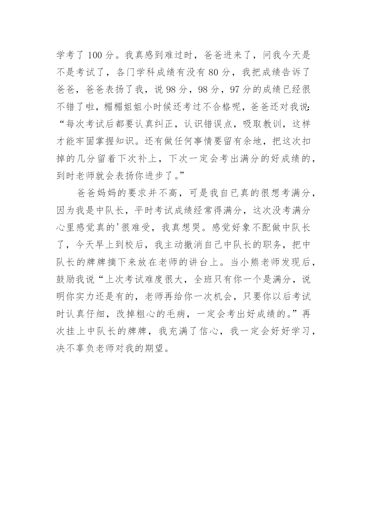 期中考试日记期中考试日记昨天我们期中考试了,下午妈妈来接我时,语文成绩已经知道了,我考了98分,我上完英语兴趣课回教室拿书包时,看到英语老师还在批试卷,查了一下英语成绩,我考了97分,我心里感到很郁闷,难道真的应验了我前天晚上讲的话,我说如果这次期中考试语文数学是98分,98分的话,那我的英语成绩肯定是97分。早知道这样灵验的话,我一定会说,每门课的考试成绩都是满分100分。当我走出教室时,刚好碰到小熊老师和妈妈在谈话,小熊老师把我叫住了,为我没考到满分感到可惜,说卷面上字写得很认真很漂亮,就错在找句子4个句子只找到3个,真的太粗心,真不该丢那2分。我装作很轻松的样子,告诉小熊老师,我做好后没时间检查,没办法订正。回家路上我闷闷不乐,随手拿起车上一本书挡住了脸,只觉得鼻子酸酸的,口水咸咸的,强忍着眼泪不掉下来。我回到家就跑到房间睡觉去了,妈妈对我说,97分差100分只有3分,98分差100分只有2分,这个成绩真的很不错了。我对妈妈说:“可是也有同学考100分的呀。”阿姨问起数学考试成绩不知出来了没有?说不定数学成绩考得很好,于是妈妈就给赖老师打电话,知道我数学考了98分,赖老师说这次数学考卷难度很大,两个班只有我们班的金贝翰同学考了100分。我真感到难过时,爸爸进来了,问我今天是不是考试了,各门学科成绩有没有80分,我把成绩告诉了爸爸,爸爸表扬了我,说98分,98分,97分的成绩已经很不错了啦,楣楣姐姐小时候还考过不合格呢,爸爸还对我说:“每次考试后都要认真纠正,认识错误点,吸取教训,这样才能牢固掌握知识。还有做任何事情要留有余地,把这次扣掉的几分留着下次补上,下次一定会考出满分的好成绩的,到时老师就会表扬你进步了。”爸爸妈妈的要求并不高,可是我自已真的很想考满分,因为我是中队长,平时考试成绩经常得满分,这次没考满分心里感觉真的'很难受,我真想哭。感觉好象不配做中队长了,今天早上到校后,我主动撤消自己中队长的职务,把中队长的牌牌摘下来放在老师的讲台上。当小熊老师发现后,鼓励我说“上次考试难度很大,全班只有你一个是满分,说明你实力还是有的,老师再给你一次机会,只要你以后考试时认真仔细,改掉粗心的毛病,一定会考出好成绩的。”再次挂上中队长的牌牌,我充满了信心,我一定会好好学习,决不辜负老师对我的期望。