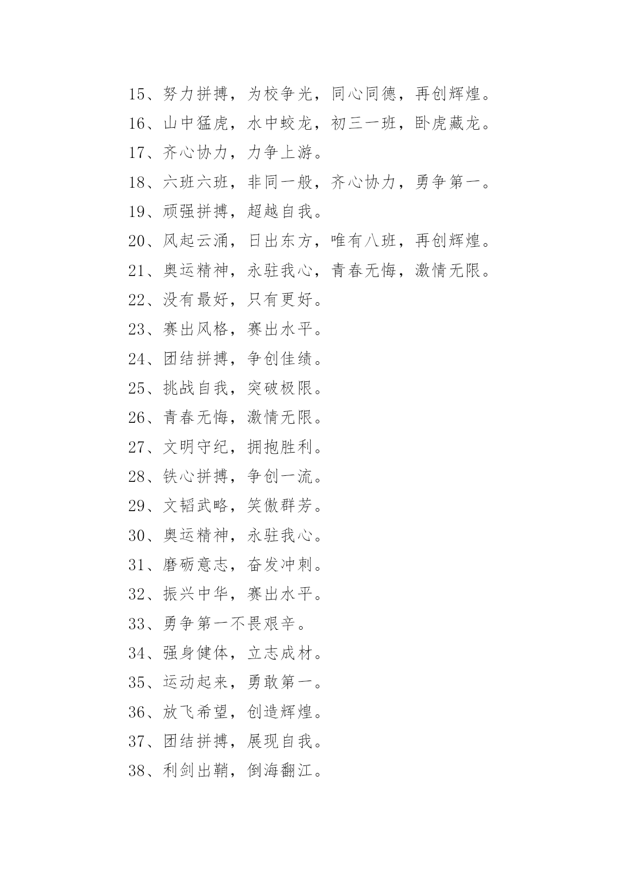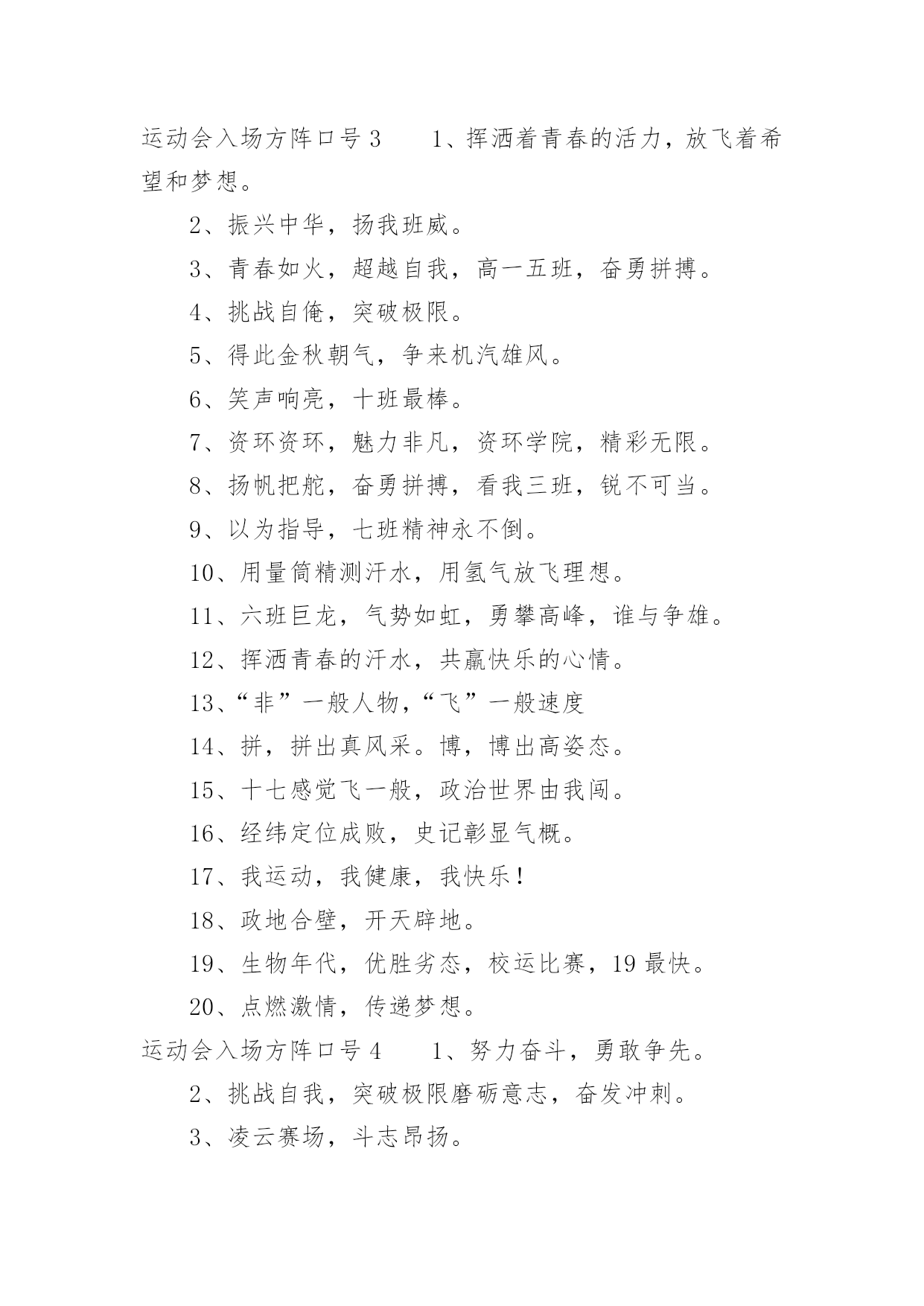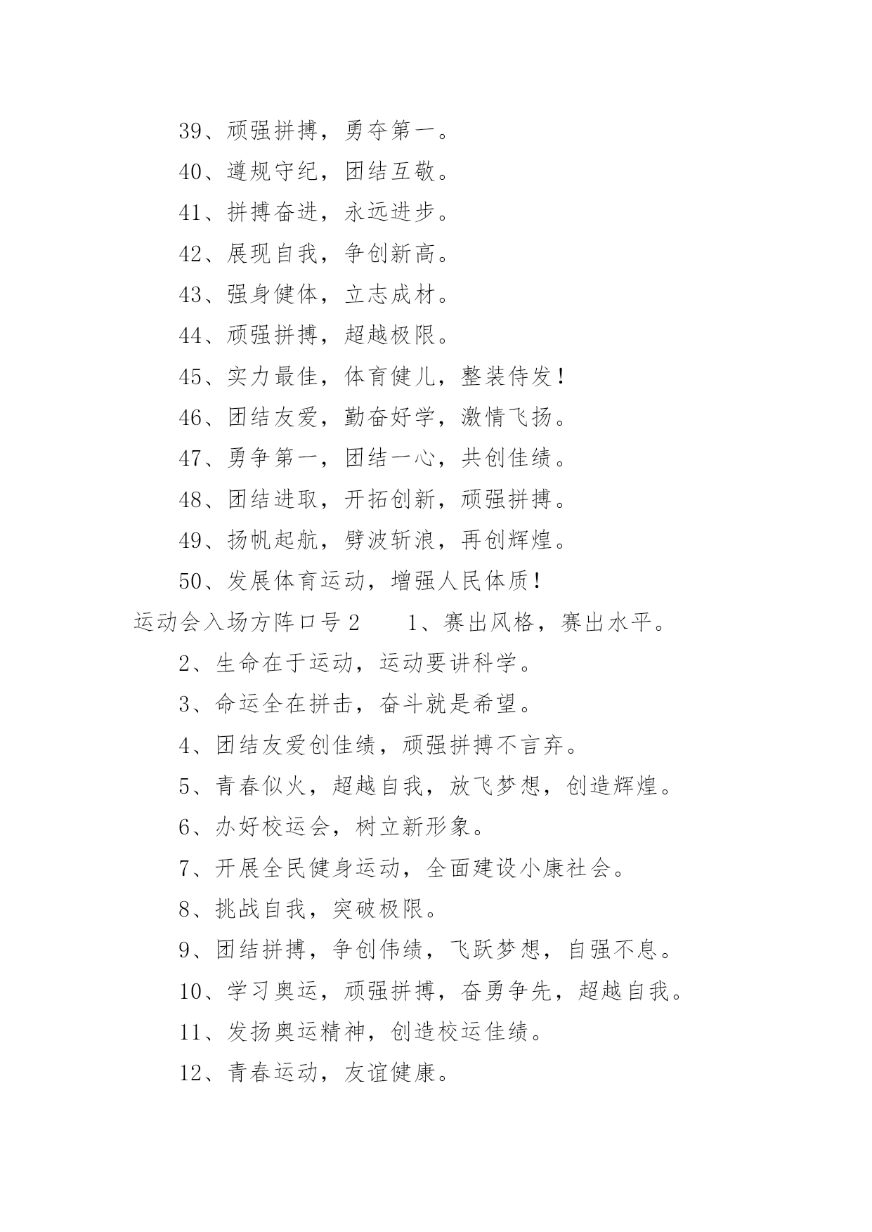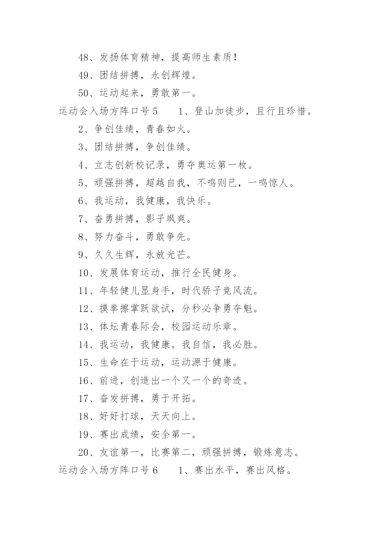 运动会入场方阵口号运动会入场方阵口号在平平淡淡的学习、工作、生活中,许多人都接触过一些比较经典的口号吧,不同时期不同的口号可以看出,意识对物质具有能动作用。还在苦苦寻找优秀经典的口号吗?下面是小编整理的运动会入场方阵口号,欢迎阅读,希望大家能够喜欢。运动会入场方阵口号11、飞跃梦想,敢拼敢闯,乘风破浪,奋勇激昂。2、奋发拼搏,勇于开拓。3、展现自我,争创新高。4、顽强拼搏,超越极限。5、我班雄风,扬威大众。6、扬帆把舵,奋勇拼搏,看我三班,气势磅礴。7、严肃活泼,奋勇拼搏,团结争先,荣誉如山。8、团结拼搏,展现自我。9、超越自己,永不放弃。10、努力拼搏,追求梦想,同心同德,再创辉煌。11、振兴中华,赛出水平。12、携手奋进,共创佳绩。13、磨砺意志,奋发冲刺。14、一七一七,迸发活力,扬帆百舵,勇争第一。15、努力拼搏,为校争光,同心同德,再创辉煌。16、山中猛虎,水中蛟龙,初三一班,卧虎藏龙。17、齐心协力,力争上游。18、六班六班,非同一般,齐心协力,勇争第一。19、顽强拼搏,超越自我。20、风起云涌,日出东方,唯有八班,再创辉煌。21、奥运精神,永驻我心,青春无悔,激情无限。22、没有最好,只有更好。23、赛出风格,赛出水平。24、团结拼搏,争创佳绩。25、挑战自我,突破极限。26、青春无悔,激情无限。27、文明守纪,拥抱胜利。28、铁心拼搏,争创一流。29、文韬武略,笑傲群芳。30、奥运精神,永驻我心。31、磨砺意志,奋发冲刺。32、振兴中华,赛出水平。33、勇争第一不畏艰辛。34、强身健体,立志成材。35、运动起来,勇敢第一。36、放飞希望,创造辉煌。37、团结拼搏,展现自我。38、利剑出鞘,倒海翻江。39、顽强拼搏,勇夺第一。40、遵规守纪,团结互敬。41、拼搏奋进,永远进步。42、展现自我,争创新高。43、强身健体,立志成材。44、顽强拼搏,超越极限。45、实力最佳,体育健儿,整装侍发!46、团结友爱,勤奋好学,激情飞扬。47、勇争第一,团结一心,共创佳绩。48、团结进取,开拓创新,顽强拼搏。49、扬帆起航,劈波斩浪,再创辉煌。50、发展体育运动,增强人民体质!运动会入场方阵口号21、赛出风格,赛出水平。2、生命在于运动,运动要讲科学。3、命运全在拼击,奋斗就是希望。4、团结友爱创佳绩,顽强拼搏不言弃。5、青春似火,超越自我,放飞梦想,创造辉煌。6、办好校运会,树立新形象。7、开展全民健身运动,全面建设小康社会。8、挑战自我,突破极限。9、团结拼搏,争创伟绩,飞跃梦想,自强不息。10、学习奥运,顽强拼搏,奋勇争先,超越自我。11、发扬奥运精神,创造校运佳绩。12、青春运动,友谊健康。13、体坛青春际会,校园运动乐章。14、做礼貌观众,树赛场新风。15、遵规守纪,团结互敬。16、励精图治,奋发向上,努力拼搏,永不言弃。17、传承体育精神,共享竞技成功。18、奋力拼搏,扬我班风,努力学习,勇争第一。19、生命因运动精彩,体育让梦想成真。20、超越自我,挑战极限。21、青春如火,超越自我,励精图治,奋勇拼搏。22、发扬体育精神,提高师生素质。23、团结自律最为高,永不言弃是英豪。24、青春没有失败,只要亮出风采。25、磨砺意志,奋发冲刺。26、团结文明,展现风采。27、比拼激扬梦想,搏击磨砺锋芒。28、超越极限,超越自我。29、顽强拼搏,超越自我,不鸣则已,一鸣惊人。30、看我六班,影子飒爽,奋勇拼搏,展现自我。31、铁心拼搏,争创一流。32、全民健身,利国利民,功在当代,利在千秋。33、磨砺意志,奋发冲刺,团结拼搏,展现自我。34、奥运精神放异彩,年轻健儿展风姿。35、年轻没有失败,只要亮出风采。36、体育如花绽放快乐校园,青春似火燃烧亮丽人生。37、强身健体,立志成材,非同一般。38、登山加徒步,且行且珍惜。39、团结进取,我们最行,奋勇拼搏,我们最强。40、勇争第一,团结一心,共创佳绩。41、人人关心体育,体育造福人人。42、田径英姿多豪迈,趣味比赛亦精彩。43、团结拼搏,永创辉煌。44、努力奋斗,勇敢争先。45、努力拼搏,永夺第一。46、前进,创造出一个又一个的奇迹。47、励精图治,争创一流,好好学习,天天向上。48、励精图治绘蓝图,凝神聚力谱新篇。49、天道酬勤,健康起来。50、年轻健儿显身手,时代骄子竞风流。51、友谊第一,比赛第二,顽强拼搏,锻炼意志。52、发展体育运动,推行全民健身。53、淡泊明志,宁静致远,团结友爱,顽强拼搏。54、奋勇拼搏,展现自我。55、努力拼搏,自强不息。56、顽强拼搏,赛出风格。57、奋勇拼搏,影子飒爽。58、团结拼搏,奋发有为。59、我运动,我快乐,我锻炼,我提高。60、我运动,我健康,我快乐。运动会入场方阵口号31、挥洒着青春的活力,放飞着希望和梦想。2、振兴中华,扬