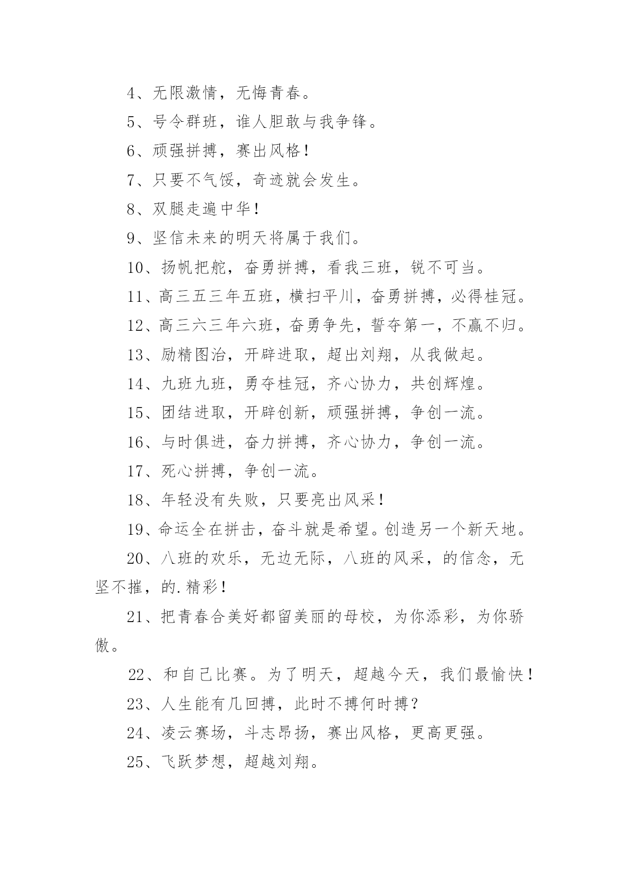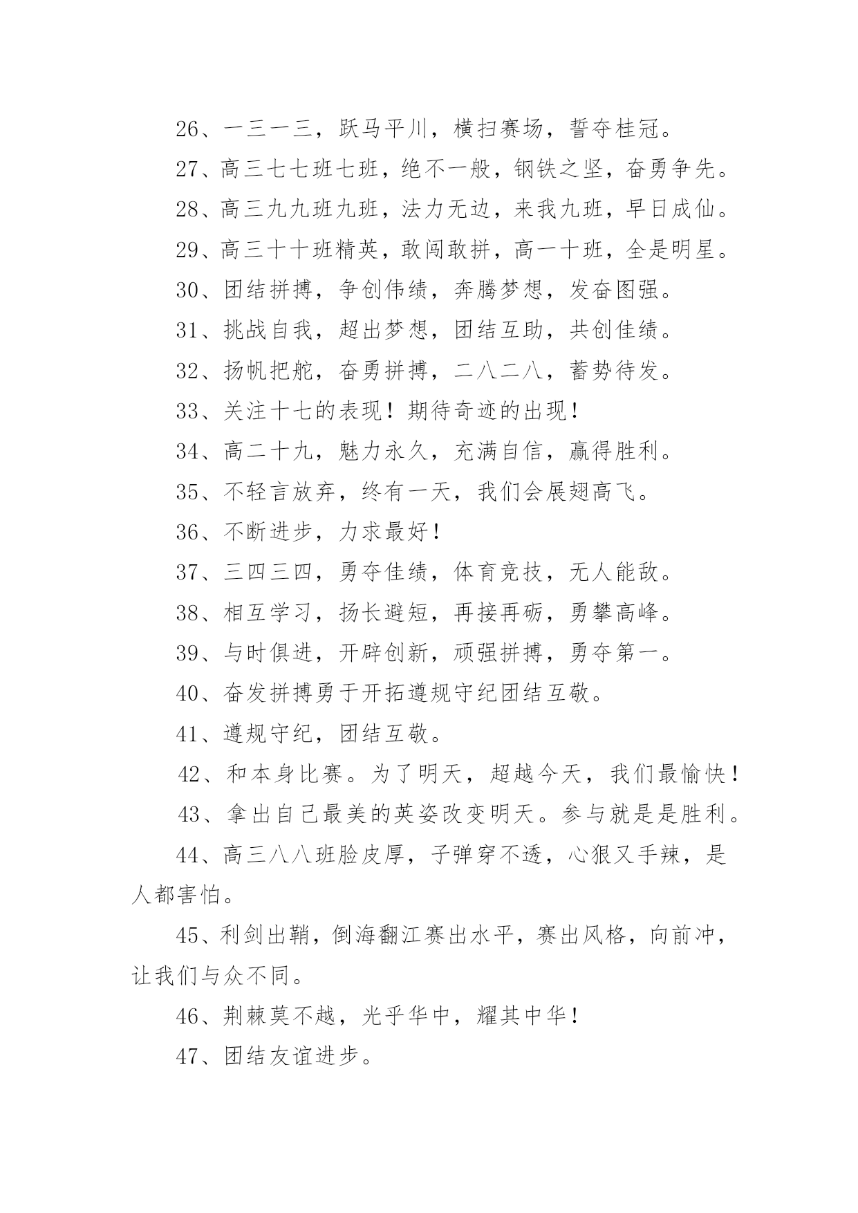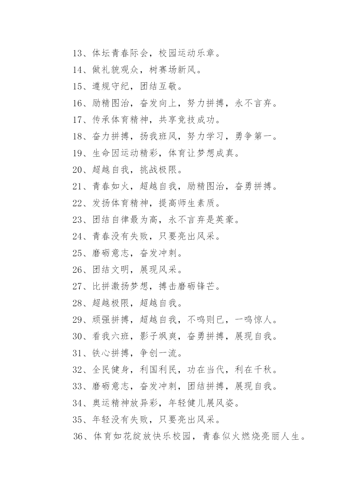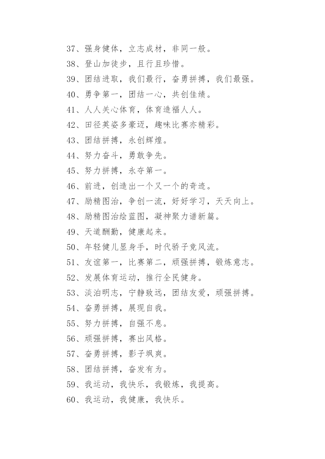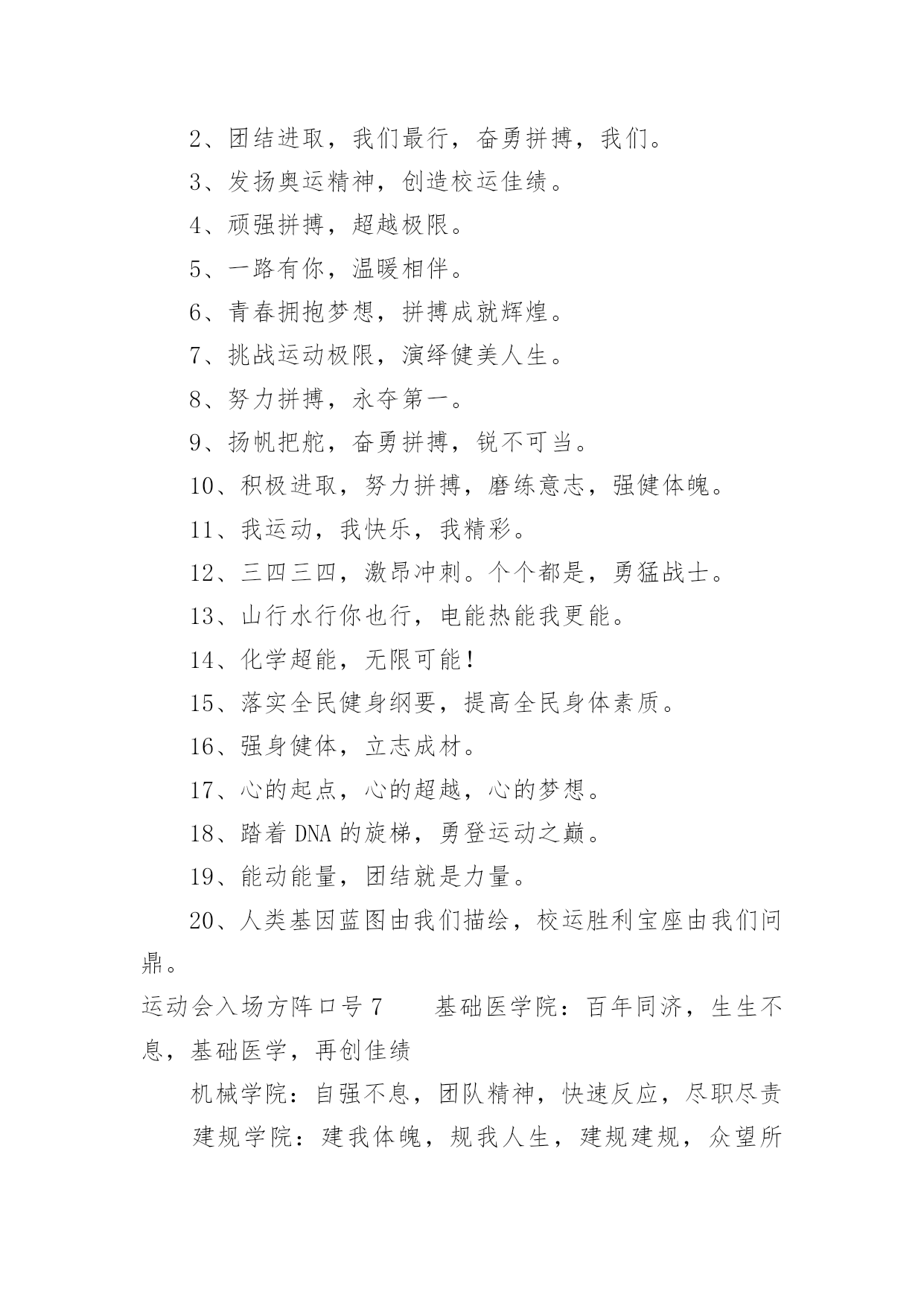 运动会入场方阵口号运动会入场方阵口号在平平淡淡的学习、工作、生活中,许多人都接触过一些比较经典的口号吧,不同时期不同的口号可以看出,意识对物质具有能动作用。还在苦苦寻找优秀经典的口号吗?下面是小编整理的运动会入场方阵口号,欢迎阅读,希望大家能够喜欢。运动会入场方阵口号11、飞跃梦想,敢拼敢闯,乘风破浪,奋勇激昂。2、奋发拼搏,勇于开拓。3、展现自我,争创新高。4、顽强拼搏,超越极限。5、我班雄风,扬威大众。6、扬帆把舵,奋勇拼搏,看我三班,气势磅礴。7、严肃活泼,奋勇拼搏,团结争先,荣誉如山。8、团结拼搏,展现自我。9、超越自己,永不放弃。10、努力拼搏,追求梦想,同心同德,再创辉煌。11、振兴中华,赛出水平。12、携手奋进,共创佳绩。13、磨砺意志,奋发冲刺。14、一七一七,迸发活力,扬帆百舵,勇争第一。15、努力拼搏,为校争光,同心同德,再创辉煌。16、山中猛虎,水中蛟龙,初三一班,卧虎藏龙。17、齐心协力,力争上游。18、六班六班,非同一般,齐心协力,勇争第一。19、顽强拼搏,超越自我。20、风起云涌,日出东方,唯有八班,再创辉煌。21、奥运精神,永驻我心,青春无悔,激情无限。22、没有最好,只有更好。23、赛出风格,赛出水平。24、团结拼搏,争创佳绩。25、挑战自我,突破极限。26、青春无悔,激情无限。27、文明守纪,拥抱胜利。28、铁心拼搏,争创一流。29、文韬武略,笑傲群芳。30、奥运精神,永驻我心。31、磨砺意志,奋发冲刺。32、振兴中华,赛出水平。33、勇争第一不畏艰辛。34、强身健体,立志成材。35、运动起来,勇敢第一。36、放飞希望,创造辉煌。37、团结拼搏,展现自我。38、利剑出鞘,倒海翻江。39、顽强拼搏,勇夺第一。40、遵规守纪,团结互敬。41、拼搏奋进,永远进步。42、展现自我,争创新高。43、强身健体,立志成材。44、顽强拼搏,超越极限。45、实力最佳,体育健儿,整装侍发!46、团结友爱,勤奋好学,激情飞扬。47、勇争第一,团结一心,共创佳绩。48、团结进取,开拓创新,顽强拼搏。49、扬帆起航,劈波斩浪,再创辉煌。50、发展体育运动,增强人民体质!运动会入场方阵口号21、赛出风格,赛出水平。2、生命在于运动,运动要讲科学。3、命运全在拼击,奋斗就是希望。4、团结友爱创佳绩,顽强拼搏不言弃。5、青春似火,超越自我,放飞梦想,创造辉煌。6、办好校运会,树立新形象。7、开展全民健身运动,全面建设小康社会。8、挑战自我,突破极限。9、团结拼搏,争创伟绩,飞跃梦想,自强不息。10、学习奥运,顽强拼搏,奋勇争先,超越自我。11、发扬奥运精神,创造校运佳绩。12、青春运动,友谊健康。13、体坛青春际会,校园运动乐章。14、做礼貌观众,树赛场新风。15、遵规守纪,团结互敬。16、励精图治,奋发向上,努力拼搏,永不言弃。17、传承体育精神,共享竞技成功。18、奋力拼搏,扬我班风,努力学习,勇争第一。19、生命因运动精彩,体育让梦想成真。20、超越自我,挑战极限。21、青春如火,超越自我,励精图治,奋勇拼搏。22、发扬体育精神,提高师生素质。23、团结自律最为高,永不言弃是英豪。24、青春没有失败,只要亮出风采。25、磨砺意志,奋发冲刺。26、团结文明,展现风采。27、比拼激扬梦想,搏击磨砺锋芒。28、超越极限,超越自我。29、顽强拼搏,超越自我,不鸣则已,一鸣惊人。30、看我六班,影子飒爽,奋勇拼搏,展现自我。31、铁心拼搏,争创一流。32、全民健身,利国利民,功在当代,利在千秋。33、磨砺意志,奋发冲刺,团结拼搏,展现自我。34、奥运精神放异彩,年轻健儿展风姿。35、年轻没有失败,只要亮出风采。36、体育如花绽放快乐校园,青春似火燃烧亮丽人生。37、强身健体,立志成材,非同一般。38、登山加徒步,且行且珍惜。39、团结进取,我们最行,奋勇拼搏,我们最强。40、勇争第一,团结一心,共创佳绩。41、人人关心体育,体育造福人人。42、田径英姿多豪迈,趣味比赛亦精彩。43、团结拼搏,永创辉煌。44、努力奋斗,勇敢争先。45、努力拼搏,永夺第一。46、前进,创造出一个又一个的奇迹。47、励精图治,争创一流,好好学习,天天向上。48、励精图治绘蓝图,凝神聚力谱新篇。49、天道酬勤,健康起来。50、年轻健儿显身手,时代骄子竞风流。51、友谊第一,比赛第二,顽强拼搏,锻炼意志。52、发展体育运动,推行全民健身。53、淡泊明志,宁静致远,团结友爱,顽强拼搏。54、奋勇拼搏,展现自我。55、努力拼搏,自强不息。56、顽强拼搏,赛出风格。57、奋勇拼搏,影子飒爽。58、团结拼搏,奋发有为。59、我运动,我快乐,我锻炼,我提高。60、我运动,我健康,我快乐。运动会入场方阵口号31、挥洒着青春的活力,放飞着希望和梦想。2、振兴中华,扬