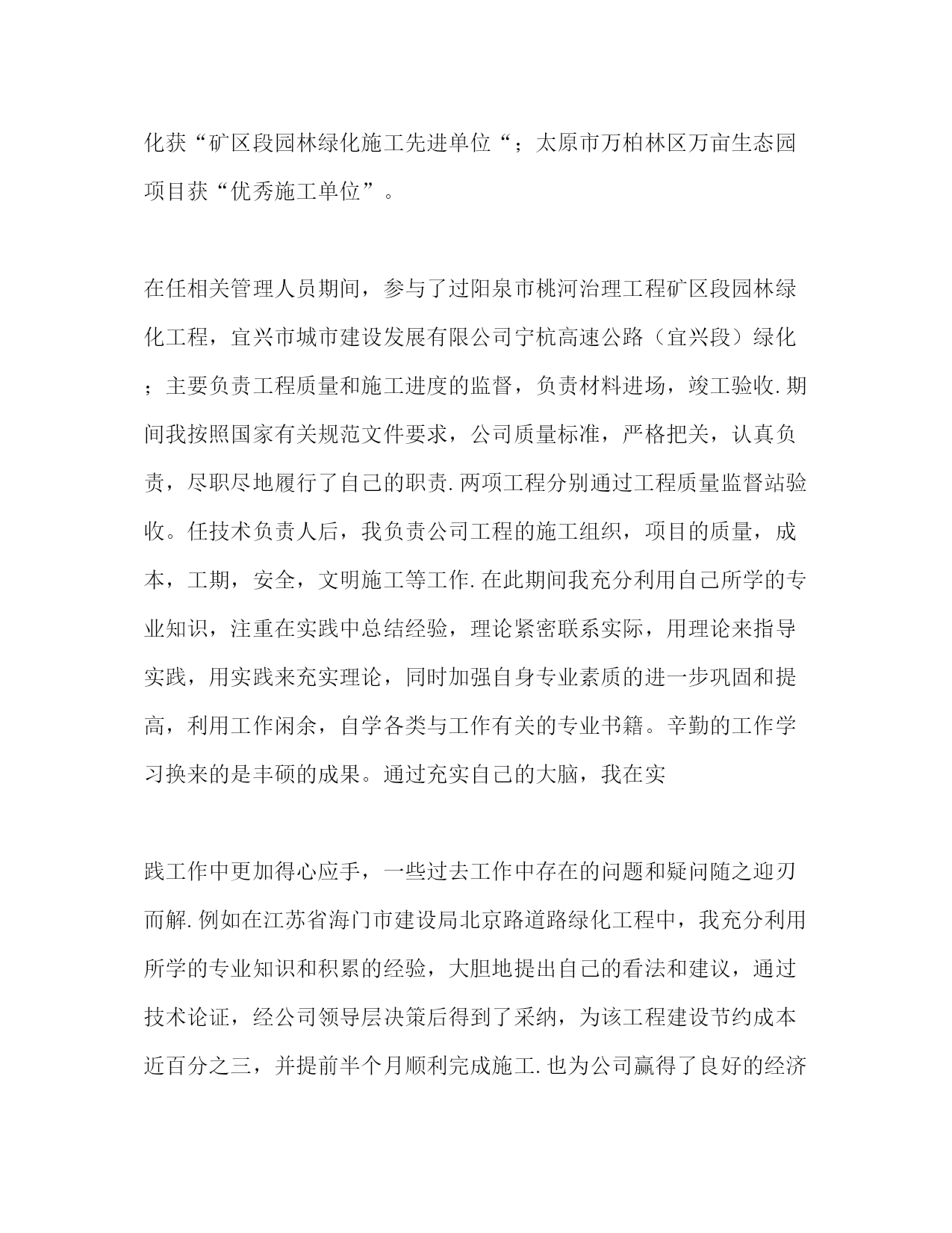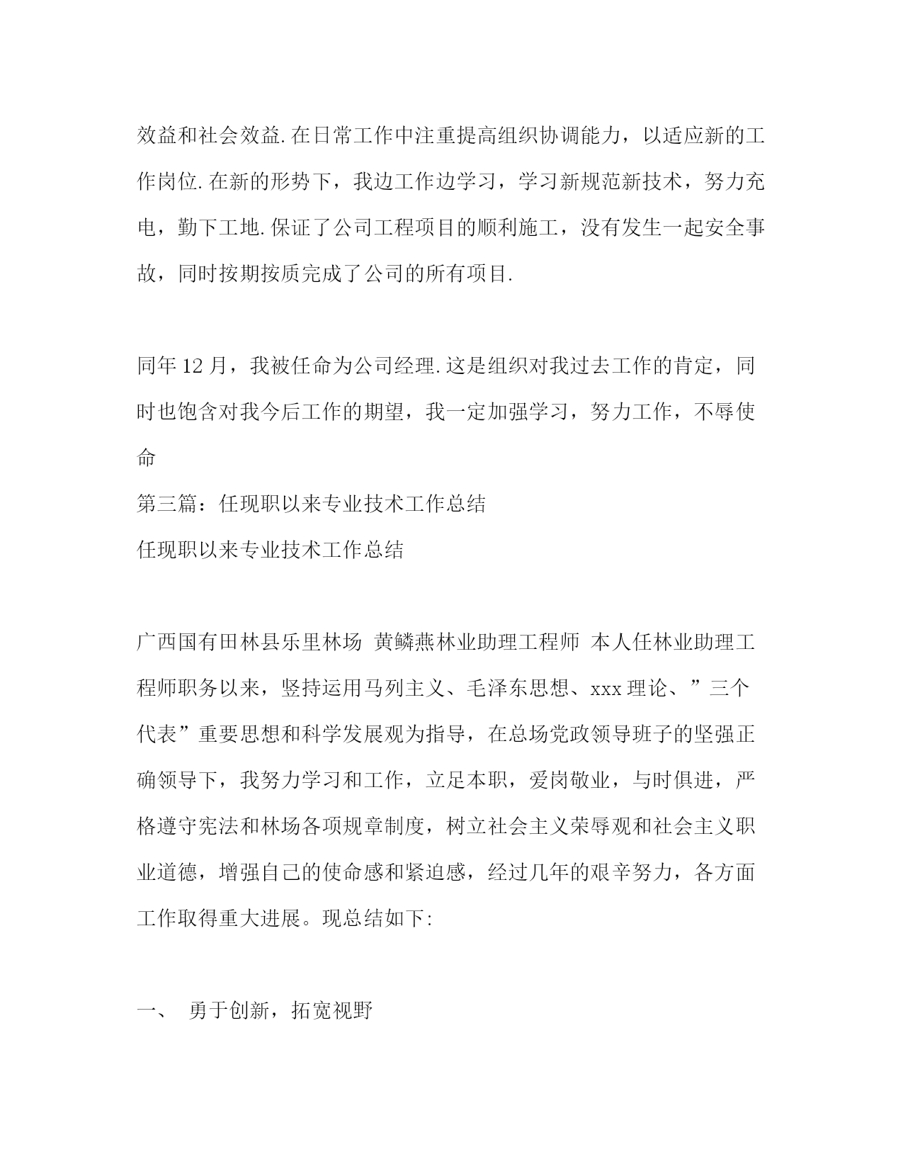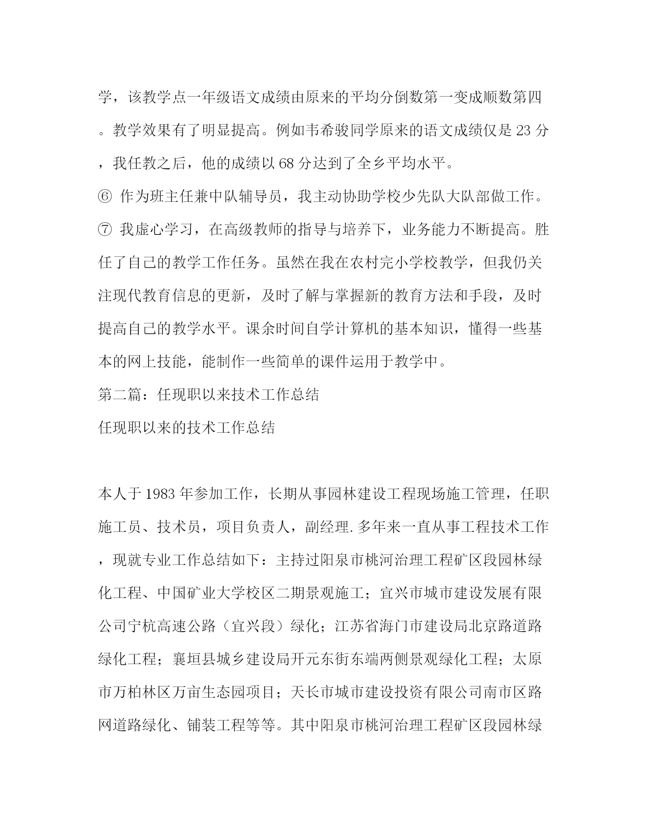 PAGE此资料由网络收集而来,如有侵权请告知上传者立即删除。资料共分享,我们负责传递知识。任现职专业技术工作总结第1篇第2篇第3篇第4篇第5篇更多顶部目录第一篇:任现职以来专业技术工作总结第二篇:任现职以来技术工作总结第三篇:任现职以来专业技术工作总结第四篇:任现职以来专业技术工作总结第五篇:任现职以来专业技术工作总结更多相关范文正文第一篇:任现职以来专业技术工作总结我于一九九七年从柳州师范学校毕业至今,一直在最基层的马山乡大龙小学从事小学语文教学工作。于xx年x月获小学一级教师职称。现将自己任职以来的工作总结如下:①任职以来,自己政治思想表现好。服从领导安排,工作积极肯干,胜任一级教师工作。不断提高自己专业知识水平与业务能力,遵纪守法。年年工作量满,坚持在职进修学习,并于xx年x月通过自学完全部的汉语言文学专科课程,且顺利毕业。业余坚持学习教育理论,每年订阅多种语文教学学术刊物,因此教研水平不断提高。②积极开展教学研究并取得显著成绩。从xx年起,我积极参与“分层递进教学”课题的研究,担任学校分层递进教学实验班的实验教学。我在实验班三(2)班分成11个学习小组,对每个小组每个成员实行学科分层,开展小组合作学习活动,促进各层学生发展。通过两年的研究,使该班成绩从全乡同年级平均分倒数第二转变为平均分居年级第二,优秀率第一且没有低分率。指导该班韦梁娟同学参加全县小学生演讲比赛获优秀奖。期考时该生以198分的成绩居全乡年级第一,该生后来在小学毕业考中以总分196分的成绩录取于柳城民族中学。另外,xx年秋学期,区教育厅审定的全区中小学语文知识竞赛活动中,我指导该班学生参赛,共有3人获一等奖,8人获二等奖。由于指导工作突出,广西教育学院杂志社培训部授予我“指导一等奖”。xx年我的分层递进教学论文《课内作文教学的分层指导》获县级论文评比二等奖。并在全乡教代会上做了交流。在分层递进教学的同时我还参与了“听音想象作文”课题的研究,经过一年的实验后,该班学生的写作水平明显提高,之后在全校中高年级普遍推广,效果良好。学校的语文总体成绩由全乡倒数第二上升到第四。自99年秋学期起,我担任学校的语文教研组组长,指导二级教师的教学工作,例如,帮助蓝春老师提高对教材的认识,对教法的掌握,对理论知识的实践操作等等;在新课改培训方面,每年都指导多名青年教师参加县级和乡级课改培训。③积极参加县教研室开展的教研活动在中心校开展的青年教师赛教活动中,我均在全校上两节以上公开课,共三次参加乡级赛教均获二等奖。xx年春我还上了两节乡级公开课,得到了同行的好评。④工作以来,自己年年担任班主任工作,自觉履行班主任职责,努力完成班主任工作任务且有较强的组织管理能力。为了给学生们有丰富的课余生活,我每年都自费订一些书刊,发动学生自捐一些旧书组成班级图书角。作为班主任,我锐意创新大胆探索常采用主题班对会形式在班里开展活动。如“我是新世纪小主人”(xx年)“回归奏鸣曲”(xx年)“祖国在我心中”(xx年)等。其中“回归奏鸣曲”在全区新世纪小学生主题班队活动方案设计大赛中获三等奖。几年来,我班学生共有8人被评为市级“三好学生”;12人被评为县级“三好学生”;25人获乡级、校级“三好学生”、“优秀学生干部”、“优秀播音员”等称号。由于自己教育指导有成效,我所带班级两次获市级“文明班级”,三次获乡级“文明班级”光荣称号。我自己本人因工作突出,自xx年以来连续三年获乡级“优秀班主任”光荣称号;xx年获乡级“优秀教师”光荣称号。⑤xx年秋柳城县部分代课教师分流,我校所辖的料村教学点教师紧缺,于是我不怕走教的艰辛,从xx年春学期起报名走上支教之路。该教学点离我家有十几里远,每天我要跑四个来回,如果是下雨天路不好走,还得自己带着饭盒在校吃午餐。尽管教学环境不好,但我毫无怨言,在教学点我任学前班与一年级两个班的语文课,通过一年的教学,该教学点一年级语文成绩由原来的平均分倒数第一变成顺数第四。教学效果有了明显提高。例如韦希骏同学原来的语文成绩仅是23分,我任教之后,他的成绩以68分达到了全乡平均水平。⑥作为班主任兼中队辅导员,我主动协助学校少先队大队部做工作。⑦我虚心学习,在高级教师的指导与培养下,业务能力不断提高。胜任了自己的教学工作任务。虽然在我在农村完小学校教学,但我仍关注现代教育信息的更新,及时了解与掌握新的教育方法和手段,及时提高自己的教学水平。课余时间自学计算机的基本知识,懂得一些基本的网上技能,能制作一些简单的课件运用于教学中。第二篇:任现职以来技术工作总结任现职以来的技术工作总结本人于1983年参加工作,长期从事园林建设工程现场施工管理,任职施工员、技术员,项目负责人,副经理.多年来一直从事工程技术工作,现就专业工作总结如下:主持过