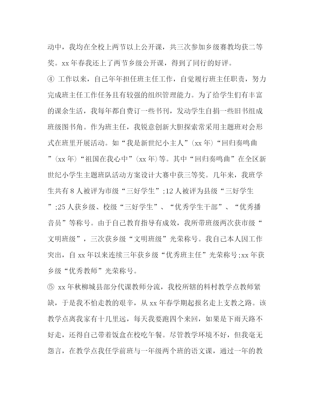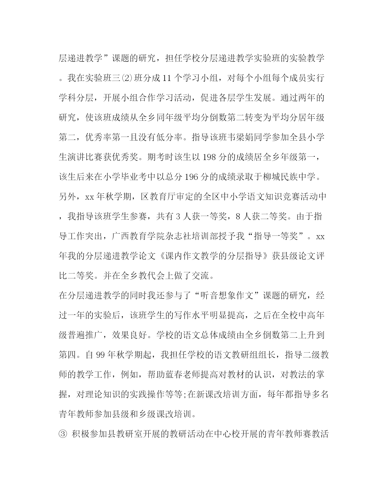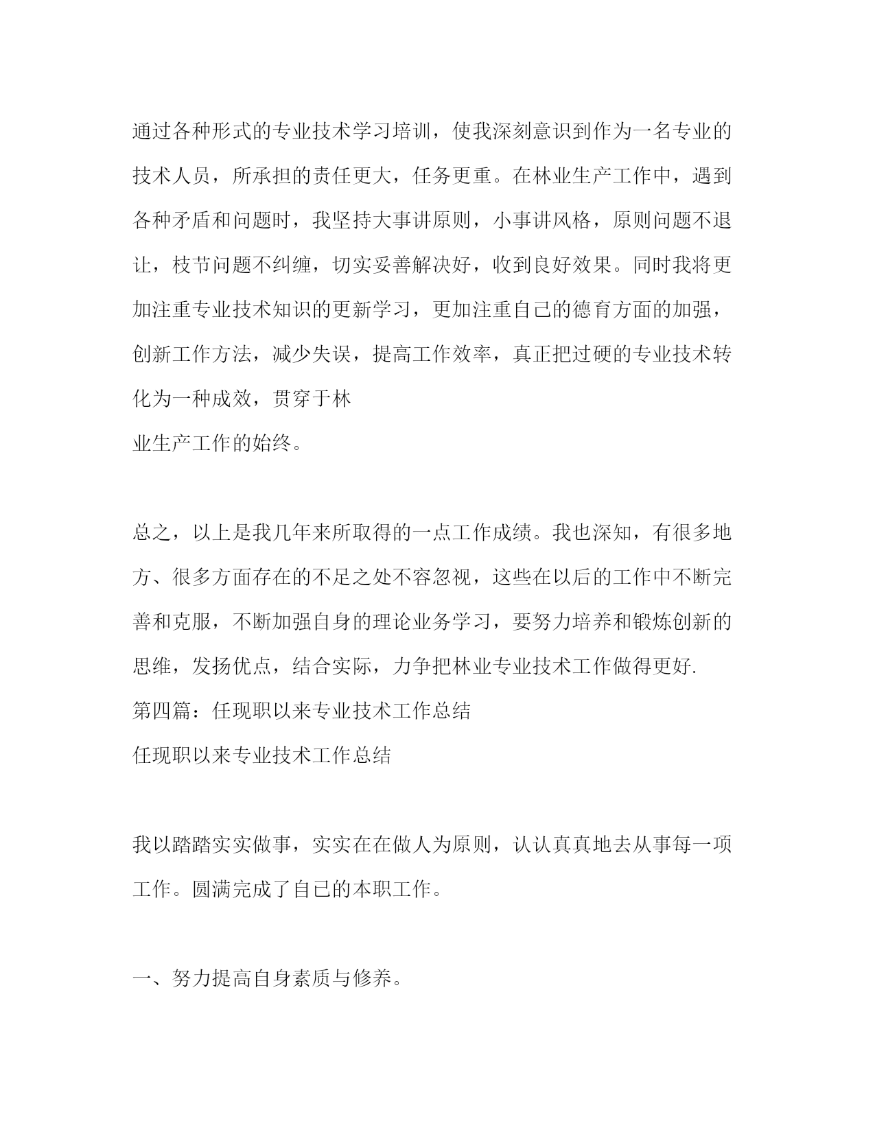 PAGE此资料由网络收集而来,如有侵权请告知上传者立即删除。资料共分享,我们负责传递知识。任现职专业技术工作总结第1篇第2篇第3篇第4篇第5篇更多顶部目录第一篇:任现职以来专业技术工作总结第二篇:任现职以来技术工作总结第三篇:任现职以来专业技术工作总结第四篇:任现职以来专业技术工作总结第五篇:任现职以来专业技术工作总结更多相关范文正文第一篇:任现职以来专业技术工作总结我于一九九七年从柳州师范学校毕业至今,一直在最基层的马山乡大龙小学从事小学语文教学工作。于xx年x月获小学一级教师职称。现将自己任职以来的工作总结如下:①任职以来,自己政治思想表现好。服从领导安排,工作积极肯干,胜任一级教师工作。不断提高自己专业知识水平与业务能力,遵纪守法。年年工作量满,坚持在职进修学习,并于xx年x月通过自学完全部的汉语言文学专科课程,且顺利毕业。业余坚持学习教育理论,每年订阅多种语文教学学术刊物,因此教研水平不断提高。②积极开展教学研究并取得显著成绩。从xx年起,我积极参与“分层递进教学”课题的研究,担任学校分层递进教学实验班的实验教学。我在实验班三(2)班分成11个学习小组,对每个小组每个成员实行学科分层,开展小组合作学习活动,促进各层学生发展。通过两年的研究,使该班成绩从全乡同年级平均分倒数第二转变为平均分居年级第二,优秀率第一且没有低分率。指导该班韦梁娟同学参加全县小学生演讲比赛获优秀奖。期考时该生以198分的成绩居全乡年级第一,该生后来在小学毕业考中以总分196分的成绩录取于柳城民族中学。另外,xx年秋学期,区教育厅审定的全区中小学语文知识竞赛活动中,我指导该班学生参赛,共有3人获一等奖,8人获二等奖。由于指导工作突出,广西教育学院杂志社培训部授予我“指导一等奖”。xx年我的分层递进教学论文《课内作文教学的分层指导》获县级论文评比二等奖。并在全乡教代会上做了交流。在分层递进教学的同时我还参与了“听音想象作文”课题的研究,经过一年的实验后,该班学生的写作水平明显提高,之后在全校中高年级普遍推广,效果良好。学校的语文总体成绩由全乡倒数第二上升到第四。自99年秋学期起,我担任学校的语文教研组组长,指导二级教师的教学工作,例如,帮助蓝春老师提高对教材的认识,对教法的掌握,对理论知识的实践操作等等;在新课改培训方面,每年都指导多名青年教师参加县级和乡级课改培训。③积极参加县教研室开展的教研活动在中心校开展的青年教师赛教活动中,我均在全校上两节以上公开课,共三次参加乡级赛教均获二等奖。xx年春我还上了两节乡级公开课,得到了同行的好评。④工作以来,自己年年担任班主任工作,自觉履行班主任职责,努力完成班主任工作任务且有较强的组织管理能力。为了给学生们有丰富的课余生活,我每年都自费订一些书刊,发动学生自捐一些旧书组成班级图书角。作为班主任,我锐意创新大胆探索常采用主题班对会形式在班里开展活动。如“我是新世纪小主人”(xx年)“回归奏鸣曲”(xx年)“祖国在我心中”(xx年)等。其中“回归奏鸣曲”在全区新世纪小学生主题班队活动方案设计大赛中获三等奖。几年来,我班学生共有8人被评为市级“三好学生”;12人被评为县级“三好学生”;25人获乡级、校级“三好学生”、“优秀学生干部”、“优秀播音员”等称号。由于自己教育指导有成效,我所带班级两次获市级“文明班级”,三次获乡级“文明班级”光荣称号。我自己本人因工作突出,自xx年以来连续三年获乡级“优秀班主任”光荣称号;xx年获乡级“优秀教师”光荣称号。⑤xx年秋柳城县部分代课教师分流,我校所辖的料村教学点教师紧缺,于是我不怕走教的艰辛,从xx年春学期起报名走上支教之路。该教学点离我家有十几里远,每天我要跑四个来回,如果是下雨天路不好走,还得自己带着饭盒在校吃午餐。尽管教学环境不好,但我毫无怨言,在教学点我任学前班与一年级两个班的语文课,通过一年的教学,该教学点一年级语文成绩由原来的平均分倒数第一变成顺数第四。教学效果有了明显提高。例如韦希骏同学原来的语文成绩仅是23分,我任教之后,他的成绩以68分达到了全乡平均水平。⑥作为班主任兼中队辅导员,我主动协助学校少先队大队部做工作。⑦我虚心学习,在高级教师的指导与培养下,业务能力不断提高。胜任了自己的教学工作任务。虽然在我在农村完小学校教学,但我仍关注现代教育信息的更新,及时了解与掌握新的教育方法和手段,及时提高自己的教学水平。课余时间自学计算机的基本知识,懂得一些基本的网上技能,能制作一些简单的课件运用于教学中。第二篇:任现职以来技术工作总结任现职以来的技术工作总结本人于1983年参加工作,长期从事园林建设工程现场施工管理,任职施工员、技术员,项目负责人,副经理.多年来一直从事工程技术工作,现就专业工作总结如下:主持过
