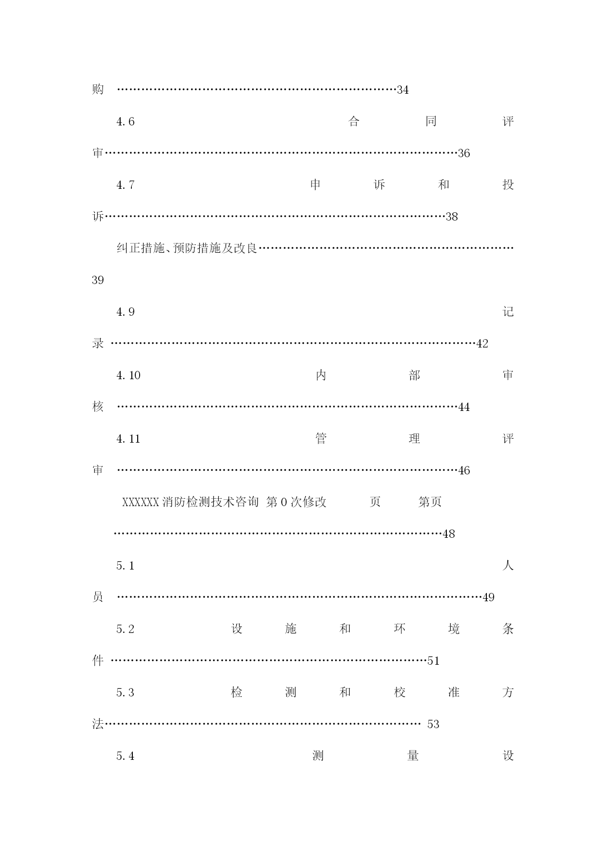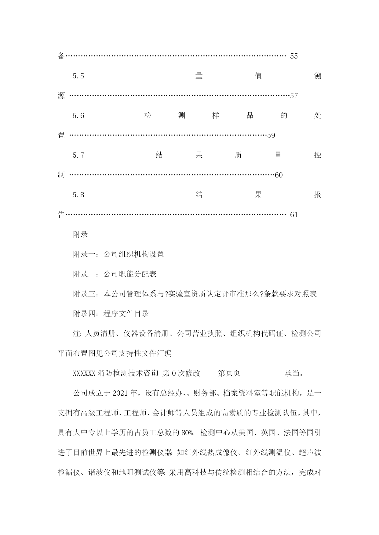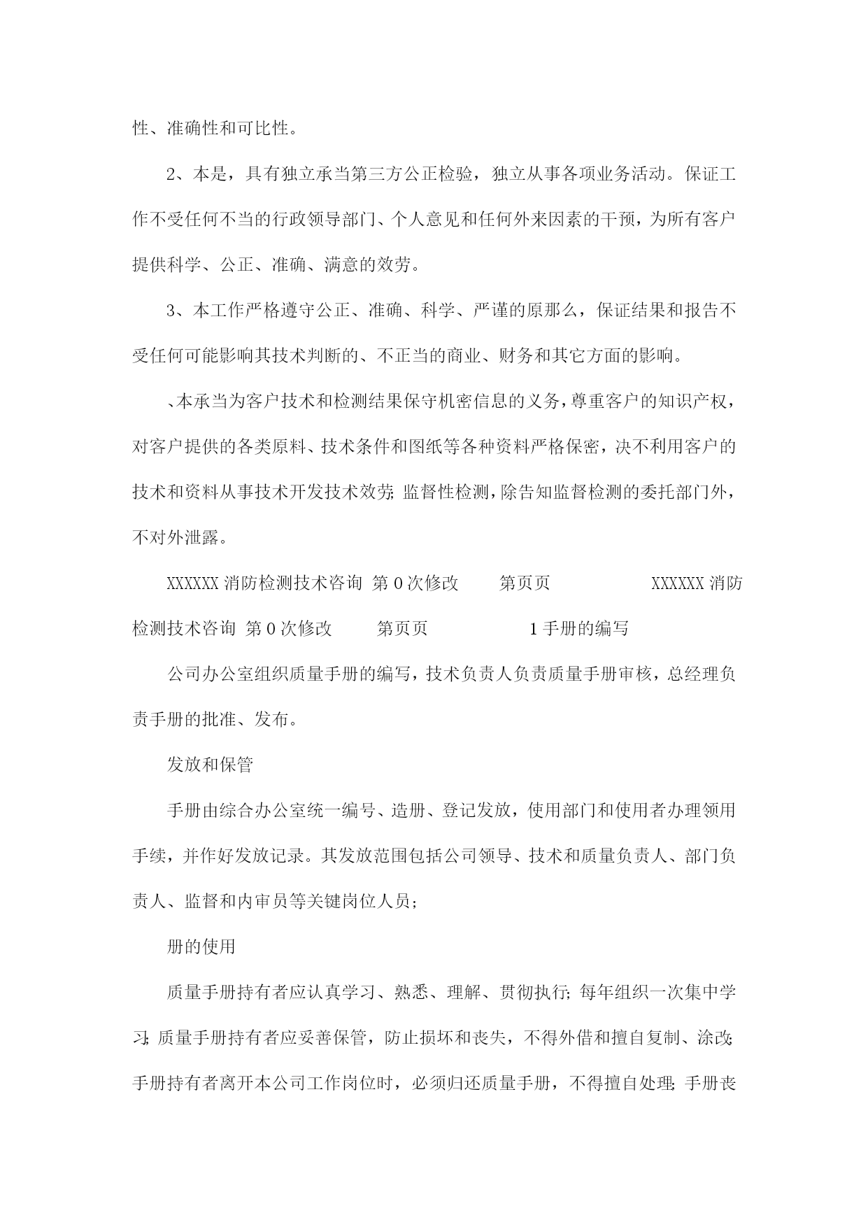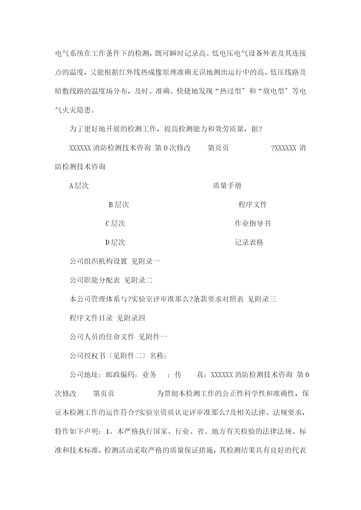 某消防检测技术咨询有限公司质量手册【完整版】(文档可以直接使用,也可根据实际需要修订后使用,可编辑放心下载)某消防检测技术咨询质量手册某消防检测技术咨询质量手册〔XXXX/QM-2021〕版本号:第A/0版编写:计量认证体系编写小组持有人:总页数:62页发布日期:XXXX-XX-XX实施日期:XXXX-XX-XXXXXXXX消防检测技术咨询发布XXXXXX消防检测技术咨询第0次修改第页页XXXXXX消防检测技术咨询XXXXXX消防检测技术咨询第0次修改第页页XXXXXX消防检测技术咨询第0次修改第页页…………………………………………………………………………………1目录…………………………………………………………………………………3第1章概述1.1公司简介……………………………………………………………………………51.2公正性声明及保证措施………………………………………………………………71.3员工行为标准………………………………………………………………………81.4手册管理………………………………………………………………………9第2章质量方针和质量目标……………………………………………………………11第3章引用标准、术语和缩略语……………………………………………………13第4章管理要求………………………………………………………………………154.1组织……………………………………………………………………………164.2管理体系…………………………………………………………………………294.3文件控制…………………………………………………………………………314.4检测分包…………………………………………………………………………334.5效劳和供给品的采购……………………………………………………………344.6合同评审……………………………………………………………………………364.7申诉和投诉…………………………………………………………………………38纠正措施、预防措施及改良………………………………………………………394.9记录………………………………………………………………………………424.10内部审核…………………………………………………………………………444.11管理评审…………………………………………………………………………46XXXXXX消防检测技术咨询第0次修改页第页………………………………………………………………………485.1人员………………………………………………………………………………495.2设施和环境条件……………………………………………………………………515.3检测和校准方法……………………………………………………………………535.4测量设备……………………………………………………………………………555.5量值溯源……………………………………………………………………………575.6检测样品的处置……………………………………………………………………595.7结果质量控制………………………………………………………………………605.8结果报告……………………………………………………………………………61附录附录一:公司组织机构设置附录二:公司职能分配表附录三:本公司管理体系与?实验室资质认定评审准那么?条款要求对照表附录四:程序文件目录注:人员清册、仪器设备清册、公司营业执照、组织机构代码证、检测公司平面布置图见公司支持性文件汇编XXXXXX消防检测技术咨询第0次修改第页页承当。公司成立于2021年,设有总经办、、财务部、档案资料室等职能机构,是一支拥有高级工程师、工程师、会计师等人员组成的高素质的专业检测队伍。其中,具有大中专以上学历的占员工总数的80%。检测中心从美国、英国、法国等国引进了目前世界上最先进的检测仪器:如红外线热成像仪、红外线测温仪、超声波检漏仪、谐波仪和地阻测试仪等;采用高科技与传统检测相结合的方法,完成对电气系统在工作条件下的检测,既可瞬时记录高、低电压电气设备外表及其连接点的温度,又能根据红外线热成像原理准确无误地测出运行中的高、低压线路及暗敷线路的温度场分布,及时、准确、快捷地发现“热过型〞和“放电型〞等电气火灾隐患。为了更好地开展的检测工作,提高检测能力和效劳质量,据?XXXXXX消防检测技术咨询第0次修改第页页?XXXXXX消防检测技术咨询A层次质量手册B层次程序文件C层次作业指导书D层次记录表格公司组织机构设置见附录一公司职能分配表见附录二本公司管理体系与?实验室评审准那么?条款要求对照表见附