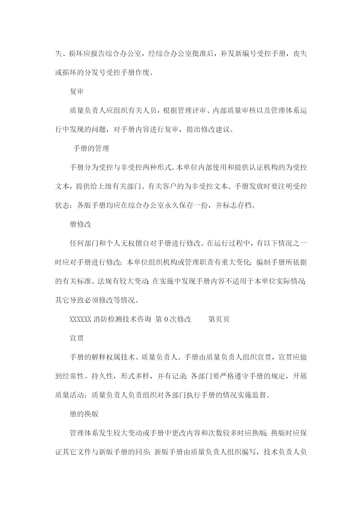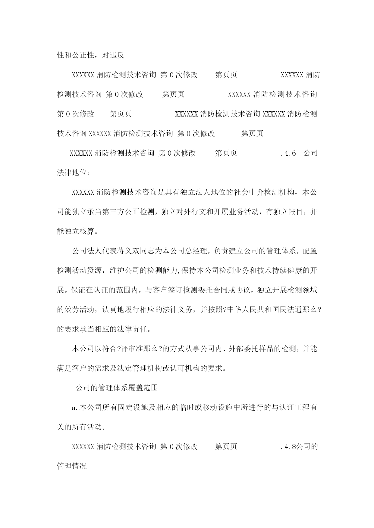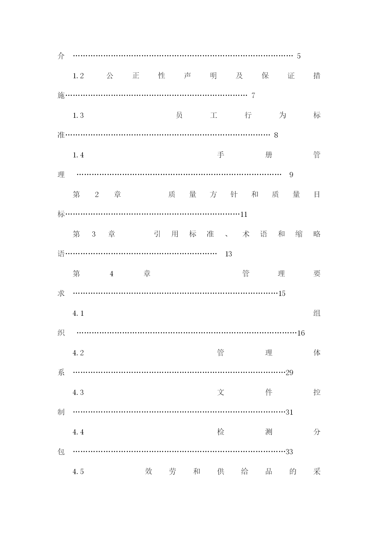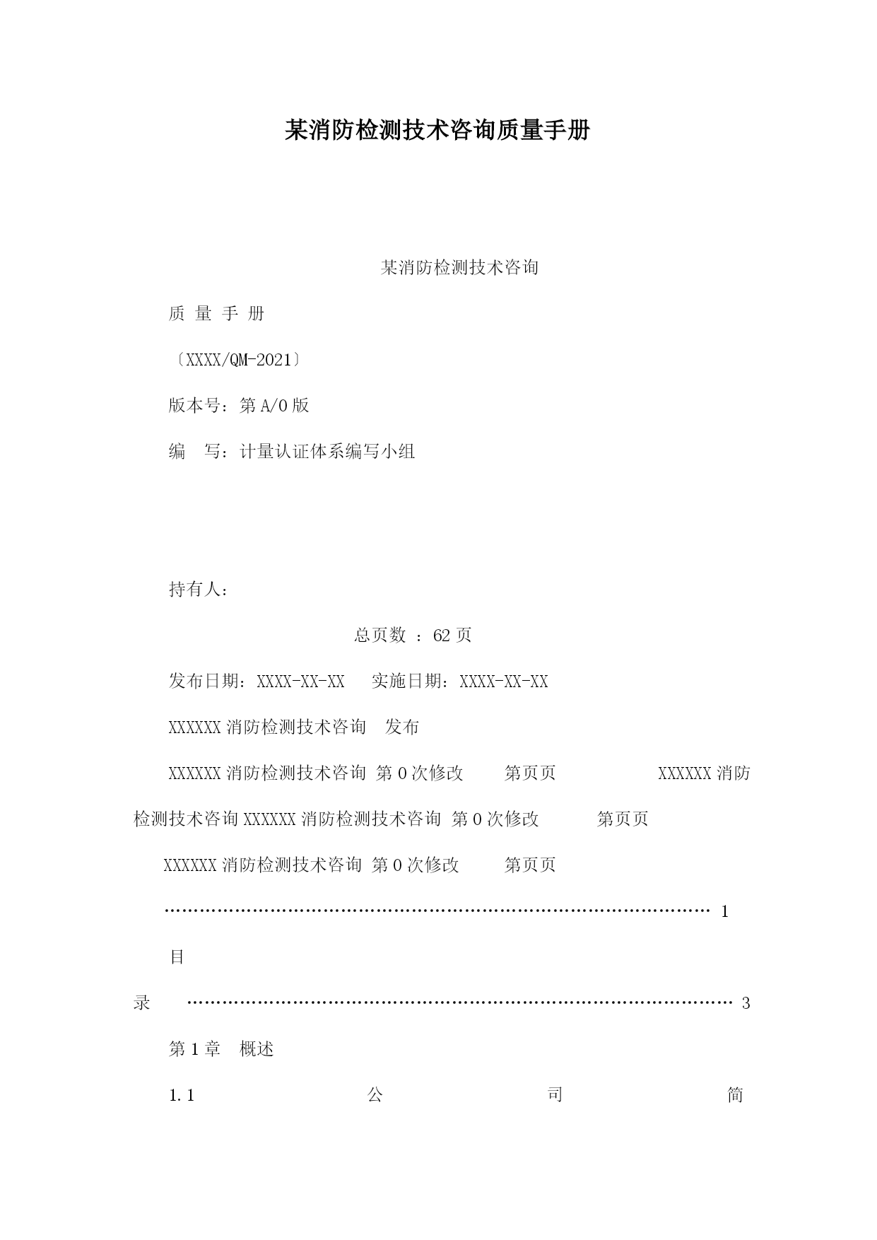 某消防检测技术咨询有限公司质量手册【完整版】(文档可以直接使用,也可根据实际需要修订后使用,可编辑放心下载)某消防检测技术咨询质量手册某消防检测技术咨询质量手册〔XXXX/QM-2021〕版本号:第A/0版编写:计量认证体系编写小组持有人:总页数:62页发布日期:XXXX-XX-XX实施日期:XXXX-XX-XXXXXXXX消防检测技术咨询发布XXXXXX消防检测技术咨询第0次修改第页页XXXXXX消防检测技术咨询XXXXXX消防检测技术咨询第0次修改第页页XXXXXX消防检测技术咨询第0次修改第页页…………………………………………………………………………………1目录…………………………………………………………………………………3第1章概述1.1公司简介……………………………………………………………………………51.2公正性声明及保证措施………………………………………………………………71.3员工行为标准………………………………………………………………………81.4手册管理………………………………………………………………………9第2章质量方针和质量目标……………………………………………………………11第3章引用标准、术语和缩略语……………………………………………………13第4章管理要求………………………………………………………………………154.1组织……………………………………………………………………………164.2管理体系…………………………………………………………………………294.3文件控制…………………………………………………………………………314.4检测分包…………………………………………………………………………334.5效劳和供给品的采购……………………………………………………………344.6合同评审……………………………………………………………………………364.7申诉和投诉…………………………………………………………………………38纠正措施、预防措施及改良………………………………………………………394.9记录………………………………………………………………………………424.10内部审核…………………………………………………………………………444.11管理评审…………………………………………………………………………46XXXXXX消防检测技术咨询第0次修改页第页………………………………………………………………………485.1人员………………………………………………………………………………495.2设施和环境条件……………………………………………………………………515.3检测和校准方法……………………………………………………………………535.4测量设备……………………………………………………………………………555.5量值溯源……………………………………………………………………………575.6检测样品的处置……………………………………………………………………595.7结果质量控制………………………………………………………………………605.8结果报告……………………………………………………………………………61附录附录一:公司组织机构设置附录二:公司职能分配表附录三:本公司管理体系与?实验室资质认定评审准那么?条款要求对照表附录四:程序文件目录注:人员清册、仪器设备清册、公司营业执照、组织机构代码证、检测公司平面布置图见公司支持性文件汇编XXXXXX消防检测技术咨询第0次修改第页页承当。公司成立于2021年,设有总经办、、财务部、档案资料室等职能机构,是一支拥有高级工程师、工程师、会计师等人员组成的高素质的专业检测队伍。其中,具有大中专以上学历的占员工总数的80%。检测中心从美国、英国、法国等国引进了目前世界上最先进的检测仪器:如红外线热成像仪、红外线测温仪、超声波检漏仪、谐波仪和地阻测试仪等;采用高科技与传统检测相结合的方法,完成对电气系统在工作条件下的检测,既可瞬时记录高、低电压电气设备外表及其连接点的温度,又能根据红外线热成像原理准确无误地测出运行中的高、低压线路及暗敷线路的温度场分布,及时、准确、快捷地发现“热过型〞和“放电型〞等电气火灾隐患。为了更好地开展的检测工作,提高检测能力和效劳质量,据?XXXXXX消防检测技术咨询第0次修改第页页?XXXXXX消防检测技术咨询A层次质量手册B层次程序文件C层次作业指导书D层次记录表格公司组织机构设置见附录一公司职能分配表见附录二本公司管理体系与?实验室评审准那么?条款要求对照表见附
