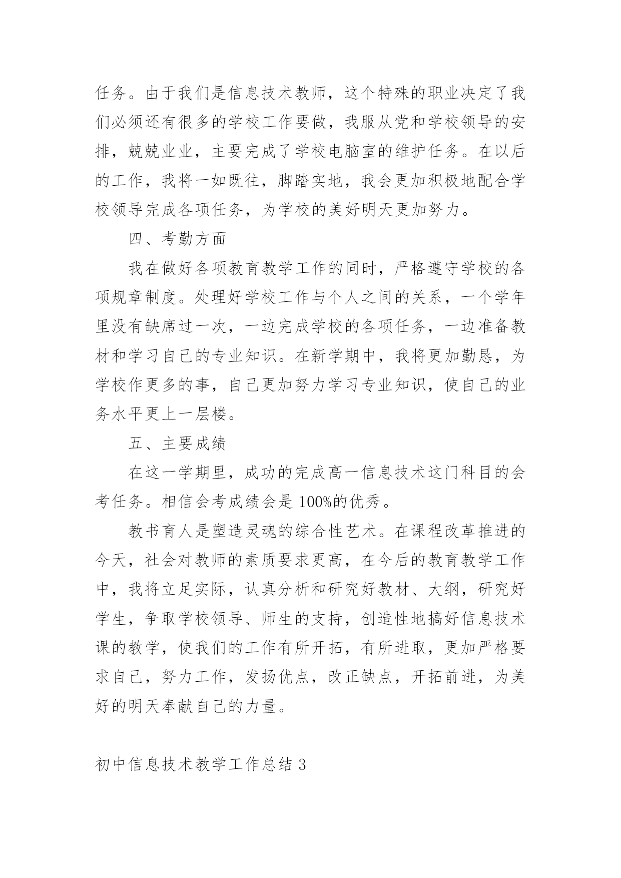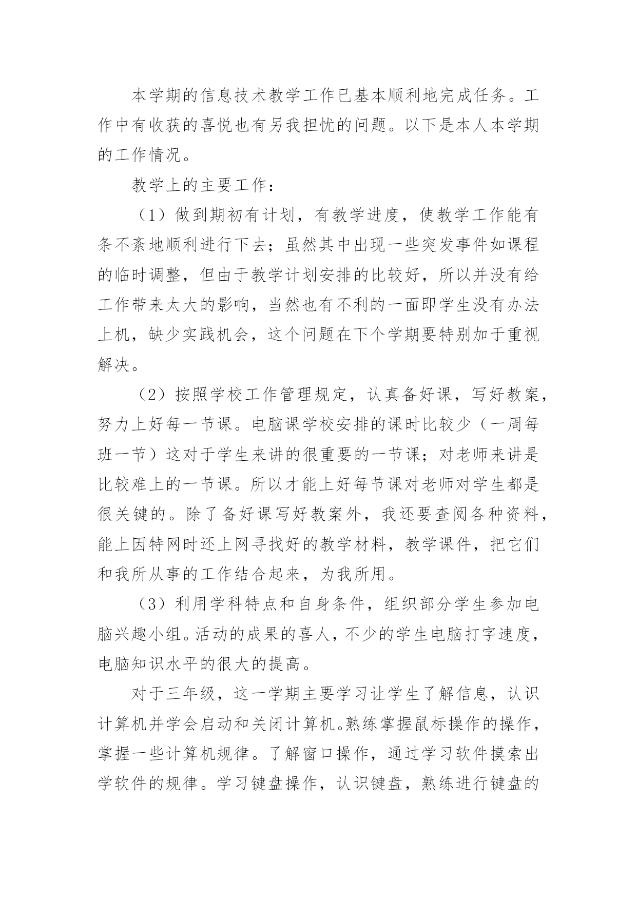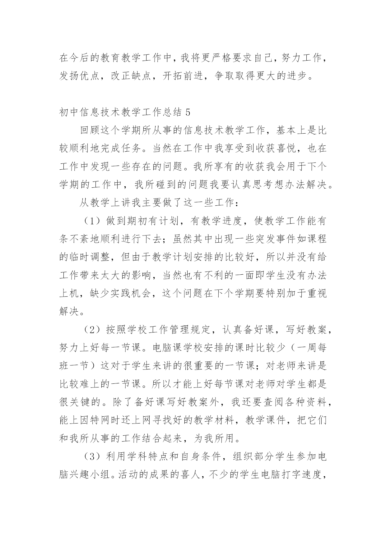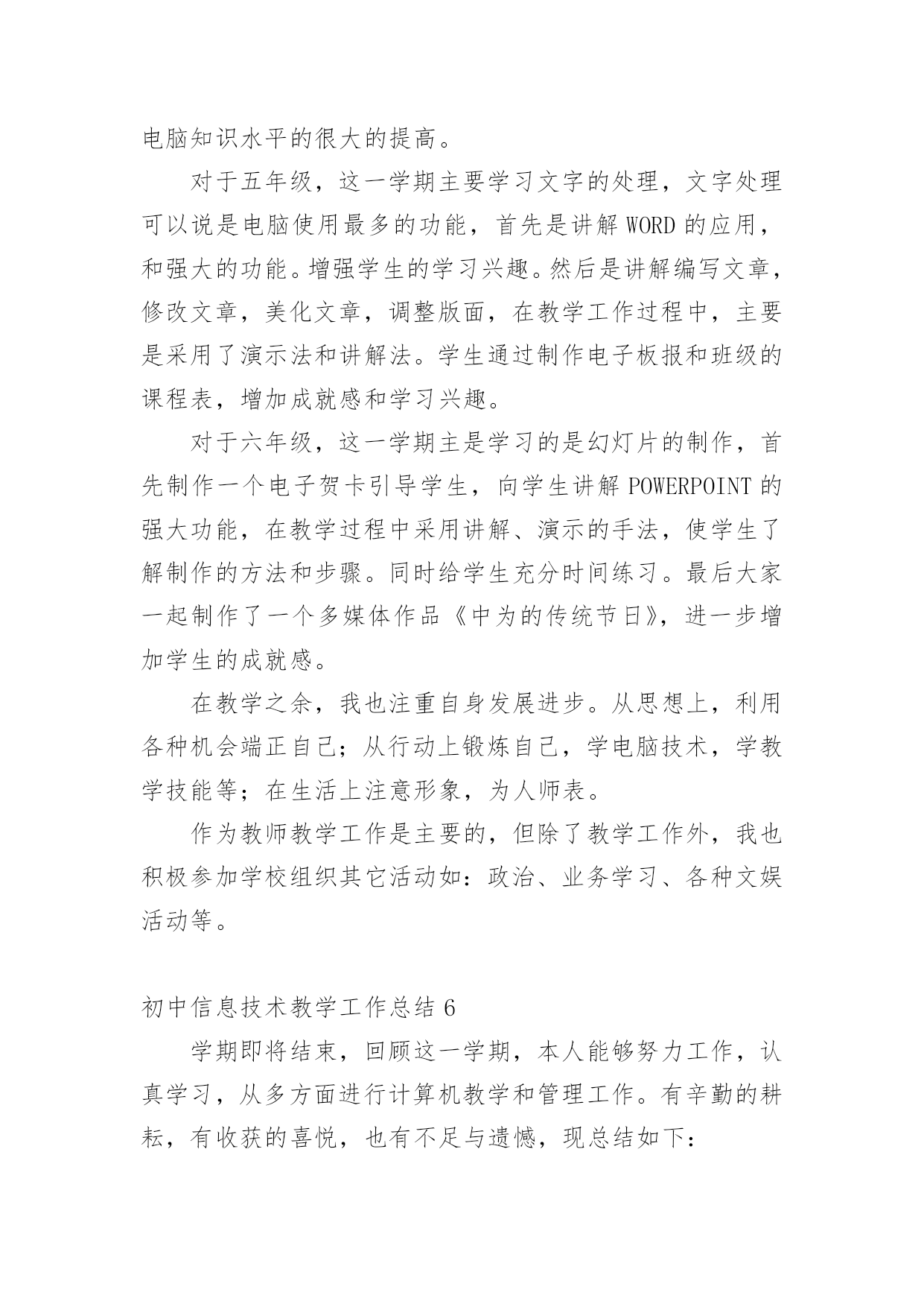 初中信息技术教学工作总结总结就是把一个时间段取得的成绩、存在的问题及得到的经验和教训进行一次全面系统的总结的书面材料,它可使零星的、肤浅的、表面的感性认知上升到全面的、系统的、本质的理性认识上来,因此好好准备一份总结吧。那么你知道总结如何写吗?下面是小编为大家收集的初中信息技术教学工作总结,欢迎阅读,希望大家能够喜欢。初中信息技术教学工作总结1本学期我担任八年级810、812、813、802、815、816、817、818,9个班信息技术教学工作,尽管不是主课,但教学工作上不敢怠慢,从各方面严格要求自己,积极向老教师请教,结合本校的实际条件和学生的实际情况,勤勤恳恳,兢兢业业,使教学工作有计划,有组织,有步骤地开展。并且帮助教导处统计早午读各班成绩,以及和我们科组共同完成全校的成绩统计。现对本学期教学工作作出总结,希望能发扬优点,克服不足,总结检验教训,以便促进教学工作更上一层楼。一、认真备课,不但备学生而且备教材备教法,根据教材内容及学生的实际,设计课的类型,拟定采用的教学方法,并对教学过程的程序及时间安排都作了详细的记录,认真写好教案。每一课都做到“有备而来”,每堂课都在课前做好充分的准备,并制作各种利于吸引学生注意力的有趣教具,课后及时对该课作出总结,写好教学后记,并认真按搜集每课书的知识要点,归纳成集。二、增强上课技能,提高教学质量,使讲解清晰化,条理化,生动化,做到线索清晰,层次分明,深入浅出。在课堂上特别注意调动学生的积极性,加强师生交流,充分体现学生的主作用,让学生学得容易,学得轻松,学得愉快;注意精讲精练,在课堂上老师讲得尽量少,学生动口动手动脑尽量多;同时在每一堂课上都充分考虑每一个层次的学生学习需求和学习能力,让各个层次的学生都得到提高。三、虚心请教其他老师。在教学上,有疑必问。在各个章节的学习上都积极征求其他老师的意见,学习他们的方法,同时,多听老师的课,做到边听边讲,学习别人的优点,克服自己的不足,并常常邀请其他老师来听课,征求他们的意见,改进工作。四、积极推进素质教育。目前的考试模式仍然比较传统,这决定了教师的教学模式要停留在应试教育的层次上,为此,我在教学工作中注意了学生能力的培养,把传受知识、技能和发展智力、能力结合起来,在知识层面上注入了思想情感教育的因素,发挥学生的创新意识和创新能力。让学生的各种素质都得到有效的发展和培养。存在的不足是,学生的知识结构还不是很完整,不系统,再加上学生们年纪小,自律能力不是太好,所以在抓纪律方面下了不少功夫,相对来讲预先预备的教学内容的进行有一定的难度,这些都有待以后改进。初中信息技术教学工作总结2一、思想认识我在思想上严于律己,热爱党的教育事业,全面贯彻党的教育方针,以党员的要求严格要求自己,鞭策自己,力争思想上和工作上在同事、学生的心目中都树立起榜样的作用,二、教学工作在教学工作方面,整学期的教学任务都非常重,独自一人担任高中8个班级的信息技术课,一周课时高达17节,但不管怎样,为了把自己的教学水平提高,我坚持经常看电脑报、信息技术奥赛书籍等,还经常网上找一些优秀的教案课件学习,还争取机会多出外听课,从中学习别人的长处,领悟其中的教学艺术。平时还虚心请教有经验的老师。在备课过程中认真分析教材,根据教材的特点及学生的实际情况设计教案。一学期来,认真备课、上课、听课、评课,及时批改作业、讲评作业,做好课后辅导工作,广泛涉猎各种知识,形成比较完整的知识结构,严格要求学生,尊重学生,发扬教学民主,使学生学有所得,不断提高,从而不断提高自己的教学水平和思想觉悟,并顺利完成教育教学任务。这学年我还一个人承担了高一信息技术选修课程《asp网页制作》和《数据库管理》课题。我查阅了很多的书籍和资料;三、学校工作我严格要求自己,工作实干,并能完成学校给予的各项任务。由于我们是信息技术教师,这个特殊的职业决定了我们必须还有很多的学校工作要做,我服从党和学校领导的安排,兢兢业业,主要完成了学校电脑室的维护任务。在以后的工作,我将一如既往,脚踏实地,我会更加积极地配合学校领导完成各项任务,为学校的美好明天更加努力。四、考勤方面我在做好各项教育教学工作的同时,严格遵守学校的各项规章制度。处理好学校工作与个人之间的关系,一个学年里没有缺席过一次,一边完成学校的各项任务,一边准备教材和学习自己的专业知识。在新学期中,我将更加勤恳,为学校作更多的事,自己更加努力学习专业知识,使自己的业务水平更上一层楼。五、主要成绩在这一学期里,成功的完成高一信息技术这门科目的会考任务。相信会考成绩会是100%的优秀。教书育人是塑造灵魂的综合性艺术。在课程改革推进的今天,社会对教师的素质要求更高,在今后的教育教学工作中,我将立足实际,认真分析和研究好教材、大纲,研究好学生,争取学校领导、师生的支持,创造性