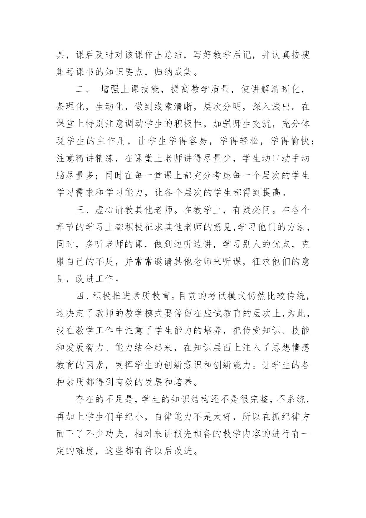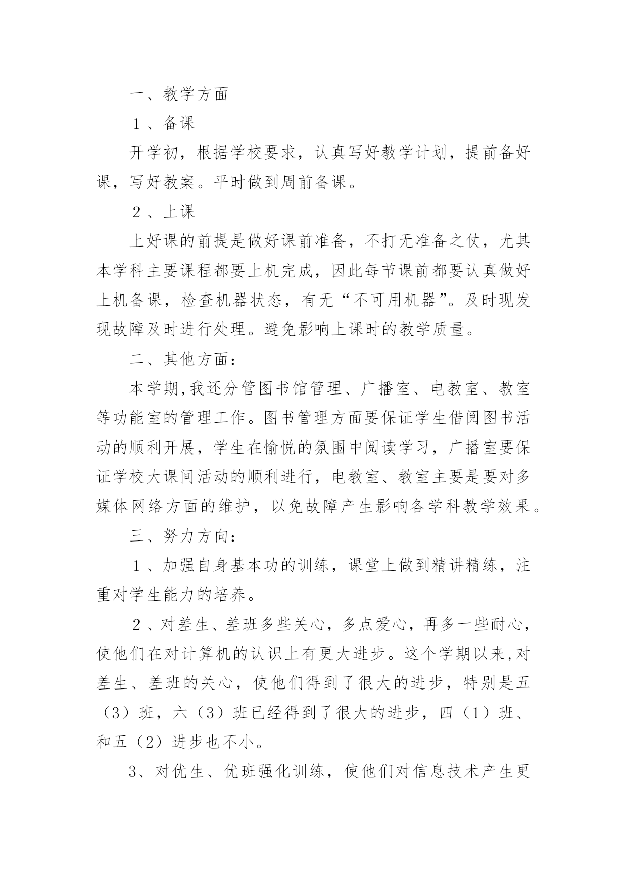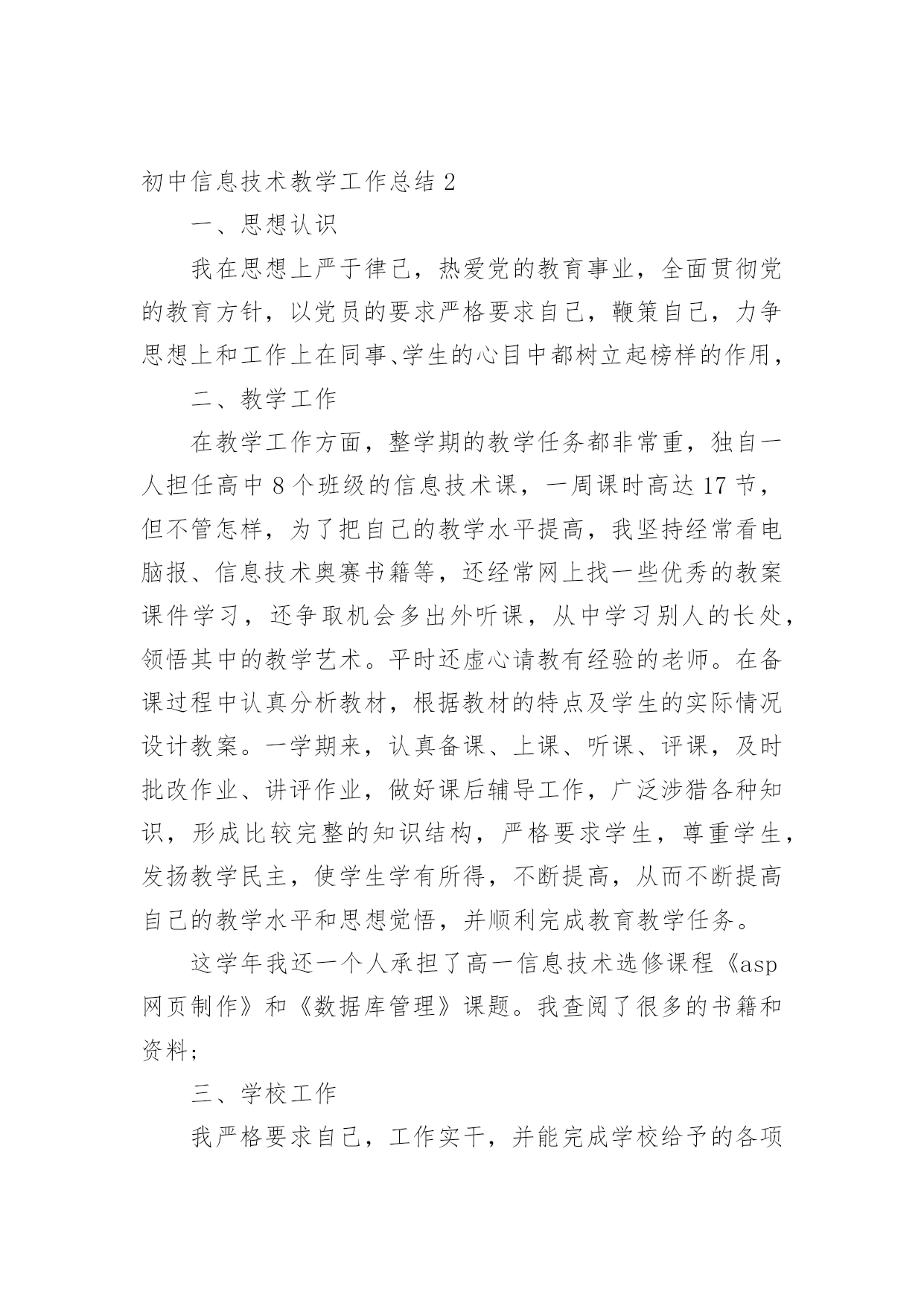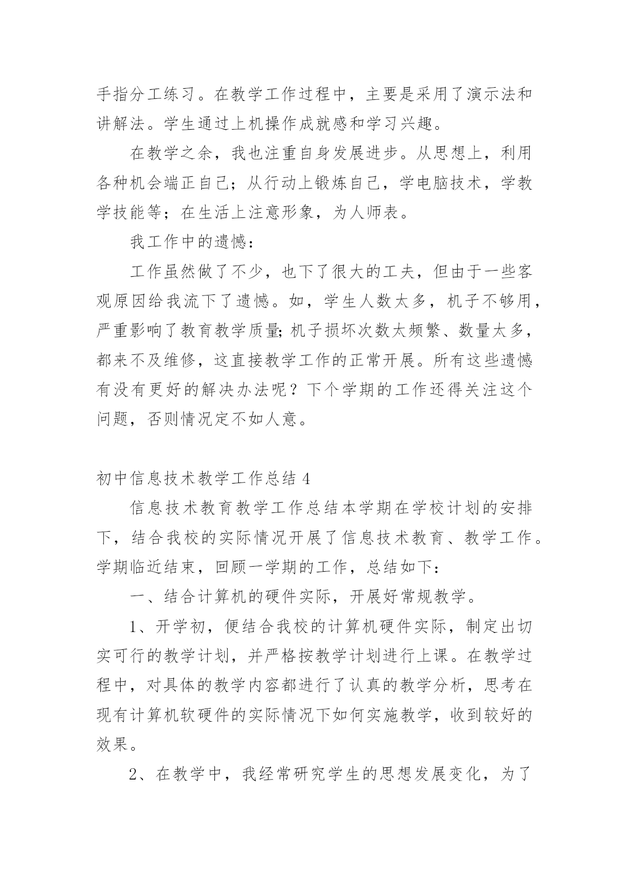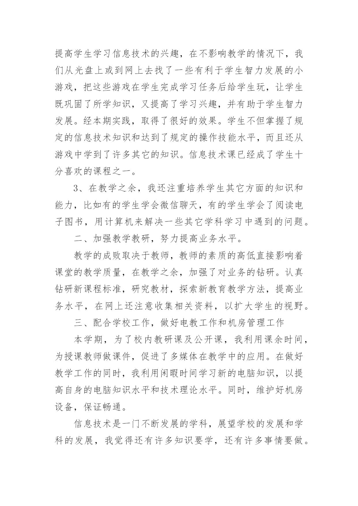 初中信息技术教学工作总结总结就是把一个时间段取得的成绩、存在的问题及得到的经验和教训进行一次全面系统的总结的书面材料,它可使零星的、肤浅的、表面的感性认知上升到全面的、系统的、本质的理性认识上来,因此好好准备一份总结吧。那么你知道总结如何写吗?下面是小编为大家收集的初中信息技术教学工作总结,欢迎阅读,希望大家能够喜欢。初中信息技术教学工作总结1本学期我担任八年级810、812、813、802、815、816、817、818,9个班信息技术教学工作,尽管不是主课,但教学工作上不敢怠慢,从各方面严格要求自己,积极向老教师请教,结合本校的实际条件和学生的实际情况,勤勤恳恳,兢兢业业,使教学工作有计划,有组织,有步骤地开展。并且帮助教导处统计早午读各班成绩,以及和我们科组共同完成全校的成绩统计。现对本学期教学工作作出总结,希望能发扬优点,克服不足,总结检验教训,以便促进教学工作更上一层楼。一、认真备课,不但备学生而且备教材备教法,根据教材内容及学生的实际,设计课的类型,拟定采用的教学方法,并对教学过程的程序及时间安排都作了详细的记录,认真写好教案。每一课都做到“有备而来”,每堂课都在课前做好充分的准备,并制作各种利于吸引学生注意力的有趣教具,课后及时对该课作出总结,写好教学后记,并认真按搜集每课书的知识要点,归纳成集。二、增强上课技能,提高教学质量,使讲解清晰化,条理化,生动化,做到线索清晰,层次分明,深入浅出。在课堂上特别注意调动学生的积极性,加强师生交流,充分体现学生的主作用,让学生学得容易,学得轻松,学得愉快;注意精讲精练,在课堂上老师讲得尽量少,学生动口动手动脑尽量多;同时在每一堂课上都充分考虑每一个层次的学生学习需求和学习能力,让各个层次的学生都得到提高。三、虚心请教其他老师。在教学上,有疑必问。在各个章节的学习上都积极征求其他老师的意见,学习他们的方法,同时,多听老师的课,做到边听边讲,学习别人的优点,克服自己的不足,并常常邀请其他老师来听课,征求他们的意见,改进工作。四、积极推进素质教育。目前的考试模式仍然比较传统,这决定了教师的教学模式要停留在应试教育的层次上,为此,我在教学工作中注意了学生能力的培养,把传受知识、技能和发展智力、能力结合起来,在知识层面上注入了思想情感教育的因素,发挥学生的创新意识和创新能力。让学生的各种素质都得到有效的发展和培养。存在的不足是,学生的知识结构还不是很完整,不系统,再加上学生们年纪小,自律能力不是太好,所以在抓纪律方面下了不少功夫,相对来讲预先预备的教学内容的进行有一定的难度,这些都有待以后改进。初中信息技术教学工作总结2一、思想认识我在思想上严于律己,热爱党的教育事业,全面贯彻党的教育方针,以党员的要求严格要求自己,鞭策自己,力争思想上和工作上在同事、学生的心目中都树立起榜样的作用,二、教学工作在教学工作方面,整学期的教学任务都非常重,独自一人担任高中8个班级的信息技术课,一周课时高达17节,但不管怎样,为了把自己的教学水平提高,我坚持经常看电脑报、信息技术奥赛书籍等,还经常网上找一些优秀的教案课件学习,还争取机会多出外听课,从中学习别人的长处,领悟其中的教学艺术。平时还虚心请教有经验的老师。在备课过程中认真分析教材,根据教材的特点及学生的实际情况设计教案。一学期来,认真备课、上课、听课、评课,及时批改作业、讲评作业,做好课后辅导工作,广泛涉猎各种知识,形成比较完整的知识结构,严格要求学生,尊重学生,发扬教学民主,使学生学有所得,不断提高,从而不断提高自己的教学水平和思想觉悟,并顺利完成教育教学任务。这学年我还一个人承担了高一信息技术选修课程《asp网页制作》和《数据库管理》课题。我查阅了很多的书籍和资料;三、学校工作我严格要求自己,工作实干,并能完成学校给予的各项任务。由于我们是信息技术教师,这个特殊的职业决定了我们必须还有很多的学校工作要做,我服从党和学校领导的安排,兢兢业业,主要完成了学校电脑室的维护任务。在以后的工作,我将一如既往,脚踏实地,我会更加积极地配合学校领导完成各项任务,为学校的美好明天更加努力。四、考勤方面我在做好各项教育教学工作的同时,严格遵守学校的各项规章制度。处理好学校工作与个人之间的关系,一个学年里没有缺席过一次,一边完成学校的各项任务,一边准备教材和学习自己的专业知识。在新学期中,我将更加勤恳,为学校作更多的事,自己更加努力学习专业知识,使自己的业务水平更上一层楼。五、主要成绩在这一学期里,成功的完成高一信息技术这门科目的会考任务。相信会考成绩会是100%的优秀。教书育人是塑造灵魂的综合性艺术。在课程改革推进的今天,社会对教师的素质要求更高,在今后的教育教学工作中,我将立足实际,认真分析和研究好教材、大纲,研究好学生,争取学校领导、师生的支持,创造性