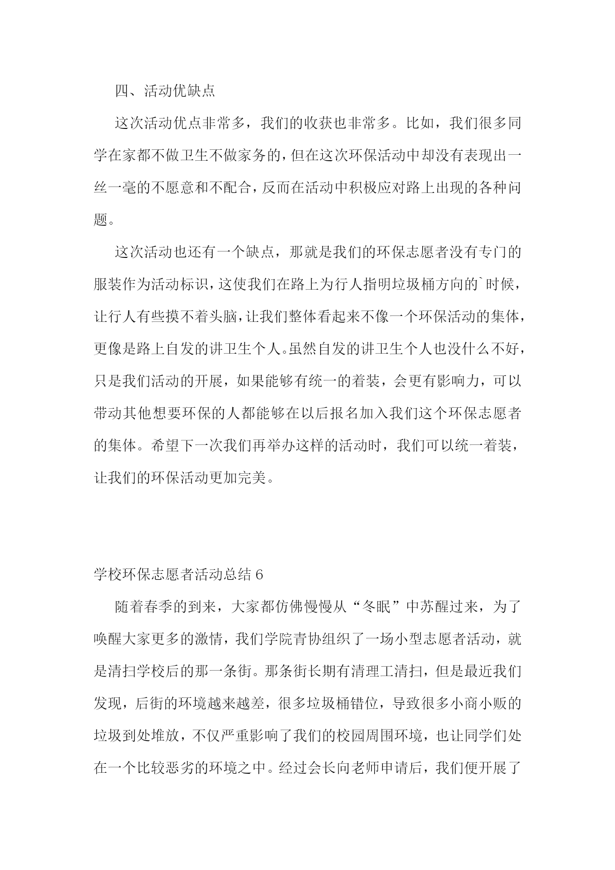学校环保志愿者活动总结学校环保志愿者活动总结1我们环保志愿者协会在学校的组织下,在向外交流、工作当中,得到了广泛的肯定,并且得到了xx市环保局的积极指导,使得环保志愿者协会的所有会员以及部分师生得到了深刻的环保知识概念。xx局长在本次讲座中指出,谁能掌握环保知识,谁能重视环保资源,谁就能可持续发展。他进一步提出,大学生要时刻关注环保,因为我们的工作,学习其实都与环保息息相关。我们要高度重视环保的一切事项。xx局长对我们寸金新校区感慨良多,强调说了在这样的环境学习,不错。这是对我们学校环保的肯定。本次活动得益于学校领导的重视,在传达本次讲座的信息途径当中,可以看出,学校对环保事业相当重视,这是我们环保志愿者的一份感激。讲座进行较顺利,洪局长幽默而不失严谨的讲话,令会场响起阵阵掌声。因为我们协会是第一次举行此类讲座,所以在讲座也出现了一些问题———进场的’参与者和协会会员部分没能准时出席,对讲座的进行过程有一定影响。我们都相信,这次讲座的不足,听取各方意见,我们会在下一次做得更好的。xx环保协会将会做得更出色的。学校环保志愿者活动总结2为了使青年学生成长成才和社会环保事业发展紧密结合,突出“立足校园,面向社会”的优势,践行着构建和谐校园,投身生态保护的社会实践。以增强环保意识,服务环保事业,开展环保公益活动,我系组织了青年志愿者15人和共青团员20人,以“青春添绿色奉献筑和谐”为口号参加了xx江大学生生态环保绿化活动。现将活动总结如下:一、对白色污染说不,扫除白色障碍xx江是xx人民的母亲河,保护母亲河是全体公民的共同心愿,也是时代赋予青年义不容辞的职责。随着春季的到来,到xx江出游的人们不断增加,很多人对环境保护意识薄弱,使得xx江河畔和河面不同程度受到污染,水面漂浮物随处可见。在xx江河畔大家以昂扬的姿态投身到保护母亲河的实践中来,清除河畔白色垃圾和打捞1000米范围内河道的漂浮物,为母亲河的亮丽作出贡献。对白色污染说不,扫除白色障碍,为“和谐型、环保型、节约型、绿色型”家园建设贡献着自己的力量。这次活动,使我们不仅了解了环境的薄弱环节,而且加深了环保理念,进一步增强服务环保事业的’信心和决心。二、宣传生态环境道德,规范人与自然关系当天出游的团体占一定比例,大家对青少年开展生态环保实践教育,让他们从小养成保护生态环境的良好习惯。大力倡导人与自然和谐发展的生态文明理念,全力打造“保护母亲河”生态环保品牌,在全社会进一步形成关爱母亲河,保护生态环境的良好氛围。大力培育生态文化,弘扬“人与自然和谐与共”和“节约资源、抵制污染、保护环境、共建和谐”的核心理念,积极促进全社会特别是青少年群体为生态环境建设做出应有的贡献。三、今后工作方向我系青协站在今后的工作中希望与院各系协调合作根据水资源现状,积极开展丰富的生态体验活动,为保护生命水源献计献策。参与城市水系的绿化美化、水体清洁等工作,增强节水、护水意识,树立生态道德的观念,树立环保消费的意识。在旅游景区树立“文明出行、环保旅游”的意识,在旅游中爱护景区一草一木,积极参加捡拾景区白色垃圾、打捞水面漂浮物等生态环保实践活动,亲近母亲河、亲近大自然,倡导生态文明、环保健康的旅游理念,在全社会大力营造“人与自然和谐发展”的良好氛围。建议:为大力宣传保护母亲河的意义,让更多的人接受绿色文明的理念,更好地关注身边的生态平衡,主动爱护优美的生存环境,我们倡议:各界人士都积极参与到“保护母亲河”行动中来!生态环境是人类赖以生存和发展的基本条件,保护母亲河就是保护我们自己。青年朋友们,让我们携起手来,为“天更蓝、水更清”,为人与自然的和谐与共,为生活更加美好、社会更加和谐做出我们应有的贡献。在这次活动中,同学们都发扬了不怕脏不怕苦不怕累的奉献精神,共同推动全民环境意识的提高,推进环保事业发展受到了社会各界的认可和一致好评,并取得了很好的成效。学校环保志愿者活动总结3一、活动时间20xx年x月x日全天二、活动地点学校后面湘江流域,看当天劳动情况决定范围。三、活动目的首先让我们赖以生存的湘江恢复到原貌,彻底的清洁水源,让其重现往昔的光彩,最少也要让肉眼所见的垃圾,全部消失殆尽。其次,尽可能的带动市民加入进来,这样我们的劳动力才够,就算不能让他们加入,至少也要让他们乱丢乱扔的陋习彻底改掉,这才是从根源上切断了湘江河流垃圾的的产生。四、活动内容仅派出三名成员到城市中心,往四周扩散式宣传这次活动,呼吁大家一起加入到本次志愿者活动当中来,以传单还有口头喊叫的方式来宣传。时间仅为一个上午,无论他们有没有找到人来帮忙,都要归队一起进行清理。其余成员从早上吃完早餐开始,就直奔湘江而去,首先先分好组:1、垃圾捡拾组:十个人两两分成小组,最好是一男一女,一个