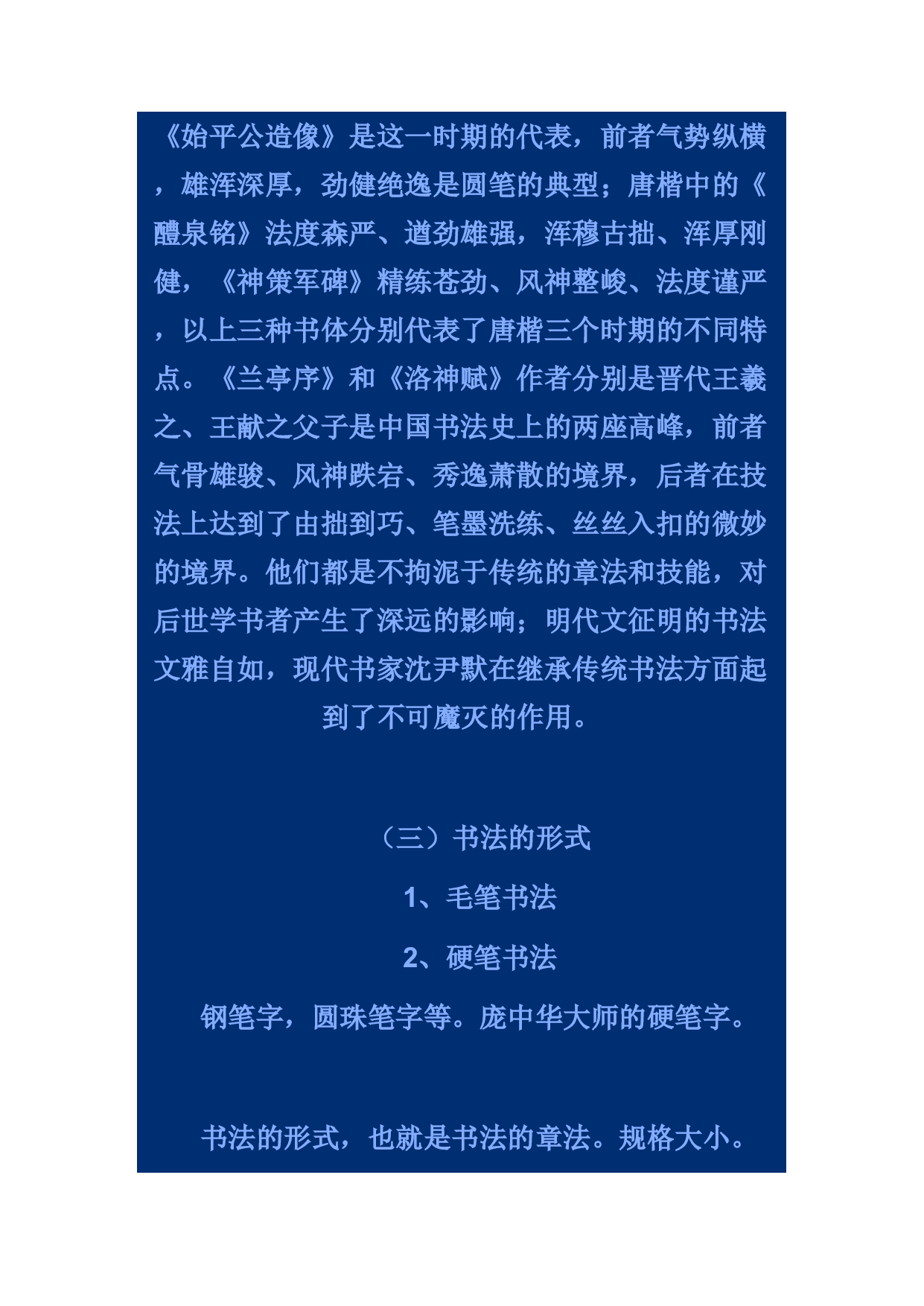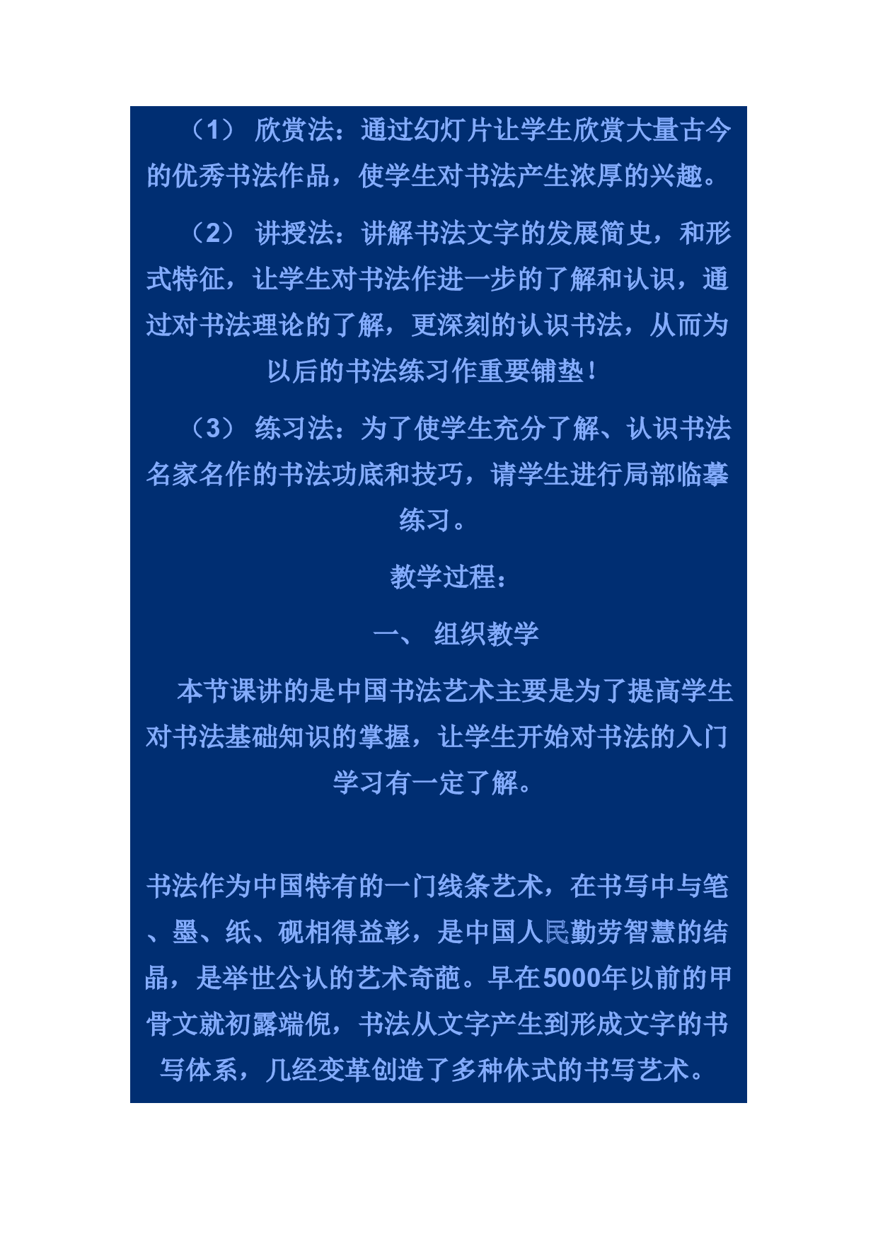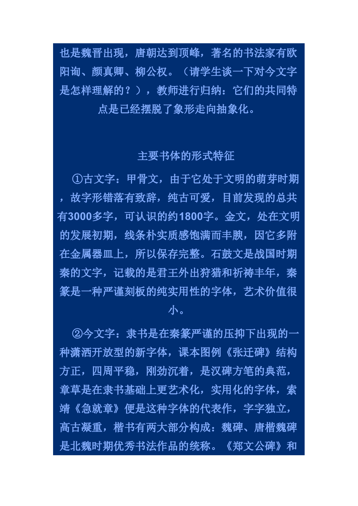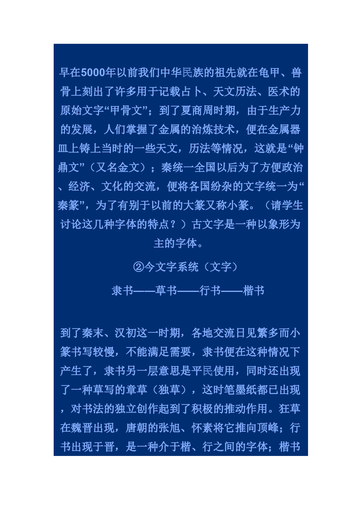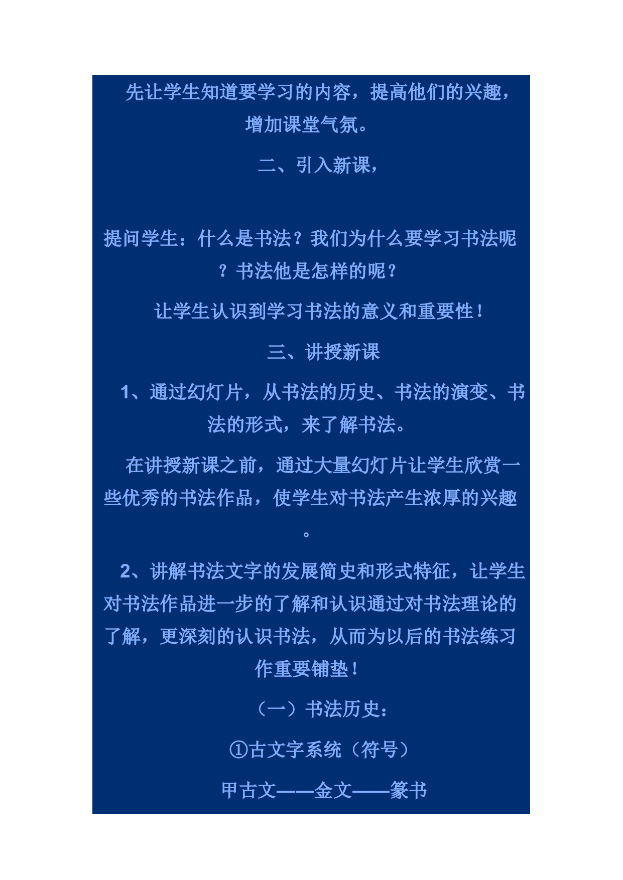 教学目标:1、使学生了解书法的发展史概况和特点,及书法的分类和形式的总体情况,培养学生书法修养。2、欣赏代表作品,获得如何对书法作品的知识,并能作简单的书法练习。3、对中国传统文化的进一步了解。教学重点与难点:1、教学重点:了解中国书法的基础知识,掌握其基本特点,进行大量的书法练习。2、教学难点:如何感受、认识书法作品中的线条美、结构美、气韵美。教具准备:毛笔,钢笔,书写纸等,资料。课时:一课时教学方法:要让学生在教学过程中有所收获,并达到一定的教学目标,在本节课的教学中,我将采用欣赏法、讲授法、练习法来设计本节课。(1)欣赏法:通过幻灯片让学生欣赏大量古今的优秀书法作品,使学生对书法产生浓厚的兴趣。(2)讲授法:讲解书法文字的发展简史,和形式特征,让学生对书法作进一步的了解和认识,通过对书法理论的了解,更深刻的认识书法,从而为以后的书法练习作重要铺垫!(3)练习法:为了使学生充分了解、认识书法名家名作的书法功底和技巧,请学生进行局部临摹练习。教学过程:一、组织教学本节课讲的是中国书法艺术主要是为了提高学生对书法基础知识的掌握,让学生开始对书法的入门学习有一定了解。书法作为中国特有的一门线条艺术,在书写中与笔、墨、纸、砚相得益彰,是中国人民勤劳智慧的结晶,是举世公认的艺术奇葩。早在5000年以前的甲骨文就初露端倪,书法从文字产生到形成文字的书写体系,几经变革创造了多种休式的书写艺术。先让学生知道要学习的内容,提高他们的兴趣,增加课堂气氛。二、引入新课,提问学生:什么是书法?我们为什么要学习书法呢?书法他是怎样的呢?让学生认识到学习书法的意义和重要性!三、讲授新课1、通过幻灯片,从书法的历史、书法的演变、书法的形式,来了解书法。在讲授新课之前,通过大量幻灯片让学生欣赏一些优秀的书法作品,使学生对书法产生浓厚的兴趣。2、讲解书法文字的发展简史和形式特征,让学生对书法作品进一步的了解和认识通过对书法理论的了解,更深刻的认识书法,从而为以后的书法练习作重要铺垫!(一)书法历史:①古文字系统(符号)甲古文——金文——篆书早在5000年以前我们中华民族的祖先就在龟甲、兽骨上刻出了许多用于记载占卜、天文历法、医术的原始文字“甲骨文”;到了夏商周时期,由于生产力的发展,人们掌握了金属的治炼技术,便在金属器皿上铸上当时的一些天文,历法等情况,这就是“钟鼎文”(又名金文);秦统一全国以后为了方便政治、经济、文化的交流,便将各国纷杂的文字统一为“秦篆”,为了有别于以前的大篆又称小篆。(请学生讨论这几种字体的特点?)古文字是一种以象形为主的字体。②今文字系统(文字)隶书——草书——行书——楷书到了秦末、汉初这一时期,各地交流日见繁多而小篆书写较慢,不能满足需要,隶书便在这种情况下产生了,隶书另一层意思是平民使用,同时还出现了一种草写的章草(独草),这时笔墨纸都已出现,对书法的独立创作起到了积极的推动作用。狂草在魏晋出现,唐朝的张旭、怀素将它推向顶峰;行书出现于晋,是一种介于楷、行之间的字体;楷书也是魏晋出现,唐朝达到顶峰,著名的书法家有欧阳询、颜真卿、柳公权。(请学生谈一下对今文字是怎样理解的?),教师进行归纳:它们的共同特点是已经摆脱了象形走向抽象化。主要书体的形式特征①古文字:甲骨文,由于它处于文明的萌芽时期,故字形错落有致辞,纯古可爱,目前发现的总共有3000多字,可认识的约1800字。金文,处在文明的发展初期,线条朴实质感饱满而丰腴,因它多附在金属器皿上,所以保存完整。石鼓文是战国时期秦的文字,记载的是君王外出狩猎和祈祷丰年,秦篆是一种严谨刻板的纯实用性的字体,艺术价值很小。②今文字:隶书是在秦篆严谨的压抑下出现的一种潇洒开放型的新字体,课本图例《张迁碑》结构方正,四周平稳,刚劲沉着,是汉碑方笔的典范,章草是在隶书基础上更艺术化,实用化的字体,索靖《急就章》便是这种字体的代表作,字字独立,高古凝重,楷书有两大部分构成:魏碑、唐楷魏碑是北魏时期优秀书法作品的统称。《郑文公碑》和《始平公造像》是这一时期的代表,前者气势纵横,雄浑深厚,劲健绝逸是圆笔的典型;唐楷中的《醴泉铭》法度森严、遒劲雄强,浑穆古拙、浑厚刚健,《神策军碑》精练苍劲、风神整峻、法度谨严,以上三种书体分别代表了唐楷三个时期的不同特点。《兰亭序》和《洛神赋》作者分别是晋代王羲之、王献之父子是中国书法史上的两座高峰,前者气骨雄骏、风神跌宕、秀逸萧散的境界,后者在技法上达到了由拙到巧、笔墨洗练、丝丝入扣的微妙的境界。他们都是不拘泥于传统的章法和技能,对后世学书者产生了深远的影响;明代文征明的书法文雅自如,现代书家沈尹默在继承传统书法方面起到了不可魔灭的作用。(三)书法的形式1、毛笔书法2、硬笔书法钢笔字,圆