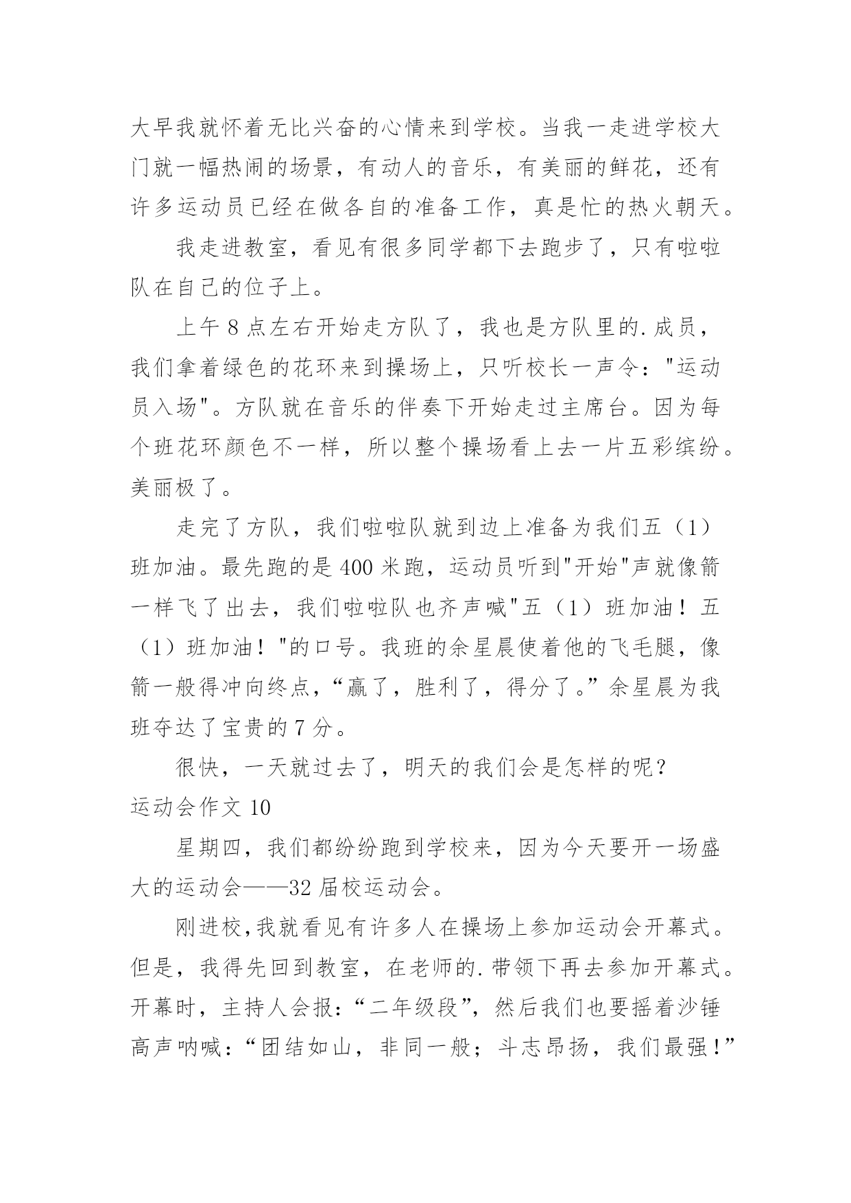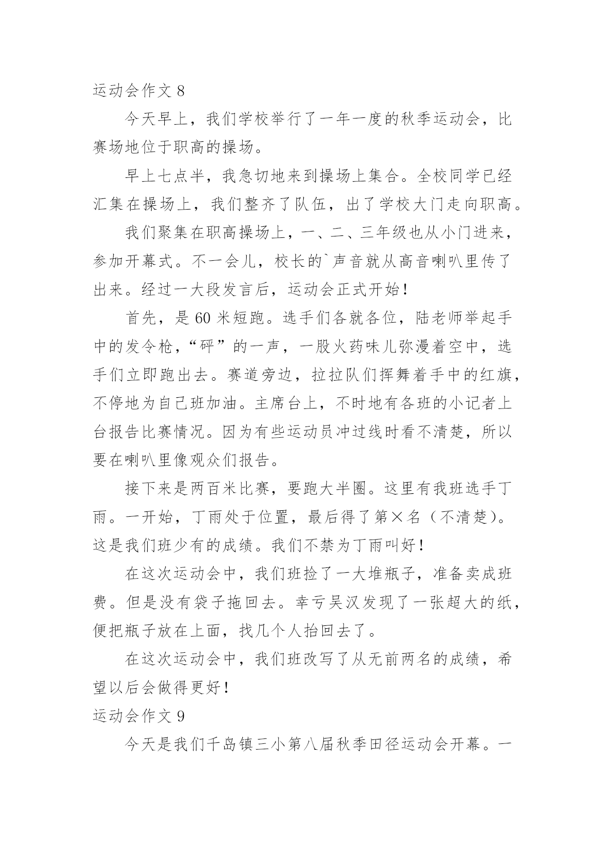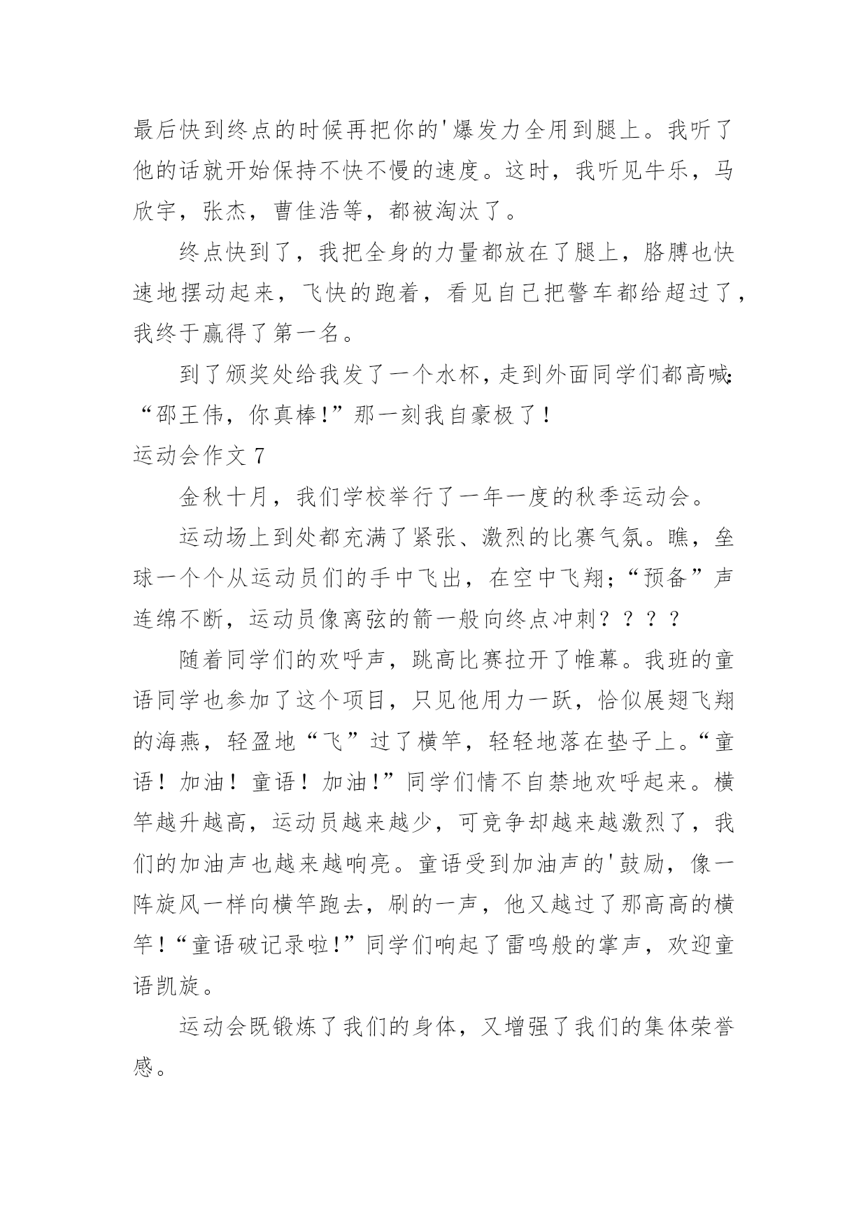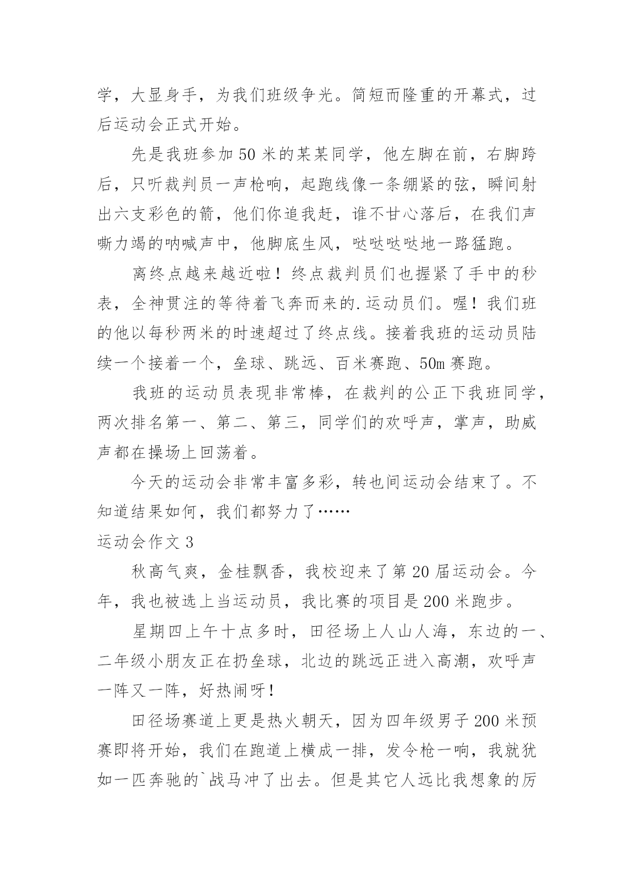 运动会作文(优秀)运动会作文在生活、工作和学习中,大家都不可避免地要接触到作文吧,作文根据体裁的不同可以分为记叙文、说明文、应用文、议论文。那么,怎么去写作文呢?以下是小编精心整理的运动会作文,仅供参考,希望能够帮助到大家。运动会作文1一年一度的运动会终于来了,已经是二年级的我报名参加了60米和100米短跑的项目。运动会的当天我怀着激动的心情来到了学校,60米短跑项目开始了,站在跑道上的我心里就像揣了一只兔子似的七上八下的跳。老师的枪声一响,跑道上的同学一个个就像离了弦的箭似的飞快的`向前跑,一个个你追我赶互不相让,谁都想跑第一,为自己的班级争得荣誉。真可惜,我只得了第二名,100米的短跑我也只得了第三名,我的心里有点失落,这也让我明白了一个道理:重在参与,友谊第一,比赛第二。我相信明年的运动会,通过我的努力,我会取得更好的成绩的。我期待明年的运动会,也期待和同学们一决高低,大家明年等待我的好消息吧!运动会作文2星期五,校园里举行一场运动会。在运动会我们班的同学,大显身手,为我们班级争光。简短而隆重的开幕式,过后运动会正式开始。先是我班参加50米的某某同学,他左脚在前,右脚跨后,只听裁判员一声枪响,起跑线像一条绷紧的弦,瞬间射出六支彩色的箭,他们你追我赶,谁不甘心落后,在我们声嘶力竭的呐喊声中,他脚底生风,哒哒哒哒地一路猛跑。离终点越来越近啦!终点裁判员们也握紧了手中的秒表,全神贯注的等待着飞奔而来的.运动员们。喔!我们班的他以每秒两米的时速超过了终点线。接着我班的运动员陆续一个接着一个,垒球、跳远、百米赛跑、50m赛跑。我班的运动员表现非常棒,在裁判的公正下我班同学,两次排名第一、第二、第三,同学们的欢呼声,掌声,助威声都在操场上回荡着。今天的运动会非常丰富多彩,转也间运动会结束了。不知道结果如何,我们都努力了……运动会作文3秋高气爽,金桂飘香,我校迎来了第20届运动会。今年,我也被选上当运动员,我比赛的项目是200米跑步。星期四上午十点多时,田径场上人山人海,东边的一、二年级小朋友正在扔垒球,北边的跳远正进入高潮,欢呼声一阵又一阵,好热闹呀!田径场赛道上更是热火朝天,因为四年级男子200米预赛即将开始,我们在跑道上横成一排,发令枪一响,我就犹如一匹奔驰的`战马冲了出去。但是其它人远比我想象的厉害得多,他们远远地把我甩在后面。我奋起直追,跑到一半的时候,我的腿像灌了铅一样沉,不由得减慢了速度,我被落后在最后一名。我看到远处的老师和同学们在拼命为我喊“加油”,顿时心头一热,我不能辜负老师和同学们的期望!我使出全身力气,飞快地冲刺,我终于追上了一个人,最后,我是第4名。奥运会的目标是更高、更快、更强,我要向这个目标努力、加油!运动会作文4我们终于盼来了一年一度的学校运动会。一早,全校同学排着整齐的队伍,兴致勃勃地来到操场上参加开幕式。校长宣布本次运动会开幕,并介绍了一些比赛项目:有跑步、跳远、丢沙包、跳绳等。接着是四年级学生的武术操表演,他们动作干净利落,个个英姿飒爽,我们不住地为他们鼓掌。比赛开始了,所有的运动员都使出全身力气。比赛非常的紧张、激烈,边上的同学们也大声地喊着加油。我来到立定跳远比赛的现场,只见我班杨柳同学,双脚并拢,两手前后晃动,双膝也随着向下弯曲,手甩着甩着,猛地向前跳去。她跳得好远,我连忙跑过去向她祝贺……比赛结束了,我们班有的`同学获得前三名的,但也有的同学没有获得名次。我安慰没有名次的同学说:“没关系,只要你努力了就行了,争取下次夺得名次。”通过这次运动会,我明白了一个道理:只要一个人努力付出了,他就会有收获!运动会作文5“加油、加油!一阵阵排山倒海的欢呼声。我们学校正在举行一年一度的.运动会,有50米赛跑、100米赛跑和跳绳……同学们就像逃出牢笼的小鸟儿一样飞向操场,每个人的脸上都激情洋溢。比赛快要开始了,是50米短跑,我的心呯呯跳,我努力想平静自己。准备!”"呯”一声枪响,我们飞跑出去对手已经跑出很远了,尽管我拼尽全力还是没能得到第一。下午,扔垒球,每人有三次机会。对手球一扔,飞出老远,我看呆了,心想:这还怎么比?轮到我了,第一次因为压线0分,第二次打了12米56,第三次扔了1米37,非常遗憾第一名又离我远去,心里暗下决心下次一定要得到第一为班争光。激烈而又团结的运动会就这样结束了。运动会作文6今天要举行运动会,1500米的长跑比赛第一名的任务,就落在了我们班男生的头上。快开始比赛了,体育老师杨老师告诉我们,前面有警车开道,后面也有警车跟着。如果被后面的警车追上就会被淘汰。还叮嘱我们,比赛前要把身体活动开了才跑的快。我听到后就飞快的活动起来。随着杨老师一声令下:“预备——开跑!”我们飞快地跑起来,而这时我旁边的南梓元告诉我,先跑不快不慢的速度,最后快到终点的时候再把你的'爆发力全用到腿上。我听了