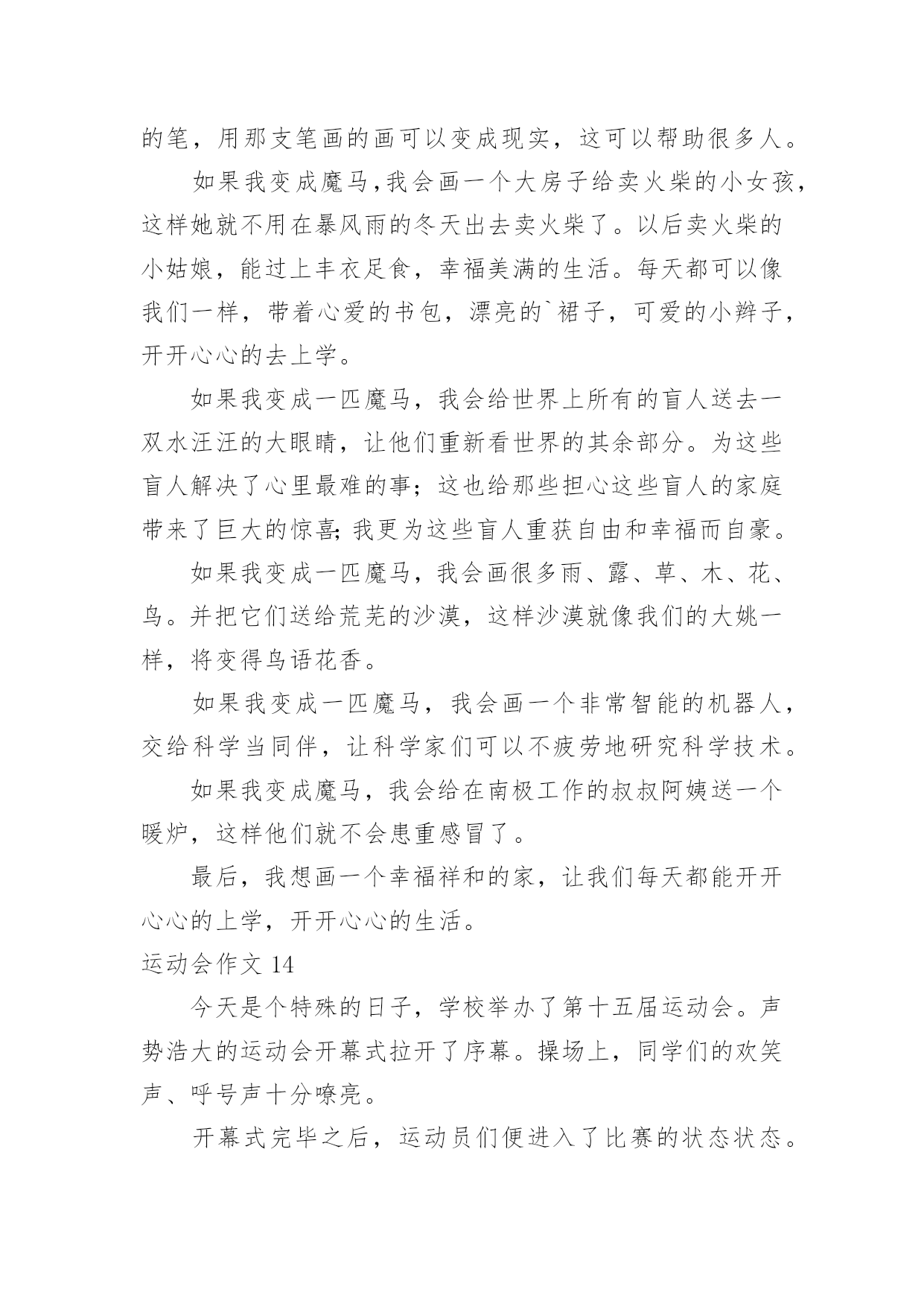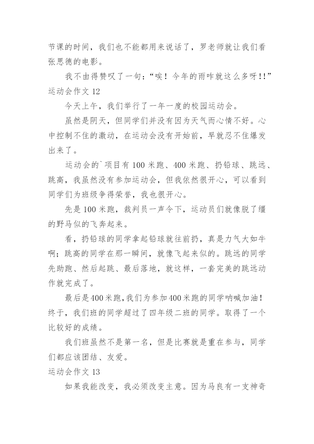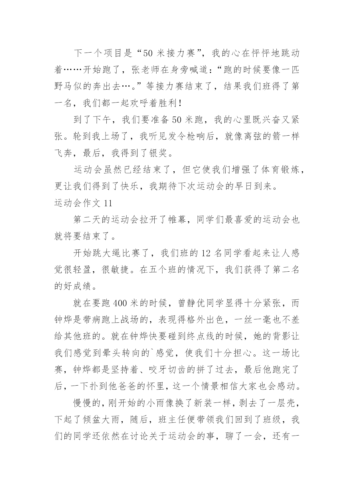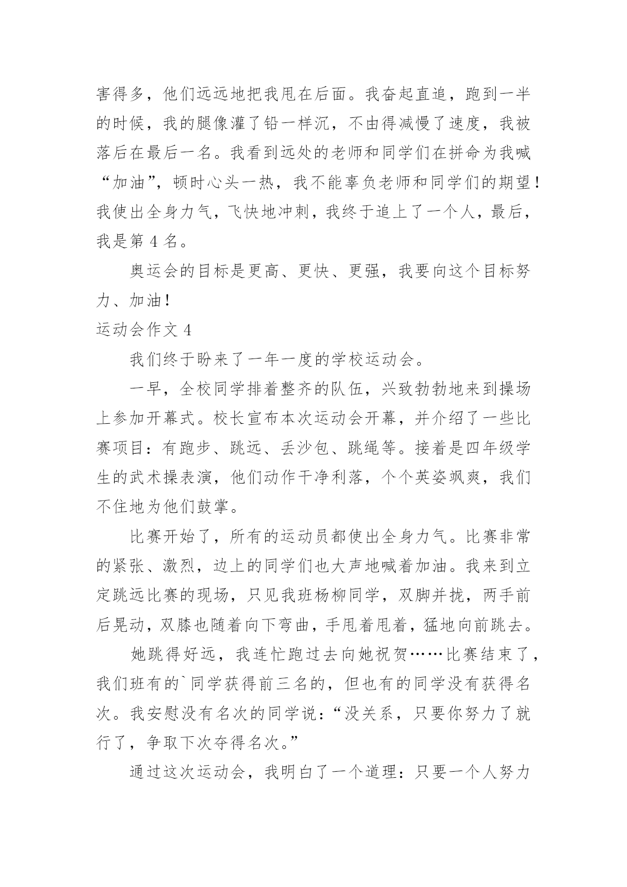 运动会作文(优秀)运动会作文在生活、工作和学习中,大家都不可避免地要接触到作文吧,作文根据体裁的不同可以分为记叙文、说明文、应用文、议论文。那么,怎么去写作文呢?以下是小编精心整理的运动会作文,仅供参考,希望能够帮助到大家。运动会作文1一年一度的运动会终于来了,已经是二年级的我报名参加了60米和100米短跑的项目。运动会的当天我怀着激动的心情来到了学校,60米短跑项目开始了,站在跑道上的我心里就像揣了一只兔子似的七上八下的跳。老师的枪声一响,跑道上的同学一个个就像离了弦的箭似的飞快的`向前跑,一个个你追我赶互不相让,谁都想跑第一,为自己的班级争得荣誉。真可惜,我只得了第二名,100米的短跑我也只得了第三名,我的心里有点失落,这也让我明白了一个道理:重在参与,友谊第一,比赛第二。我相信明年的运动会,通过我的努力,我会取得更好的成绩的。我期待明年的运动会,也期待和同学们一决高低,大家明年等待我的好消息吧!运动会作文2星期五,校园里举行一场运动会。在运动会我们班的同学,大显身手,为我们班级争光。简短而隆重的开幕式,过后运动会正式开始。先是我班参加50米的某某同学,他左脚在前,右脚跨后,只听裁判员一声枪响,起跑线像一条绷紧的弦,瞬间射出六支彩色的箭,他们你追我赶,谁不甘心落后,在我们声嘶力竭的呐喊声中,他脚底生风,哒哒哒哒地一路猛跑。离终点越来越近啦!终点裁判员们也握紧了手中的秒表,全神贯注的等待着飞奔而来的.运动员们。喔!我们班的他以每秒两米的时速超过了终点线。接着我班的运动员陆续一个接着一个,垒球、跳远、百米赛跑、50m赛跑。我班的运动员表现非常棒,在裁判的公正下我班同学,两次排名第一、第二、第三,同学们的欢呼声,掌声,助威声都在操场上回荡着。今天的运动会非常丰富多彩,转也间运动会结束了。不知道结果如何,我们都努力了……运动会作文3秋高气爽,金桂飘香,我校迎来了第20届运动会。今年,我也被选上当运动员,我比赛的项目是200米跑步。星期四上午十点多时,田径场上人山人海,东边的一、二年级小朋友正在扔垒球,北边的跳远正进入高潮,欢呼声一阵又一阵,好热闹呀!田径场赛道上更是热火朝天,因为四年级男子200米预赛即将开始,我们在跑道上横成一排,发令枪一响,我就犹如一匹奔驰的`战马冲了出去。但是其它人远比我想象的厉害得多,他们远远地把我甩在后面。我奋起直追,跑到一半的时候,我的腿像灌了铅一样沉,不由得减慢了速度,我被落后在最后一名。我看到远处的老师和同学们在拼命为我喊“加油”,顿时心头一热,我不能辜负老师和同学们的期望!我使出全身力气,飞快地冲刺,我终于追上了一个人,最后,我是第4名。奥运会的目标是更高、更快、更强,我要向这个目标努力、加油!运动会作文4我们终于盼来了一年一度的学校运动会。一早,全校同学排着整齐的队伍,兴致勃勃地来到操场上参加开幕式。校长宣布本次运动会开幕,并介绍了一些比赛项目:有跑步、跳远、丢沙包、跳绳等。接着是四年级学生的武术操表演,他们动作干净利落,个个英姿飒爽,我们不住地为他们鼓掌。比赛开始了,所有的运动员都使出全身力气。比赛非常的紧张、激烈,边上的同学们也大声地喊着加油。我来到立定跳远比赛的现场,只见我班杨柳同学,双脚并拢,两手前后晃动,双膝也随着向下弯曲,手甩着甩着,猛地向前跳去。她跳得好远,我连忙跑过去向她祝贺……比赛结束了,我们班有的`同学获得前三名的,但也有的同学没有获得名次。我安慰没有名次的同学说:“没关系,只要你努力了就行了,争取下次夺得名次。”通过这次运动会,我明白了一个道理:只要一个人努力付出了,他就会有收获!运动会作文5“加油、加油!一阵阵排山倒海的欢呼声。我们学校正在举行一年一度的.运动会,有50米赛跑、100米赛跑和跳绳……同学们就像逃出牢笼的小鸟儿一样飞向操场,每个人的脸上都激情洋溢。比赛快要开始了,是50米短跑,我的心呯呯跳,我努力想平静自己。准备!”"呯”一声枪响,我们飞跑出去对手已经跑出很远了,尽管我拼尽全力还是没能得到第一。下午,扔垒球,每人有三次机会。对手球一扔,飞出老远,我看呆了,心想:这还怎么比?轮到我了,第一次因为压线0分,第二次打了12米56,第三次扔了1米37,非常遗憾第一名又离我远去,心里暗下决心下次一定要得到第一为班争光。激烈而又团结的运动会就这样结束了。运动会作文6今天要举行运动会,1500米的长跑比赛第一名的任务,就落在了我们班男生的头上。快开始比赛了,体育老师杨老师告诉我们,前面有警车开道,后面也有警车跟着。如果被后面的警车追上就会被淘汰。还叮嘱我们,比赛前要把身体活动开了才跑的快。我听到后就飞快的活动起来。随着杨老师一声令下:“预备——开跑!”我们飞快地跑起来,而这时我旁边的南梓元告诉我,先跑不快不慢的速度,最后快到终点的时候再把你的'爆发力全用到腿上。我听了