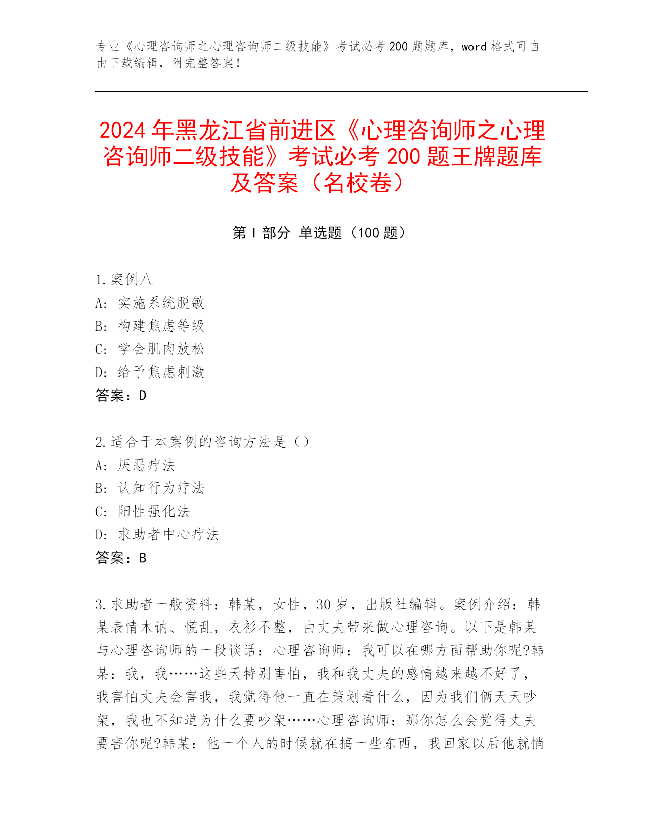 2024年黑龙江省前进区《心理咨询师之心理咨询师二级技能》考试必考200题王牌题库及答案(名校卷)