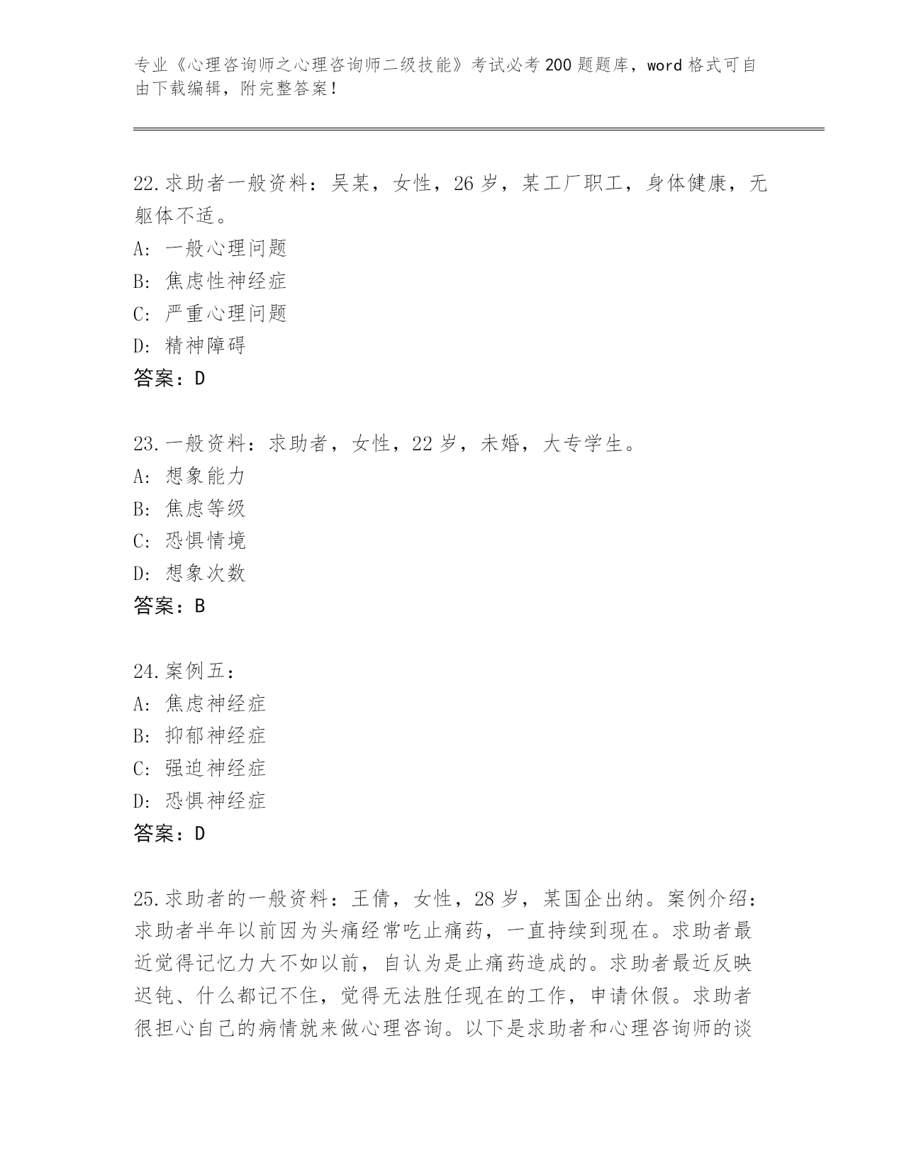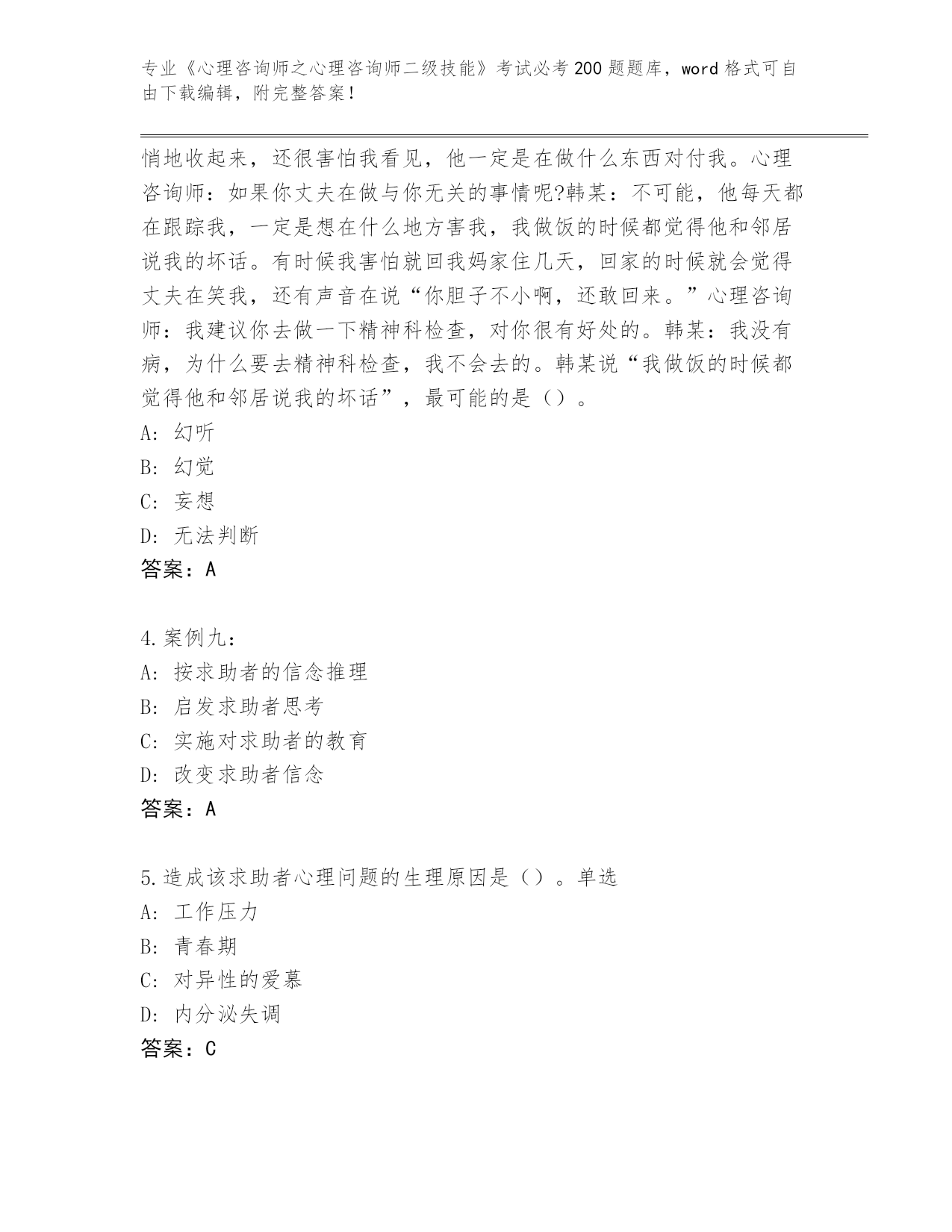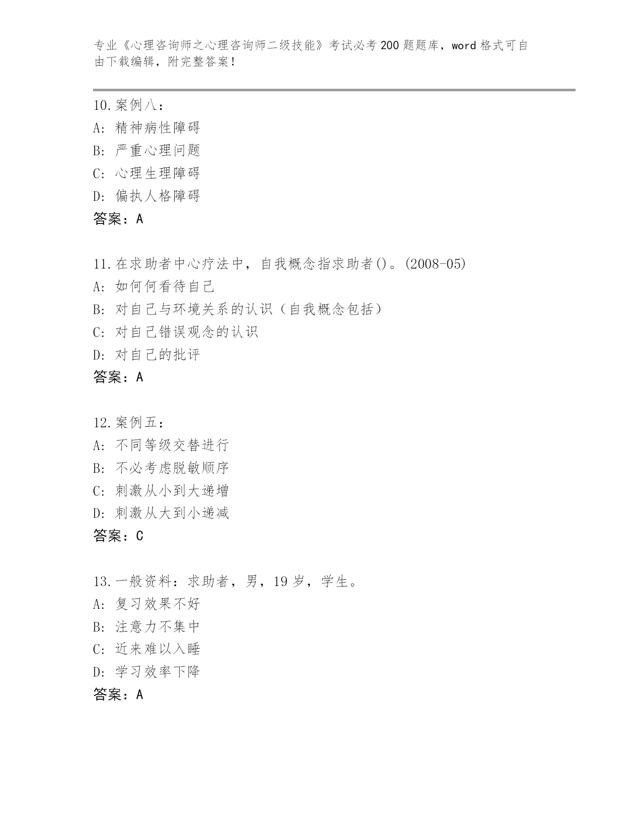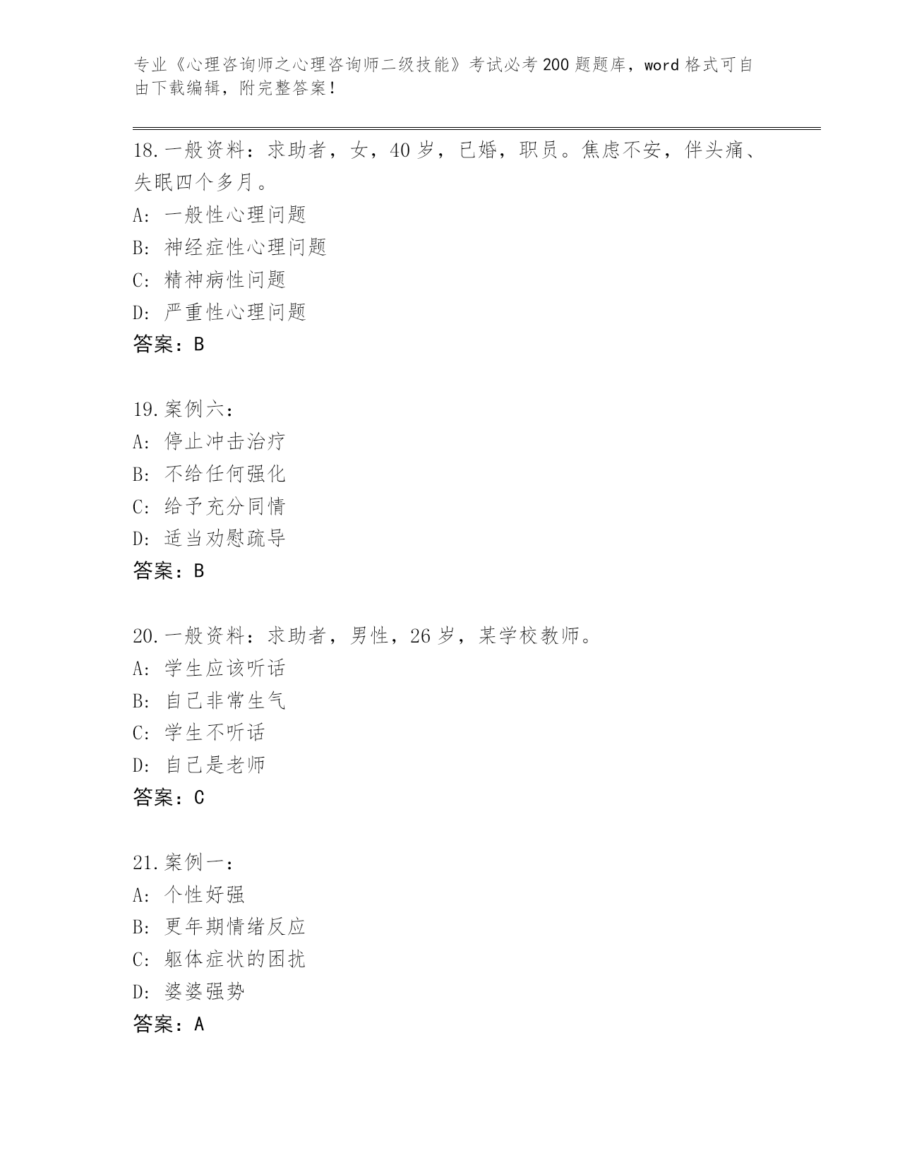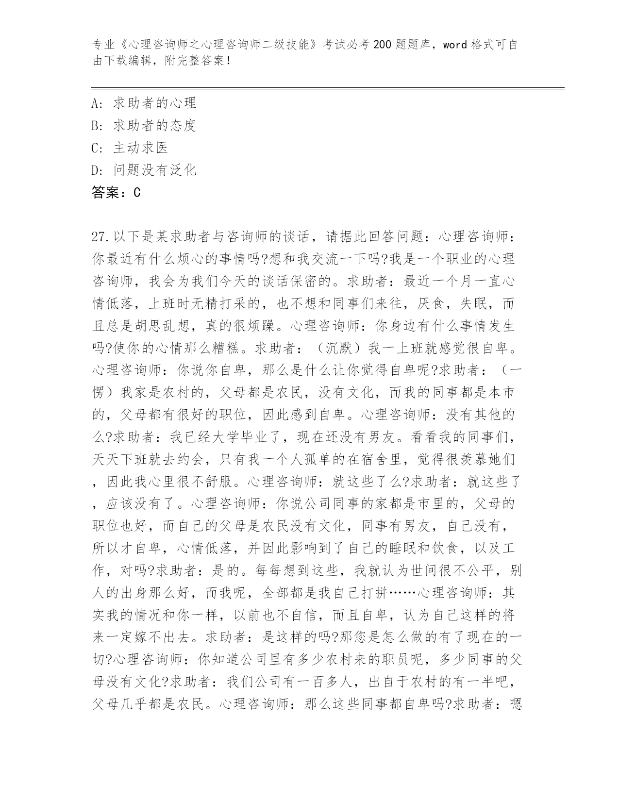 海南省《心理咨询师之心理咨询师二级技能》考试必考200题王牌题库加答案