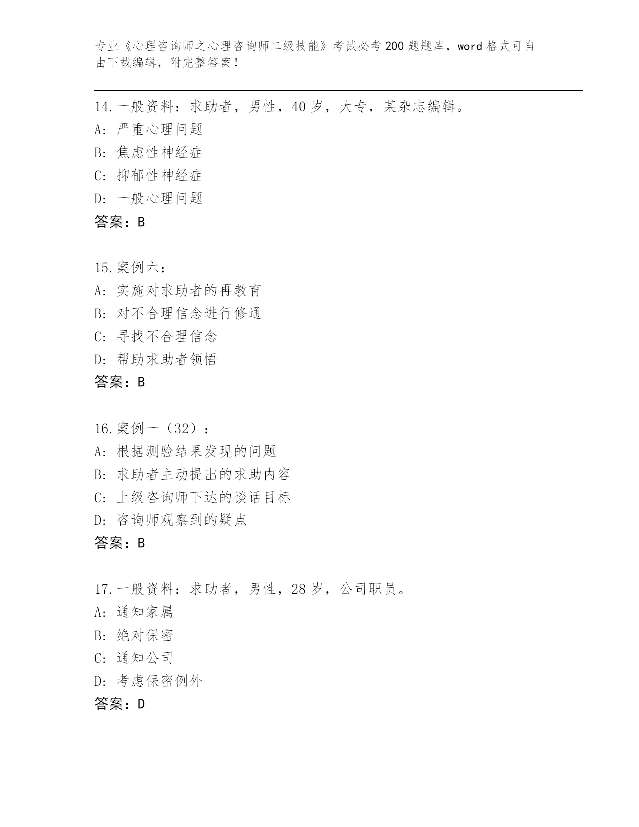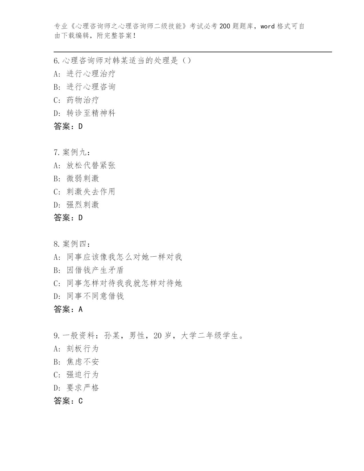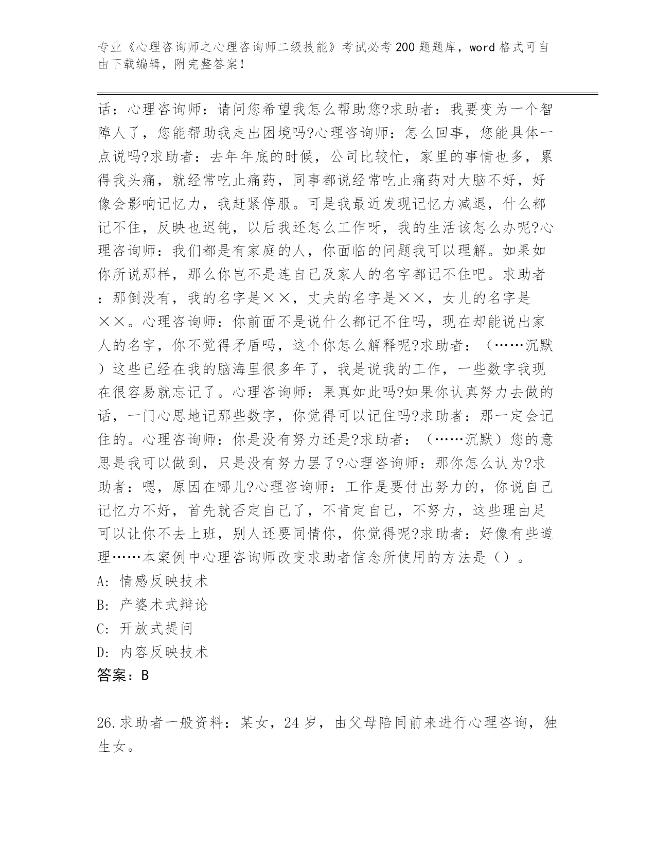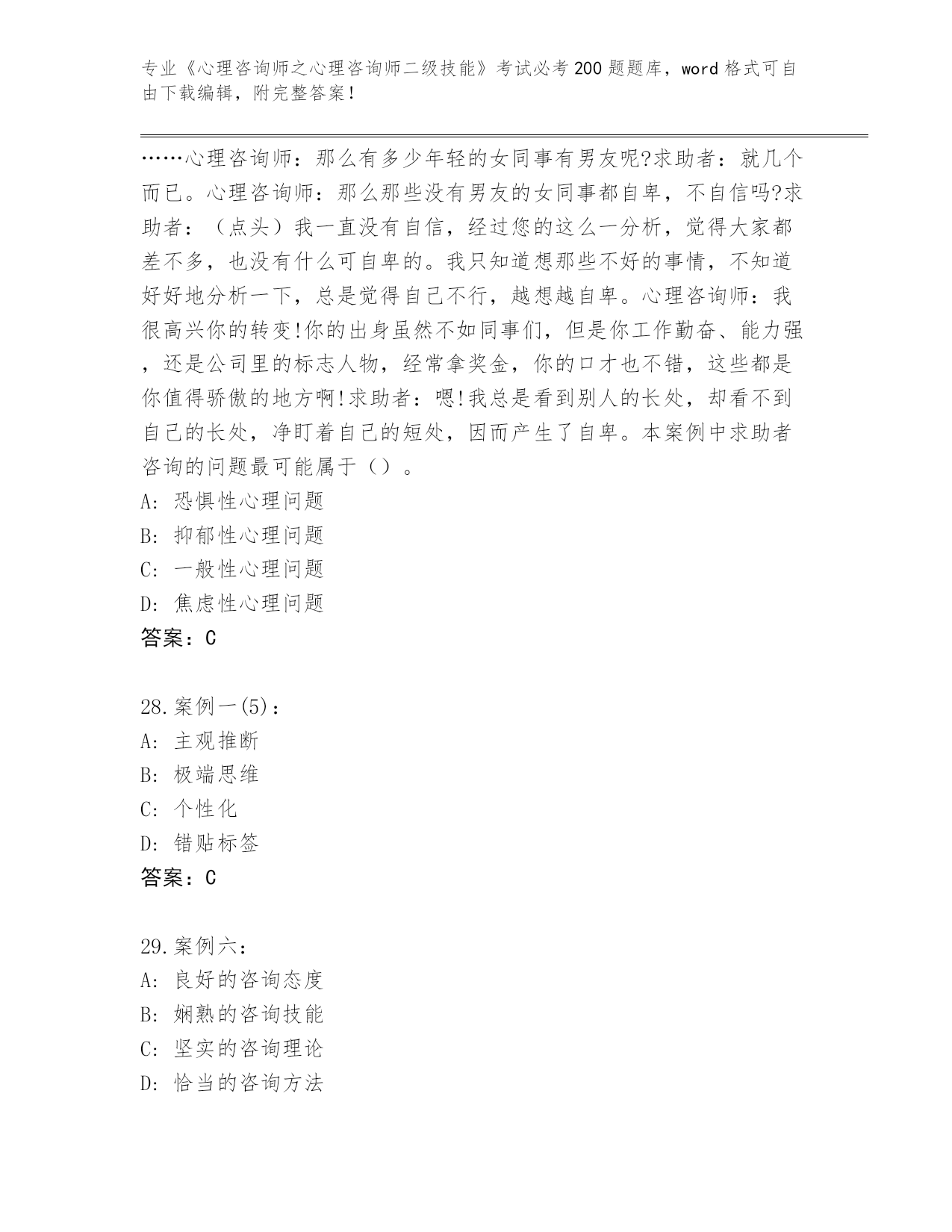 贵州省施秉县内部使用《心理咨询师之心理咨询师二级技能》考试必考200题王牌题库及答案【名校卷】