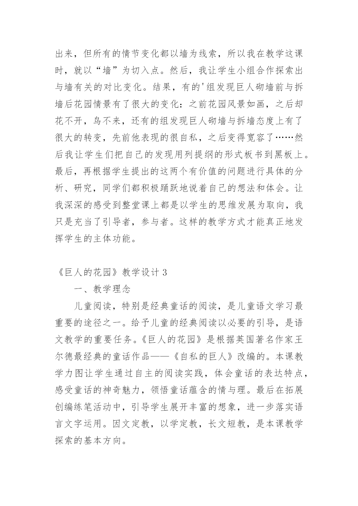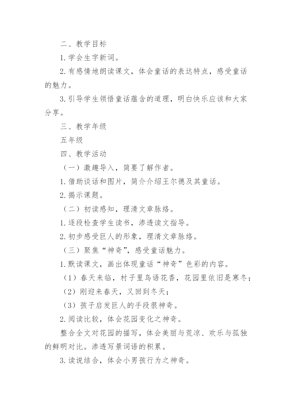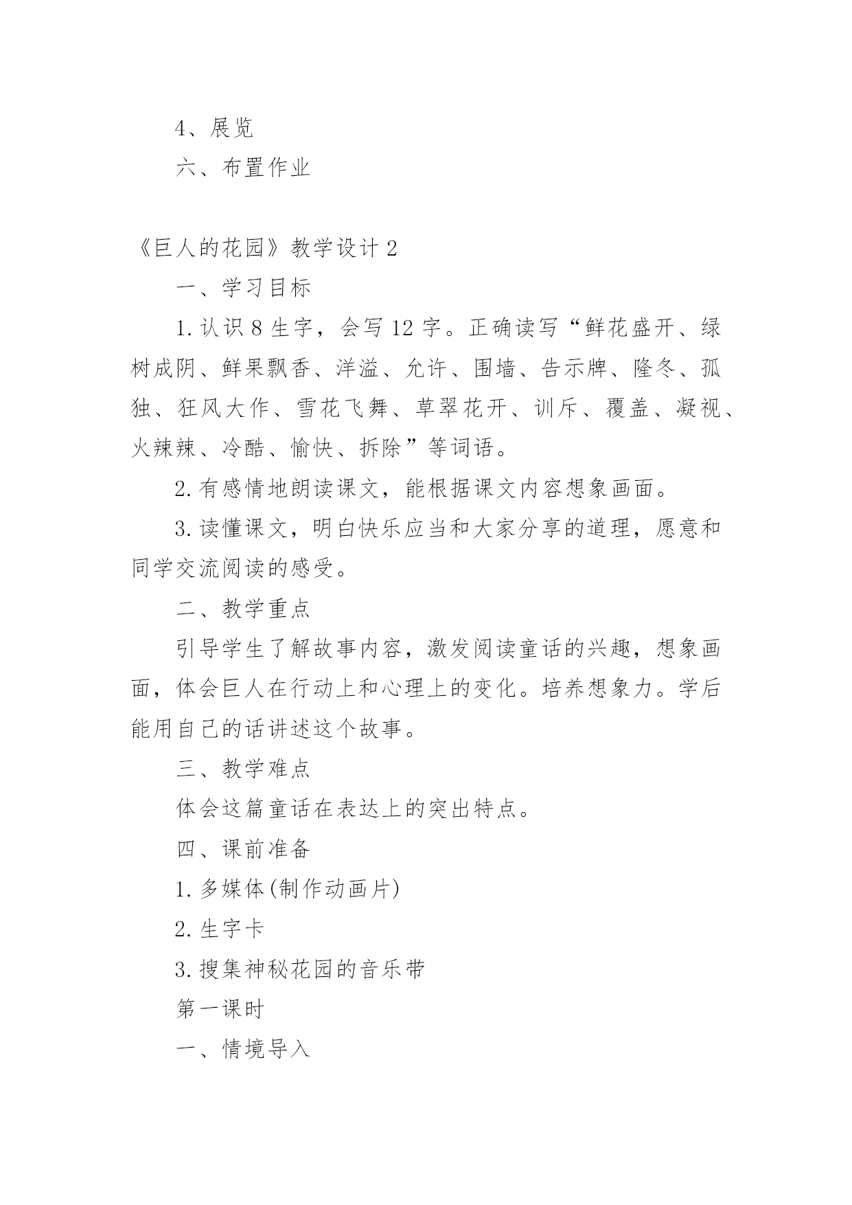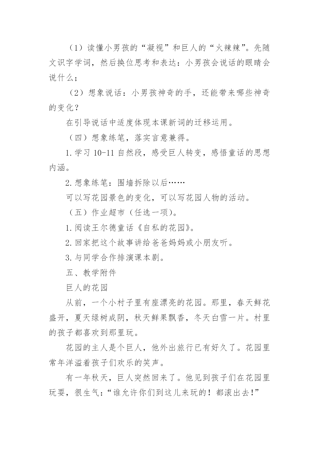 《巨人的花园》教学设计作为一名教学工作者,时常需要编写教学设计,教学设计是根据课程标准的要求和教学对象的特点,将教学诸要素有序安排,确定合适的教学方案的设想和计划。怎样写教学设计才更能起到其作用呢?下面是小编为大家整理的《巨人的花园》教学设计,仅供参考,欢迎大家阅读。《巨人的花园》教学设计1一、导入1、同学们,你们听过那些童话故事?2、看来大家已经听过很多神奇的童话故事了,看看这篇,读:(《巨人的花园》)也是一篇童话故事,而且这个题目一看就是童话故事,说说你从哪里看出来的?3、我们一起来看看巨人的插图吧,巨人有什么特别?4、童话故事中的.人物就是这么神奇,让我们一起走进这神奇的童话世界。二、初探课文1、初读课文,看看在这巨人的花园里究竟发生了什么故事呢?走进花园时,注意读准字音,读通句子、做到不添字、不减字,开始。2、学生自由读3、看来大家都读完了,现在老师检查一下大家的生字词认知情况。(出示幻灯片)4、谁来读一读(1轮流三组读2男女合读)5、这三组词语就是我们故事的三个组成部分,变现了三个不同的画面,谁能把画面里的故事读出来?(1教师范读2点名读3男同学读4女同学读)总结:看来要把句子读好,还得边读边想象,想象画面,读的会更好。三、深究课文看来大家都读好了,现在我们就一起去《女人的花园》逛一逛,谁要跟我一起去呢?好,老师点到谁,谁就站起来带我们逛一逛这园子吧。1、教师引渡第一个自然段,接下来,每个点到的学生读一个段落或者是几句话。请同学点评2、同学们读的都不赖,逛了园子,大家知道园子的主人是谁吗?他给你留下了怎样的印象?快速看课文,用几个词语说说。3、师说:是啊,巨人一开始孤独、冷酷,后来他知错就改,为什么会发生如此大的变化呢?我们下节课接着往下说。五、生字平台1、师:现在我们来看看今天的生字词,哪些词语需要提醒同学注意的呢?我们四人小组讨论一下,之后请同学上讲台来讲解。2、重点讲解“添、醋、拆、牌”3、拿出本子,把你认为难写的字临一临。4、展览六、布置作业《巨人的花园》教学设计2一、学习目标1.认识8生字,会写12字。正确读写“鲜花盛开、绿树成阴、鲜果飘香、洋溢、允许、围墙、告示牌、隆冬、孤独、狂风大作、雪花飞舞、草翠花开、训斥、覆盖、凝视、火辣辣、冷酷、愉快、拆除”等词语。2.有感情地朗读课文,能根据课文内容想象画面。3.读懂课文,明白快乐应当和大家分享的道理,愿意和同学交流阅读的感受。二、教学重点引导学生了解故事内容,激发阅读童话的兴趣,想象画面,体会巨人在行动上和心理上的变化。培养想象力。学后能用自己的话讲述这个故事。三、教学难点体会这篇童话在表达上的突出特点。四、课前准备1.多媒体(制作动画片)2.生字卡3.搜集神秘花园的音乐带第一课时一、情境导入1.情境:播放多媒体。2.过度:出示:唤来寒冬的,是我那颗任性、冷酷的心啊!3.学生围绕中心句质疑。4.教师揭题:古人云:学贵生疑,疑则进也。解疑的最好方法就是读书。今天我们一起来读──9《巨人的花园》。二、初读感知1.教师出示自读要求。画出不认识的字和不理解的词语,读准字音,查字典或者联系生活经验理解词语,读通句子读完以后,想想自己能解答同学们提出的哪些问题2.学生自主读书。3.检查自学。出示生字卡片,检查认读生字情况。出示新词““鲜花盛开、绿树成阴、鲜果飘香、洋溢、允许、围墙、告示牌、隆冬、孤独、狂风大作、雪花飞舞、草翠花开、训斥、覆盖、凝视、火辣辣、冷酷、愉快、拆除等语。各自交流自己是用什么方法理解词语:指名分段朗读课文。三、再读课文1.以小组为单位,练习把课文朗诵通顺流利。2.课文主要写了什么事?指名回答补充。四、指导书写1.出示生字“溢、允、墙、牌、添、训”认读,自己想办法记住字型。2.你还能用这些生字组和课文不一样的词吗?3.重点指导以下字的书写。允应该读yun第三声,不要读成rǔn、yǒng。“添字的右下部分容易写错,要引导学生观察仔细。4.生书写练习,教师巡视。五、抄写生字。第二课时一、复习回顾1.听写生字词。2.分段朗读课文。二、精读课文感悟学生围绕“唤来寒冬的,是我那颗任性、冷酷的心啊”这个问题进行研读,巨人醒悟前是什么样的?醒悟后又是怎样?应该怎样读巨人醒悟前的话?1.研读课文第3—11自然段。2.体验巨人在行动上和心理上的变化。找出文中的句子读一读,画一画,说一说,读了这几个自然段,你有什么发现?(让学生体会对比手法)通过朗读,进一步体验巨人在行动上和心理上的变化。3.指导朗诵,能以符合课文意境的语气读读巨人说的话。4.续读第3—11自然段,体验童话故事想象神奇的特点。读一读,说说你有什么感受。再读读,把你的感受读出来。你还想到什么情景?能模仿书中的句式说一说吗?5.学生朗读醒悟前的对话。自由朗读,一边读一边想像。指名学生多人次朗读。三、想象感