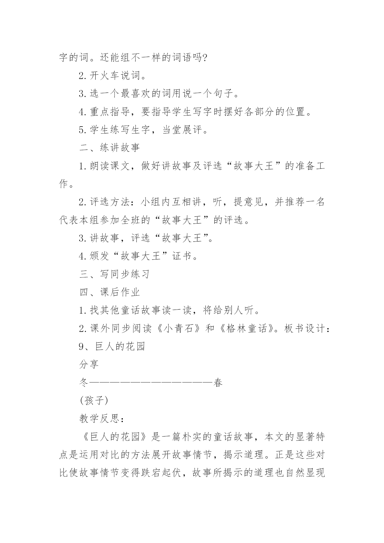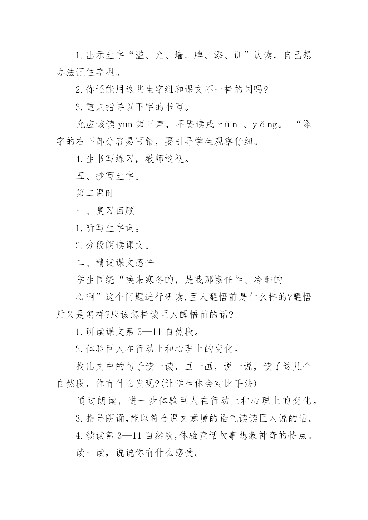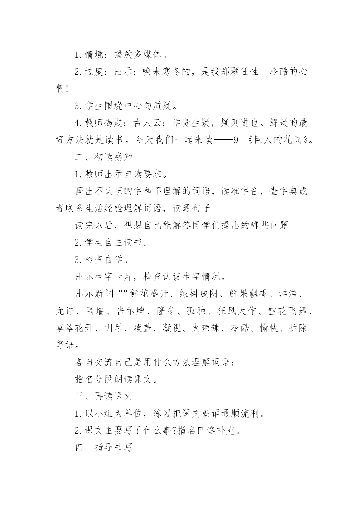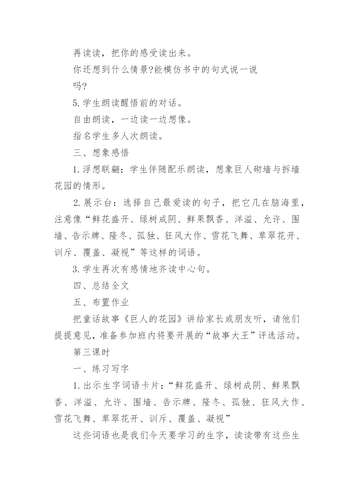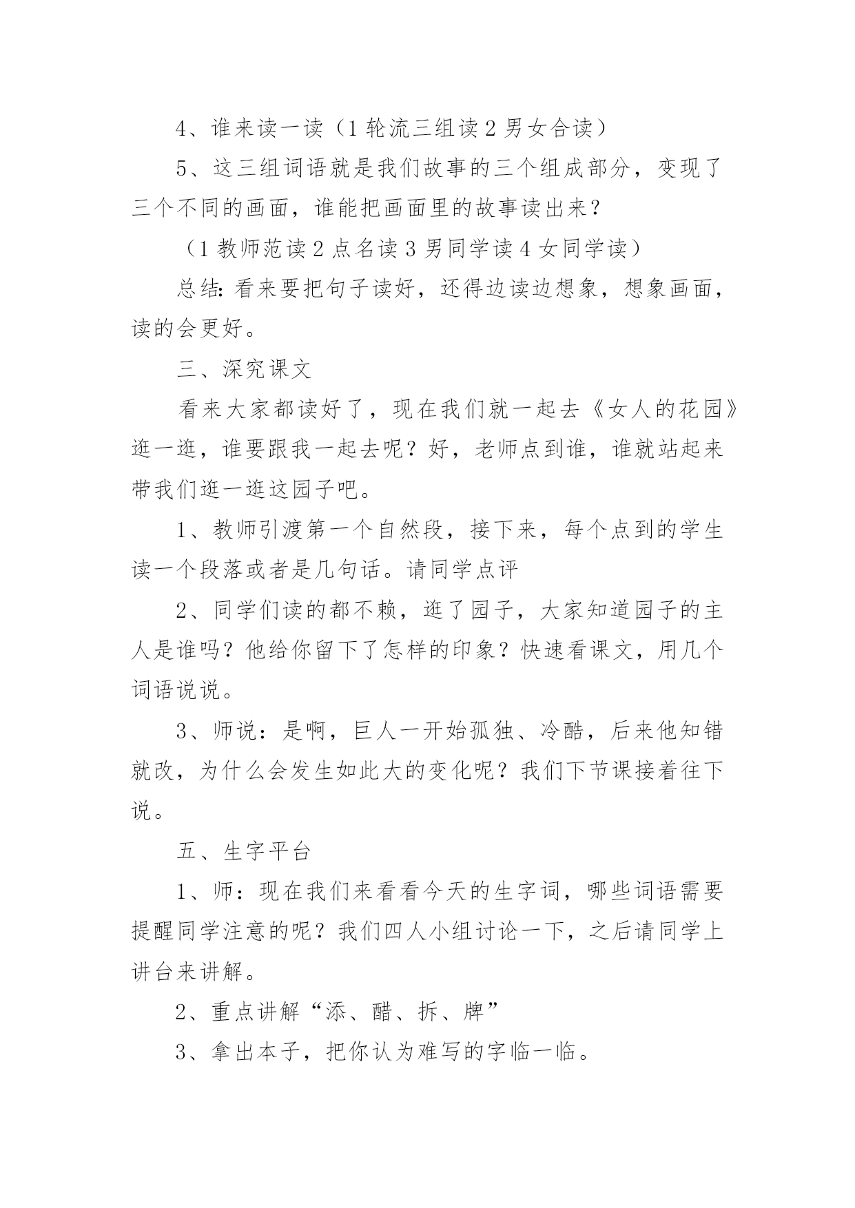 《巨人的花园》教学设计作为一名教学工作者,时常需要编写教学设计,教学设计是根据课程标准的要求和教学对象的特点,将教学诸要素有序安排,确定合适的教学方案的设想和计划。怎样写教学设计才更能起到其作用呢?下面是小编为大家整理的《巨人的花园》教学设计,仅供参考,欢迎大家阅读。《巨人的花园》教学设计1一、导入1、同学们,你们听过那些童话故事?2、看来大家已经听过很多神奇的童话故事了,看看这篇,读:(《巨人的花园》)也是一篇童话故事,而且这个题目一看就是童话故事,说说你从哪里看出来的?3、我们一起来看看巨人的插图吧,巨人有什么特别?4、童话故事中的.人物就是这么神奇,让我们一起走进这神奇的童话世界。二、初探课文1、初读课文,看看在这巨人的花园里究竟发生了什么故事呢?走进花园时,注意读准字音,读通句子、做到不添字、不减字,开始。2、学生自由读3、看来大家都读完了,现在老师检查一下大家的生字词认知情况。(出示幻灯片)4、谁来读一读(1轮流三组读2男女合读)5、这三组词语就是我们故事的三个组成部分,变现了三个不同的画面,谁能把画面里的故事读出来?(1教师范读2点名读3男同学读4女同学读)总结:看来要把句子读好,还得边读边想象,想象画面,读的会更好。三、深究课文看来大家都读好了,现在我们就一起去《女人的花园》逛一逛,谁要跟我一起去呢?好,老师点到谁,谁就站起来带我们逛一逛这园子吧。1、教师引渡第一个自然段,接下来,每个点到的学生读一个段落或者是几句话。请同学点评2、同学们读的都不赖,逛了园子,大家知道园子的主人是谁吗?他给你留下了怎样的印象?快速看课文,用几个词语说说。3、师说:是啊,巨人一开始孤独、冷酷,后来他知错就改,为什么会发生如此大的变化呢?我们下节课接着往下说。五、生字平台1、师:现在我们来看看今天的生字词,哪些词语需要提醒同学注意的呢?我们四人小组讨论一下,之后请同学上讲台来讲解。2、重点讲解“添、醋、拆、牌”3、拿出本子,把你认为难写的字临一临。4、展览六、布置作业《巨人的花园》教学设计2一、学习目标1.认识8生字,会写12字。正确读写“鲜花盛开、绿树成阴、鲜果飘香、洋溢、允许、围墙、告示牌、隆冬、孤独、狂风大作、雪花飞舞、草翠花开、训斥、覆盖、凝视、火辣辣、冷酷、愉快、拆除”等词语。2.有感情地朗读课文,能根据课文内容想象画面。3.读懂课文,明白快乐应当和大家分享的道理,愿意和同学交流阅读的感受。二、教学重点引导学生了解故事内容,激发阅读童话的兴趣,想象画面,体会巨人在行动上和心理上的变化。培养想象力。学后能用自己的话讲述这个故事。三、教学难点体会这篇童话在表达上的突出特点。四、课前准备1.多媒体(制作动画片)2.生字卡3.搜集神秘花园的音乐带第一课时一、情境导入1.情境:播放多媒体。2.过度:出示:唤来寒冬的,是我那颗任性、冷酷的心啊!3.学生围绕中心句质疑。4.教师揭题:古人云:学贵生疑,疑则进也。解疑的最好方法就是读书。今天我们一起来读──9《巨人的花园》。二、初读感知1.教师出示自读要求。画出不认识的字和不理解的词语,读准字音,查字典或者联系生活经验理解词语,读通句子读完以后,想想自己能解答同学们提出的哪些问题2.学生自主读书。3.检查自学。出示生字卡片,检查认读生字情况。出示新词““鲜花盛开、绿树成阴、鲜果飘香、洋溢、允许、围墙、告示牌、隆冬、孤独、狂风大作、雪花飞舞、草翠花开、训斥、覆盖、凝视、火辣辣、冷酷、愉快、拆除等语。各自交流自己是用什么方法理解词语:指名分段朗读课文。三、再读课文1.以小组为单位,练习把课文朗诵通顺流利。2.课文主要写了什么事?指名回答补充。四、指导书写1.出示生字“溢、允、墙、牌、添、训”认读,自己想办法记住字型。2.你还能用这些生字组和课文不一样的词吗?3.重点指导以下字的书写。允应该读yun第三声,不要读成rǔn、yǒng。“添字的右下部分容易写错,要引导学生观察仔细。4.生书写练习,教师巡视。五、抄写生字。第二课时一、复习回顾1.听写生字词。2.分段朗读课文。二、精读课文感悟学生围绕“唤来寒冬的,是我那颗任性、冷酷的心啊”这个问题进行研读,巨人醒悟前是什么样的?醒悟后又是怎样?应该怎样读巨人醒悟前的话?1.研读课文第3—11自然段。2.体验巨人在行动上和心理上的变化。找出文中的句子读一读,画一画,说一说,读了这几个自然段,你有什么发现?(让学生体会对比手法)通过朗读,进一步体验巨人在行动上和心理上的变化。3.指导朗诵,能以符合课文意境的语气读读巨人说的话。4.续读第3—11自然段,体验童话故事想象神奇的特点。读一读,说说你有什么感受。再读读,把你的感受读出来。你还想到什么情景?能模仿书中的句式说一说吗?5.学生朗读醒悟前的对话。自由朗读,一边读一边想像。指名学生多人次朗读。三、想象感