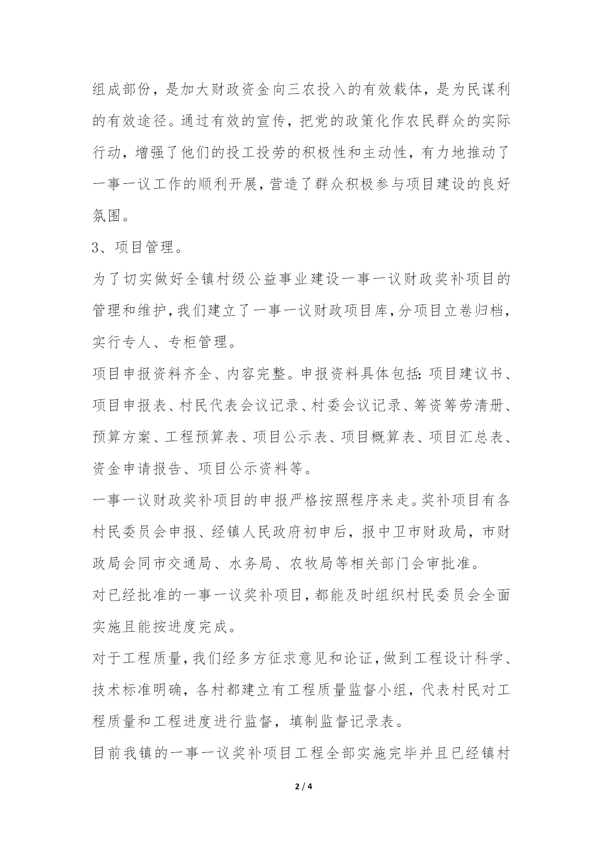 PAGE4/NUMPAGES4村级公益事业一事一议财政奖补自查报告以来,镇一事一议财政奖补项目在市财政、交通、水务等各部门的大力支持下,精心组织,广泛宣传,科学实施,取得了明显成效。现将自查的有关情况简要汇报如下:一、基本情况二、工作具体开展情况:1、组织领导。为扎实推进我镇一事一议财政奖补项目顺利开展,镇党委、政府把一事一议工作列入重要议事日程,成立了以镇党委书记任勤任组长,成立了以任勤书记为组长,纪委书记杨金保为副组长,镇规划办、社经中心、纪检办公室负责人、项目村书记为成员的项目建设领导小组,抓好工程项目的建设、质量和管理工作。同时,各个项目村分别成立了以村党支部书记为组长,村民监督委员会成员、党员代表、村民代表为成员的项目实施领导小组,具体负责项目的实施。明确分工,强化责任,加强资金管理,确保各项工作有序进行。2、宣传发动。通过召开村民代表会议,党员大会,开辟宣专栏,制作固定标语等形式,全力营造一事一议宣传工作的氛围,尊重民意,民主决策,规范操作,在全镇范围内大力宣传一事一议工作的积极意义,让村民知道开展一事一议工作是党和政府关心三农工作的重要组成部份,是加大财政资金向三农投入的有效载体,是为民谋利的有效途径。通过有效的宣传,把党的政策化作农民群众的实际行动,增强了他们的投工投劳的积极性和主动性,有力地推动了一事一议工作的顺利开展,营造了群众积极参与项目建设的良好氛围。3、项目管理。为了切实做好全镇村级公益事业建设一事一议财政奖补项目的管理和维护,我们建立了一事一议财政项目库,分项目立卷归档,实行专人、专柜管理。项目申报资料齐全、内容完整。申报资料具体包括:项目建议书、项目申报表、村民代表会议记录、村委会议记录、筹资筹劳清册、预算方案、工程预算表、项目公示表、项目概算表、项目汇总表、资金申请报告、项目公示资料等。一事一议财政奖补项目的申报严格按照程序来走。奖补项目有各村民委员会申报、经镇人民政府初申后,报中卫市财政局,市财政局会同市交通局、水务局、农牧局等相关部门会审批准。对已经批准的一事一议奖补项目,都能及时组织村民委员会全面实施且能按进度完成。对于工程质量,我们经多方征求意见和论证,做到工程设计科学、技术标准明确,各村都建立有工程质量监督小组,代表村民对工程质量和工程进度进行监督,填制监督记录表。目前我镇的一事一议奖补项目工程全部实施完毕并且已经镇村两级进行了验收。4、筹资筹劳管理我镇对一事一议财政奖补项目筹资筹劳的管理,严格按照程序来走。经村民代表大会讨论通过,报镇人民政府审查。农民筹资筹劳标准严格按照文件规定,不超过规定上限。对筹资筹劳的档案进行分类管理,保障了档案的齐全。5、资金管理我镇社会与经济管理办公室负责对一事一议财政奖补资金实施管理,在宁夏黄河农村银行设立了一事一议财政奖补资金专户,在账目上设立了专账。实行专人、专户、专账管理。各村一事一议项目资金都实行了报账制,由村上提出申请,经镇社会与经济管理办公室审核,镇长签字后方可下拨。6、其他管理档案管理。我镇对申报资料、批复文件、会议记录、公示资料、合同、验收表、结算凭证和有关图片等都装订成册,并分村、分项目建档、归档。三、存在的问题认识有待进一步深化。村级公益事业建设一事一议财政奖补是事关群众切实利益的一件大事,又是一项程序比较复杂的工作,但极少数干部对公益事业一事一议财政奖补建设的认识还比较模糊,思想认识上有一定的偏差,认为此项工作程序太多,政策性又很强,认为很麻烦而出现了消极和畏难情绪。四、几点建议一是建议将奖补资金批复到镇乡,由镇乡统筹安排,按一年实施一个村的规划,集中到一个村逐年分村实施效果更好二是保障工作经费投入。镇乡一事一议财政奖补办公室一般都设立在财政所,目前财政所基本上没有固定的经费来源,正常运转都相当困难,办公条件较差。建议上级拨付一定的工作经费,逐步改善各镇乡的一事一议财政奖补办公室的办公条件,切实提高办事的质量和效率。