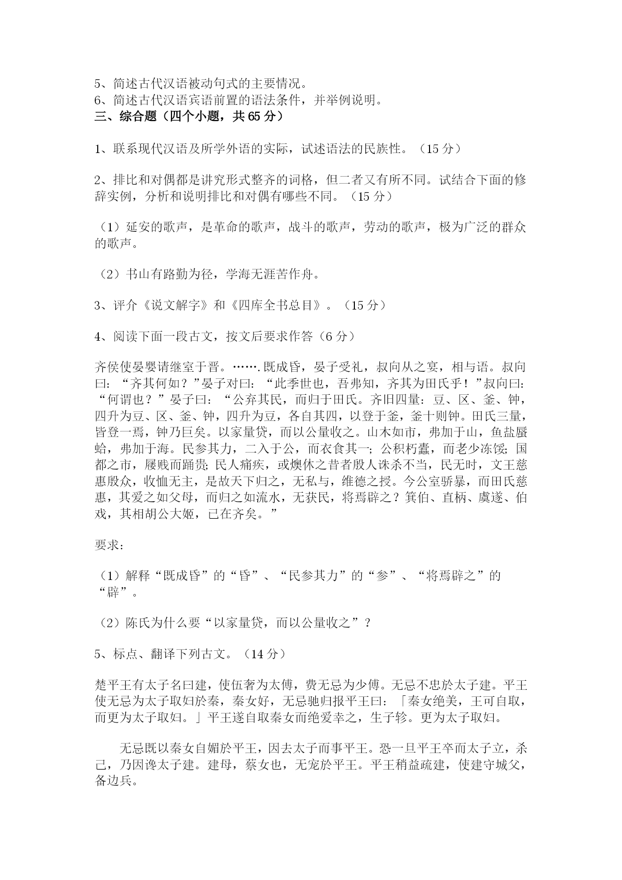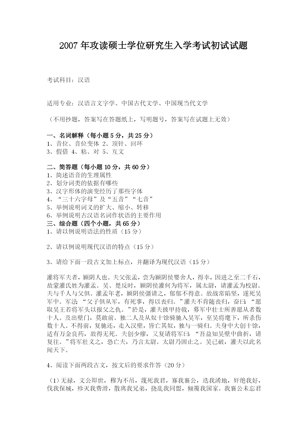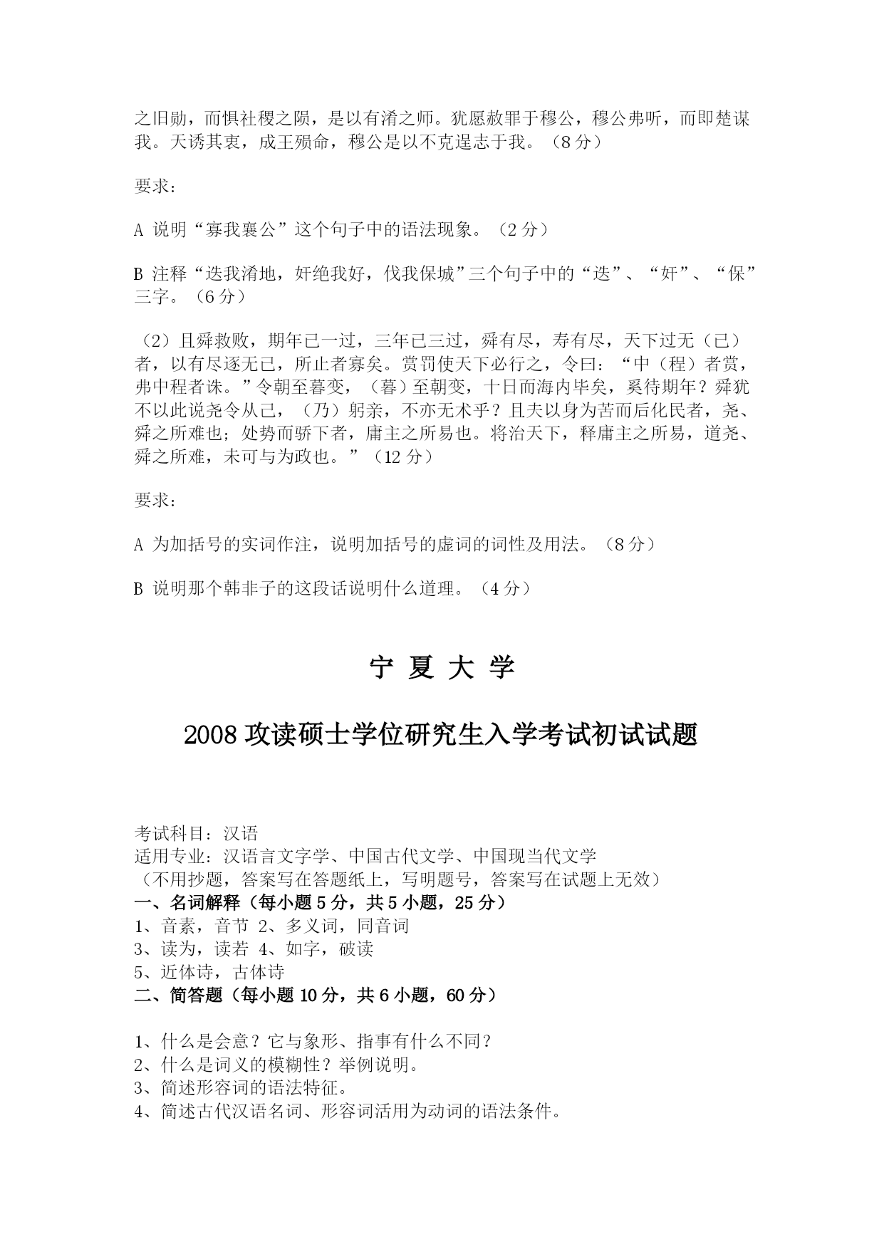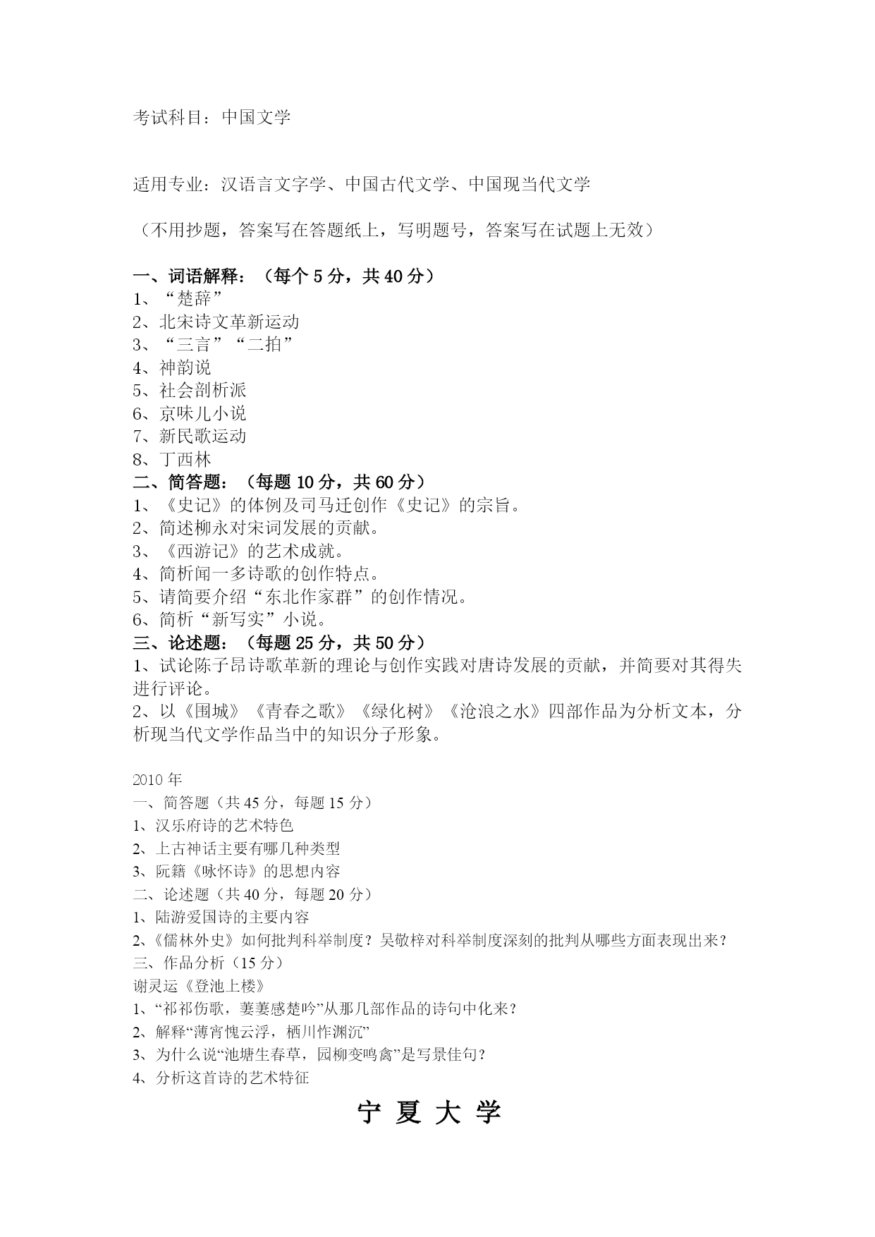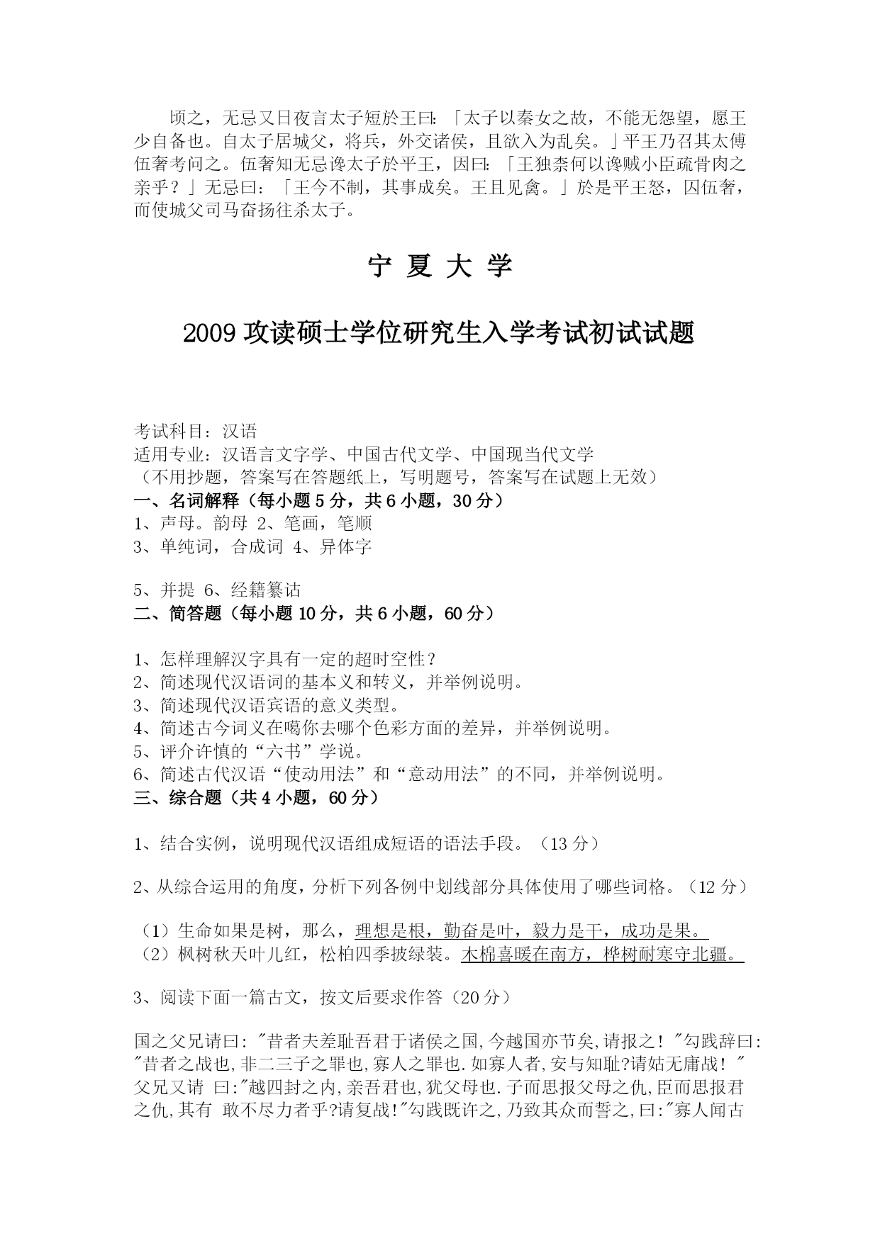 宁夏大学2007年攻读硕士学位研究生入学考试初试试题考试科目:中国文学适用专业:汉语言文字学、中国古代文学、中国现当代文学(不用抄题,答案写在答题纸上,写明题号,答案写在试题上无效)一、词语解释:(每个5分,共40分)1、风、雅、颂2、《淮南子》3、《救风尘》4、《三国演义》5、湖畔诗社6、华威先生7、加西亚•马尔克斯8、现实主义冲击波二、简答题:(每题10分,共60分)1、曹植诗歌受到后人推崇的主要原因。2、白居易《新乐府》的创作成就。3、桐城派及其文学主张。4、分析老通宝的形象5、《骆驼祥子》的“京味儿”表现在哪些方面?6、解释20世纪八十年代中国文坛的“先锋派”小说。三、论述题:(每题25分,共50分)1、在宋代三百多年间,词的发展大体经历了那几个阶段?2、“改造国民性”是20世纪中国文学的重要主题,请结合作品具体分析。宁夏大学2008年攻读硕士学位研究生入学考试初试试题考试科目:中国文学适用专业:汉语言文字学、中国古代文学、中国现当代文学(不用抄题,答案写在答题纸上,写明题号,答案写在试题上无效)一、词语解释(每个5分,共8个,40分)1、诗经2、初唐四杰3、江西诗派4、李梦阳与前七子5、九叶诗派6、《呼兰河传》7、巴尔加斯•略萨8、莫言的“感觉小说”二、简答题(每题10分,共6题,60分)1、什么是建安文学?对其基本情况作以说明。2、概括介绍关汉卿和他的杂剧创作。3、杜甫的诗歌被称为“诗史”,应当怎样理解?4、鲁迅在《灯下漫笔》中所提出的“三种时代”的内涵是什么?5、简要分析汪曾祺小说的创作特点。6、说出阿城的“三王”小说、王安忆的“三恋”小说以及铁凝的“三垛”小说。三、作品分析(25分)《定风波》苏轼(三月七日,沙湖道中遇雨,雨具先去,同行皆狼狈,余独不觉。已而遂晴,故作此。)莫听穿林打叶声。何妨吟啸且徐行。竹杖芒鞋轻胜马。谁怕。一蓑烟雨任平生。料峭春寒吹酒醒。微冷。山头斜阳却相迎。回首向来萧瑟处。归去。也无风雨也无晴。四、论述题(25分)论述20世纪90年代以来中国文学发展的新特点。宁夏大学2009年攻读硕士学位研究生入学考试初试试题考试科目:中国文学适用专业:汉语言文字学、中国古代文学、中国现当代文学(不用抄题,答案写在答题纸上,写明题号,答案写在试题上无效)一、词语解释:(每个5分,共40分)1、“楚辞”2、北宋诗文革新运动3、“三言”“二拍”4、神韵说5、社会剖析派6、京味儿小说7、新民歌运动8、丁西林二、简答题:(每题10分,共60分)1、《史记》的体例及司马迁创作《史记》的宗旨。2、简述柳永对宋词发展的贡献。3、《西游记》的艺术成就。4、简析闻一多诗歌的创作特点。5、请简要介绍“东北作家群”的创作情况。6、简析“新写实”小说。三、论述题:(每题25分,共50分)1、试论陈子昂诗歌革新的理论与创作实践对唐诗发展的贡献,并简要对其得失进行评论。2、以《围城》《青春之歌》《绿化树》《沧浪之水》四部作品为分析文本,分析现当代文学作品当中的知识分子形象。2010年一、简答题(共45分,每题15分)1、汉乐府诗的艺术特色2、上古神话主要有哪几种类型3、阮籍《咏怀诗》的思想内容二、论述题(共40分,每题20分)1、陆游爱国诗的主要内容2、《儒林外史》如何批判科举制度?吴敬梓对科举制度深刻的批判从哪些方面表现出来?三、作品分析(15分)谢灵运《登池上楼》1、“祁祁伤歌,萋萋感楚吟”从那几部作品的诗句中化来?2、解释“薄宵愧云浮,栖川怍渊沉”3、为什么说“池塘生春草,园柳变鸣禽”是写景佳句?4、分析这首诗的艺术特征宁夏大学2007年攻读硕士学位研究生入学考试初试试题考试科目:汉语适用专业:汉语言文字学、中国古代文学、中国现当代文学(不用抄题,答案写在答题纸上,写明题号,答案写在试题上无效)一、名词解释(每小题5分,共25分)1、音位、音位变体2、顶针、回环3、假借4、粘、对5、互文二、简答题(每小题10分,共60分)1、简述语音的生理属性2、划分词类的依据有哪些3、汉字形体的演变经历了那些字体4、“三十六字母”及“五音”“七音”5、举例说明词义的扩大、缩小、转移6、举例说明古汉语名词作状语的主要作用三、综合题(四个小题,共65分)1、请以例说明语法的性质(15分)2、请以例说明现代汉语的特点(15分)3、请给下面一段古文加上标点,并翻译为现代汉语(15分)灌将军夫者,颍阴人也。夫父张孟,尝为颍阴侯婴舍人,得幸,因进之至二千石,故蒙灌氏姓为灌孟。吴、楚反时,颍阴侯灌何为将军,属太尉,请灌孟为校尉。夫与千人与父俱。灌孟年老,颍阴侯彊请之,郁郁不得意。故战常陷坚,遂死吴军中。军法:“父子俱从军,有死事,得以丧归。”灌夫不肯随丧归,奋曰:“愿取吴王若将军头以报父之仇。”於是