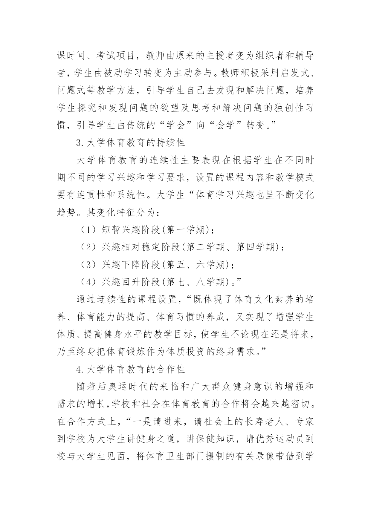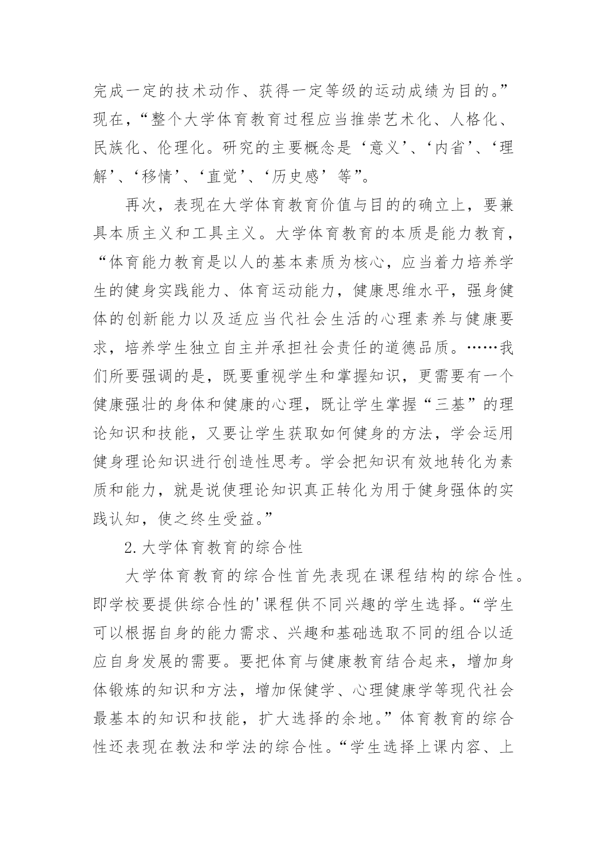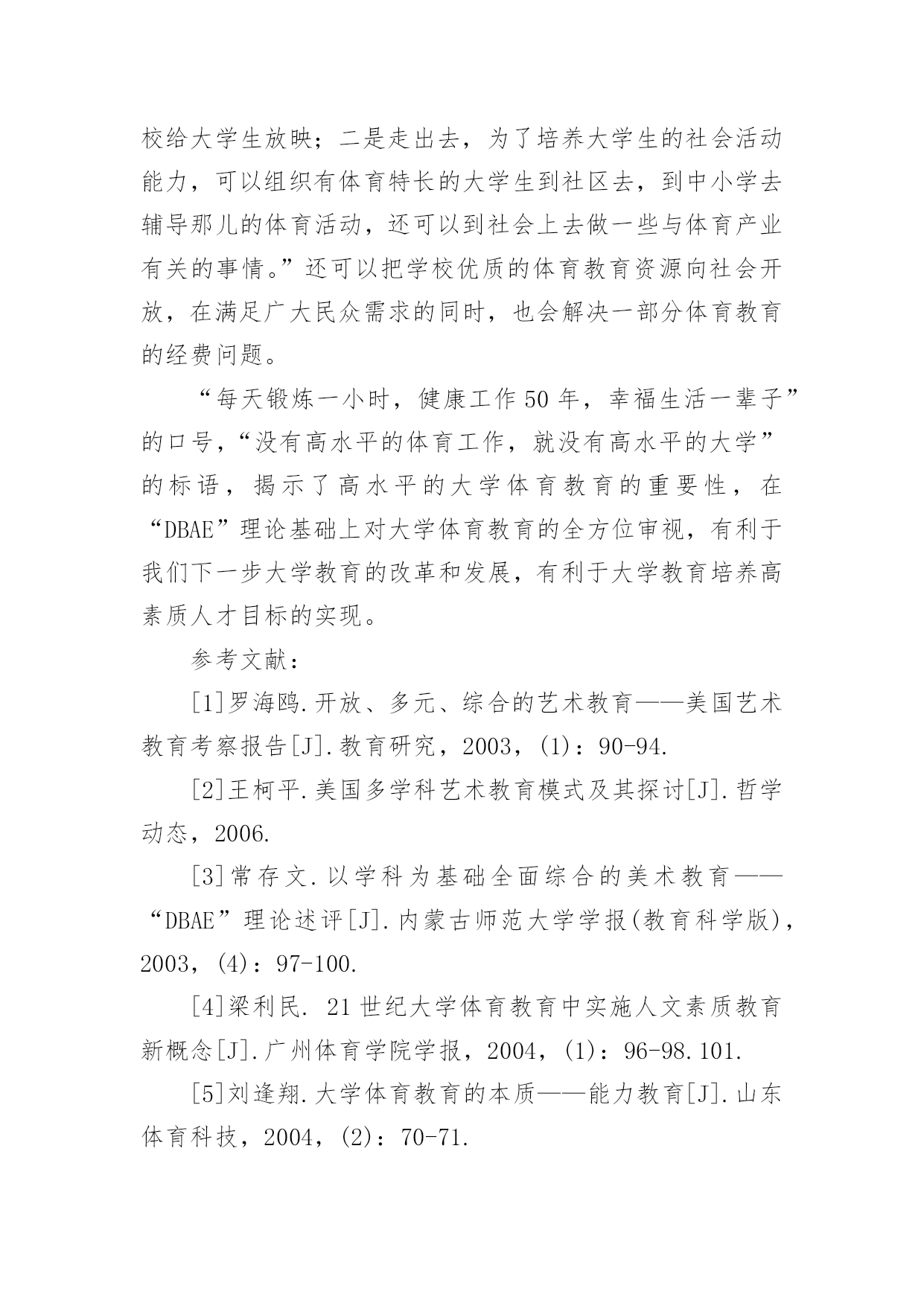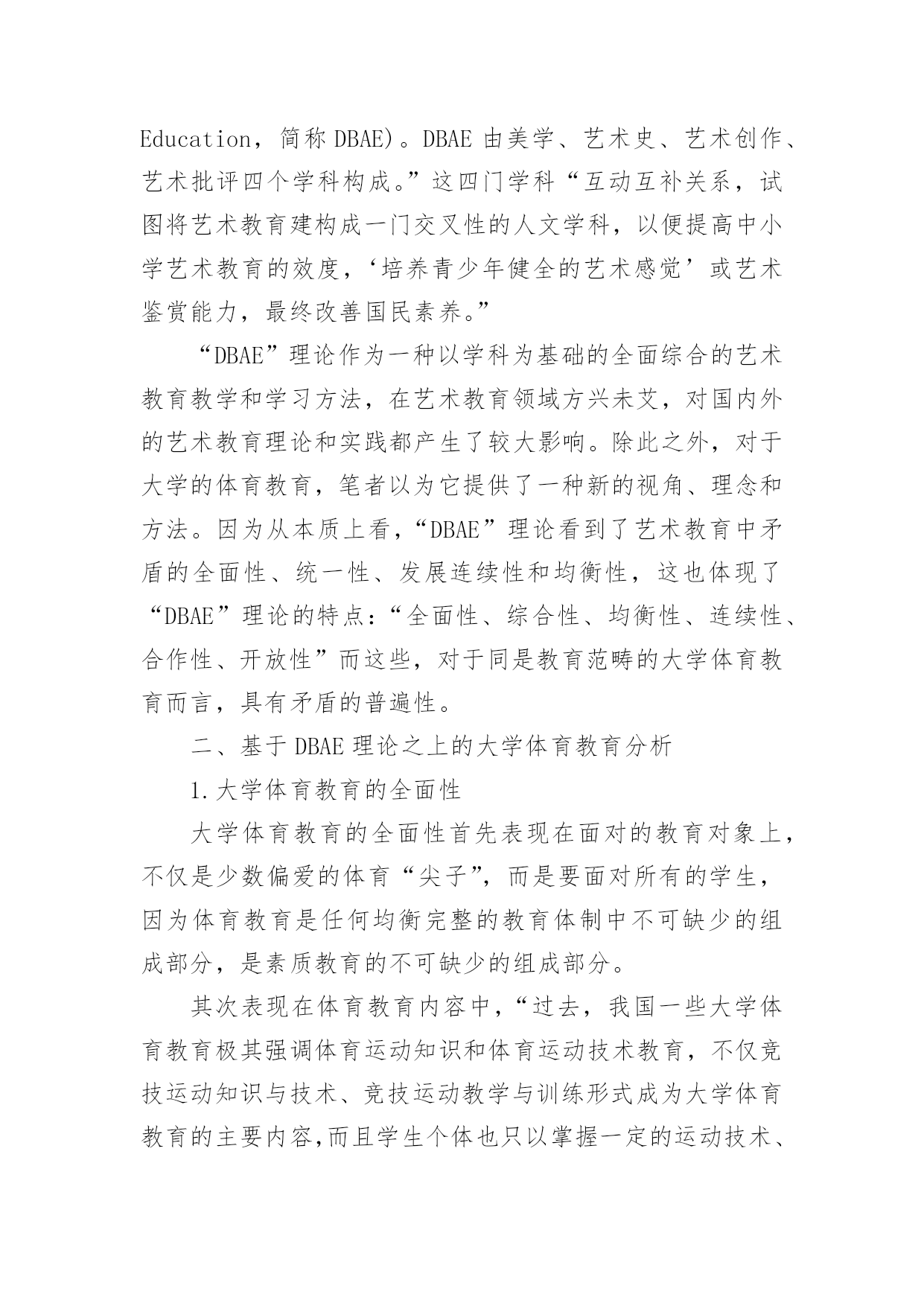 基于DBAE理论之上的大学体育教育论文【摘要】“DBAE”理论是一种以学科为基础的全面综合的艺术教育教学和学习方法,它体现了艺术教育中矛盾的全面性、统一性、发展连续性和均衡性,对于同是教育范畴的大学体育教育而言,具有矛盾的普遍性,因此,本文在分析“DBAE”理论基础上,对于大学体育教育进行全面综合分析,以期真正的实现大学体育教育的目的。【关键词】DBAE理论体育教育素质教育人文素养2002年8月教育部颁发的《全国普通高等院校体育课程教学指导纲要》,提出大学体育要建立“通过合理的体育教育和科学的锻炼过程,达到增强体质、增进健康和提高体育素养为主”的多目标体育教育,以满足学生个性发展的需要和社会发展的需要。这种教育目的的实现,要求用一种新的视角审视大学体育教育,本文试以“DBAE”理论为基础进行分析。一、“DBAE”理论及其思考“为了适应培养和发展创造力的时代要求,应对‘学科结构’课程改革运动对艺术教育严峻的生存挑战,美国加强了艺术教育理论和实践的研究,反思了过去以自我表现为中心的艺术教育,在‘艺术制作’的基础上增加了艺术史、艺术欣赏和艺术批评的知识,极大地扩充了艺术教学内容。在这个基础上,盖蒂艺术教育中心于20世纪80年代初正式提出了‘以学科为基础的艺术教育’(Disci-pline-BasedArtEducation,简称DBAE)。DBAE由美学、艺术史、艺术创作、艺术批评四个学科构成。”这四门学科“互动互补关系,试图将艺术教育建构成一门交叉性的人文学科,以便提高中小学艺术教育的效度,‘培养青少年健全的艺术感觉’或艺术鉴赏能力,最终改善国民素养。”“DBAE”理论作为一种以学科为基础的全面综合的艺术教育教学和学习方法,在艺术教育领域方兴未艾,对国内外的艺术教育理论和实践都产生了较大影响。除此之外,对于大学的体育教育,笔者以为它提供了一种新的视角、理念和方法。因为从本质上看,“DBAE”理论看到了艺术教育中矛盾的全面性、统一性、发展连续性和均衡性,这也体现了“DBAE”理论的特点:“全面性、综合性、均衡性、连续性、合作性、开放性”而这些,对于同是教育范畴的大学体育教育而言,具有矛盾的普遍性。二、基于DBAE理论之上的大学体育教育分析1.大学体育教育的全面性大学体育教育的全面性首先表现在面对的教育对象上,不仅是少数偏爱的体育“尖子”,而是要面对所有的学生,因为体育教育是任何均衡完整的教育体制中不可缺少的组成部分,是素质教育的不可缺少的组成部分。其次表现在体育教育内容中,“过去,我国一些大学体育教育极其强调体育运动知识和体育运动技术教育,不仅竞技运动知识与技术、竞技运动教学与训练形式成为大学体育教育的主要内容,而且学生个体也只以掌握一定的运动技术、完成一定的技术动作、获得一定等级的运动成绩为目的。”现在,“整个大学体育教育过程应当推崇艺术化、人格化、民族化、伦理化。研究的主要概念是‘意义’、‘内省’、‘理解’、‘移情’、‘直觉’、‘历史感’等”。再次,表现在大学体育教育价值与目的的确立上,要兼具本质主义和工具主义。大学体育教育的本质是能力教育,“体育能力教育是以人的基本素质为核心,应当着力培养学生的健身实践能力、体育运动能力,健康思维水平,强身健体的创新能力以及适应当代社会生活的心理素养与健康要求,培养学生独立自主并承担社会责任的道德品质。……我们所要强调的是,既要重视学生和掌握知识,更需要有一个健康强壮的身体和健康的心理,既让学生掌握“三基”的理论知识和技能,又要让学生获取如何健身的方法,学会运用健身理论知识进行创造性思考。学会把知识有效地转化为素质和能力,就是说使理论知识真正转化为用于健身强体的实践认知,使之终生受益。”2.大学体育教育的综合性大学体育教育的综合性首先表现在课程结构的综合性。即学校要提供综合性的'课程供不同兴趣的学生选择。“学生可以根据自身的能力需求、兴趣和基础选取不同的组合以适应自身发展的需要。要把体育与健康教育结合起来,增加身体锻炼的知识和方法,增加保健学、心理健康学等现代社会最基本的知识和技能,扩大选择的余地。”体育教育的综合性还表现在教法和学法的综合性。“学生选择上课内容、上课时间、考试项目,教师由原来的主授者变为组织者和辅导者,学生由被动学习转变为主动参与。教师积极采用启发式、问题式等教学方法,引导学生自己去发现和解决问题,培养学生探究和发现问题的欲望及思考和解决问题的独创性习惯,引导学生由传统的“学会”向“会学”转变。”3.大学体育教育的持续性大学体育教育的连续性主要表现在根据学生在不同时期不同的学习兴趣和学习要求,设置的课程内容和教学模式要有连贯性和系统性。大学生“体育学习兴趣也呈不断变化趋势。其变化特征分为:(1)短暂兴趣阶段(第一学期);(2)兴趣相对稳定阶段(第二学期、第四学期);(3)