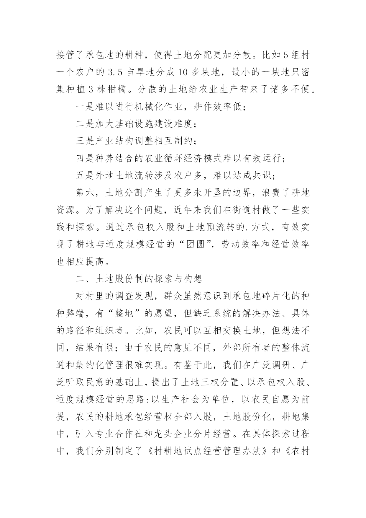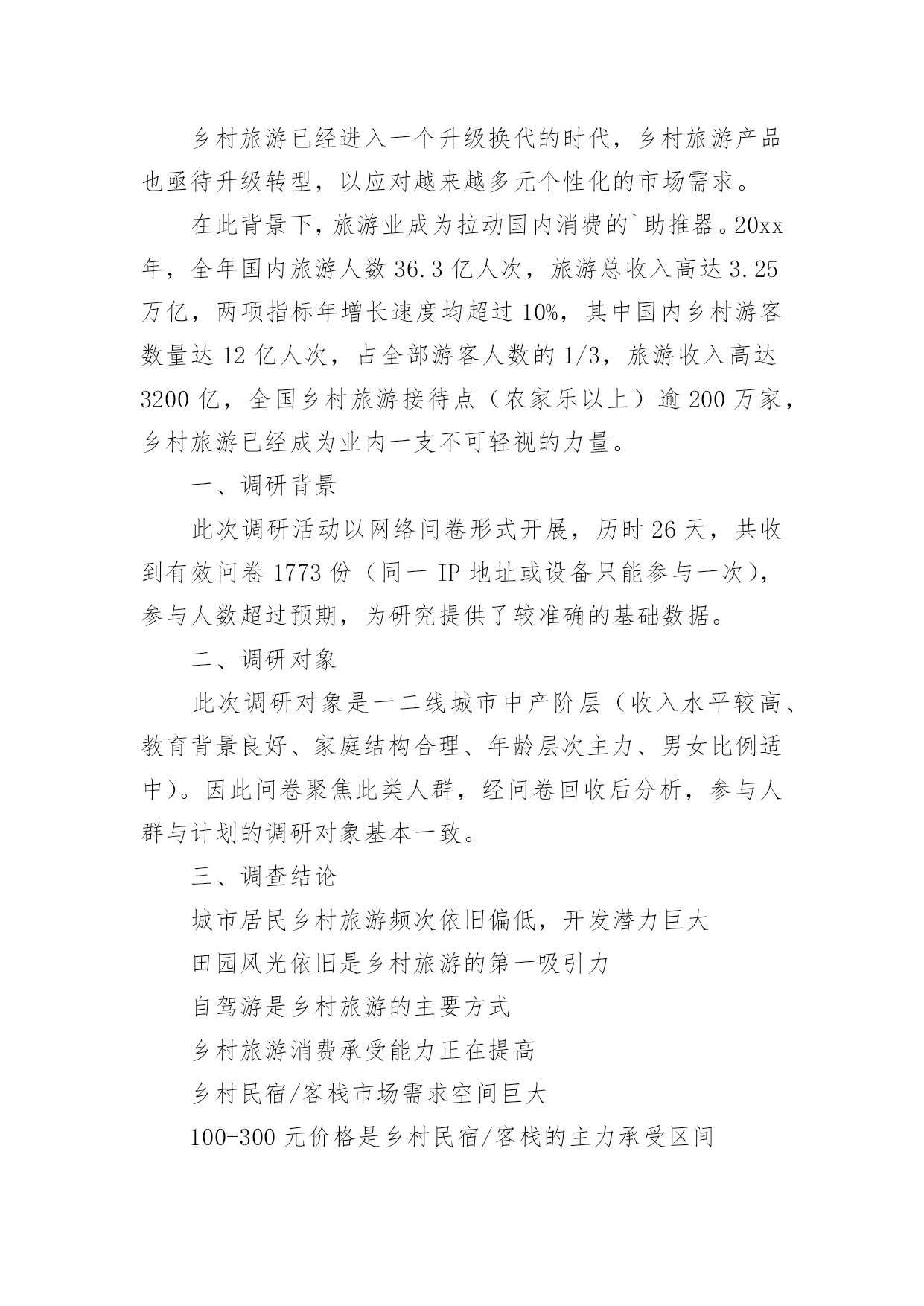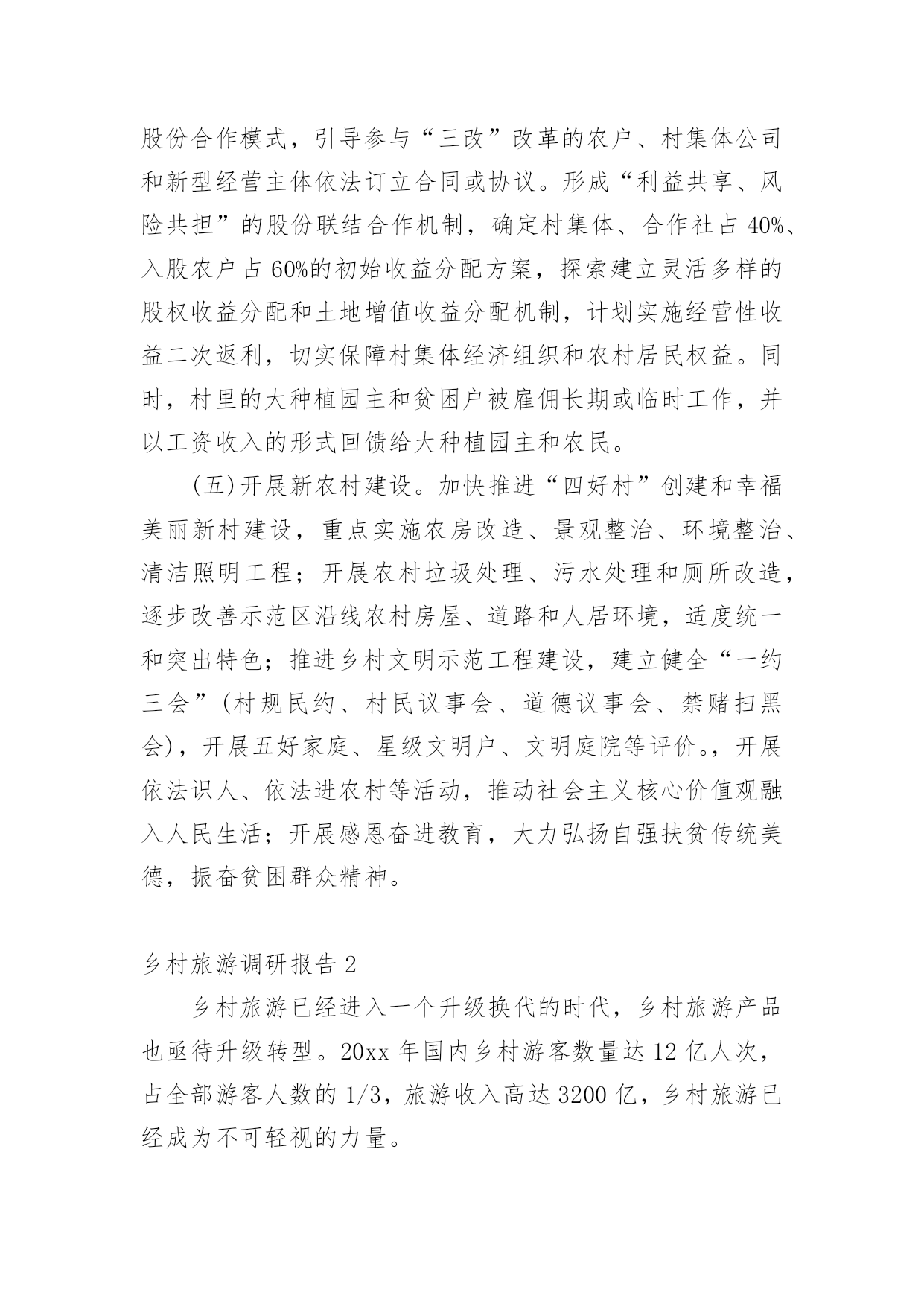 乡村旅游调研报告随着个人的文明素养不断提升,报告的适用范围越来越广泛,通常情况下,报告的内容含量大、篇幅较长。我们应当如何写报告呢?以下是小编为大家整理的乡村旅游调研报告,仅供参考,欢迎大家阅读。乡村旅游调研报告1家庭联产承包责任制是以坚持农村土地集体所有制和家庭承包经营为前提的基本经济制度。它极大地释放了农民的潜力,深刻地改变了中国农村的面貌。然而,随着农村劳动力的老龄化和减少,农村土地碎片化和碎片化、土地产出效率低下等问题逐渐凸显,逐渐落后于现代农业的要求,成为乡村振兴的一道坎。近年来,我们围绕实施农业农村改革,正确处理农民与土地的关系,通过土地权利分离、承包经营权入股、适度规模经营、创新管理体制等方式,在街道村进行了一些实践和探索。一、农村土地承包经营的现状与问题街村位于街道北侧,距市区2.5公里。有7个村民小组,519户,农业人口1781人。现有耕地面积1947亩,人均耕地约1.09亩。农村家庭联产承包责任制实施之初,为了体现公平原则,对耕地进行了分等配建,将整块土地切割成若干小块分给农民,导致每户承包的耕地分散分配。随着城市化进程的加快,农村外出务工人员增多,家里的“留守农民”接管了承包地的耕种,使得土地分配更加分散。比如5组村一个农户的3.5亩旱地分成10多块地,最小的一块地只密集种植3株柑橘。分散的土地给农业生产带来了诸多不便。一是难以进行机械化作业,耕作效率低;二是加大基础设施建设难度;三是产业结构调整相互制约;四是种养结合的农业循环经济模式难以有效运行;五是外地土地流转涉及农户多,难以达成共识;第六,土地分割产生了更多未开垦的边界,浪费了耕地资源。为了解决这个问题,近年来我们在街道村做了一些实践和探索。通过承包权入股和土地预流转的.方式,有效实现了耕地与适度规模经营的“团圆”,劳动效率和经营效率也相应提高。二、土地股份制的探索与构想对村里的调查发现,群众虽然意识到承包地碎片化的种种弊端,有“整地”的愿望,但缺乏系统的解决办法、具体的路径和组织者。比如,农民可以互相交换土地,但想法不同,结果有限;由于农民的意见不同,外部所有者的整体流通和集约化管理很难实现。有鉴于此,我们在广泛调研、广泛听取民意的基础上,提出了土地三权分置、以承包权入股、适度规模经营的思路:以生产社会为单位,以农民自愿为前提,农民的耕地承包经营权全部入股,土地股份化,耕地集中,引入专业合作社和龙头企业分片经营。在具体探索过程中,我们分别制定了《村耕地试点经营管理办法》和《农村土地承包经营权预流转协议》,组织街道、村干部成立工作小组,通过宣传动员与村民达成共识,在不改变土地农业用途的前提下,以书面协议形式将土地经营权全部委托给所属村民小组,村民小组、村集体资产公司完善持股相关程序,实现土地规范化整理、规模化经营。三、土地股份制的实践和成效为实施乡村振兴战略,支持村集体经济发展,街道将该村作为试点村。通过盘活农村资产资源,吸引民间投资,以村集体资产公司为主要载体,建立“公司+合作社+农户”互利共赢的产业发展模式,大力发展血橙基地,有效提升村集体经济发展水平,切实增加农民收入。(一)实行三权分立。农村承包地确权发证后,推进土地股份制改革,必须坚持推进“三权分立并行”,实行集体所有制,坚持农村土地不可动摇的集体所有制,这是进行土地股份制改革的前提。在实践中,应稳定农民的承包权,赋予农民对承包地的占有、使用和收益等用益物权。放开土地经营权,创新土地经营权流转模式,将土地经营权由农民一次性租赁流转为股份制经营、合作经营等土地经营权入股,形成农村土地集体所有、家庭承包、多种经营的新型农业经营机制。(二)规范资源管理。xx年,街岛村注册成立城市社区集体资产管理有限公司,对现有的山坪塘、渠道、灌溉站、村道、村级公益房等集体资源进行资产核实,通过回收零散集体资产,对村级“三资”进行集约化、规范化管理。确认村集体经济共有人,为下一步村集体收入分配提供依据。按照“村集体公司+专业合作社+农户”的思路,农户入股拥有土地承包经营权的村集体公司,集体公司聘请专业合作社和农村经纪人负责生产经营。通过村集体资源资产转股,定量成立村集体公司,整合上级财政扶持资金,吸纳民间资金,实现村集体公司、专业合作社、农户三方合作、互利共赢。(3)培育主导产业。一是以区内大型绿化行动项目(混交林)为支撑,通过新苗、嫁接等方式,标准化种植1000亩塔罗科。注入社会资本,完成“霍尔山牌”血橙商标注册,通过电商平台进行前期市场拓展和销售。二是种植蔬菜、芽菜等。林下,并与公司签订蔬菜收购合同,在城郊城市培育平价蔬菜基地。三是发展特色水产品和肉牛生态养殖,利用嘉龙竹木合作社竹笋加工废弃物作为牛饲料,利用牛粪作为有机肥料种植血橙,实现种养结合、种养循环。四是培育发展休闲农业主业,结合血橙、蔬菜种植、有