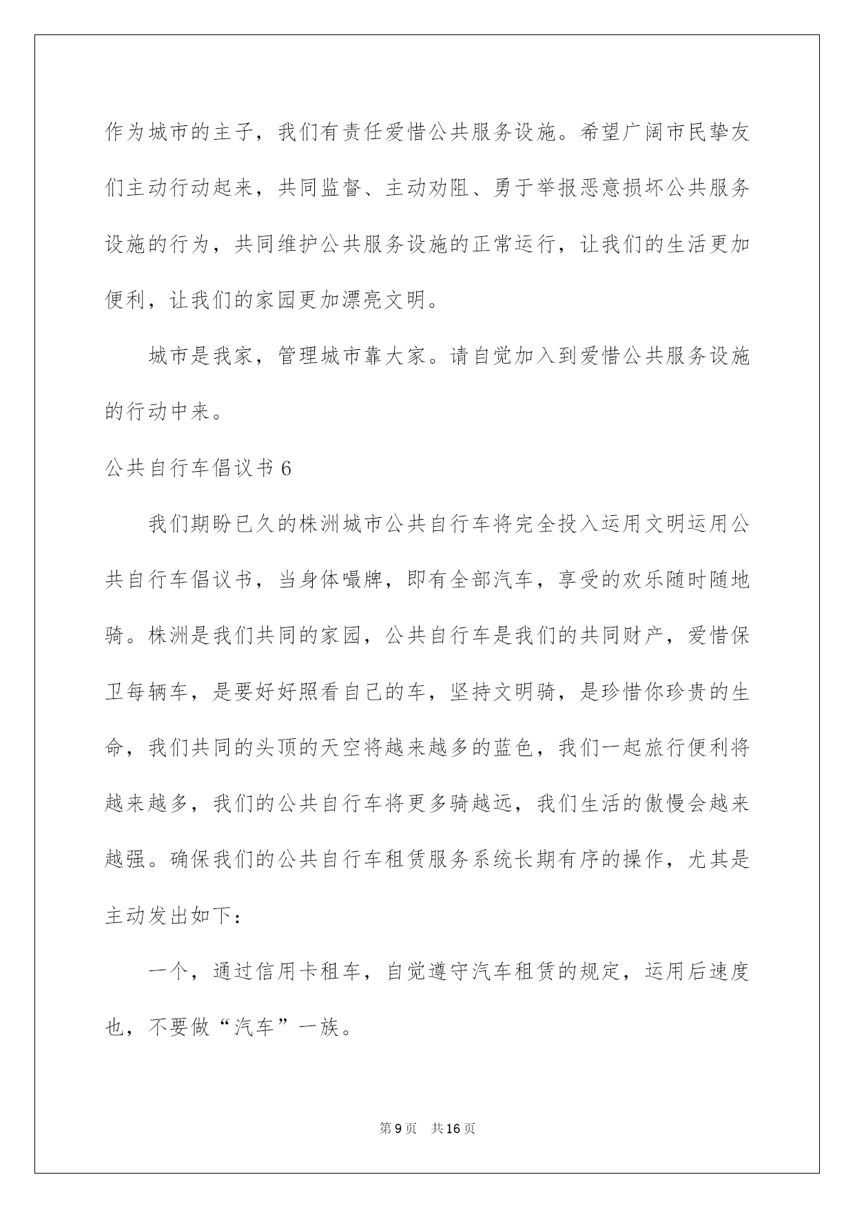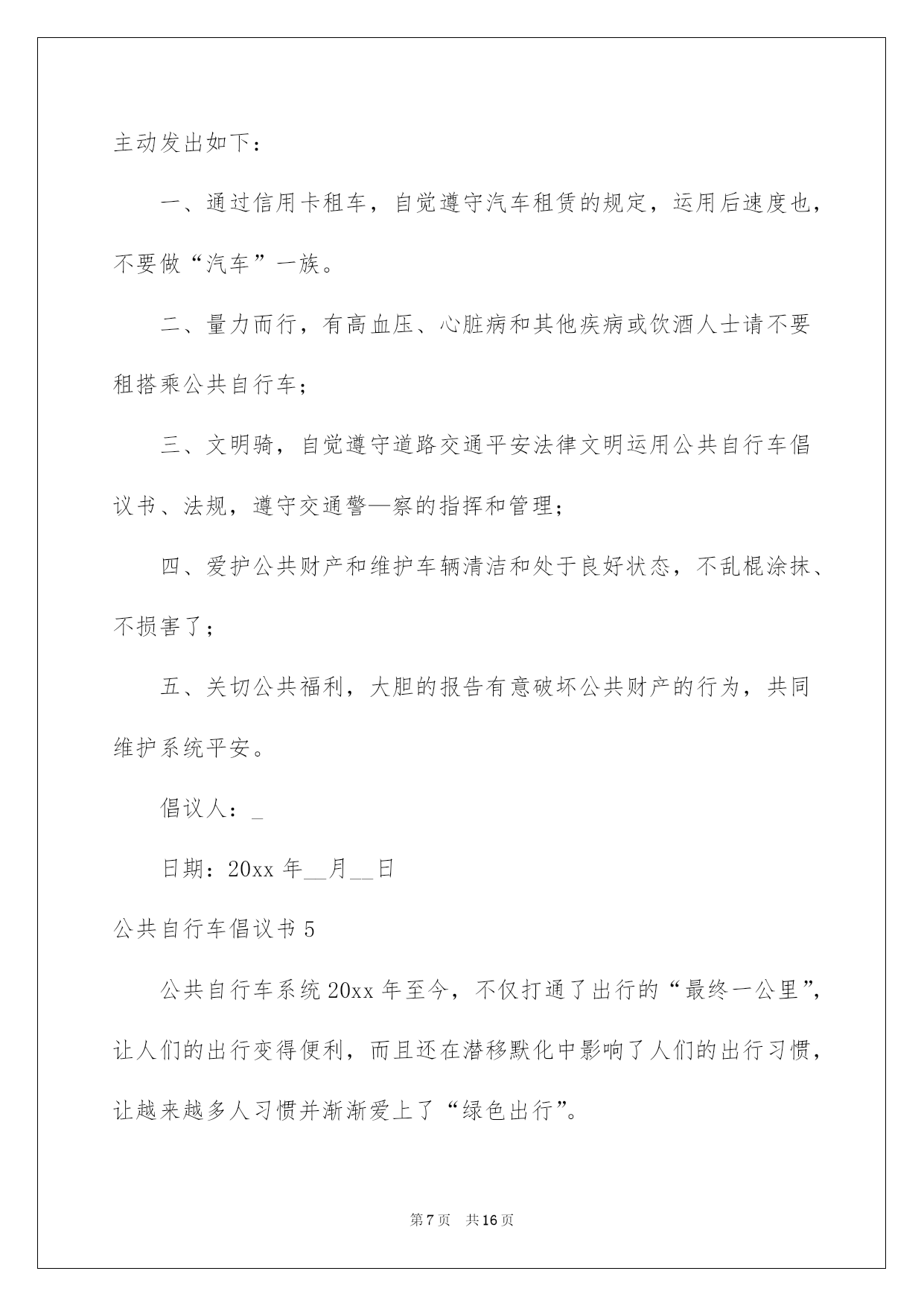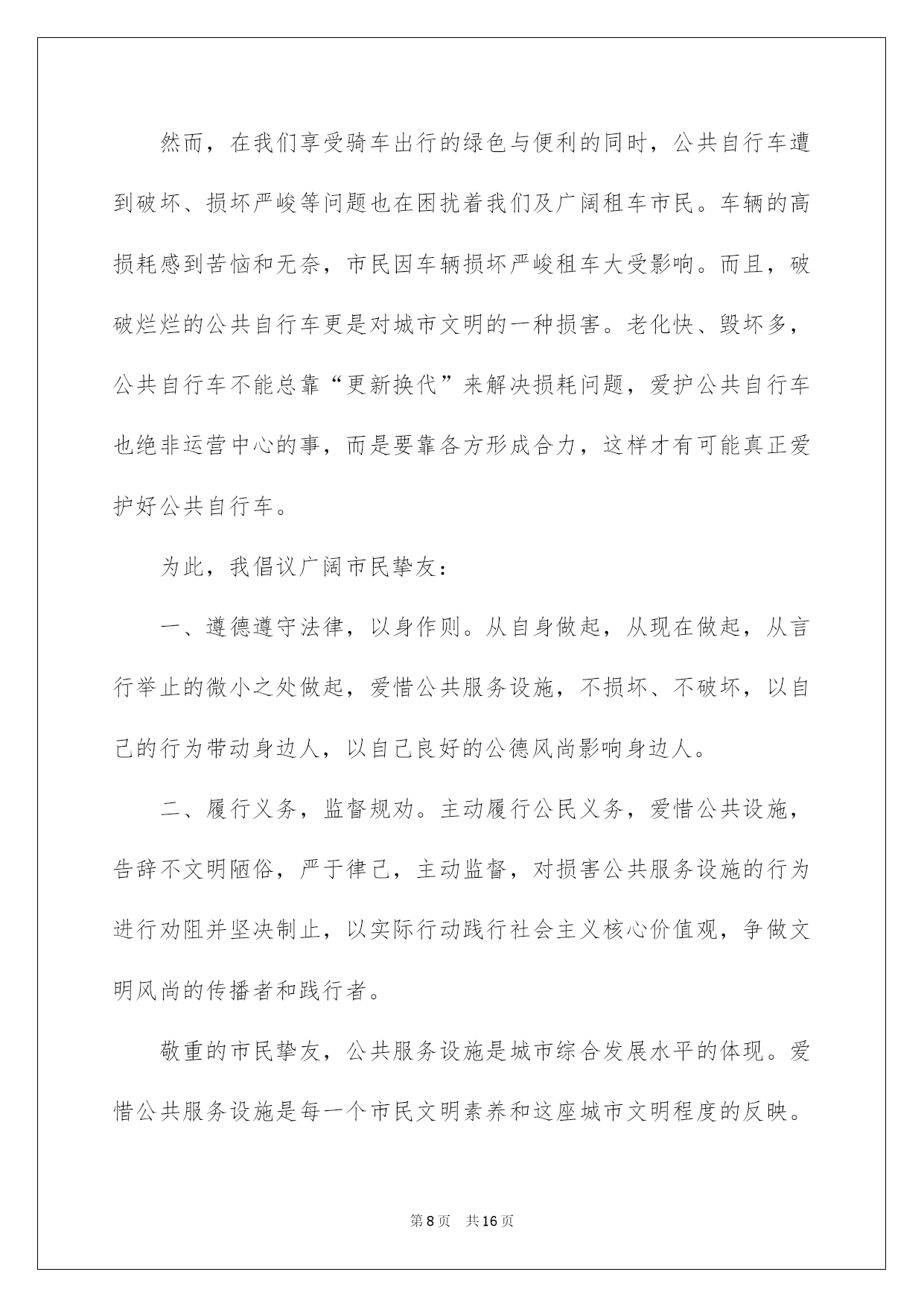 第PAGE\*Arabic\*MERGEFORMAT16页共NUMPAGES\*Arabic\*MERGEFORMAT16页第PAGE\*MERGEFORMAT16页共NUMPAGES\*MERGEFORMAT16页第PAGE\*MERGEFORMAT16页共NUMPAGES\*MERGEFORMAT16页第PAGE\*MERGEFORMAT16页共NUMPAGES\*MERGEFORMAT16页第PAGE\*MERGEFORMAT16页共NUMPAGES\*MERGEFORMAT16页第PAGE\*MERGEFORMAT16页共NUMPAGES\*MERGEFORMAT16页第PAGE\*MERGEFORMAT16页共NUMPAGES\*MERGEFORMAT16页第PAGE\*MERGEFORMAT16页共NUMPAGES\*MERGEFORMAT16页第PAGE\*MERGEFORMAT16页共NUMPAGES\*MERGEFORMAT16页第PAGE\*MERGEFORMAT16页共NUMPAGES\*MERGEFORMAT16页第PAGE\*MERGEFORMAT16页共NUMPAGES\*MERGEFORMAT16页2022公共自行车倡议书公共自行车倡议书在现在社会,倡议书的运用越来越广泛,倡议书具有广泛的群众性的特征。那么,怎么去写倡议书呢?以下是我收集整理的公共自行车倡议书,希望能够帮助到大家。公共自行车倡议书1敬爱的各位:xx市公共自行车租赁系统在大家的期盼和关切中已正式启动,五百个租赁点、万余辆自行车,只需一张卡,便可随时随地享受骑行的欢乐。公共自行车系统的建成启用,给半城山半城水的xx又增加了一道靓丽的流淌风景线,也给在这片乐土上创业、生活的人们增加了一份共同的财宝,为了我们的公共自行车可以越骑越远,确保我市公共自行车租赁服务系统长期有序运营,特发出如下文明骑行倡议:一、凭卡租车,自觉遵守租车规定,用后速还,不做“霸车”一族;二、量力而行,患有高血压、心脏病等疾病或醉酒人士请不要租骑公共自行车;三、文明骑行,自觉遵守道路交通平安法规,听从交警的指挥和管理;四、爱惜公物,维护车辆整齐、完好,不乱贴乱画,不损坏遗失,更不能恶意破坏;五、关切公益,大胆举报有意破坏公共财物行为,共同维护系统平安。此致敬礼xxx20xx年xx月xx日公共自行车倡议书2广阔市民挚友们:蔚蓝的天空,清爽的空气,健壮的体魄,便利快捷的出行,这是我们所追求和憧憬的。然而当我们城市里穿行的汽车越来越多,道路显得越来越狭窄时;当路上花费的时间越来越多,出行不再便捷时;当汽车尾气对大气环境污染越来越多严峻,阴霾不断时;当每天进出医院,身体大不如从前时——我们要思索、变更我们的自身行为、重新考虑出行方式,我们急需建立一种自然、绿色、健康的低碳生活方式。为进一步普及和弘扬自行车文化,提倡全民科学环保健身理念,探究绿色、低碳公共交通发展模式,缓解城市交通压力,推动国家5a级景区和全国文明县城创建进程,经县政府探讨,在县城威远镇主城区启动实施公共自行车服务系统建设,为威远古镇的发展和旺盛又添上一道绚丽的色调。骑上自行车,我们可以放慢脚步,零距离感受威远古镇的古朴和精致;骑上自行车,可以增加体魄,提升自己与家人的健康生活品质;骑上自行车,可以磨练坚忍不拔、勇攀高峰的坚韧意志;骑上自行车,可以互助互爱,共同担当风雨的洗礼,一起享受运动带来的欢乐!现如今,自行车已经成为人们不行缺少的健身强体运动,成为人们提升生活水平和生活品质的重要内容。自行车运动以其“流淌、流行、流畅”和低碳、环保、绿色的特点迎合了现代社会的健康生活理念。骑自行车出行、观光、旅游、上下班等是发达国家民众的一种优先选择,通过自行车运动节能减排,没有私家车和公交的拥挤,田间地头、乡村小道、城市街道、郊外名胜……到处皆是运动场,我骑行、我运动、我健康、我欢乐!每次骑行都将为我们带来一份运动的胜利感,带来一份健身的欢乐感。互助公共智能自行车一期项目在中心城区建设20个网点,运营300辆公共自行车,发放1万张以上公共自行车租车卡,市民凭身份证等有效证件到县公共自行车运营中心办理租车卡,可享受县政府补贴低价收费骑行,通过刷卡租用自行车,在任何一个站点实现通租通还。该系统将于7月10日正式启动,即日起起先办理公共自行车租车卡。计费标准为:1小时内收费1元,1小时至1.5小时2元,1.5小时至2小时3元,2小时至2.5小时4元,2.5小时以上每小时5元,超过24小时,每小时30元,最高收费1500元。市民在办卡时需缴纳300元押金、100元消费充值金