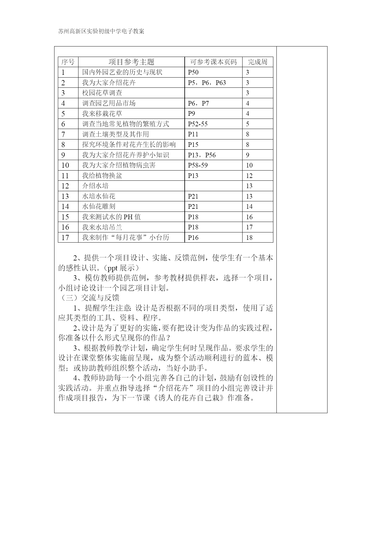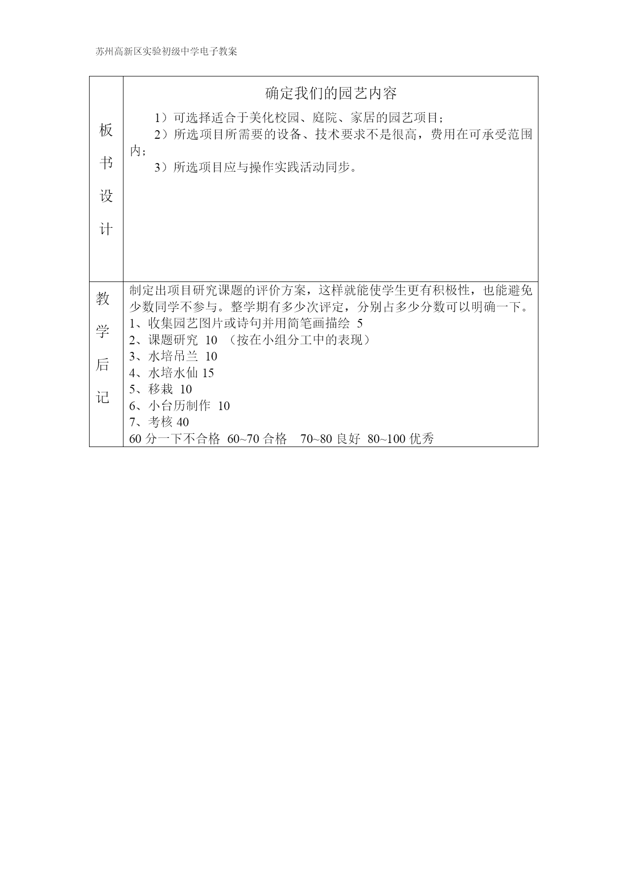 苏州高新区实验初级中学电子教案教学课题走进园艺世界——确定我们的园艺内容本课题教时数2本教时为第2教时教学目标知识目标通过课后小组研究性学习了解花卉生长、养护、栽培及花卉业的发展等理论知识,为实践作准备。能力目标通过小组协商确定研究课题,培养合作能力;能对确立的目标进行合理的计划。情感目标培养合作精神;激发学生了解园艺、喜欢园艺、乐于参加、愿意设计并实施的情感。教学重点各小组选定研究项目;提供“我为大家介绍园艺工具”ppt展示使学生对项目汇报有感性认识。教学难点各小组充分明确所选项目的研究内容,并在课上设定好实施计划,进行分工。教学用具教学程序备注(一)作品反馈展示“议事园”栏中大家的作品,先小组交流,推荐一至两份作品再在班级范围内交流。最后评出最佳图片和最佳阐述,而交流作品可以建议学生布置班队角、橱窗、小报等。教师本身也可以搜集一部分园艺作品、照片和学生互动、交流,激起学生对园艺美的情绪。(二)确定我们的园艺项目。1、请学生通览教材,假设性的提出一个园艺项目,参考课本要求考虑的三个方面共同讨论其是否可行。1)可选择适合于美化校园、庭院、家居的园艺项目;2)所选项目所需要的设备、技术要求不是很高,费用在可承受范围内;3)所选项目应与操作实践活动同步。根据教材项目相关内容,列出可参考选择项目课题如下,印发清单让学生选择。序号项目参考主题可参考课本页码完成周1国内外园艺业的历史与现状P5032我为大家介绍花卉P5,P6,P6333校园花草调查34调查园艺用品市场P6,P745我来移栽花草P946调查当地常见植物的繁殖方式P52-5557调查土壤类型及其作用P1188探究环境条件对花卉生长的影响P1589我为大家介绍花卉养护小知识P13,P56910我为大家介绍植物病虫害P58-591011我给植物换盆P131212介绍水培1313水培水仙花P211314水仙花雕刻P211415我来测试水的PH值P181616我来水培吊兰P181717我来制作“每月花事”小台历P16182、提供一个项目设计、实施、反馈范例,使学生有一个基本的感性认识。(ppt展示)3、模仿教师提供范例,参考教材提供样表,选择一个项目,小组讨论设计一个园艺项目计划。(三)交流与反馈1、提醒学生注意:设计是否根据不同的项目类型,使用了适应其类型的工具、资料、程序。2、设计是为了更好的实施,要有把设计变为作品的实践过程,你准备以什么形式呈现你的作品?3、根据教师教学计划,确定学生何时呈现作品。要求学生的设计在课堂整体实施前呈现,成为整个活动顺利进行的蓝本、模型;或协助教师组织整个活动,当好小助手。4、教师协助每一个小组完善各自己的计划,鼓励有创设性的实践活动。并重点指导选择“介绍花卉”项目的小组完善设计并作成项目报告,为下一节课《诱人的花卉自己栽》作准备。板书设计确定我们的园艺内容1)可选择适合于美化校园、庭院、家居的园艺项目;2)所选项目所需要的设备、技术要求不是很高,费用在可承受范围内;3)所选项目应与操作实践活动同步。教学后记制定出项目研究课题的评价方案,这样就能使学生更有积极性,也能避免少数同学不参与。整学期有多少次评定,分别占多少分数可以明确一下。收集园艺图片或诗句并用简笔画描绘5课题研究10(按在小组分工中的表现)水培吊兰10水培水仙15移栽10小台历制作10考核4060分一下不合格60~70合格70~80良好80~100优秀
