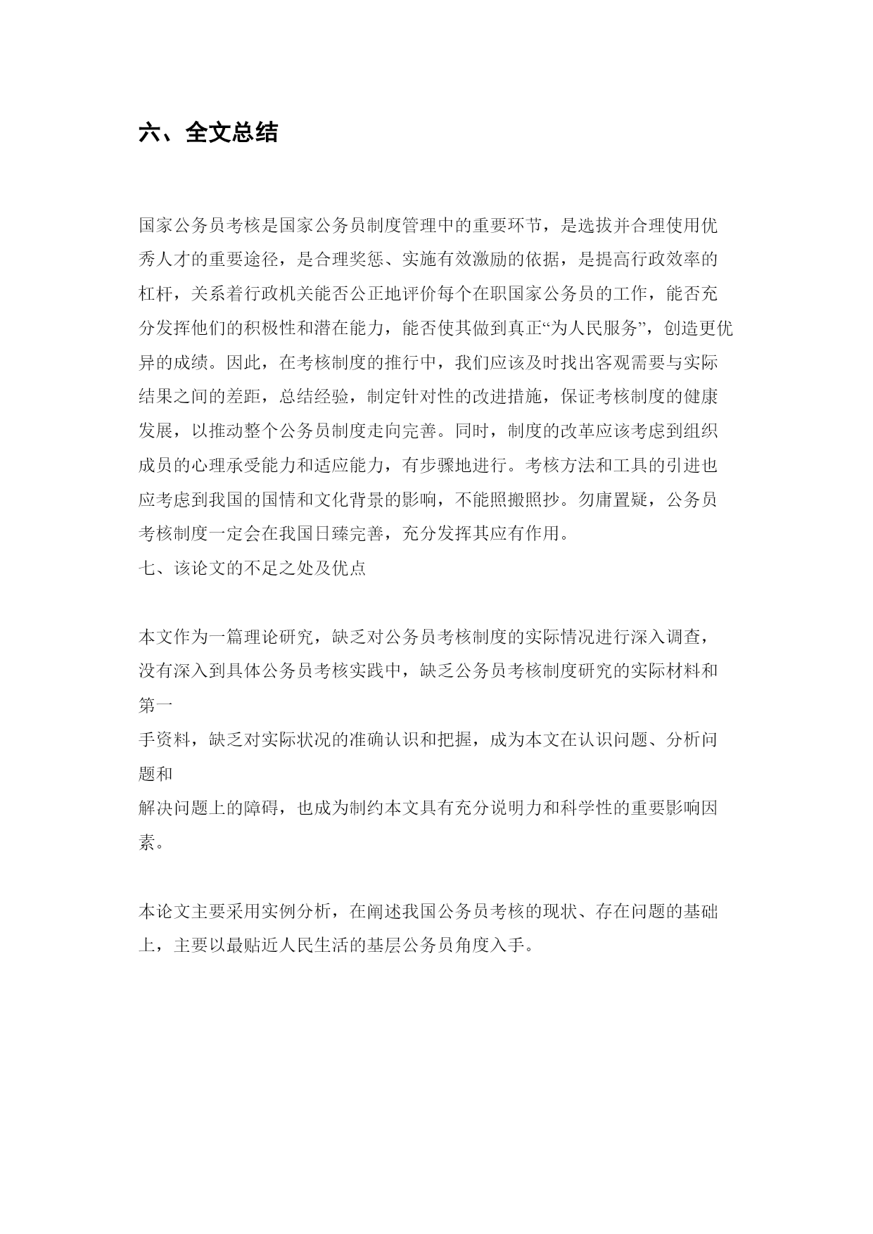 一、论文的研究背景由于我国公务员考核制度是在继承和发展原有干部考核制度基础上建立起来的,公务员规范考核的时间不长,并受到传统文化等影响和制约,致使公务员考核存在诸多问题,如考核指标设计客观化不够、考核执行不力、考核程序不规范、考核结果运用不当等问题。“公务员作为政府工作人员,是党的路线、方针、政策和国家法律法规的具体执行者,担负着社会主义现代化建设的规划、组织和领导的重要责任,是国家重要的人才资源”。现如今在加强基层公务员法纪法律教育和思想道德规范的同时,也不能忽视队伍建设的重要性,基层公务员队伍建设的关键就在于建立行之有效的绩效考核规范,明晰行政效能问责制度。二、论文研究意义基层公务员绩效考核贯穿政府行政管理的整个体系脉络,十七届四中全会报告“树立科学发展观和正确的政绩观”等主导理念由输出转入执行阶段,促使公务员绩效考核制度的价值取向也发生预定的转轨,成为统领管理全局的基础起点。现阶段完善基层公务员绩效考核制度,具有重要的现实意义。从微观上说,通过绩效考核可以举贤纳士,净化基层行政环境,履行能上能下的政府内审力,激发基层公务员的积极主动性,以寻求基层行政机关主导范式的良性发展。而宏观方面则不得不联系我国当前发展的社会背景,完善基层公务员绩效考核制度既符合和谐社会建设的整体目标,又可以推动效能政府的发展,还能有效预防和监督腐败寻租行为,加快行政管理体制改革的进程,提高政府成效。三、研究目标结合我国的基层公务员考核现状的实际情况,提出一些创新想法,才能保障我国基层公务员绩效考核制度的进一步完善,保证基层公务员队伍建设的高效、廉洁和队伍整体综合素质水平的提升。四、论文的结构和主要内容第一部分公务员考核概述。对本研究的主要概念进行界定,HYPERLINK\l"_Toc326159910"基层公务员及基层公务员考核制度的概念、发展历程和HYPERLINK\l"_Toc326159913"基层公务员考核制度中的绩效考核进行了阐述。第二部分公务员考核指标的现状。主要阐述公务员考核制度的现实情况,具体把握公务员考核制度所表现出的问题。第三部分公务员考核制度存在的问题。从不同角度进行分析和探究,提出了以下六个问题:HYPERLINK\l"_Toc326159918"(1)考核内容空泛,难细化,不科学;(2)HYPERLINK\l"_Toc326159920"绩效考核的标准一样,考核过程流于形式;(3)HYPERLINK\l"_Toc326159921"考核激励不健全HYPERLINK\l"_Toc326159922"考核;(4)结果的反馈和运用不足;(5)HYPERLINK\l"_Toc326159923"绩效考核法律法规体系不够健全;(6)HYPERLINK\l"_Toc326159924"忽视平时考核,年度考核多取决于上级主观印象。第四部分完善公务员考核制度的对策。在第三部分问题的基础上,提出了完善公务员考核制度的对策和建议,指出从操作层面和体制层面两方面共同进行。如加强公务员考核指标的科学量化;注重考核指标的全面性、有效性;加快政府行政理念和职能转变;加强相关制度的完善等。自己研究的成果笔者再根据我国基层公务员考核制度现状的基础上,提出了一系列改进我国基层公务员考核制度的对策。力求提出有实用价值的较为科学合理的考核办法,更好地推动公务员考核工作的开展。六、全文总结国家公务员考核是国家公务员制度管理中的重要环节,是选拔并合理使用优秀人才的重要途径,是合理奖惩、实施有效激励的依据,是提高行政效率的杠杆,关系着行政机关能否公正地评价每个在职国家公务员的工作,能否充分发挥他们的积极性和潜在能力,能否使其做到真正“为人民服务”,创造更优异的成绩。因此,在考核制度的推行中,我们应该及时找出客观需要与实际结果之间的差距,总结经验,制定针对性的改进措施,保证考核制度的健康发展,以推动整个公务员制度走向完善。同时,制度的改革应该考虑到组织成员的心理承受能力和适应能力,有步骤地进行。考核方法和工具的引进也应考虑到我国的国情和文化背景的影响,不能照搬照抄。勿庸置疑,公务员考核制度一定会在我国日臻完善,充分发挥其应有作用。七、该论文的不足之处及优点本文作为一篇理论研究,缺乏对公务员考核制度的实际情况进行深入调查,没有深入到具体公务员考核实践中,缺乏公务员考核制度研究的实际材料和第一手资料,缺乏对实际状况的准确认识和把握,成为本文在认识问题、分析问题和解决问题上的障碍,也成为制约本文具有充分说明力和科学性的重要影响因素。本论文主要采用实例分析,在阐述我国公务员考核的现状、存在问题的基础上,主要以最贴近人民生活的基层公务员角度入手。