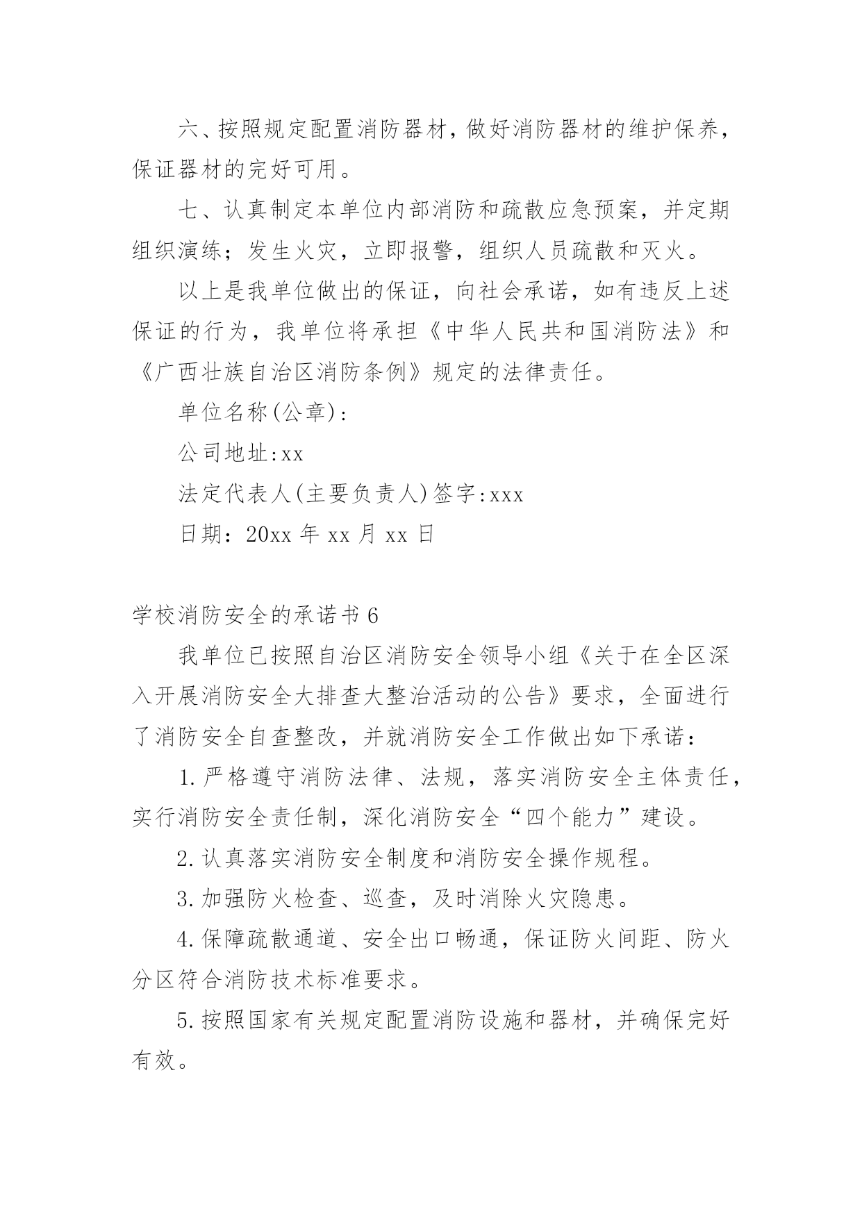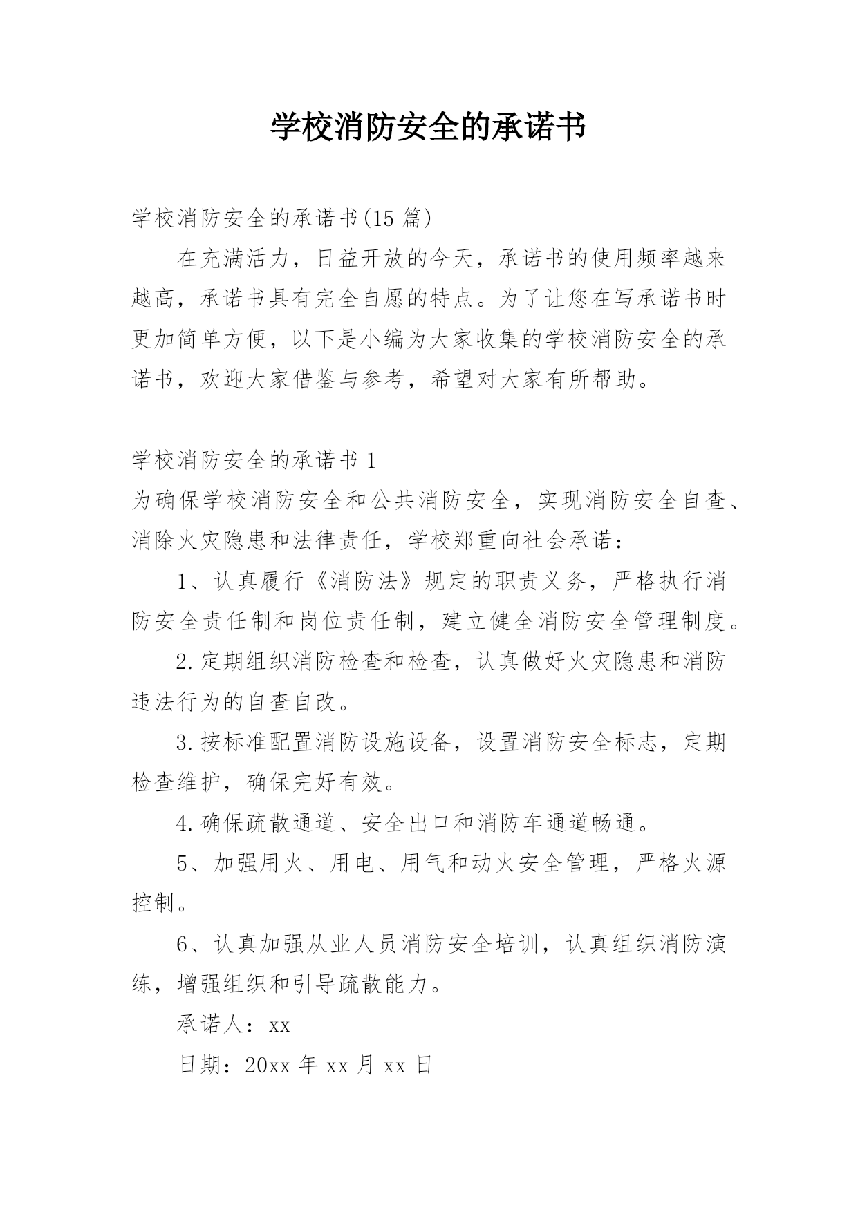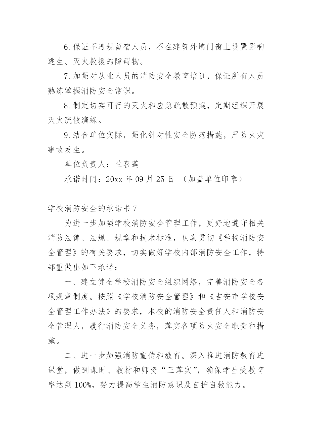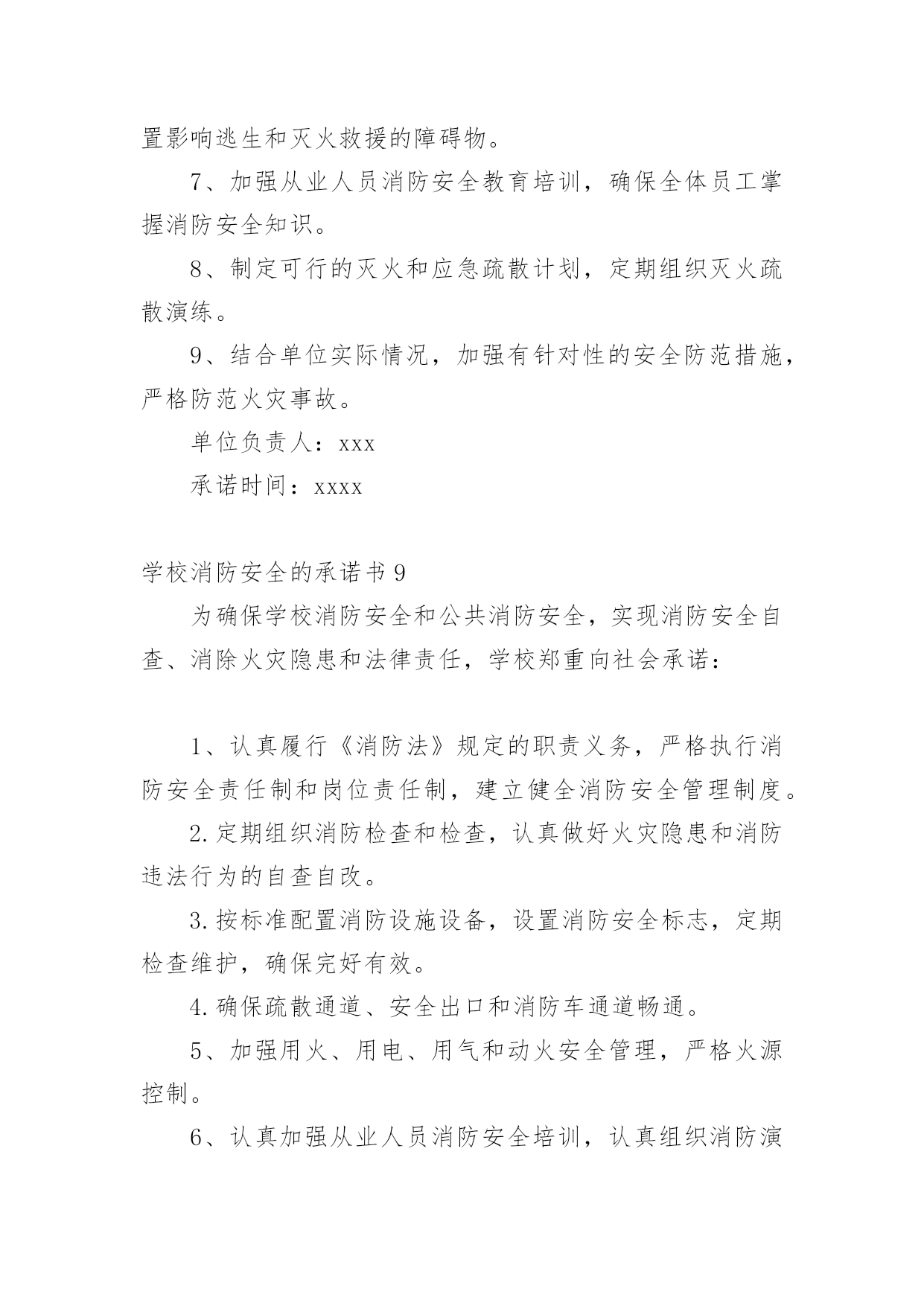 学校消防安全的承诺书学校消防安全的承诺书(15篇)在充满活力,日益开放的今天,承诺书的使用频率越来越高,承诺书具有完全自愿的特点。为了让您在写承诺书时更加简单方便,以下是小编为大家收集的学校消防安全的承诺书,欢迎大家借鉴与参考,希望对大家有所帮助。学校消防安全的承诺书1为确保学校消防安全和公共消防安全,实现消防安全自查、消除火灾隐患和法律责任,学校郑重向社会承诺:1、认真履行《消防法》规定的职责义务,严格执行消防安全责任制和岗位责任制,建立健全消防安全管理制度。2.定期组织消防检查和检查,认真做好火灾隐患和消防违法行为的自查自改。3.按标准配置消防设施设备,设置消防安全标志,定期检查维护,确保完好有效。4.确保疏散通道、安全出口和消防车通道畅通。5、加强用火、用电、用气和动火安全管理,严格火源控制。6、认真加强从业人员消防安全培训,认真组织消防演练,增强组织和引导疏散能力。承诺人:xx日期:20xx年xx月xx日学校消防安全的承诺书2我单位已按照自治区消防安全领导小组《关于在全区深入开展消防安全大排查大整治活动的公告》要求,全面进行了消防安全自查整改,并就消防安全工作做出如下承诺:1.严格遵守消防法律、法规,落实消防安全主体责任,实行消防安全责任制,深化消防安全“四个能力”建设。2.认真落实消防安全制度和消防安全操作规程。3.加强防火检查、巡查,及时消除火灾隐患。4.保障疏散通道、安全出口畅通,保证防火间距、防火分区符合消防技术标准要求。5.按照国家有关规定配置消防设施和器材,并确保完好有效。6.加强对从业人员的消防安全教育培训,保证所有人员熟练掌握消防安全常识。7.制定切实可行的灭火和应急疏散预案,定期组织开展灭火疏散演练。8.结合单位实际,强化针对性安全防范措施,严防火灾事故发生。9.保证不违规留宿人员,不在建筑外墙门窗上设置影响逃生、灭火救援的障碍物。单位负责人:承诺时间:(加盖单位印章)学校消防安全的承诺书3为确保消防安全,严防火灾事故发生。我单位承诺依法履行以下职责:一、严格落实逐级消防安全责任制,明确各级各岗位消防安全职责,确定各项、各岗位消防安全责任人,做到分工明确,责任到人,确保各项防火安全措施落实到位。二、制定消防教育培训计划,开展形式多样的消防安全教育,对员工进行经常化消防安全培训,提高自防自救能力。使部门达到:具备检查发现和整改火灾隐患能力,扑救初期火灾能力,引导人员疏散逃生能力,自我宣传教育培训能力的建设要求。三、加强对现有消防设施、器材的维护保养,确保其完整有效。保障疏散通道、安全出口、消防车通道的畅通,并设置符合国家规定的消防安全疏散指示标志和应急照明设施。四、在本单位公众场所做到:提示公众所在场火灾危险性;提示公众所在场所安全逃生路线、安全出口的具体位置,遇到火灾等紧急情况如何正确逃生、自救;提示公众所在场所内没火器、逃生设备器材具体位置和使用方法的“三提示”。五、实行经理带班制度,严格按照消防安全检查规定的内容及频次对本部门重点部位进行检查并做好记录;落实值班夜查制度,消防安全重点部位的管理人员确保24小时在岗在位。六、结合本宾馆实际,制定完善灭火疏散预案,利用现有消防设施,定期组织员工进行消防演练。七、大力开展消防宣传教育活动,组织全体员工对消防法进行系统学习,提高法律意识和消防安全知识。八、对公安机关消防机构监督检查及本单位自查中发现的火灾隐患,明确专人负责,积极投入资金,组织人力物力,严格按要求落实整改,并采取有效措施,确保不发生火灾事故。九、发生火灾事故,依法承担行政责任和刑事责任。承诺人:xxx承诺时间:xxx学校消防安全的承诺书4为保障学校消防安全和公共消防安全,实现消防安全自查、火灾隐患自除、法律责任自负,学校向社会郑重承诺:1、切实履行《消防法》规定的职责和义务,严格落实消防安全责任制和岗位责任制,建立健全消防安全管理制度。2、定期组织防火检查和巡查,认真做好火灾隐患和消防违法行为的自查自改。3、按照标准配置消防设施、器材,设置消防安全标志,定期检验维修,确保完好有效。4、保障疏散通道、安全出口、消防车通道畅通。5、加强用火、用电、用气和动火安全管理,严格火源控制。6、切实加强从业人员消防安全培训,认真组织消防演练,增强组织和引导人员疏散能力。XX县XX学校年月日学校消防安全的承诺书5为进一步加强自身消防安全管理工作,更好地遵守国家、自治区和柳州市有关消防法律、法规和规章,做好冬季学校和单位消防安全工作中的消防安全隐患排查和整改工作,郑重做出如下承诺:一、按照《中华人民共和国消防法》、《机关、团体、企事业单位消防安全管理条例》(公安部令第61号)、《广西壮族自治区消防条例》等有关消防法律法规的要求,本单位消防安全责任人和消防安全管理人员将严格履行消防安全义务,落实各项消防安全