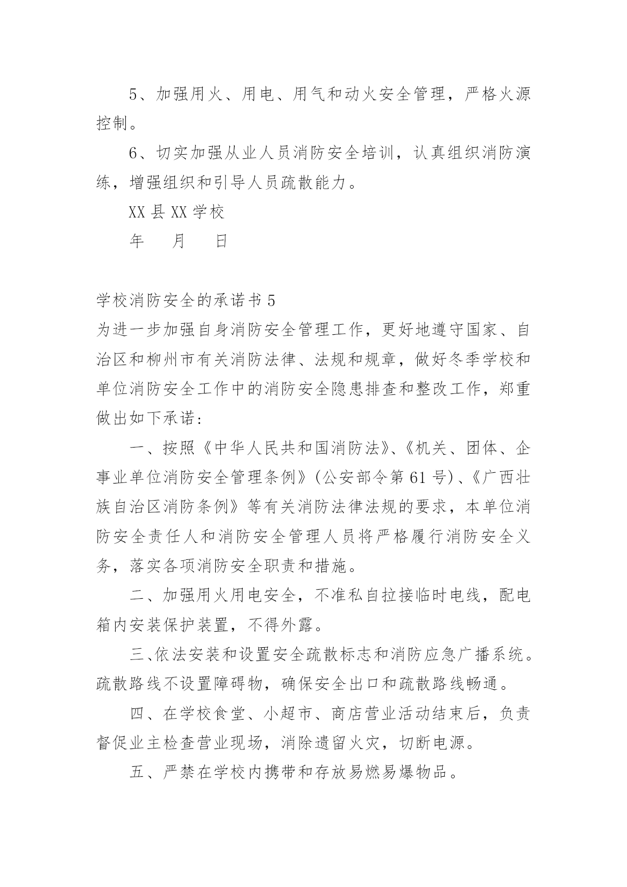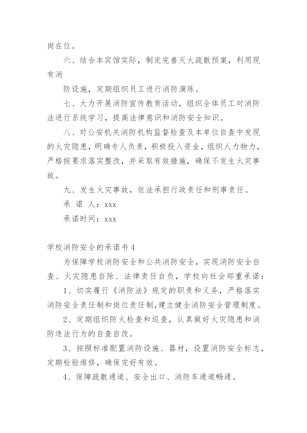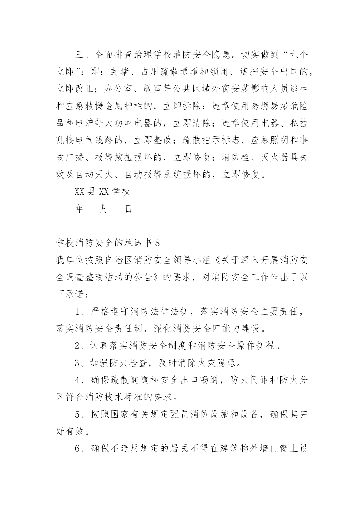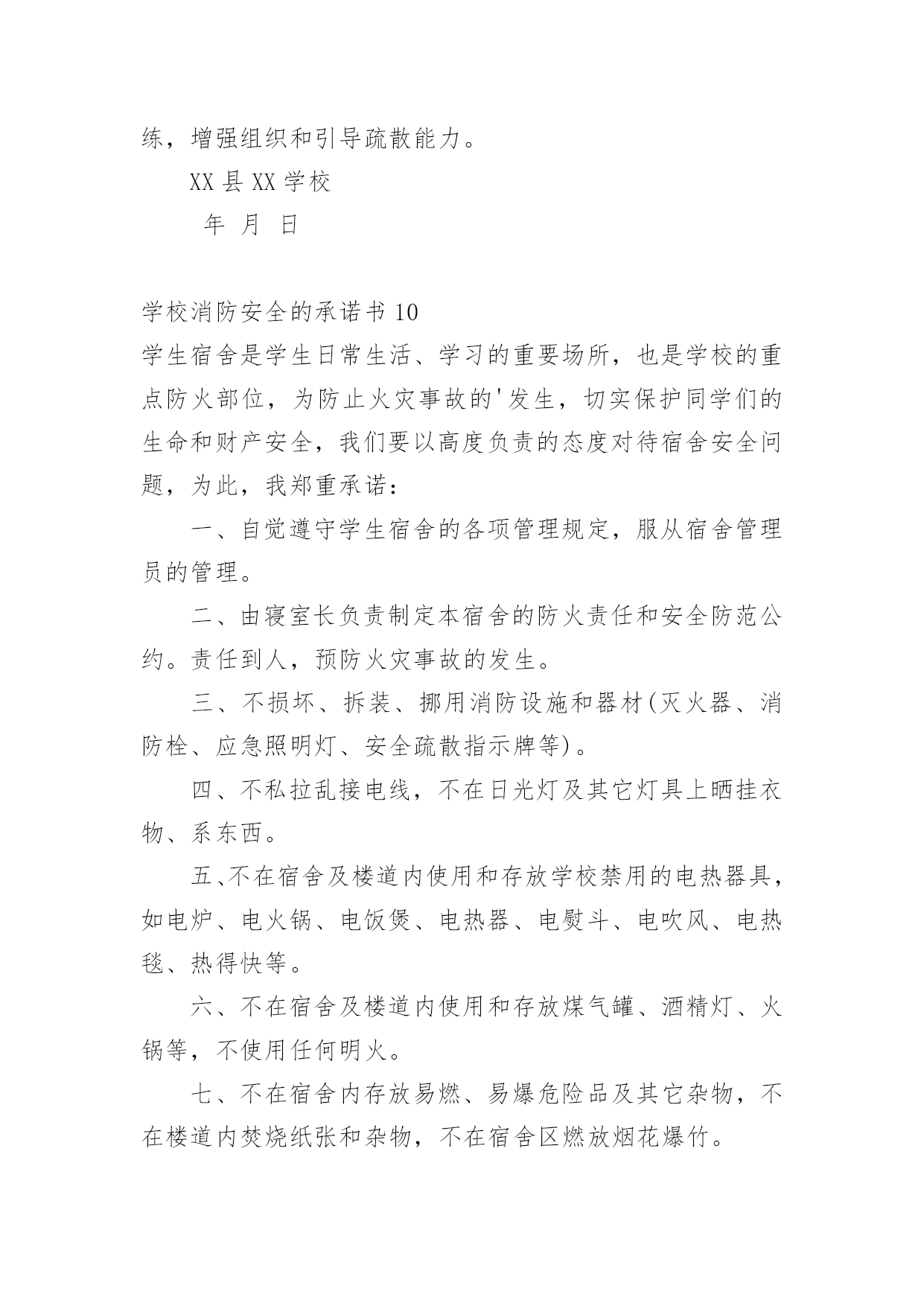 学校消防安全的承诺书学校消防安全的承诺书(15篇)在充满活力,日益开放的今天,承诺书的使用频率越来越高,承诺书具有完全自愿的特点。为了让您在写承诺书时更加简单方便,以下是小编为大家收集的学校消防安全的承诺书,欢迎大家借鉴与参考,希望对大家有所帮助。学校消防安全的承诺书1为确保学校消防安全和公共消防安全,实现消防安全自查、消除火灾隐患和法律责任,学校郑重向社会承诺:1、认真履行《消防法》规定的职责义务,严格执行消防安全责任制和岗位责任制,建立健全消防安全管理制度。2.定期组织消防检查和检查,认真做好火灾隐患和消防违法行为的自查自改。3.按标准配置消防设施设备,设置消防安全标志,定期检查维护,确保完好有效。4.确保疏散通道、安全出口和消防车通道畅通。5、加强用火、用电、用气和动火安全管理,严格火源控制。6、认真加强从业人员消防安全培训,认真组织消防演练,增强组织和引导疏散能力。承诺人:xx日期:20xx年xx月xx日学校消防安全的承诺书2我单位已按照自治区消防安全领导小组《关于在全区深入开展消防安全大排查大整治活动的公告》要求,全面进行了消防安全自查整改,并就消防安全工作做出如下承诺:1.严格遵守消防法律、法规,落实消防安全主体责任,实行消防安全责任制,深化消防安全“四个能力”建设。2.认真落实消防安全制度和消防安全操作规程。3.加强防火检查、巡查,及时消除火灾隐患。4.保障疏散通道、安全出口畅通,保证防火间距、防火分区符合消防技术标准要求。5.按照国家有关规定配置消防设施和器材,并确保完好有效。6.加强对从业人员的消防安全教育培训,保证所有人员熟练掌握消防安全常识。7.制定切实可行的灭火和应急疏散预案,定期组织开展灭火疏散演练。8.结合单位实际,强化针对性安全防范措施,严防火灾事故发生。9.保证不违规留宿人员,不在建筑外墙门窗上设置影响逃生、灭火救援的障碍物。单位负责人:承诺时间:(加盖单位印章)学校消防安全的承诺书3为确保消防安全,严防火灾事故发生。我单位承诺依法履行以下职责:一、严格落实逐级消防安全责任制,明确各级各岗位消防安全职责,确定各项、各岗位消防安全责任人,做到分工明确,责任到人,确保各项防火安全措施落实到位。二、制定消防教育培训计划,开展形式多样的消防安全教育,对员工进行经常化消防安全培训,提高自防自救能力。使部门达到:具备检查发现和整改火灾隐患能力,扑救初期火灾能力,引导人员疏散逃生能力,自我宣传教育培训能力的建设要求。三、加强对现有消防设施、器材的维护保养,确保其完整有效。保障疏散通道、安全出口、消防车通道的畅通,并设置符合国家规定的消防安全疏散指示标志和应急照明设施。四、在本单位公众场所做到:提示公众所在场火灾危险性;提示公众所在场所安全逃生路线、安全出口的具体位置,遇到火灾等紧急情况如何正确逃生、自救;提示公众所在场所内没火器、逃生设备器材具体位置和使用方法的“三提示”。五、实行经理带班制度,严格按照消防安全检查规定的内容及频次对本部门重点部位进行检查并做好记录;落实值班夜查制度,消防安全重点部位的管理人员确保24小时在岗在位。六、结合本宾馆实际,制定完善灭火疏散预案,利用现有消防设施,定期组织员工进行消防演练。七、大力开展消防宣传教育活动,组织全体员工对消防法进行系统学习,提高法律意识和消防安全知识。八、对公安机关消防机构监督检查及本单位自查中发现的火灾隐患,明确专人负责,积极投入资金,组织人力物力,严格按要求落实整改,并采取有效措施,确保不发生火灾事故。九、发生火灾事故,依法承担行政责任和刑事责任。承诺人:xxx承诺时间:xxx学校消防安全的承诺书4为保障学校消防安全和公共消防安全,实现消防安全自查、火灾隐患自除、法律责任自负,学校向社会郑重承诺:1、切实履行《消防法》规定的职责和义务,严格落实消防安全责任制和岗位责任制,建立健全消防安全管理制度。2、定期组织防火检查和巡查,认真做好火灾隐患和消防违法行为的自查自改。3、按照标准配置消防设施、器材,设置消防安全标志,定期检验维修,确保完好有效。4、保障疏散通道、安全出口、消防车通道畅通。5、加强用火、用电、用气和动火安全管理,严格火源控制。6、切实加强从业人员消防安全培训,认真组织消防演练,增强组织和引导人员疏散能力。XX县XX学校年月日学校消防安全的承诺书5为进一步加强自身消防安全管理工作,更好地遵守国家、自治区和柳州市有关消防法律、法规和规章,做好冬季学校和单位消防安全工作中的消防安全隐患排查和整改工作,郑重做出如下承诺:一、按照《中华人民共和国消防法》、《机关、团体、企事业单位消防安全管理条例》(公安部令第61号)、《广西壮族自治区消防条例》等有关消防法律法规的要求,本单位消防安全责任人和消防安全管理人员将严格履行消防安全义务,落实各项消防安全