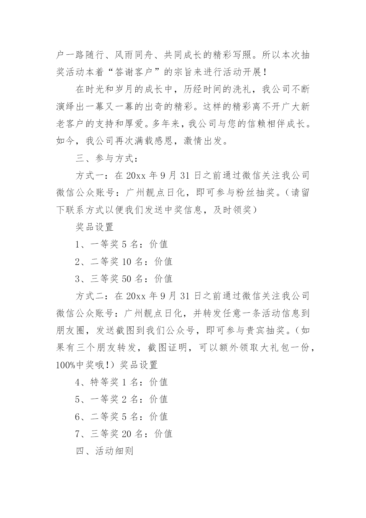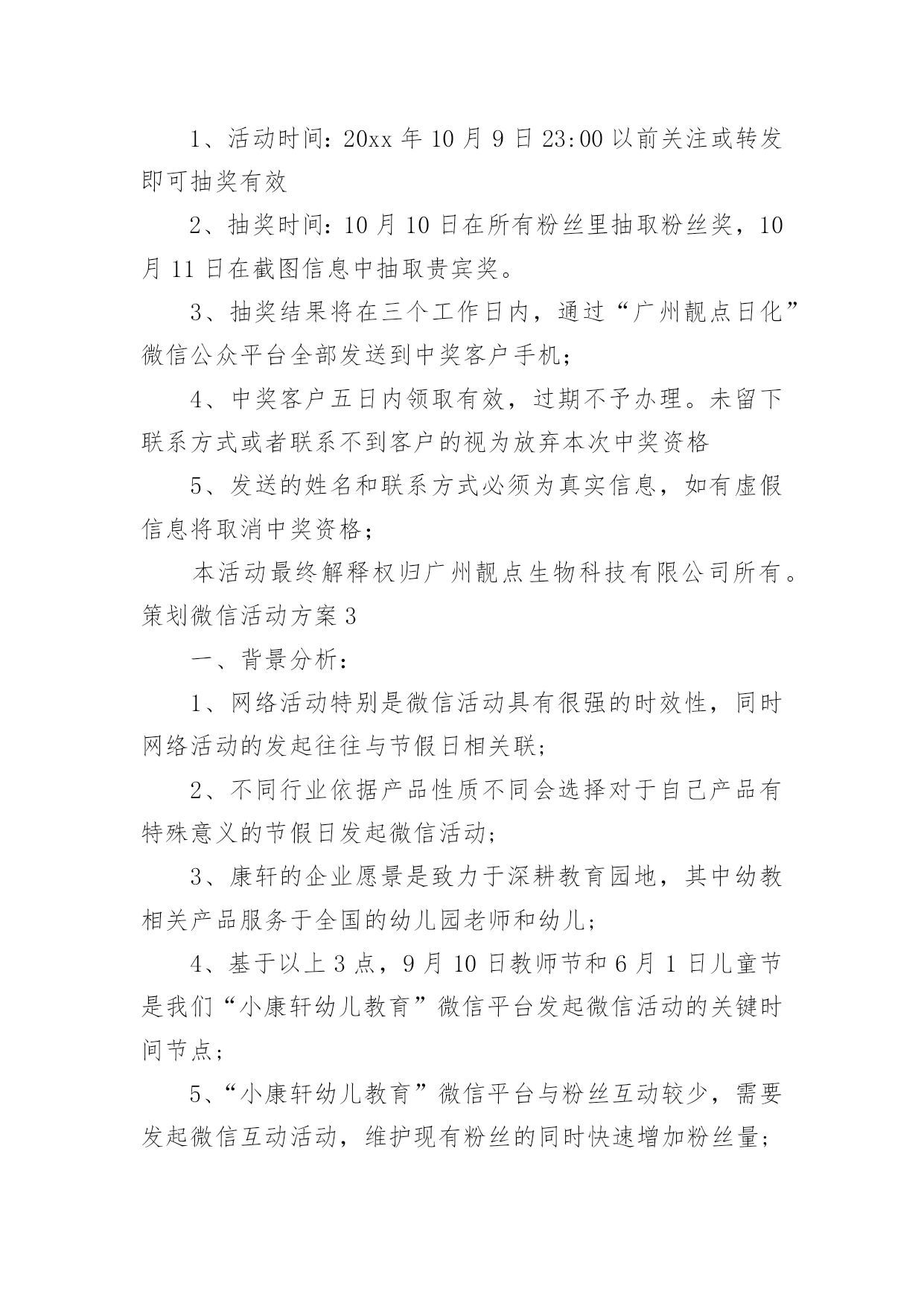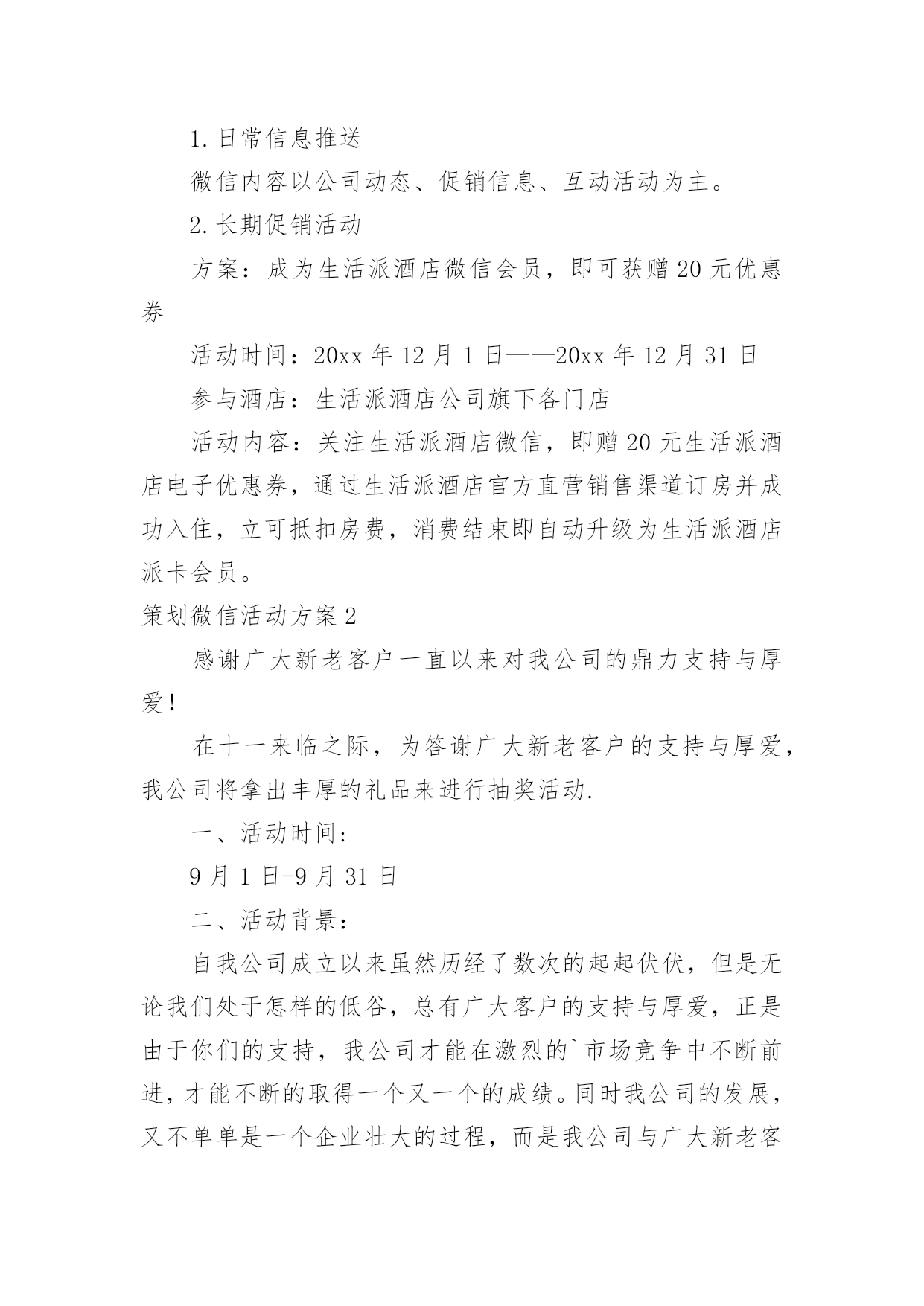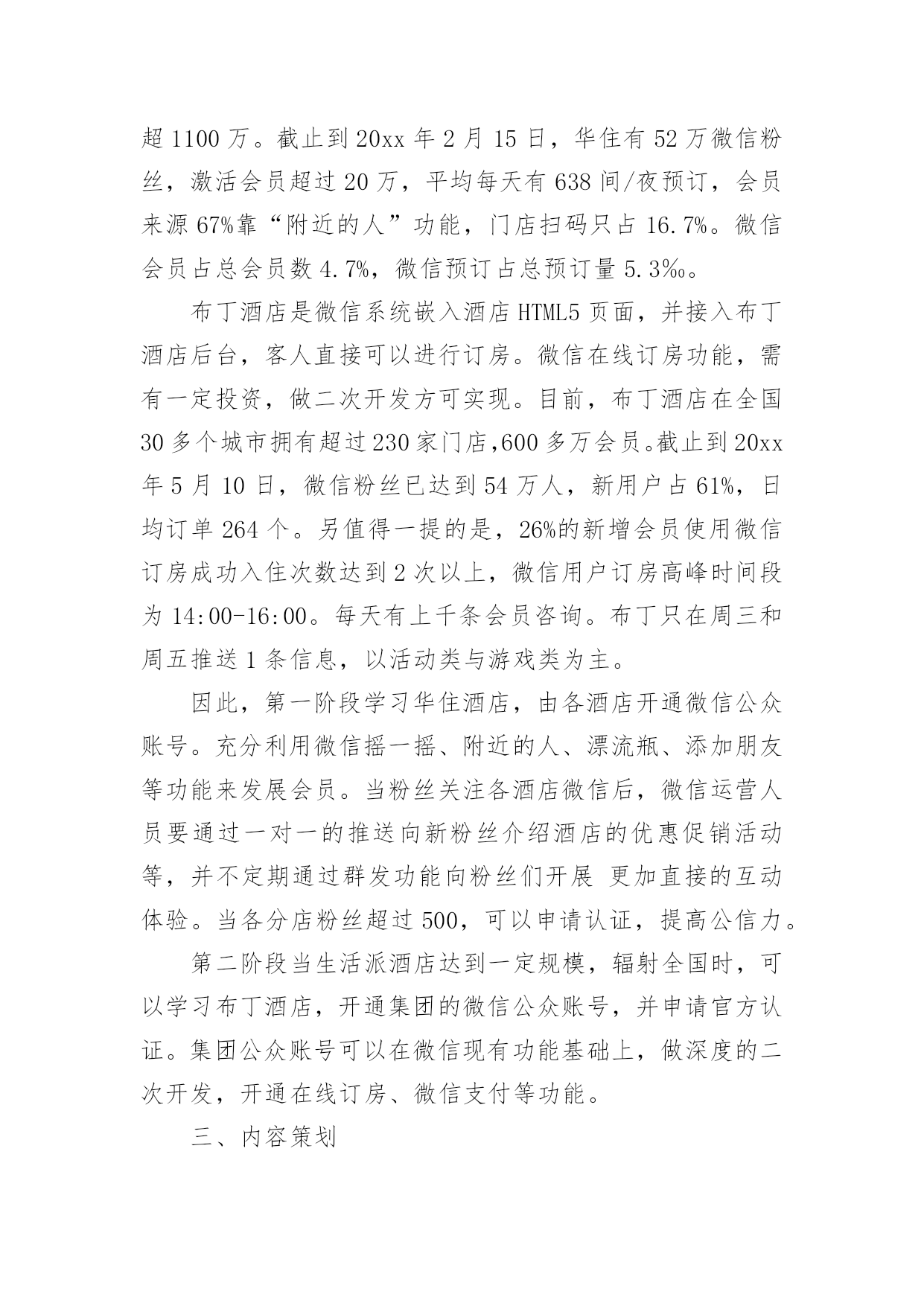 策划微信活动方案策划微信活动方案为了确定工作或事情顺利开展,预先制定方案是必不可少的,方案的内容和形式都要围绕着主题来展开,最终达到预期的效果和意义。那么我们该怎么去写方案呢?以下是小编精心整理的策划微信活动方案,欢迎阅读,希望大家能够喜欢。策划微信活动方案1一、微信营销目的与意义当下微信的用户数已经突破4亿,各行业企业纷纷开展微信营销,酒店行业亦不例外。在酒店行业,布丁酒店和华住酒店的微信营销做得最为出色,且取得了不错的经济效益。开展微信营销的好处如下:(1)开拓市场宣传新渠道,塑造企业品牌形象;(2)增强与关注客户群的互动,进一步发展潜在客户;(3)及时推送酒店的各种促销、优惠信息,吸引客户预定。因此,建议开通生活派酒店微信。二、实施方法开通微信公众账号调查:华住酒店是各个分店注册账号,向关注酒店的`粉丝发送电子优惠券。截至20xx年6月30日,华住拥有1216家酒店,客房总数达到132,557间,入住率为91.3%,会员超1100万。截止到20xx年2月15日,华住有52万微信粉丝,激活会员超过20万,平均每天有638间/夜预订,会员来源67%靠“附近的人”功能,门店扫码只占16.7%。微信会员占总会员数4.7%,微信预订占总预订量5.3‰。布丁酒店是微信系统嵌入酒店HTML5页面,并接入布丁酒店后台,客人直接可以进行订房。微信在线订房功能,需有一定投资,做二次开发方可实现。目前,布丁酒店在全国30多个城市拥有超过230家门店,600多万会员。截止到20xx年5月10日,微信粉丝已达到54万人,新用户占61%,日均订单264个。另值得一提的是,26%的新增会员使用微信订房成功入住次数达到2次以上,微信用户订房高峰时间段为14:00-16:00。每天有上千条会员咨询。布丁只在周三和周五推送1条信息,以活动类与游戏类为主。因此,第一阶段学习华住酒店,由各酒店开通微信公众账号。充分利用微信摇一摇、附近的人、漂流瓶、添加朋友等功能来发展会员。当粉丝关注各酒店微信后,微信运营人员要通过一对一的推送向新粉丝介绍酒店的优惠促销活动等,并不定期通过群发功能向粉丝们开展更加直接的互动体验。当各分店粉丝超过500,可以申请认证,提高公信力。第二阶段当生活派酒店达到一定规模,辐射全国时,可以学习布丁酒店,开通集团的微信公众账号,并申请官方认证。集团公众账号可以在微信现有功能基础上,做深度的二次开发,开通在线订房、微信支付等功能。三、内容策划1.日常信息推送微信内容以公司动态、促销信息、互动活动为主。2.长期促销活动方案:成为生活派酒店微信会员,即可获赠20元优惠券活动时间:20xx年12月1日——20xx年12月31日参与酒店:生活派酒店公司旗下各门店活动内容:关注生活派酒店微信,即赠20元生活派酒店电子优惠券,通过生活派酒店官方直营销售渠道订房并成功入住,立可抵扣房费,消费结束即自动升级为生活派酒店派卡会员。策划微信活动方案2感谢广大新老客户一直以来对我公司的鼎力支持与厚爱!在十一来临之际,为答谢广大新老客户的支持与厚爱,我公司将拿出丰厚的礼品来进行抽奖活动.一、活动时间:9月1日-9月31日二、活动背景:自我公司成立以来虽然历经了数次的起起伏伏,但是无论我们处于怎样的低谷,总有广大客户的支持与厚爱,正是由于你们的支持,我公司才能在激烈的`市场竞争中不断前进,才能不断的取得一个又一个的成绩。同时我公司的发展,又不单单是一个企业壮大的过程,而是我公司与广大新老客户一路随行、风雨同舟、共同成长的精彩写照。所以本次抽奖活动本着“答谢客户”的宗旨来进行活动开展!在时光和岁月的成长中,历经时间的洗礼,我公司不断演绎出一幕又一幕的出奇的精彩。这样的精彩离不开广大新老客户的支持和厚爱。多年来,我公司与您的信赖相伴成长。如今,我公司再次满载感恩,激情出发。三、参与方式:方式一:在20xx年9月31日之前通过微信关注我公司微信公众账号:广州靓点日化,即可参与粉丝抽奖。(请留下联系方式以便我们发送中奖信息,及时领奖)奖品设置1、一等奖5名:价值2、二等奖10名:价值3、三等奖50名:价值方式二:在20xx年9月31日之前通过微信关注我公司微信公众账号:广州靓点日化,并转发任意一条活动信息到朋友圈,发送截图到我们公众号,即可参与贵宾抽奖。(如果有三个朋友转发,截图证明,可以额外领取大礼包一份,100%中奖哦!)奖品设置4、特等奖1名:价值5、一等奖2名:价值6、二等奖5名:价值7、三等奖20名:价值四、活动细则1、活动时间:20xx年10月9日23:00以前关注或转发即可抽奖有效2、抽奖时间:10月10日在所有粉丝里抽取粉丝奖,10月11日在截图信息中抽取贵宾奖。3、抽奖结果将在三个工作日内,通过“广州靓点日化”微信公众平台全部发送到中奖客户手机;4、中奖客